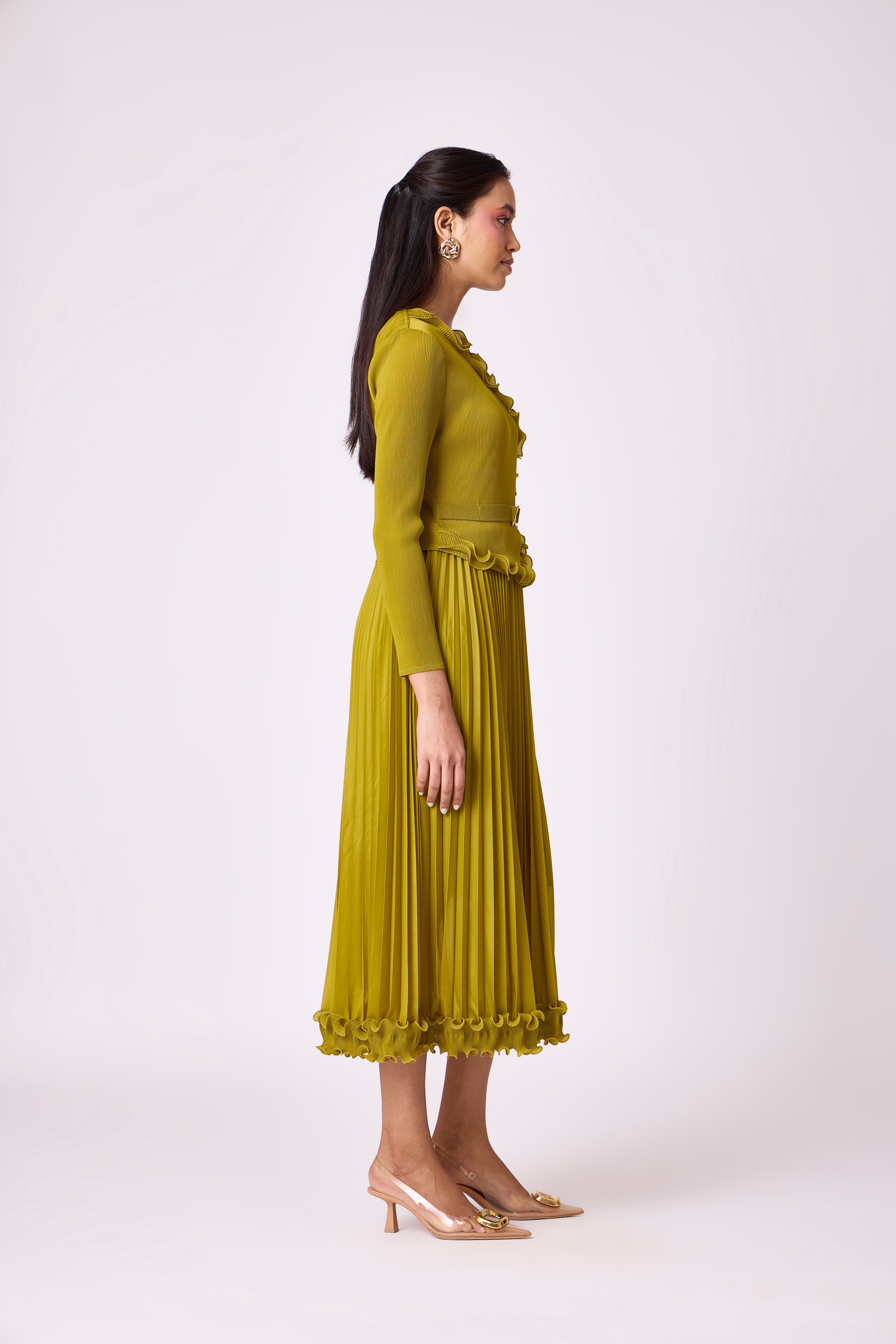 A pleated midi dress with long sleeves, assymetric V-neckline and ruffle detailed hem. A defined waist with statement buckle accents further accentuates the silhoutte