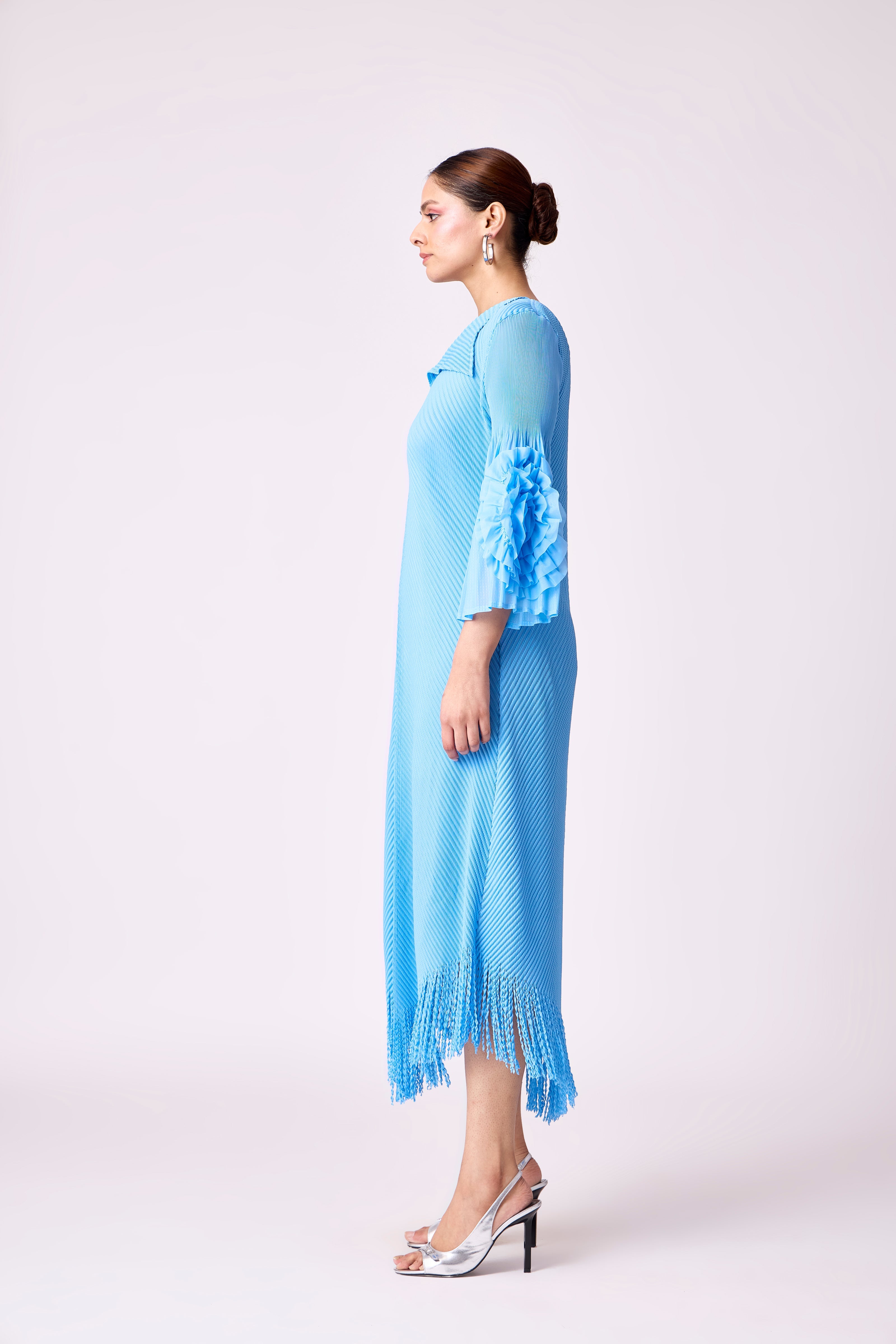 An A-line dress featuring an assymetric fringed hemline and same color fabric floral appliqué on gentle bell sleeves