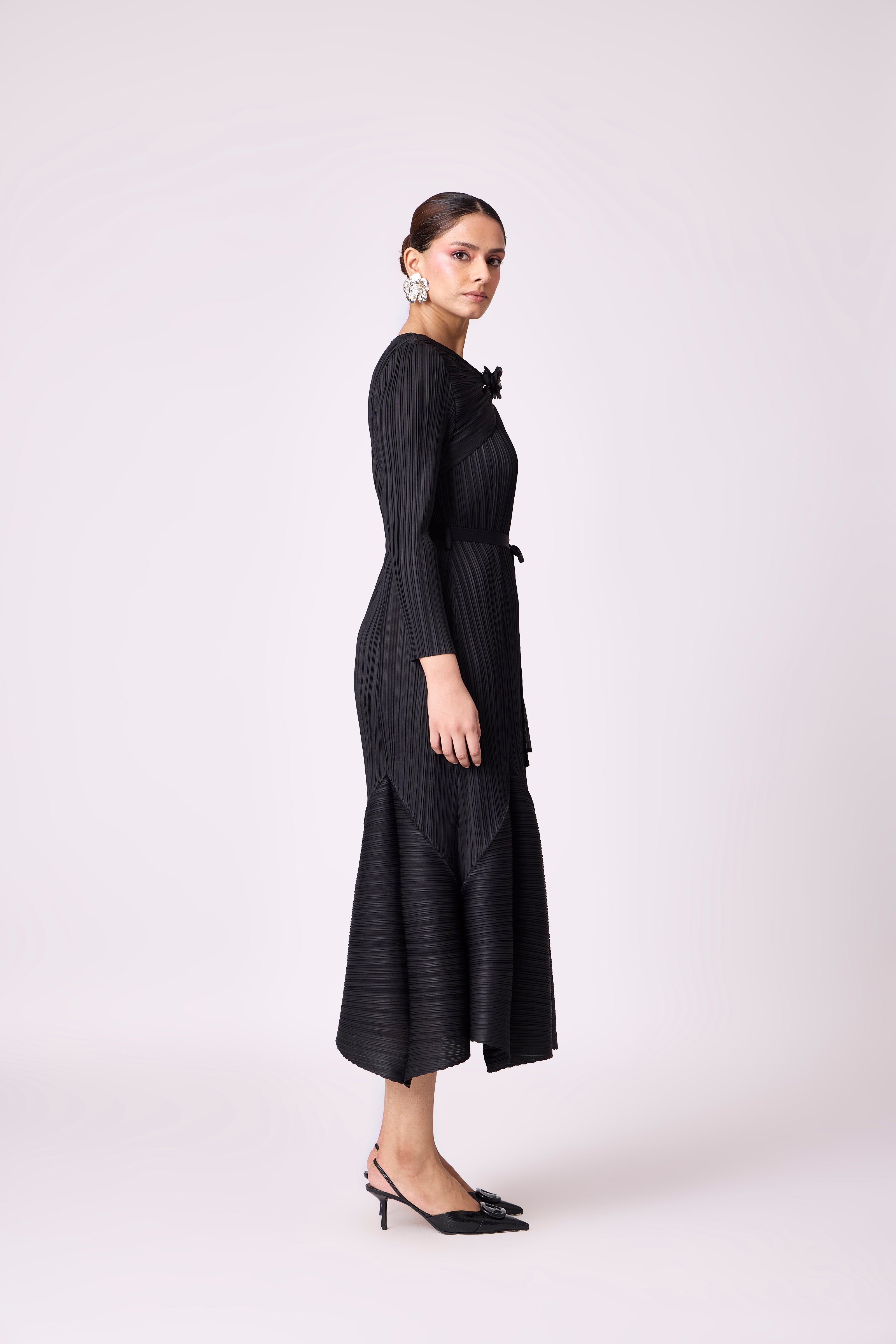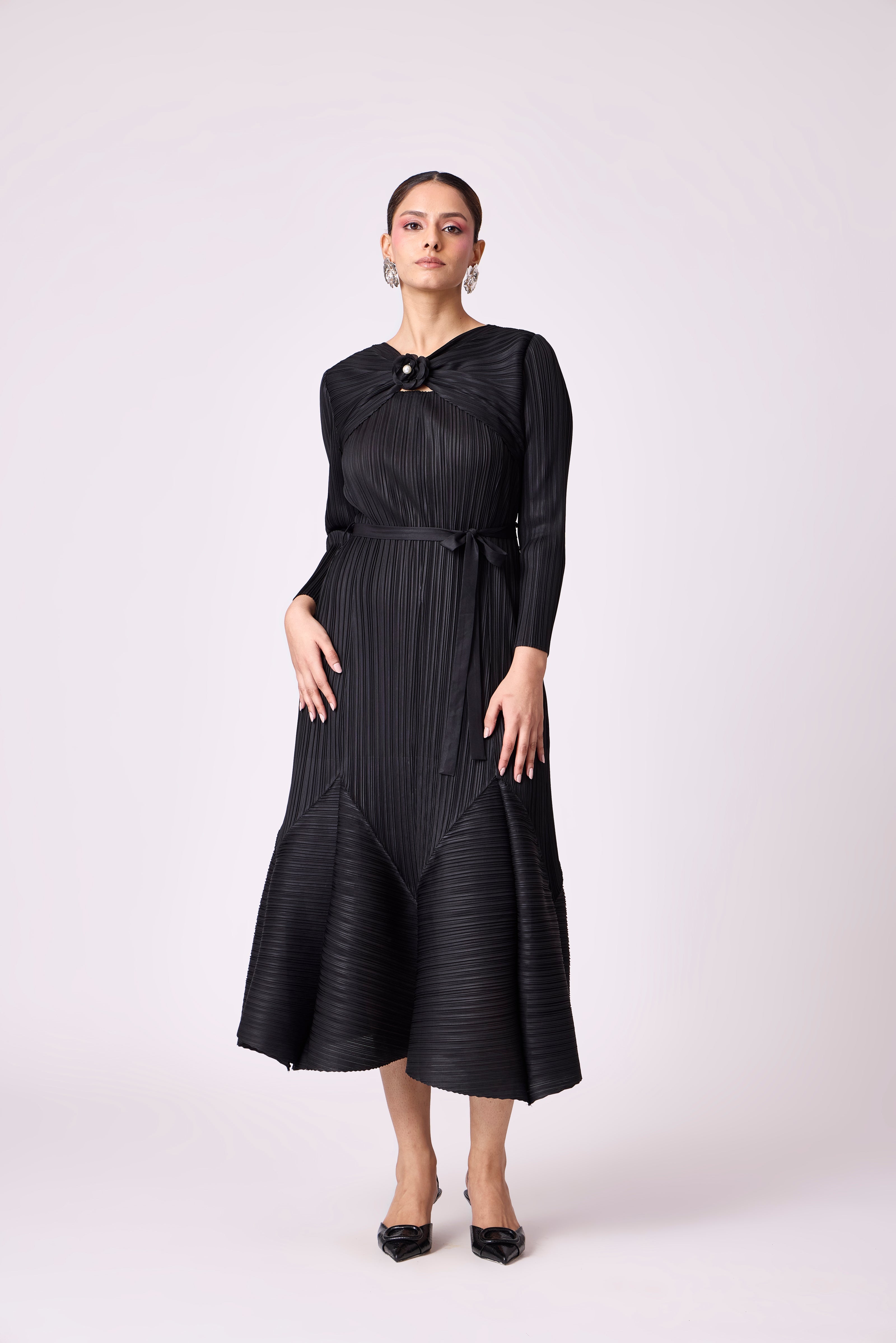 A striking neckline over an A line fit and flare dress with pleated Godet panels at hem and a same fabric belt to cinch the waist.