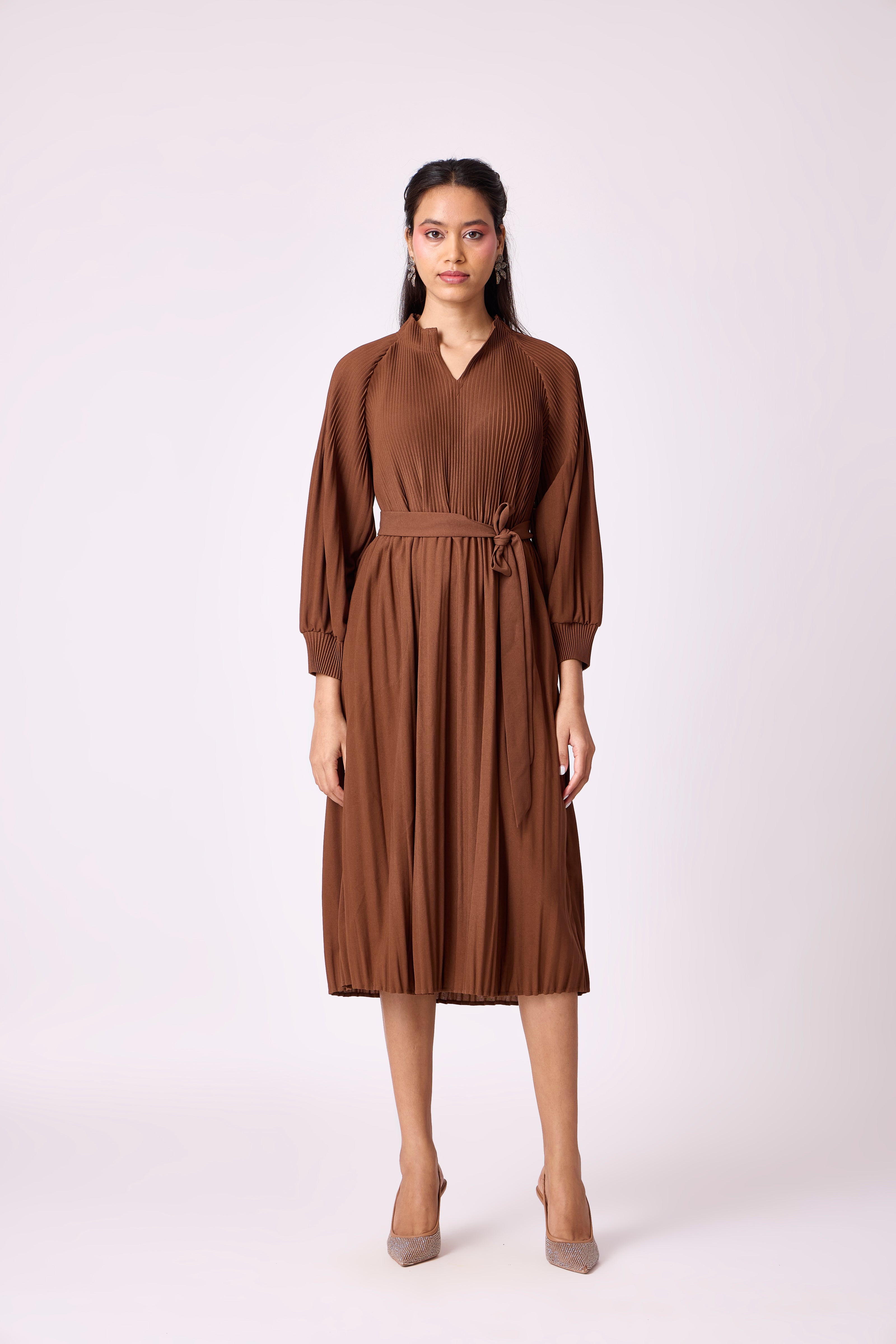 A fluid dress with a soft V-neckline, gently gathered sleeves, and a waist-defining tie-up belt.