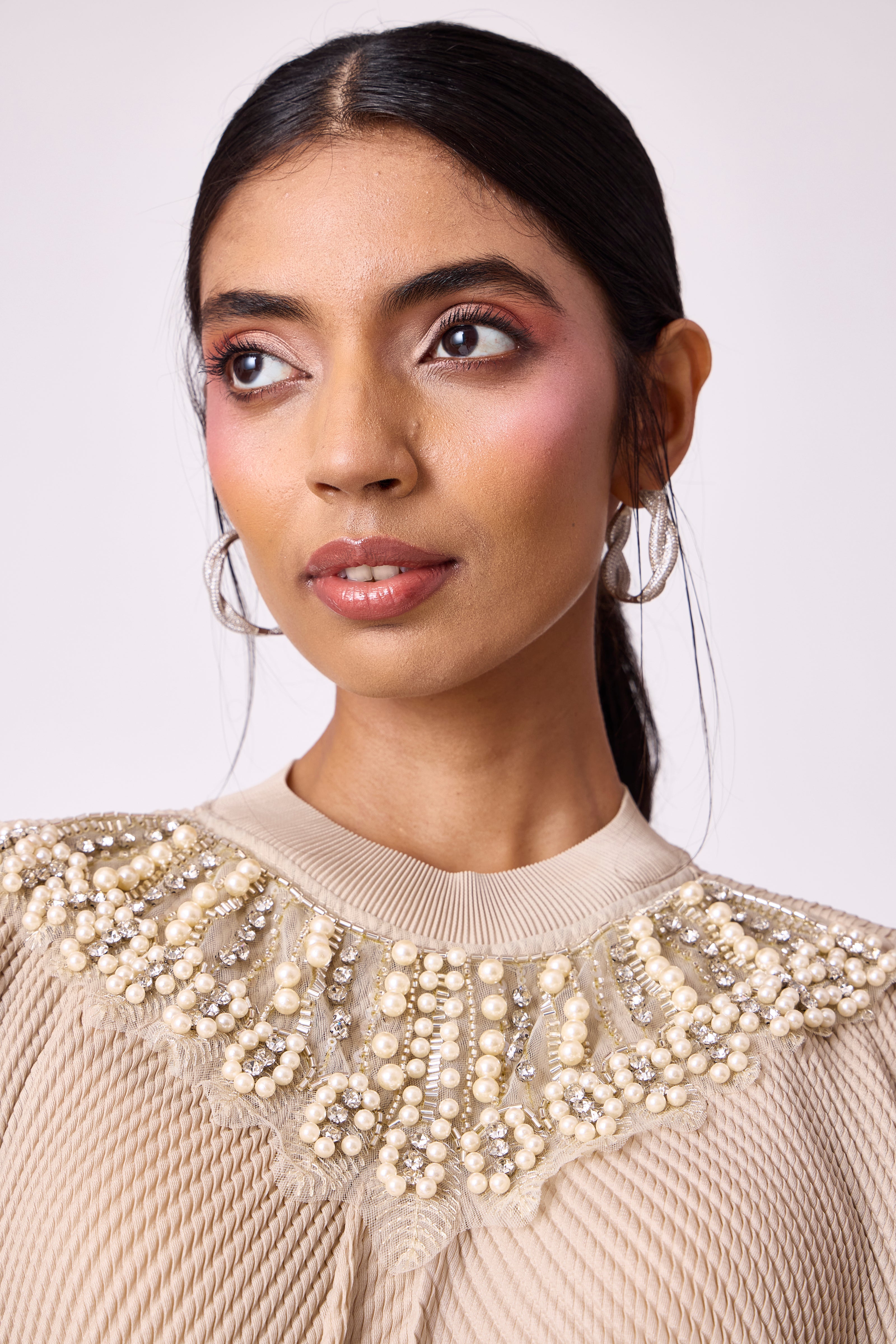 Splatter and tiny dots and print imprints on pleated garments are part of the pleating process, especially on light colors can not be avoided. These are not considered garment defects as due to nature of the pleating process, it is impossible to avoid mild anomalies.