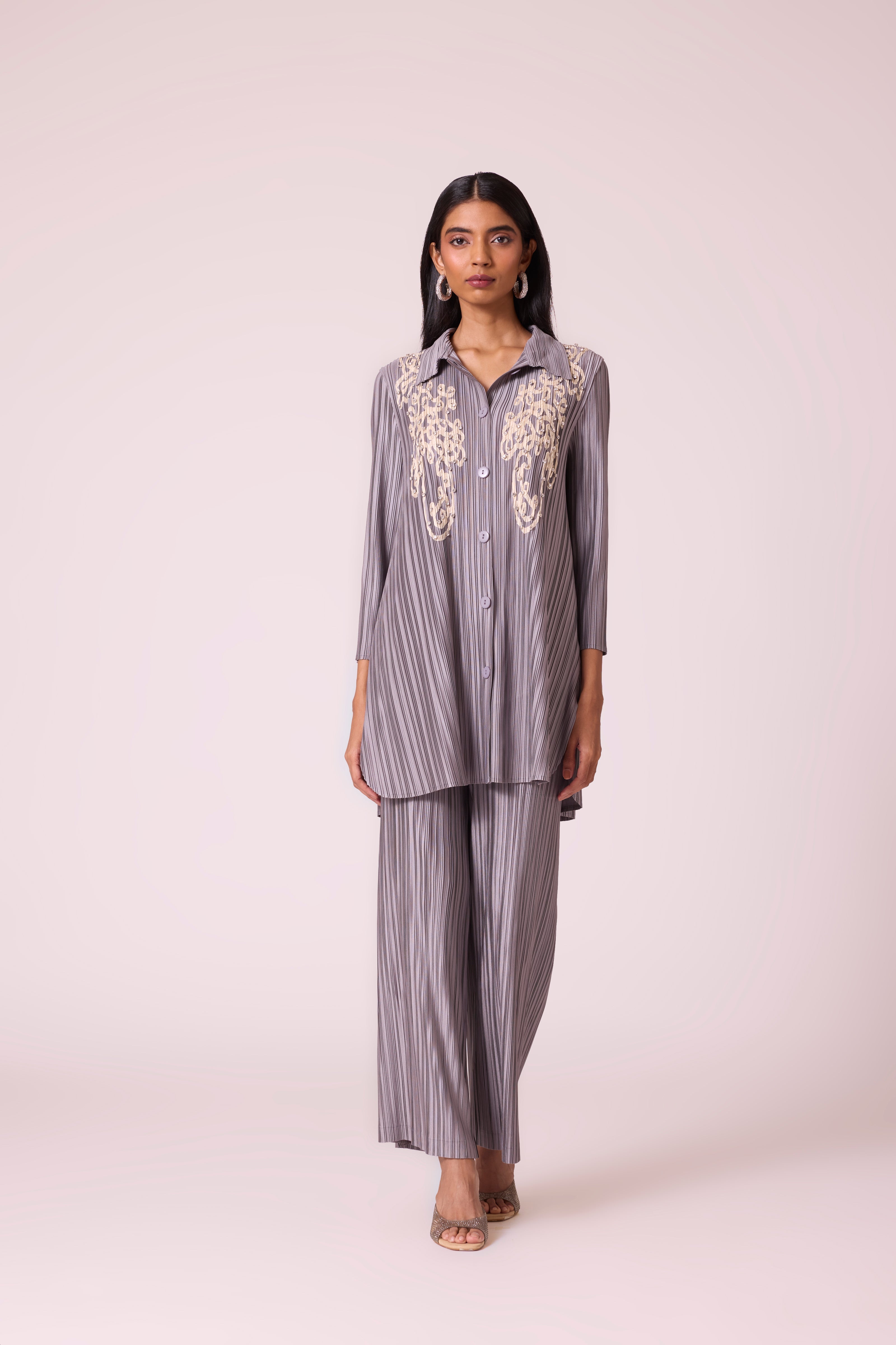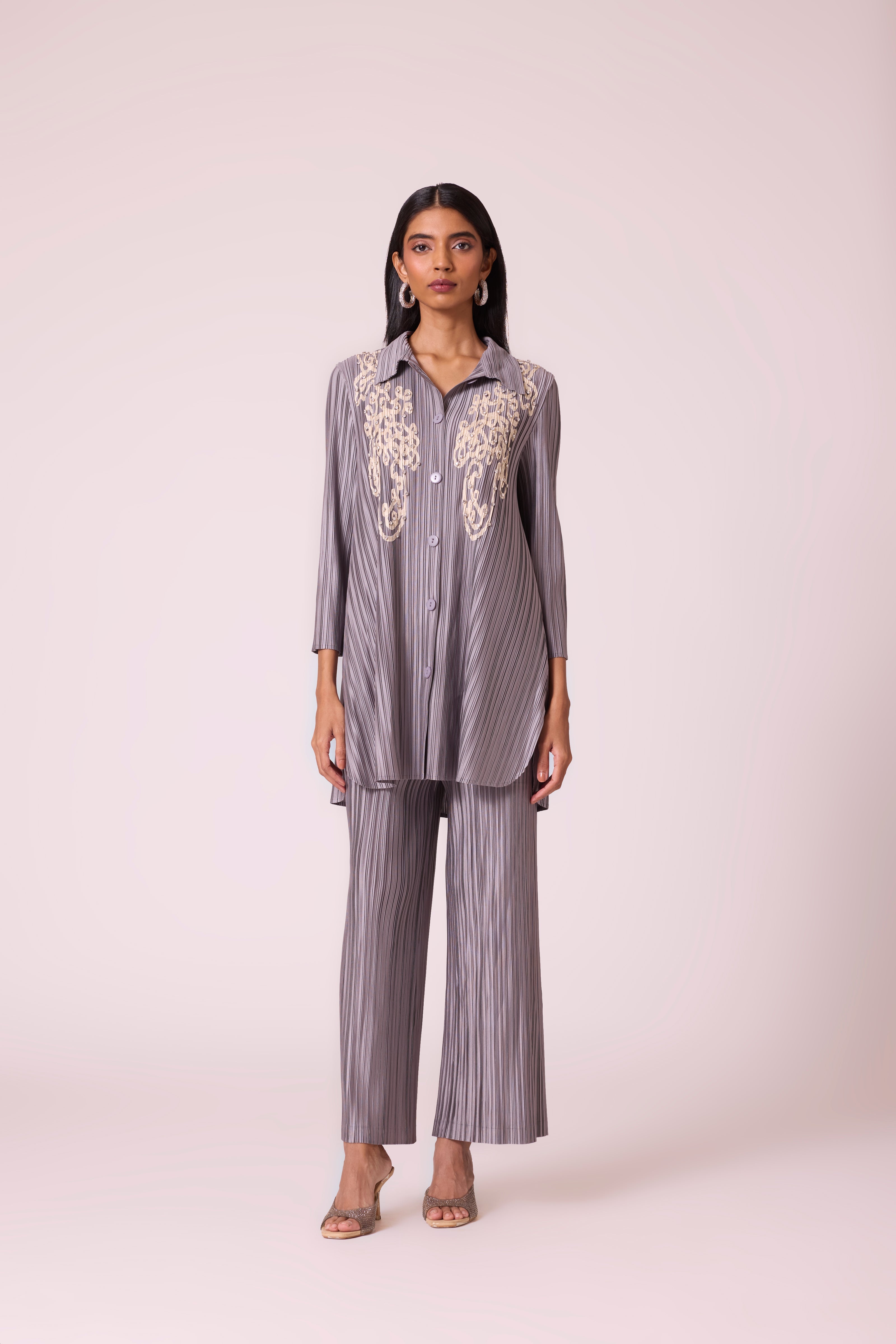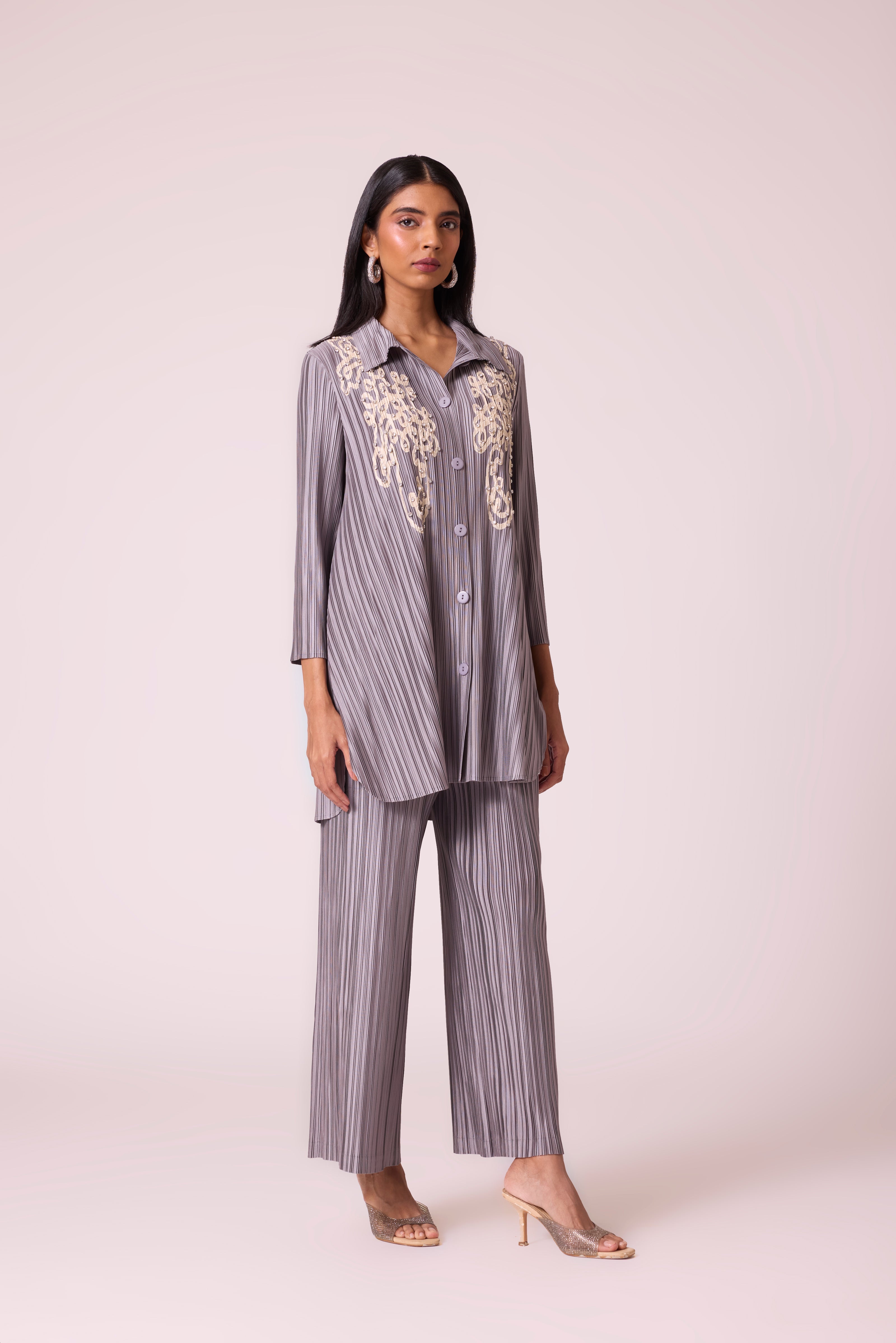 A pleated two-piece set  defined by an embroidered tunic studded with diamantes and paired with fluid straight pants for understated sophistication.