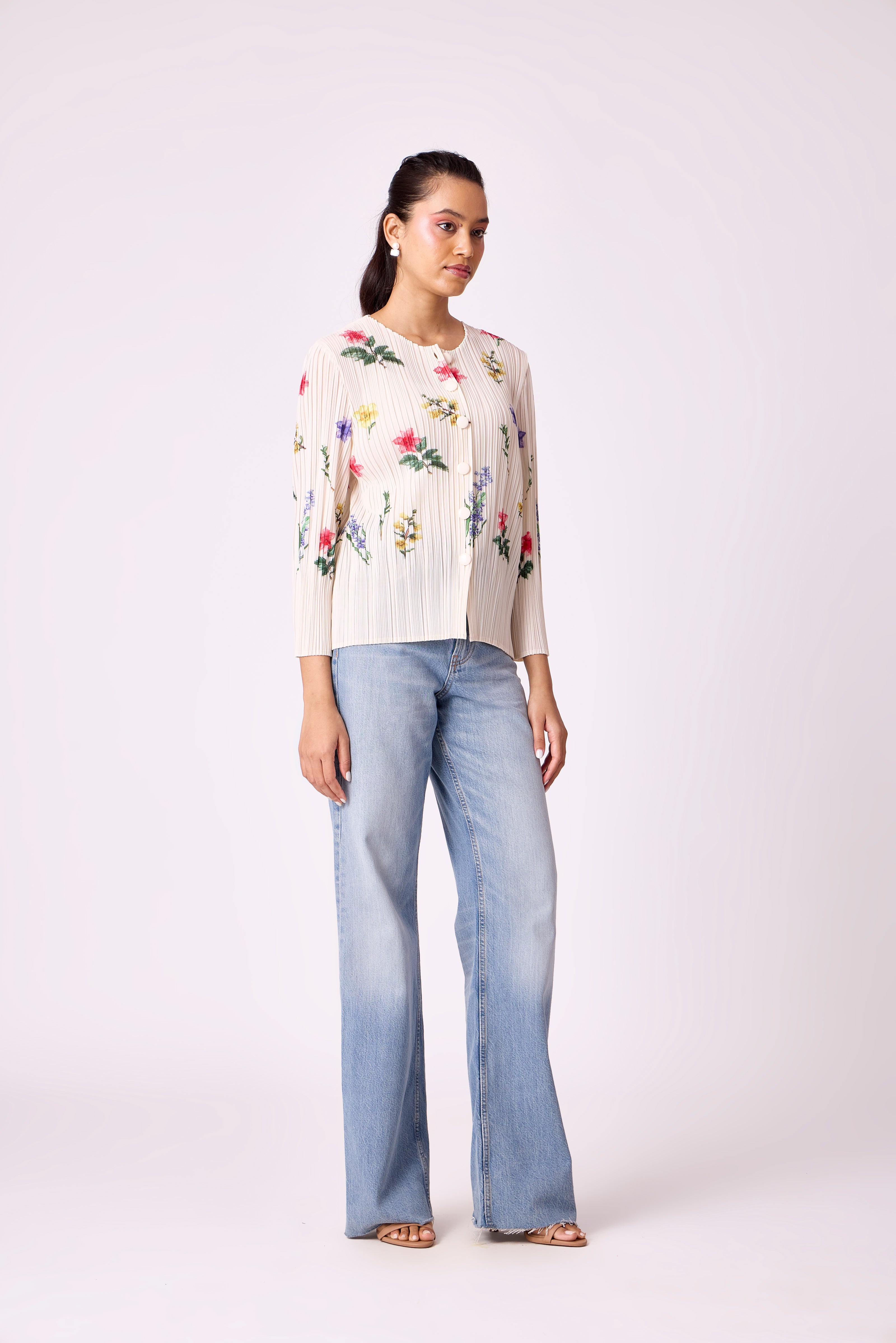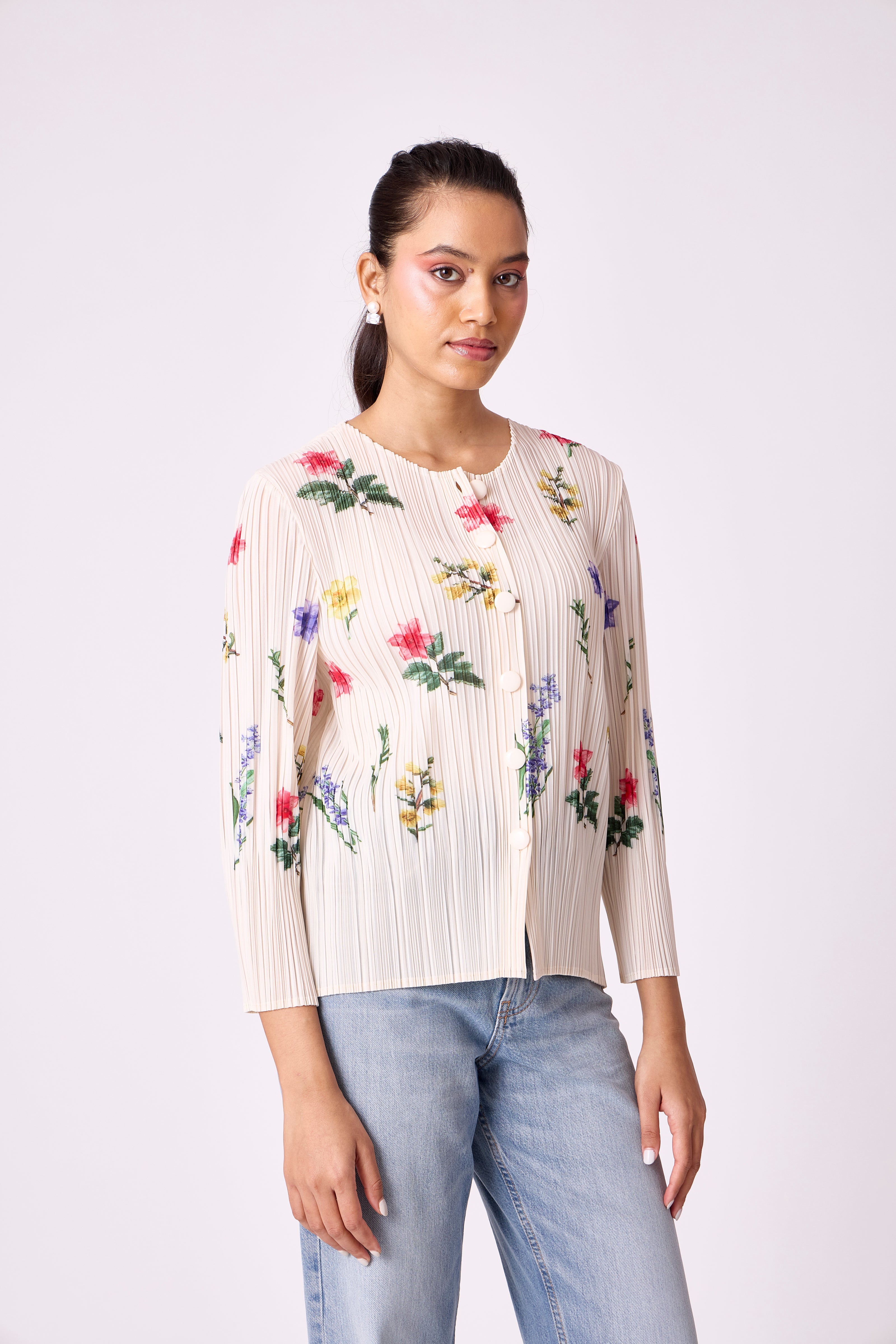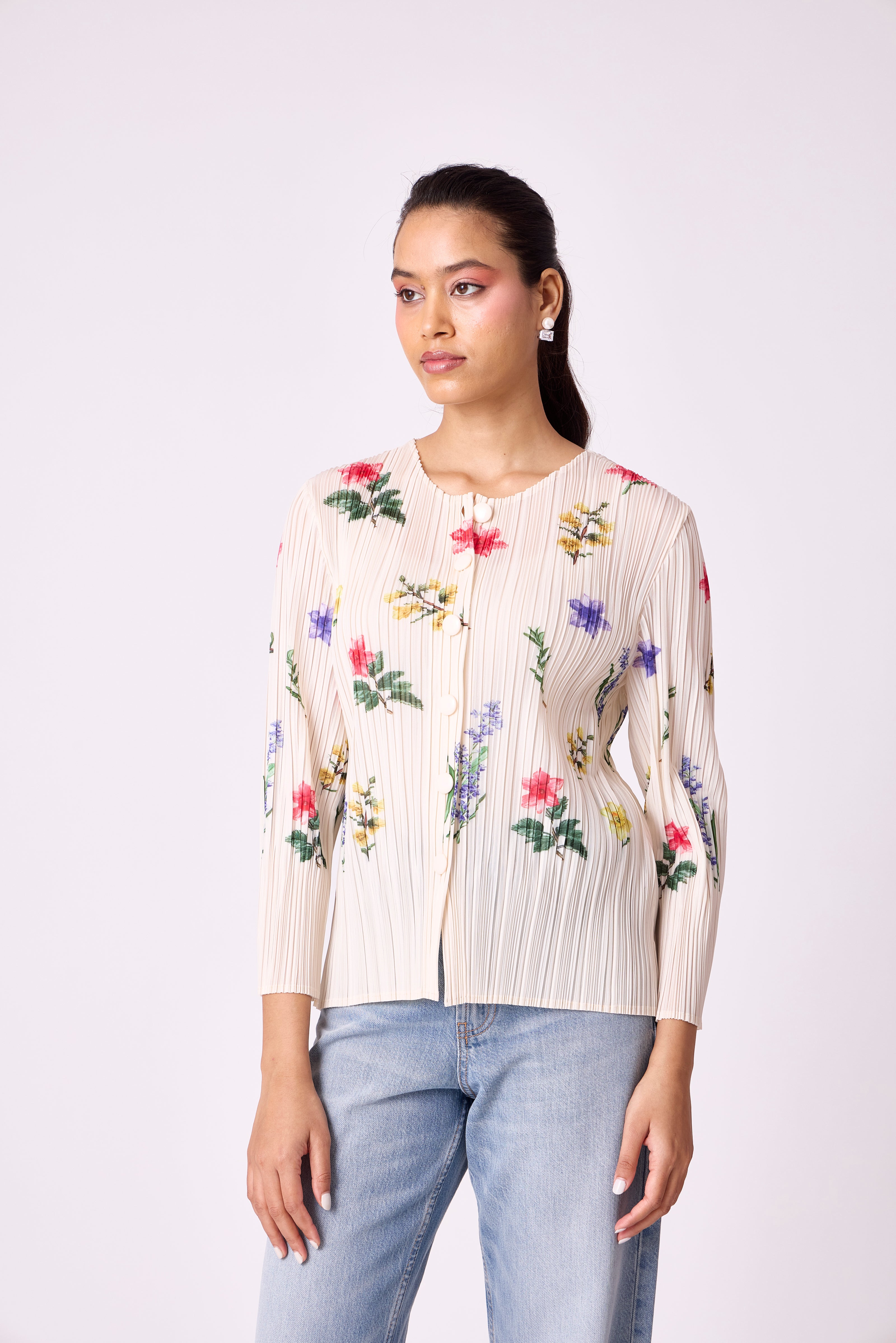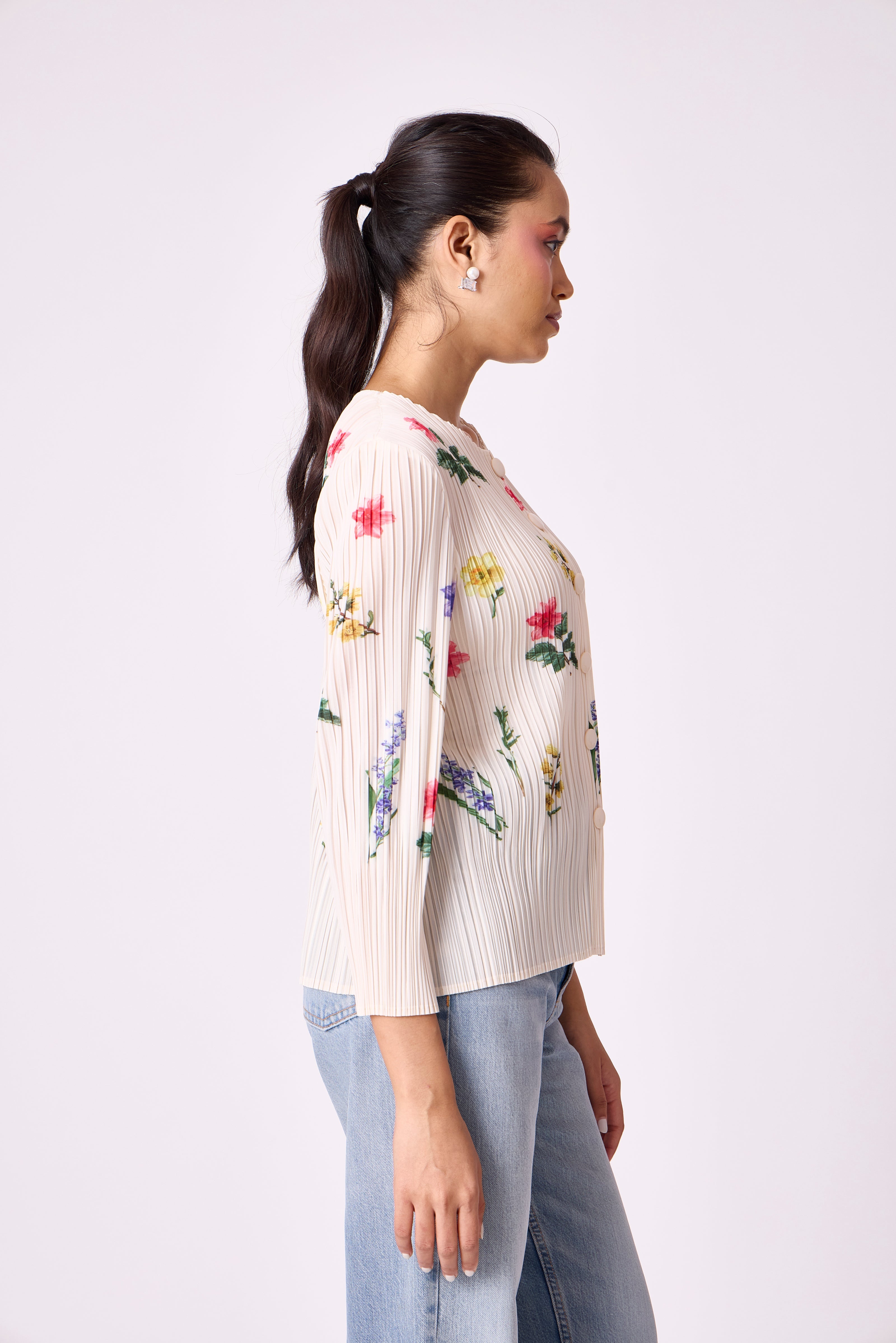 A classic printed button down pleated shirt in a floral print for a dressy day look.