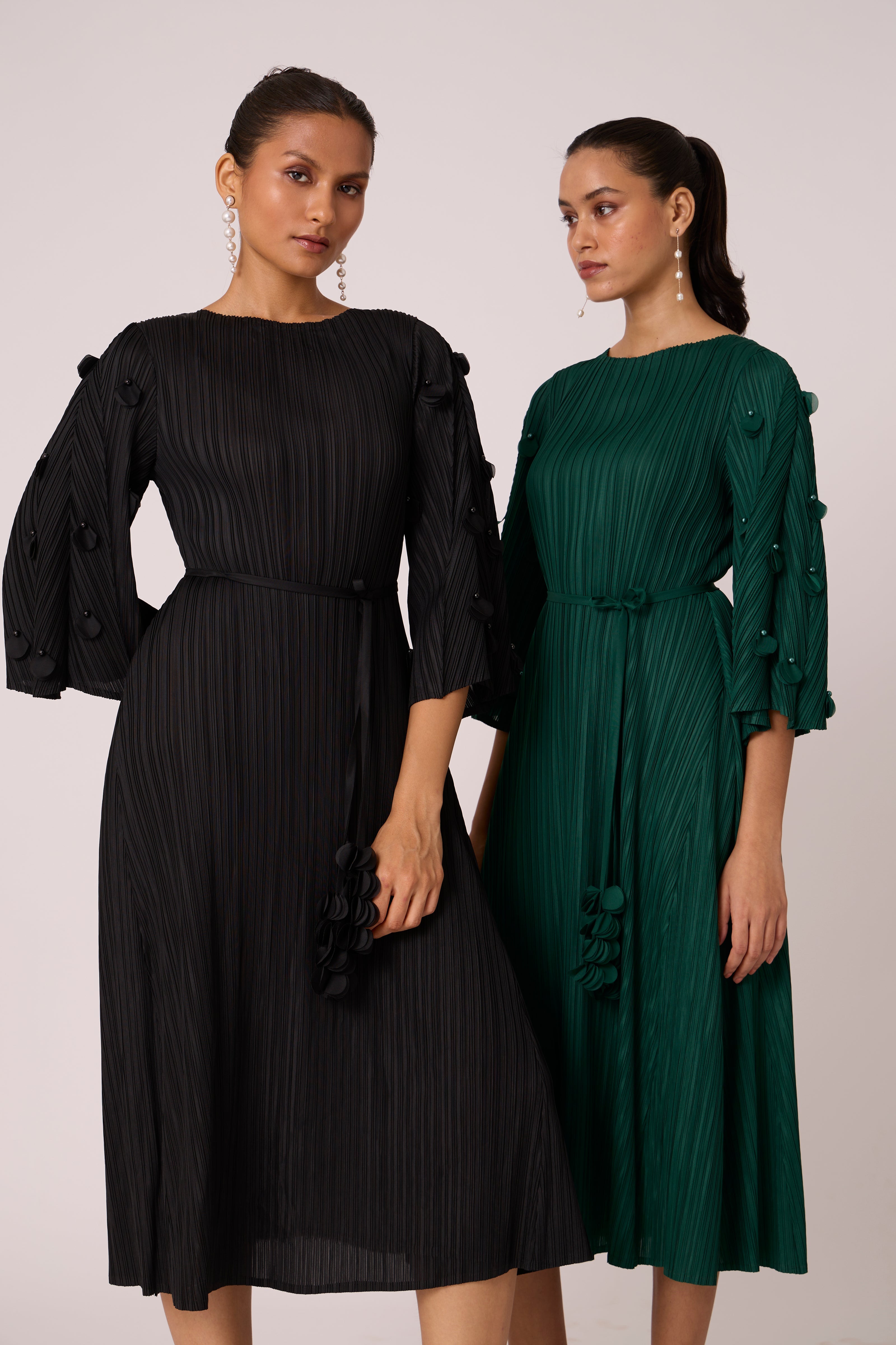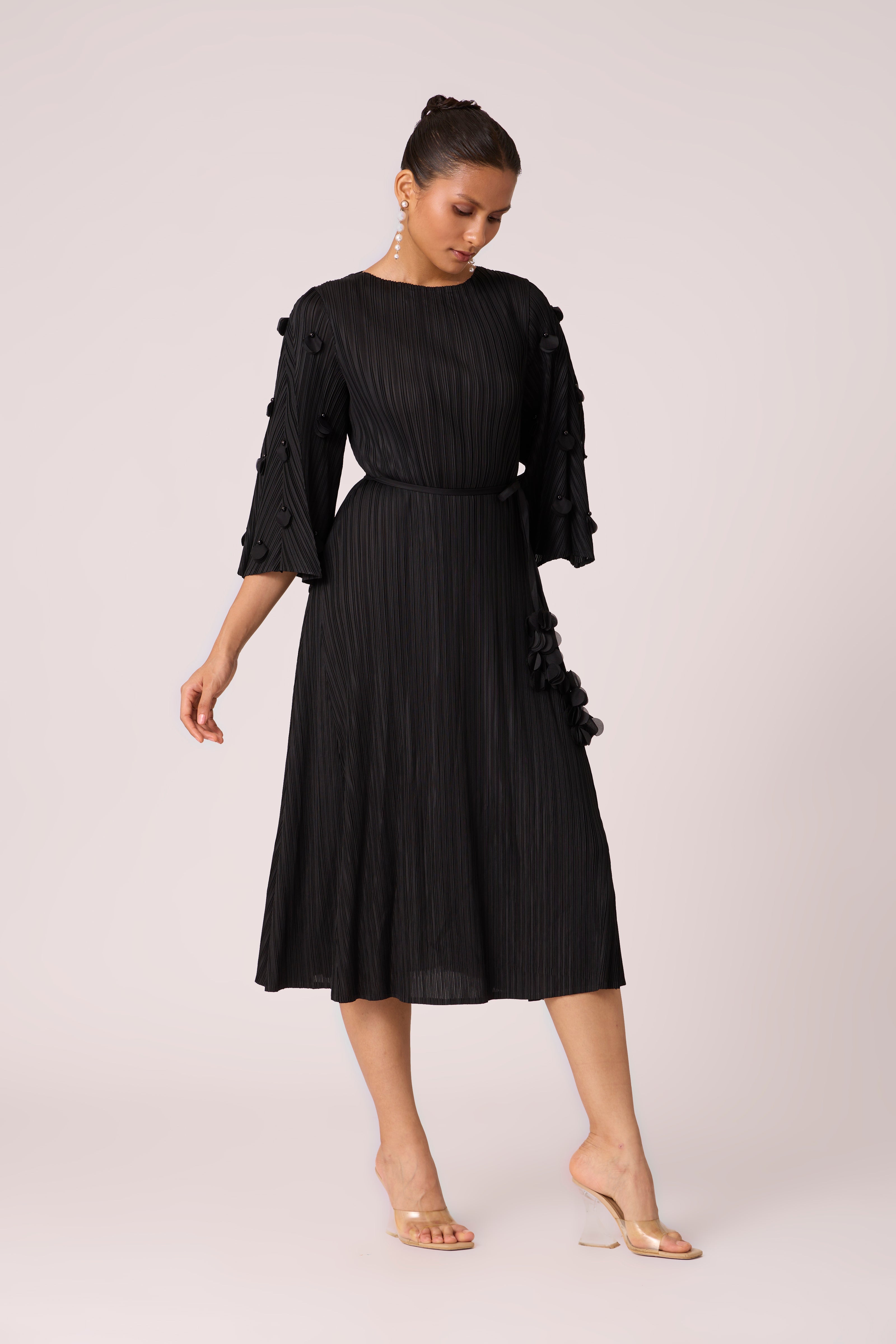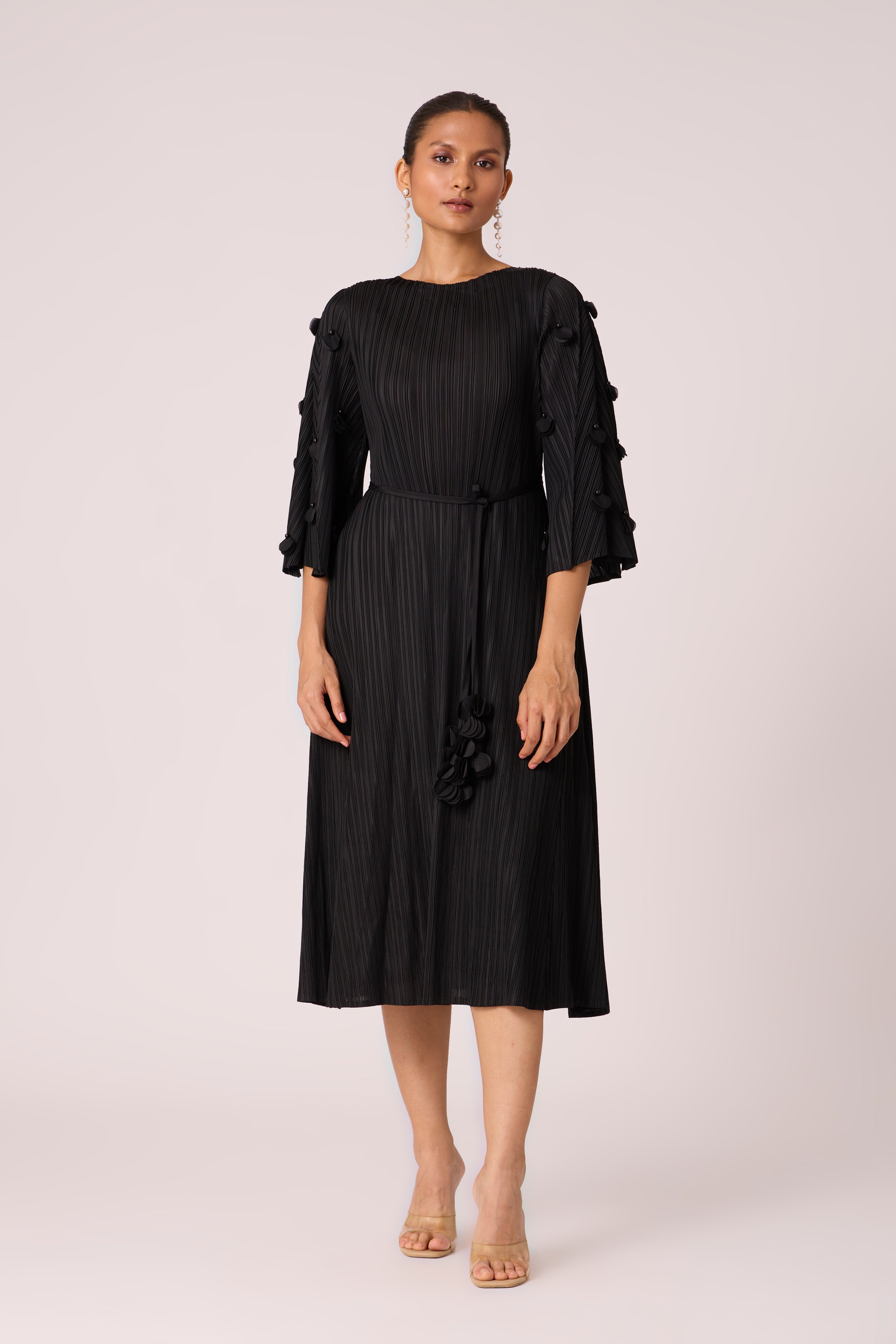 A simple A-line silhouette detailed with the same color flower sewn over for 3D effect with pearl.