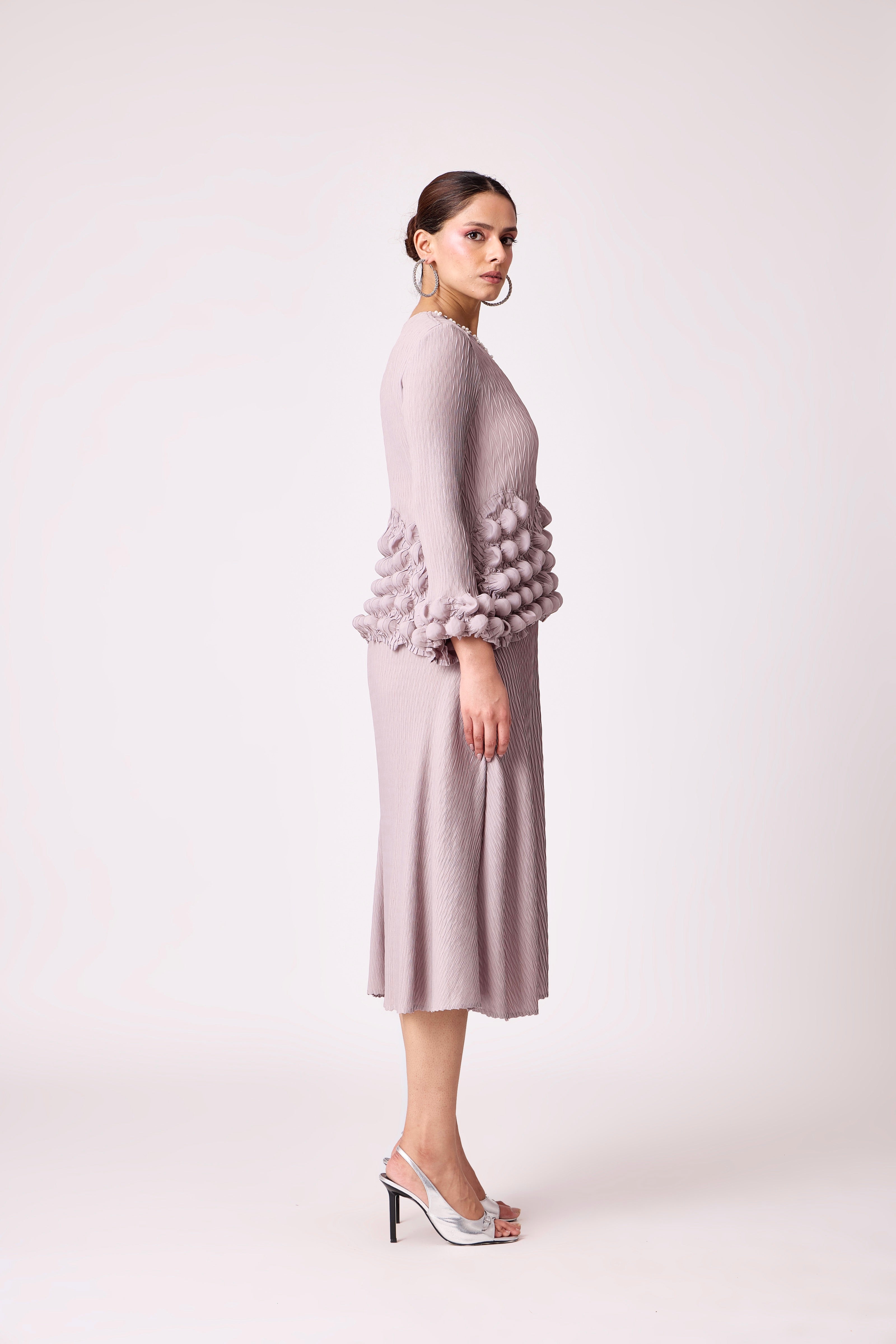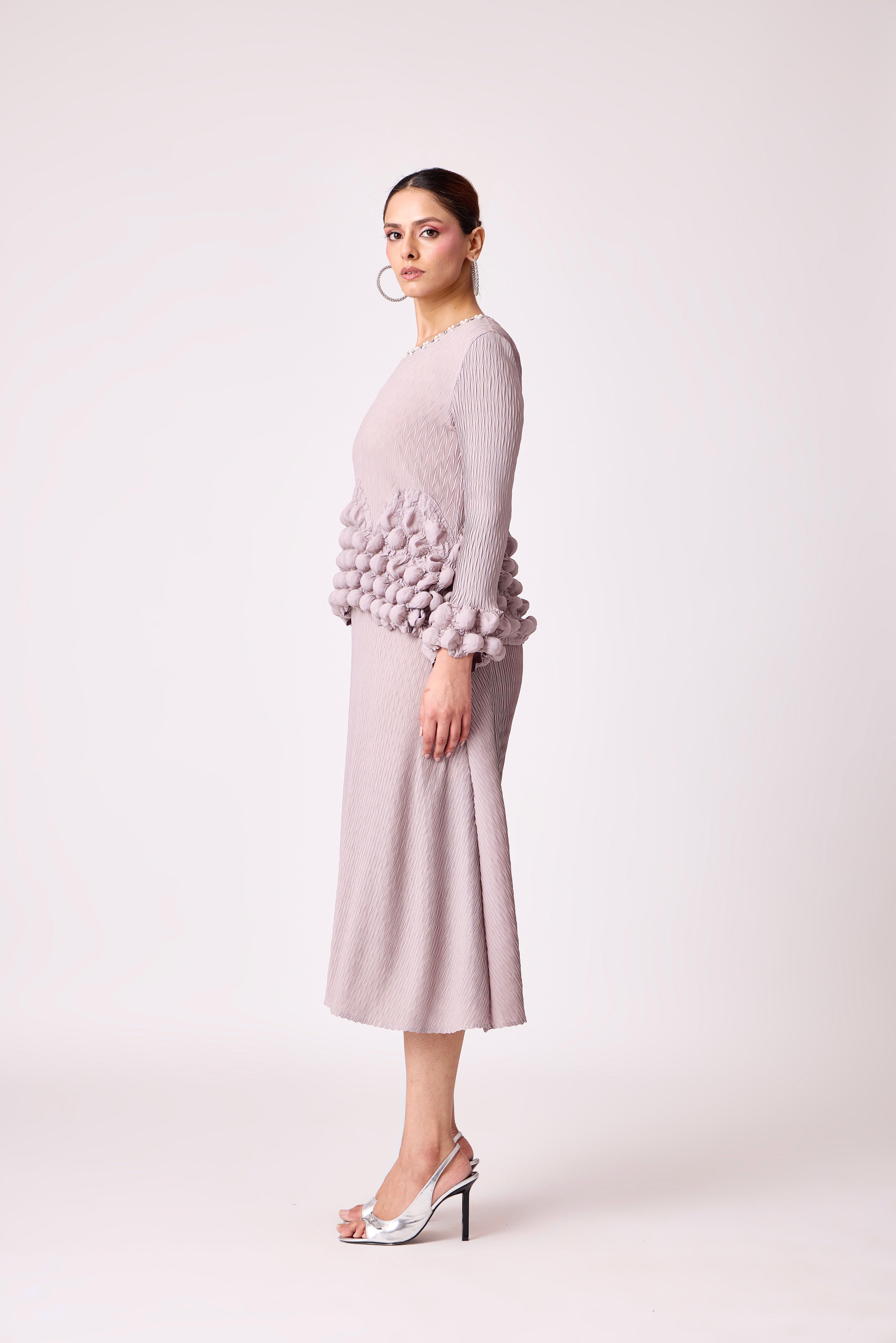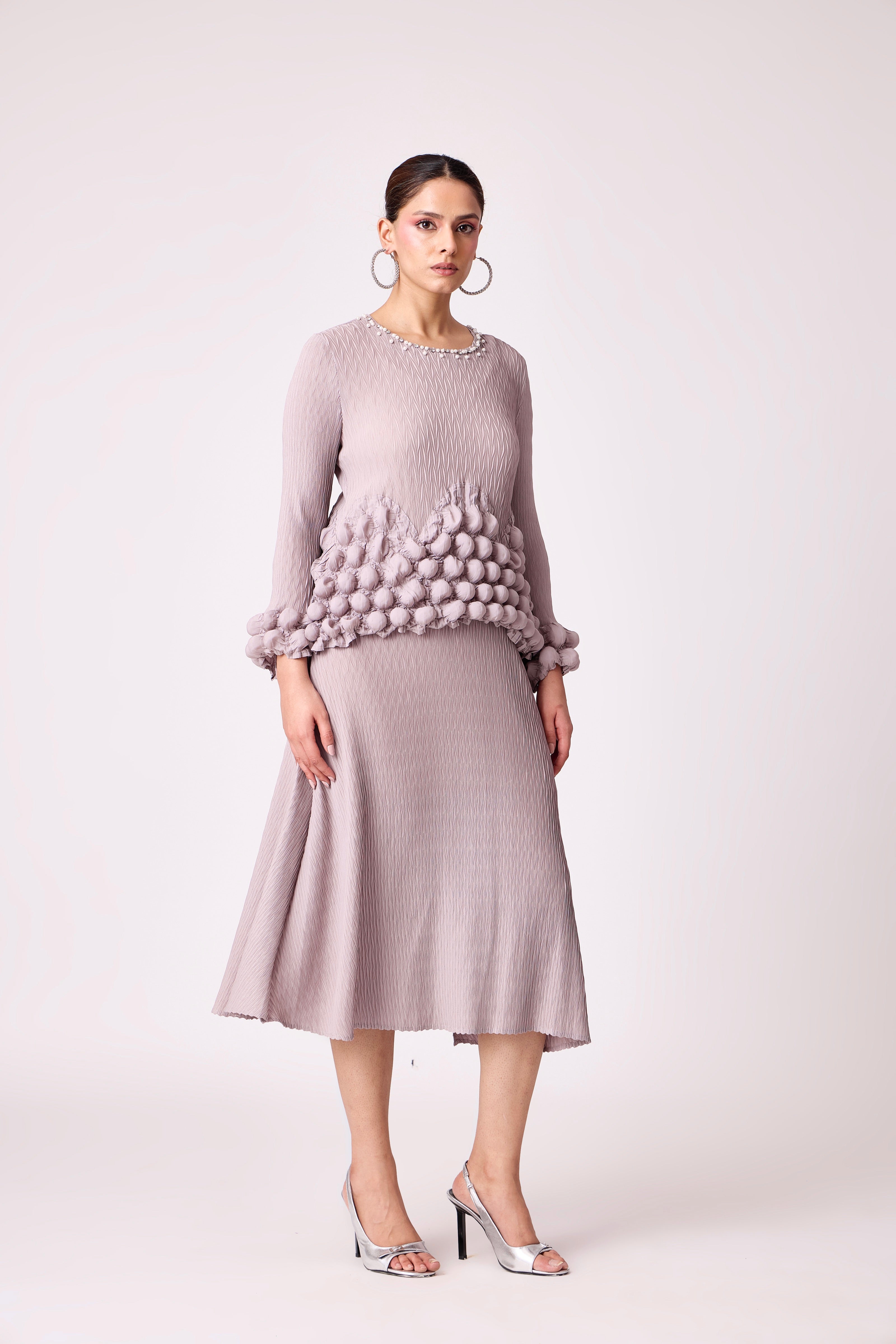 An A line dress featuring a bubble bodice and sleeve hem.