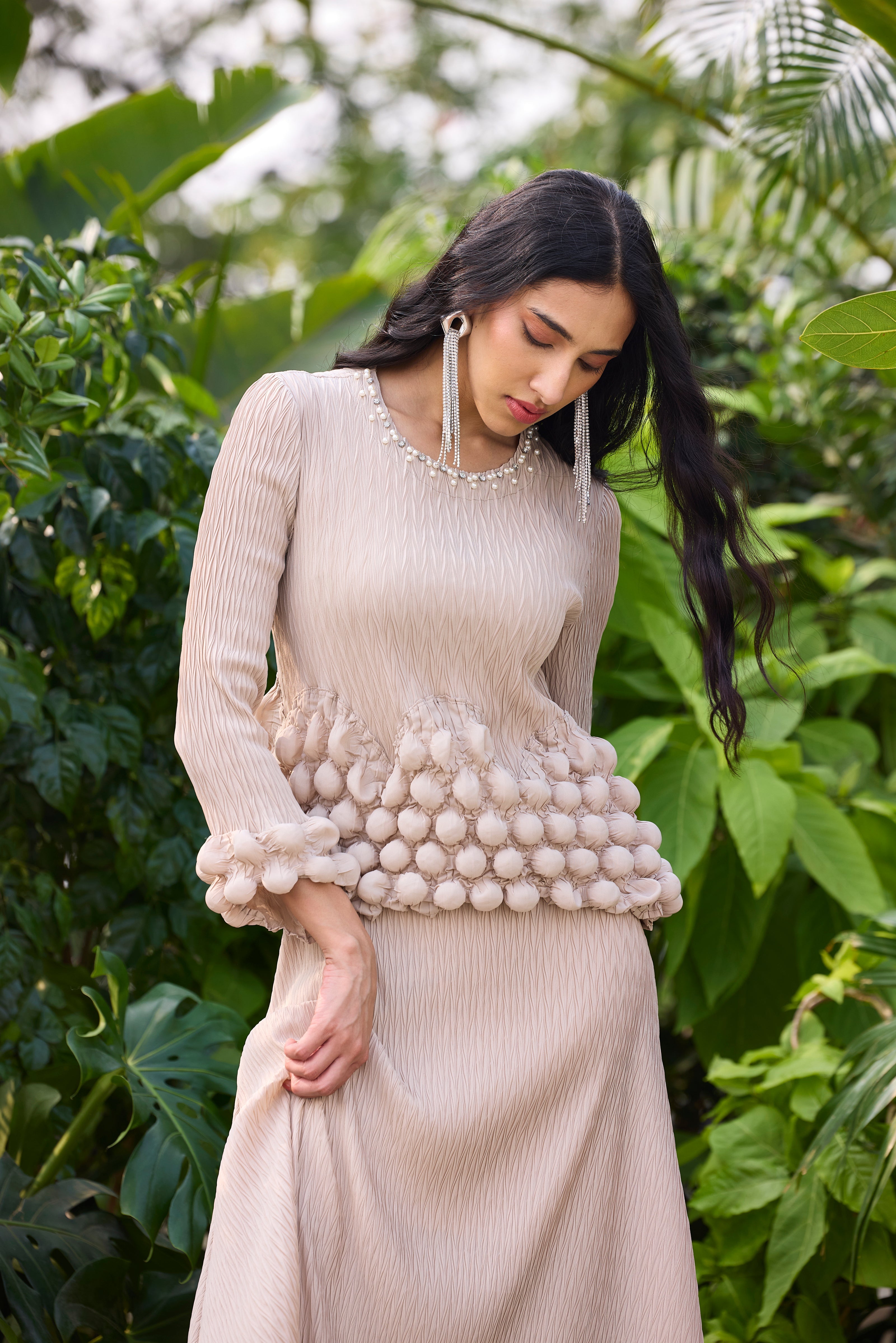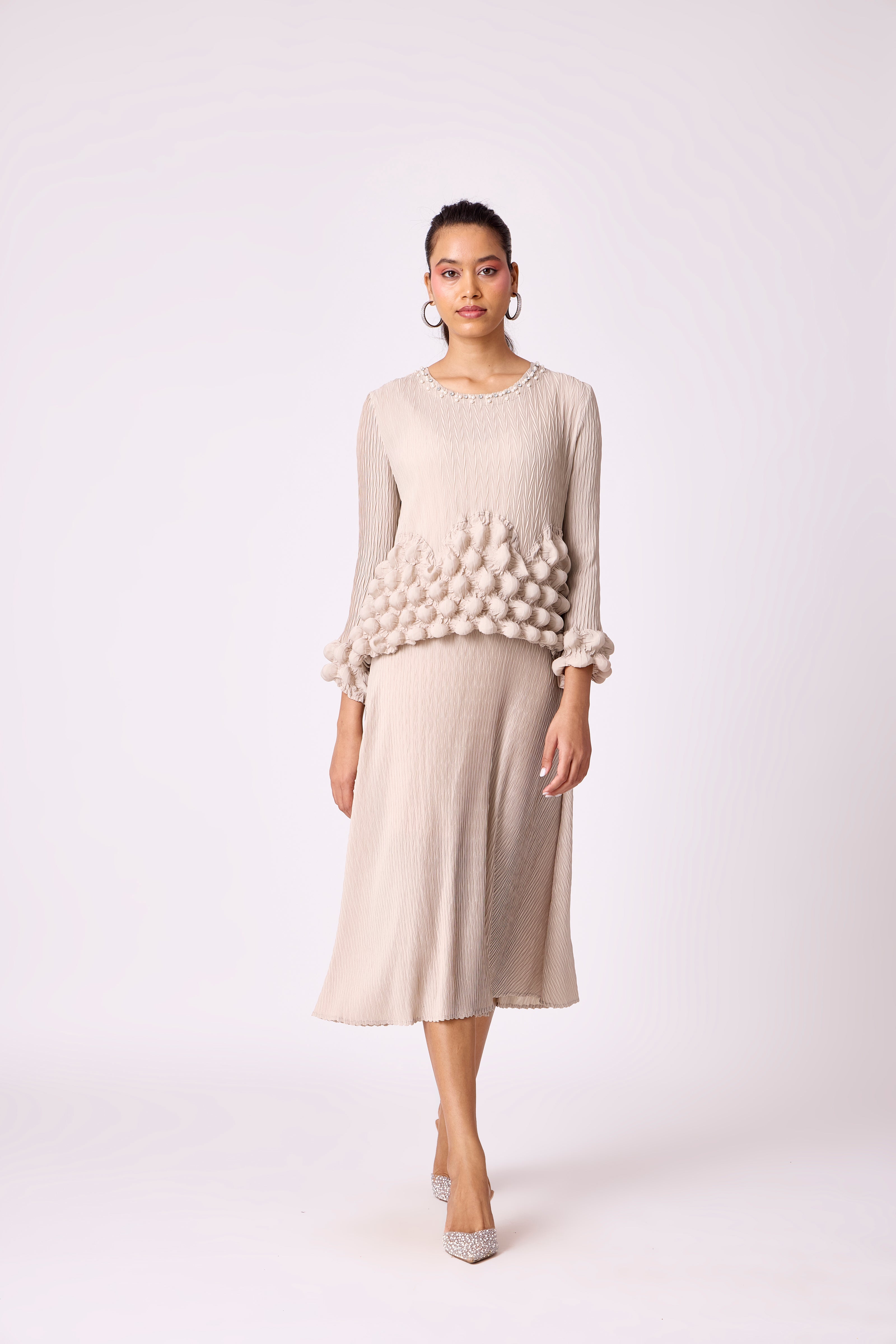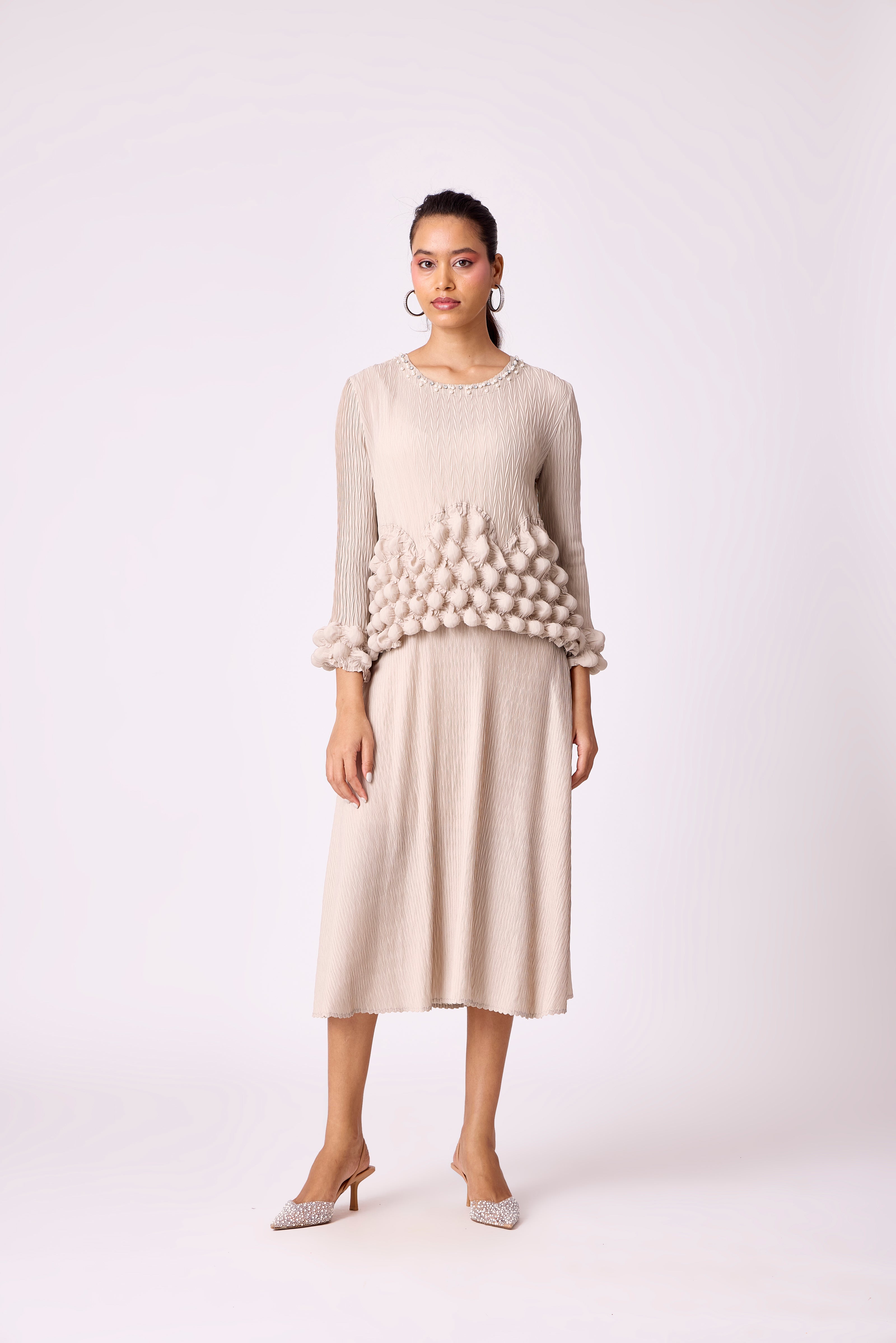 An A line dress featuring a bubble bodice and sleeve hem.