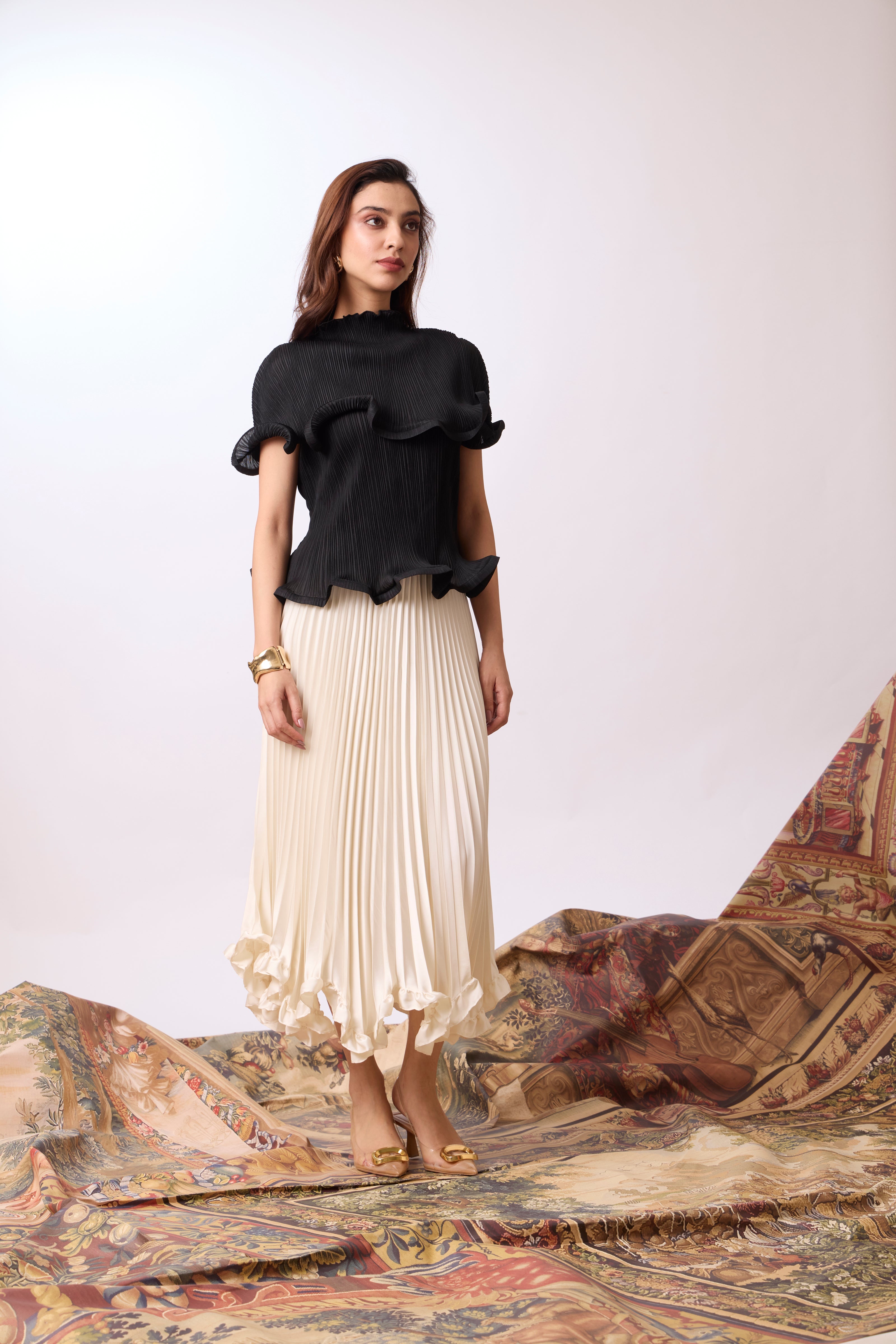 A statement ruffled hem pleated evening wear top. Pair with formal trousers, satin skirts or even Indian lehengas for a striking contemporary look.