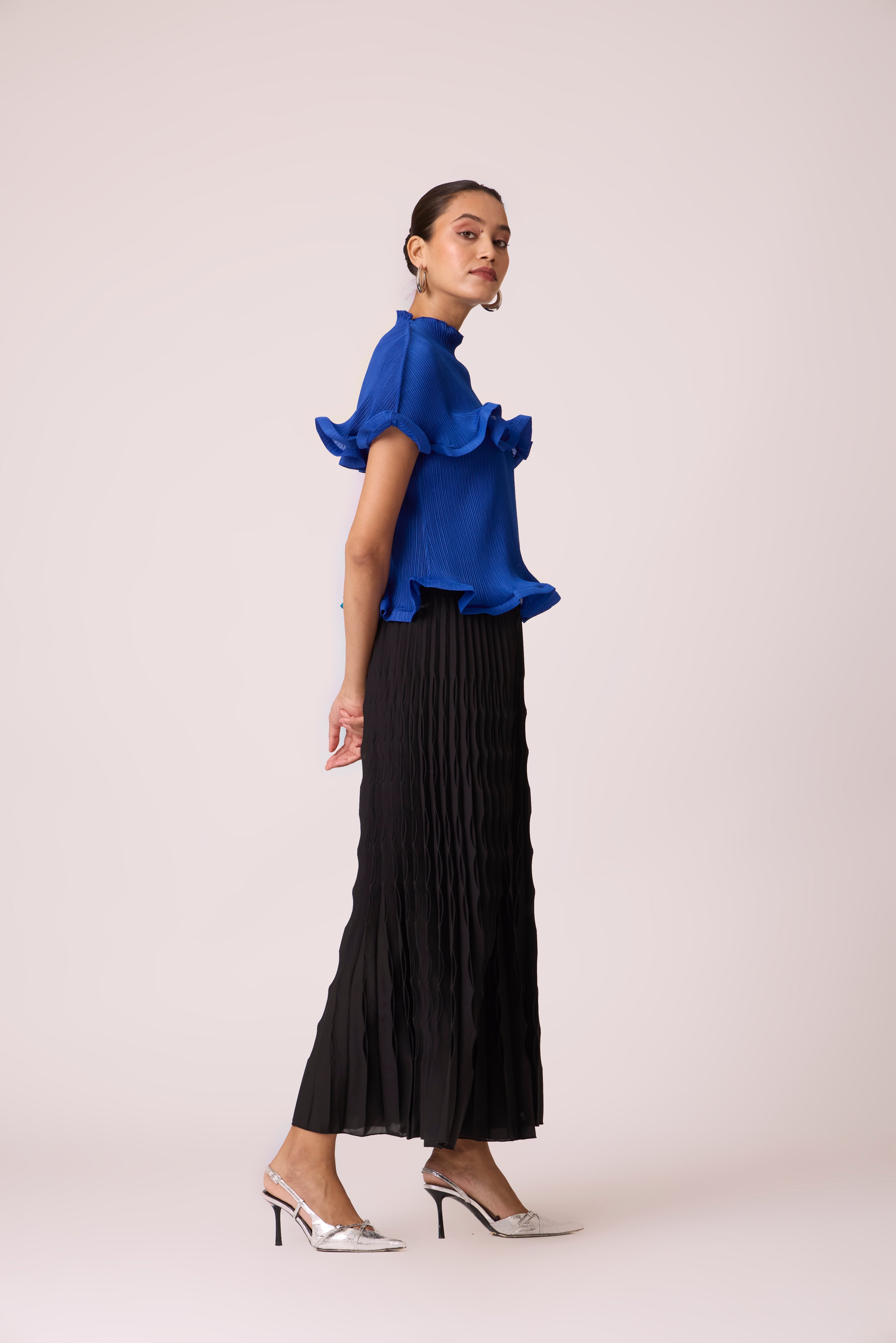 A statement ruffled hem pleated evening wear top. Pair with formal trousers, satin skirts or even Indian lehengas for a striking contemporary look.