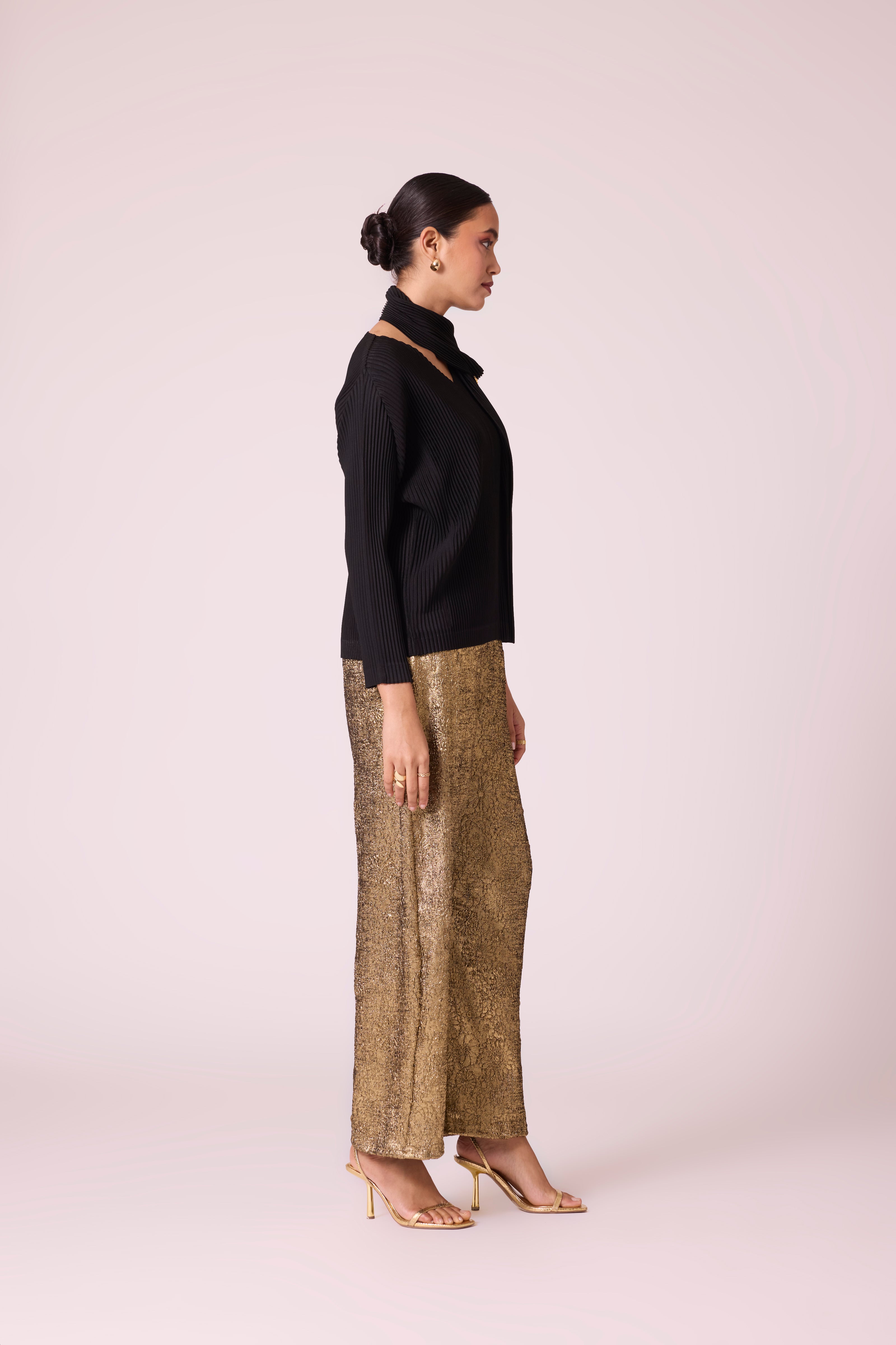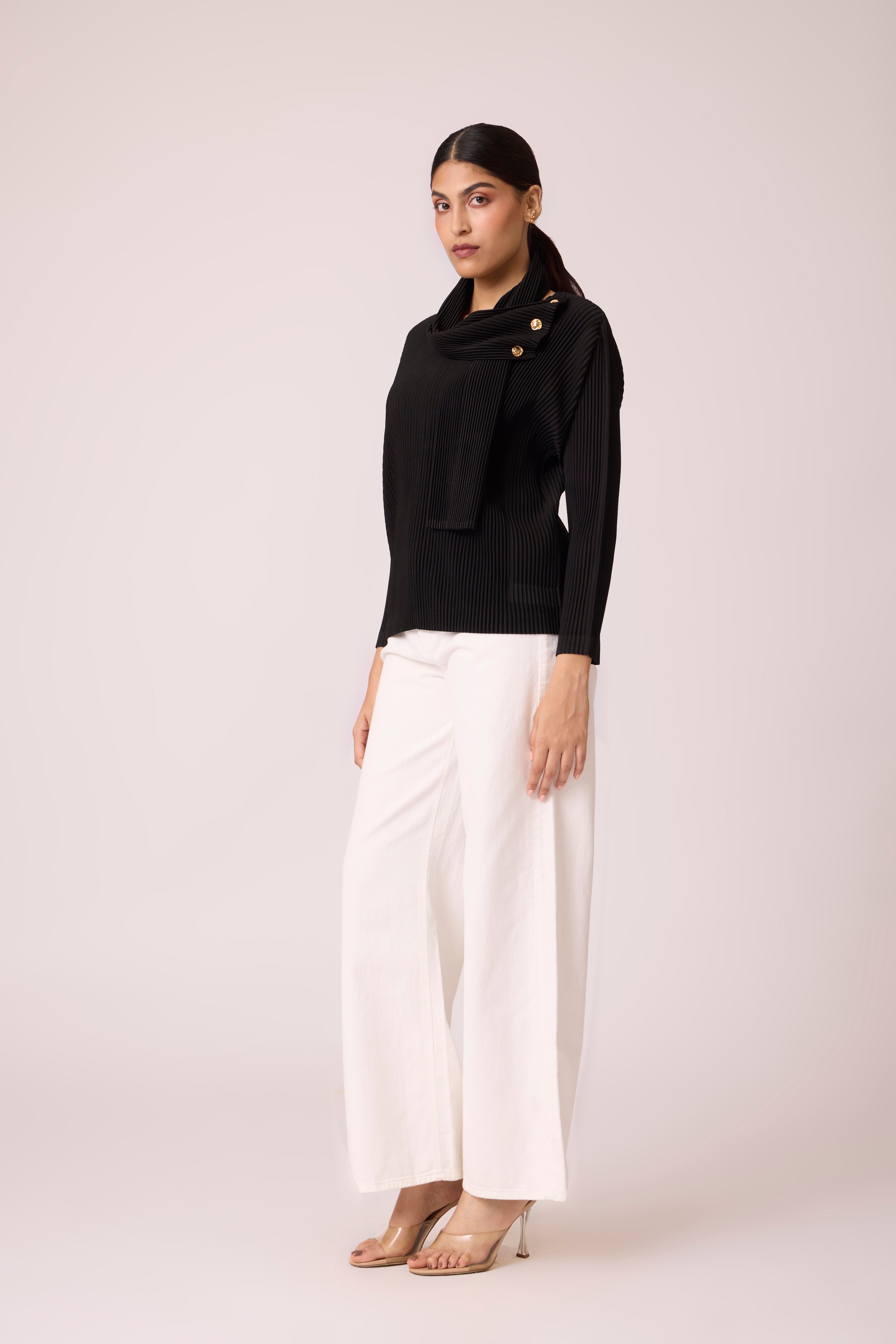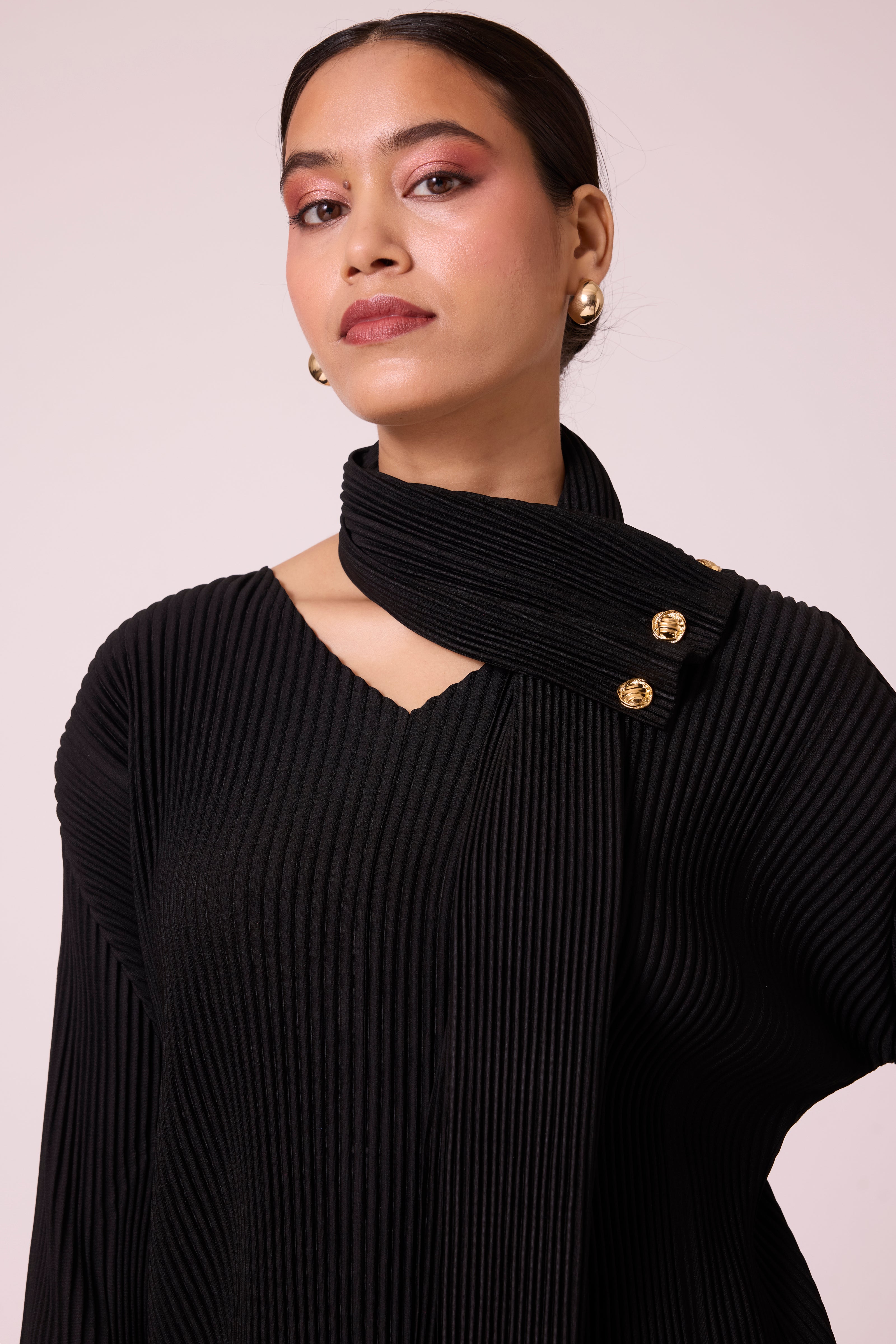 A knit pleated top with built on scarf, highlighted with gold metal button detail.