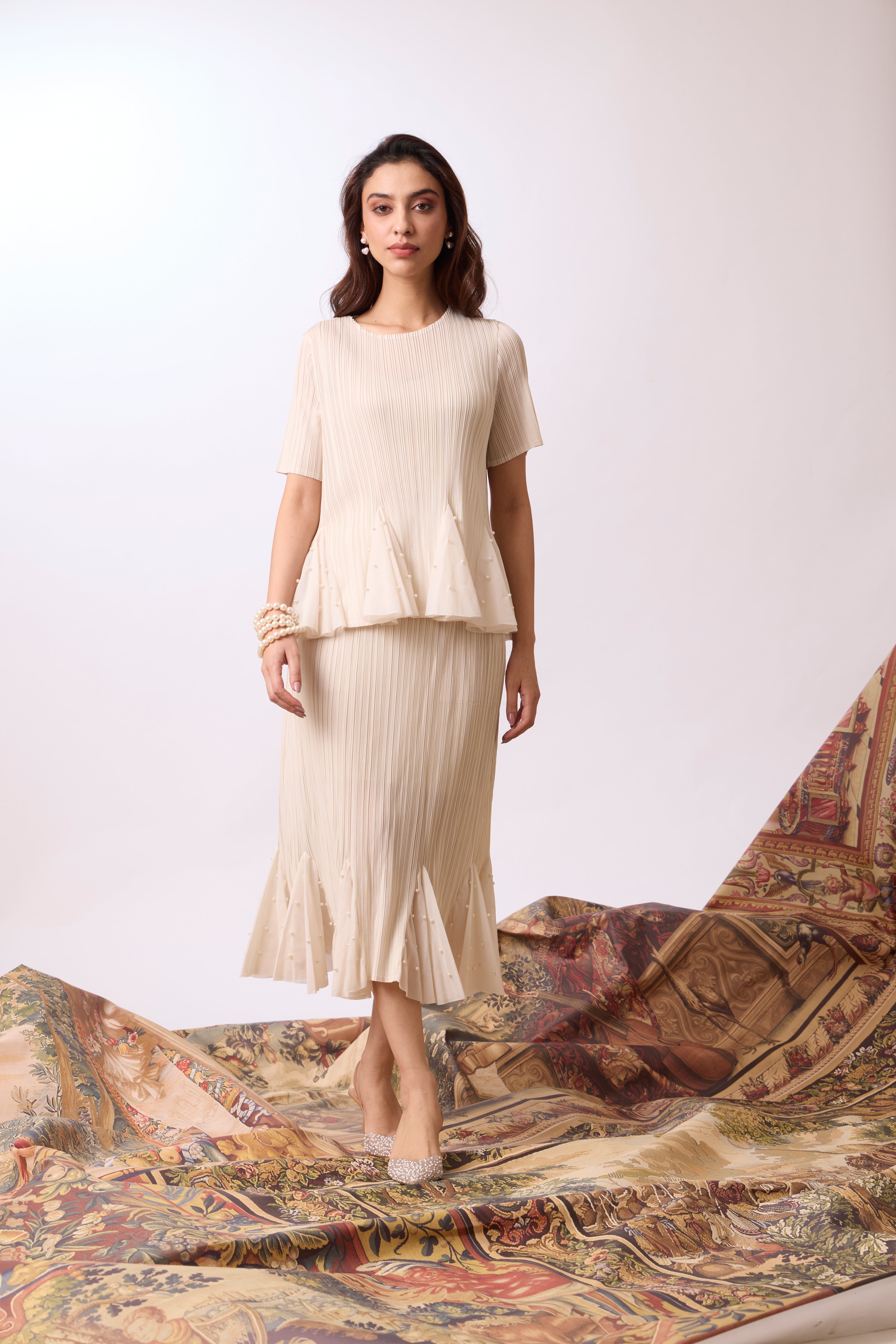 Elegant pleated and pearled skirt and top set featuring soft feminine georgette godet inserts.