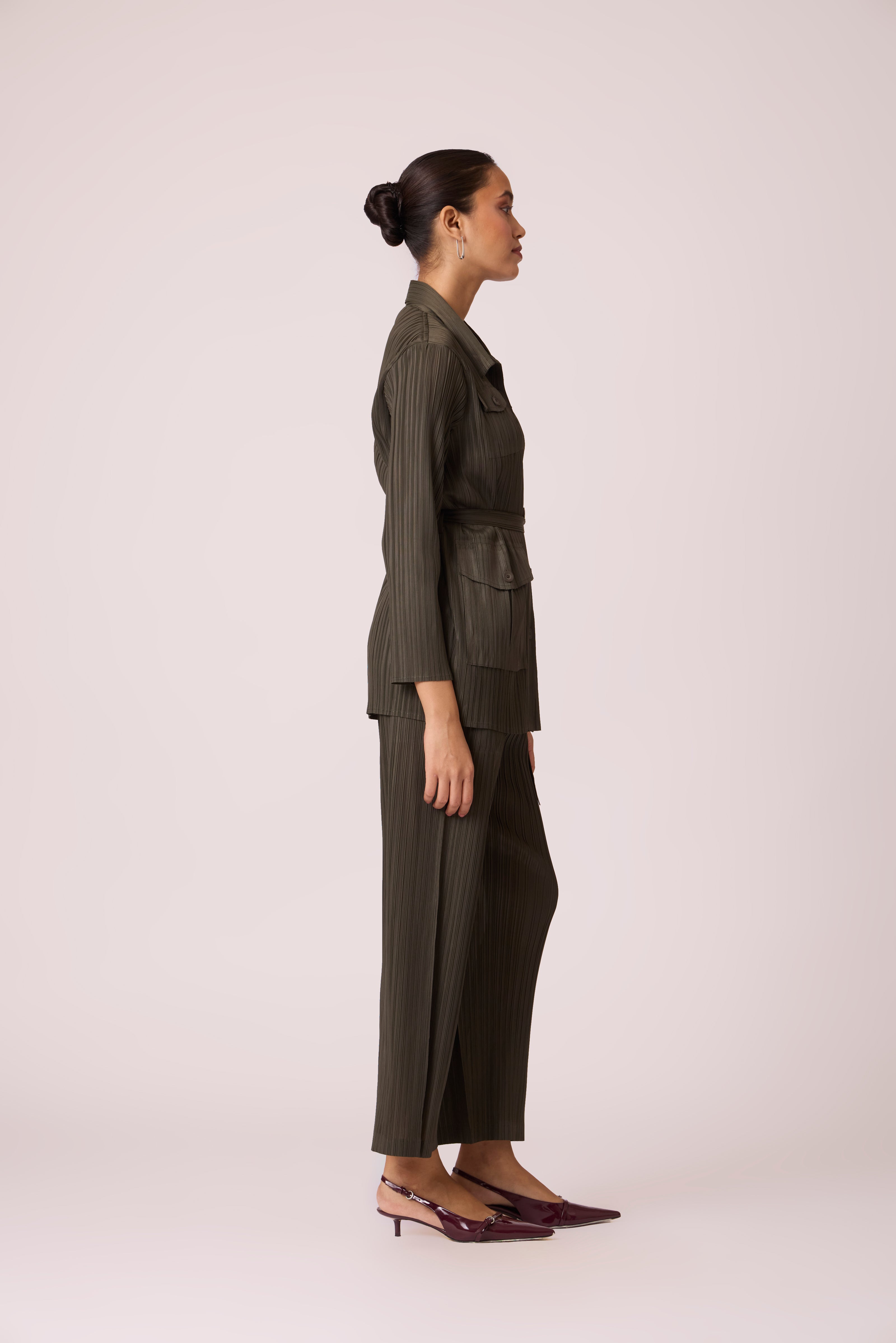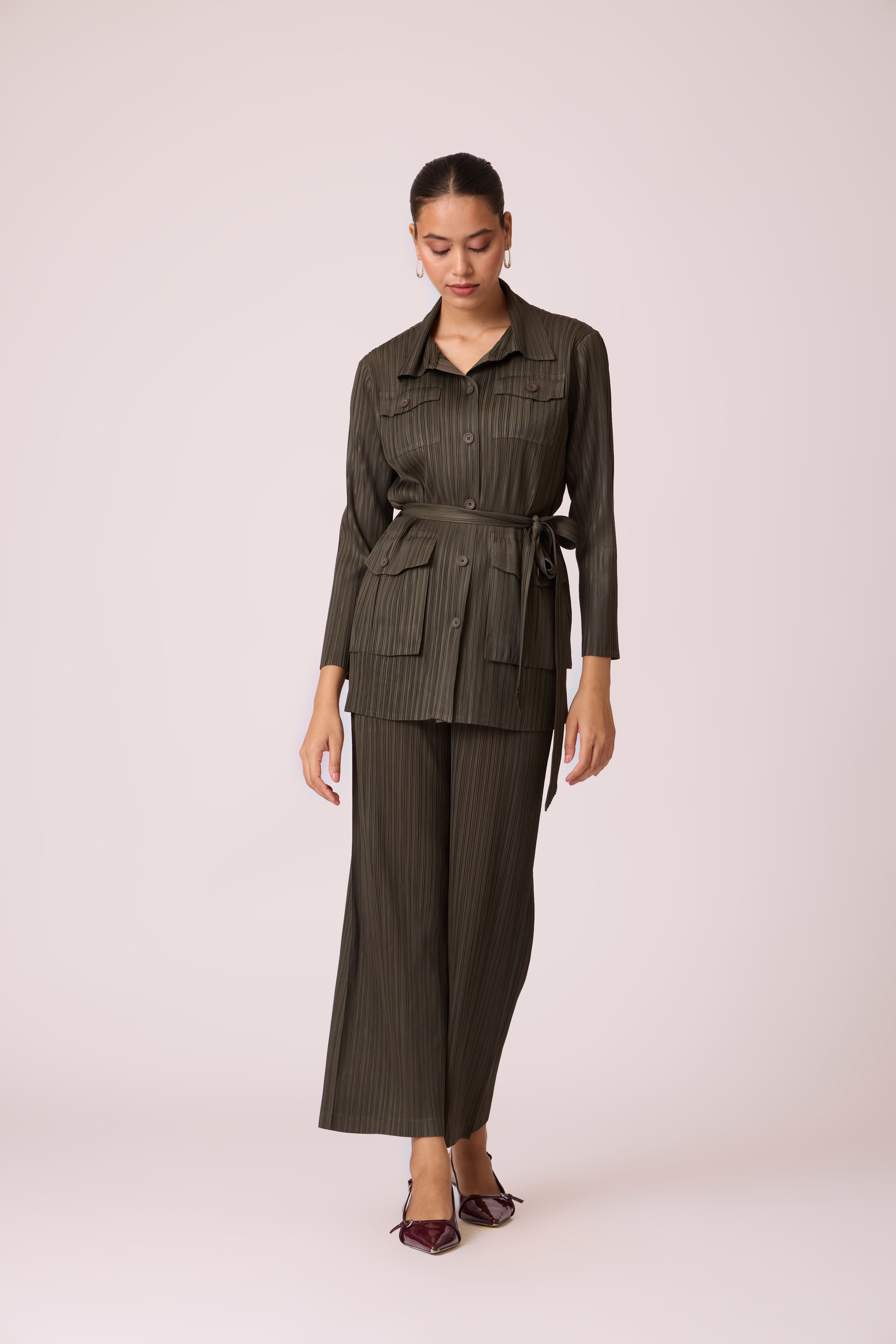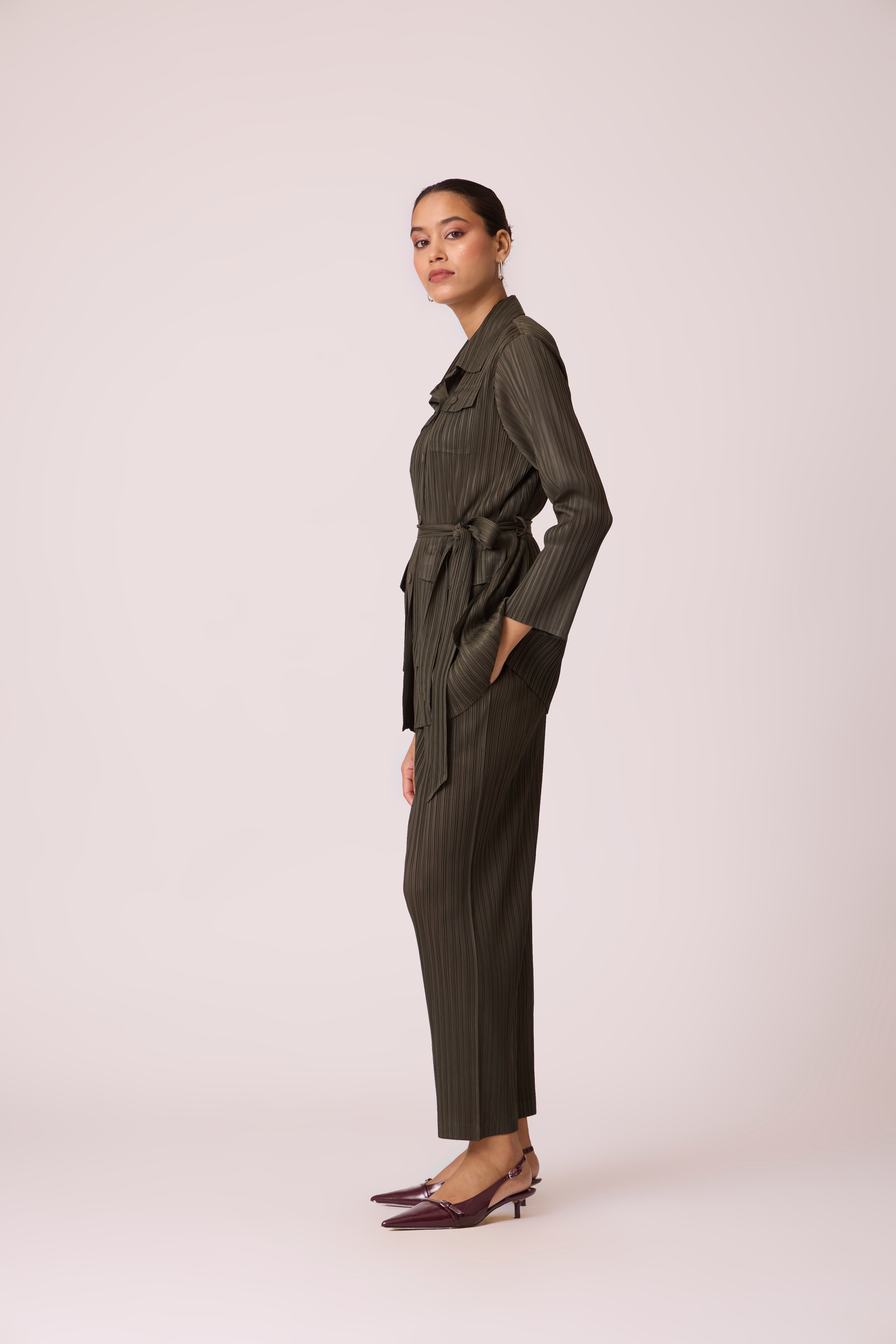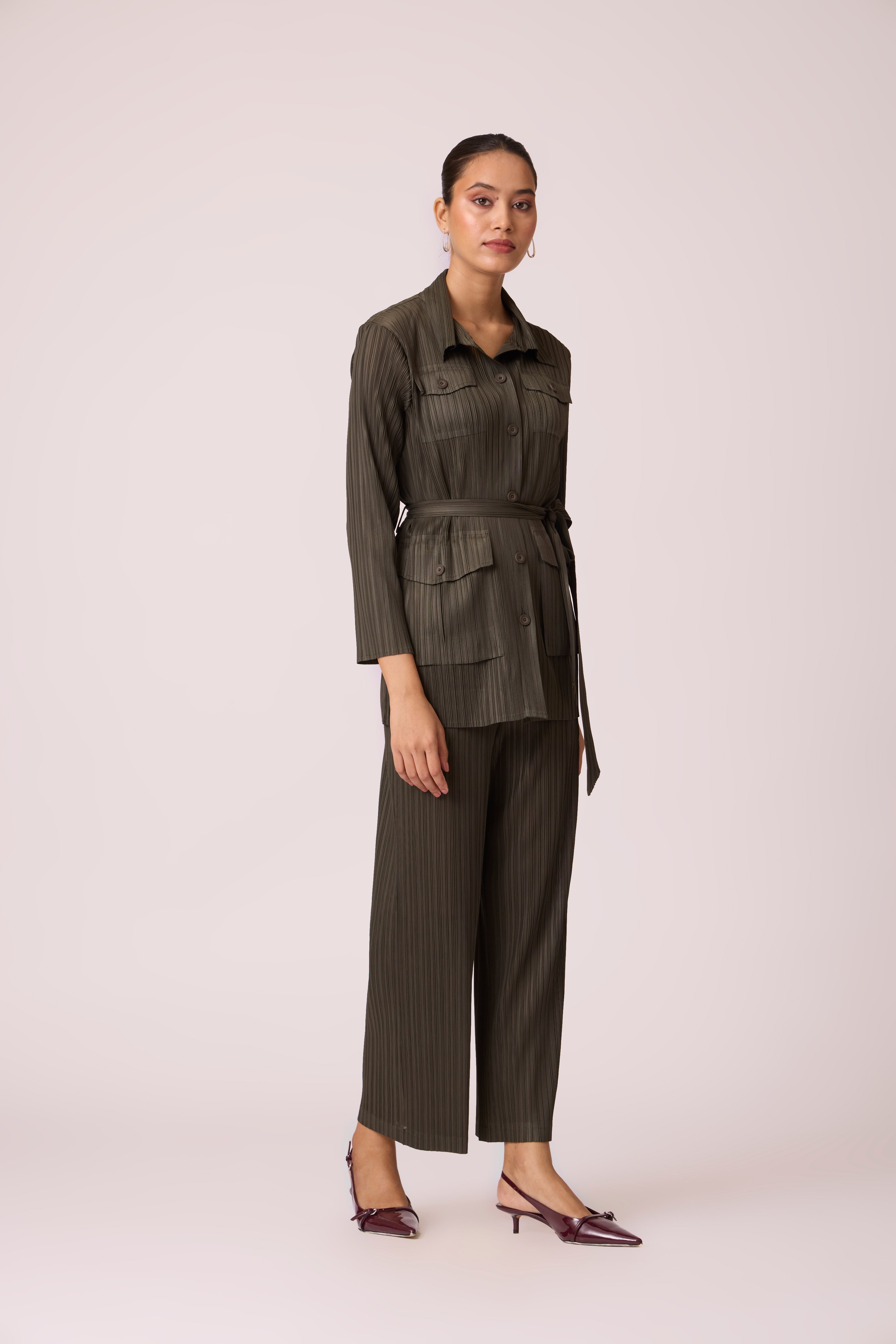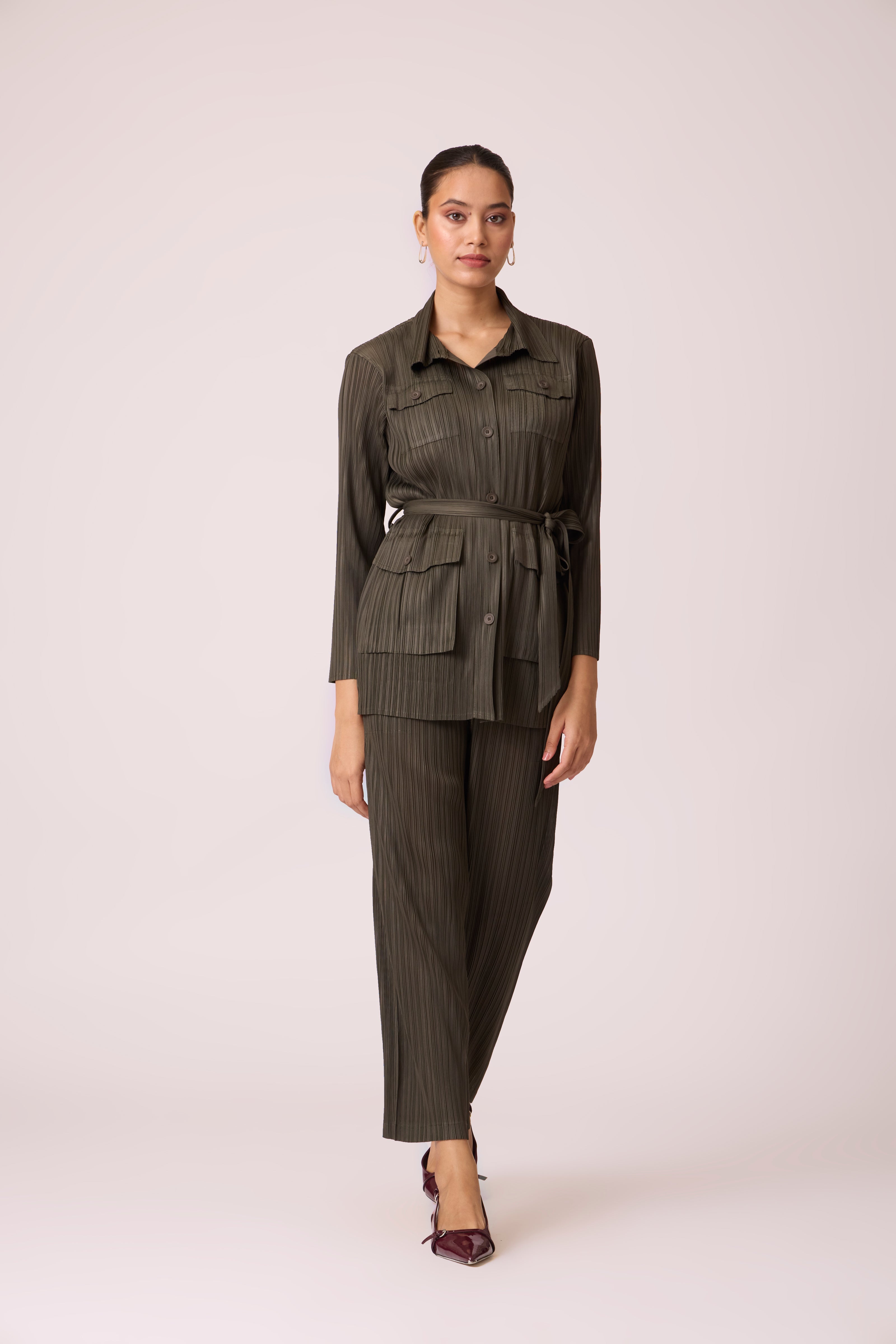 Trench like shirt top paired with straight leg pants and matching belt for a stylish co-ordinated look...