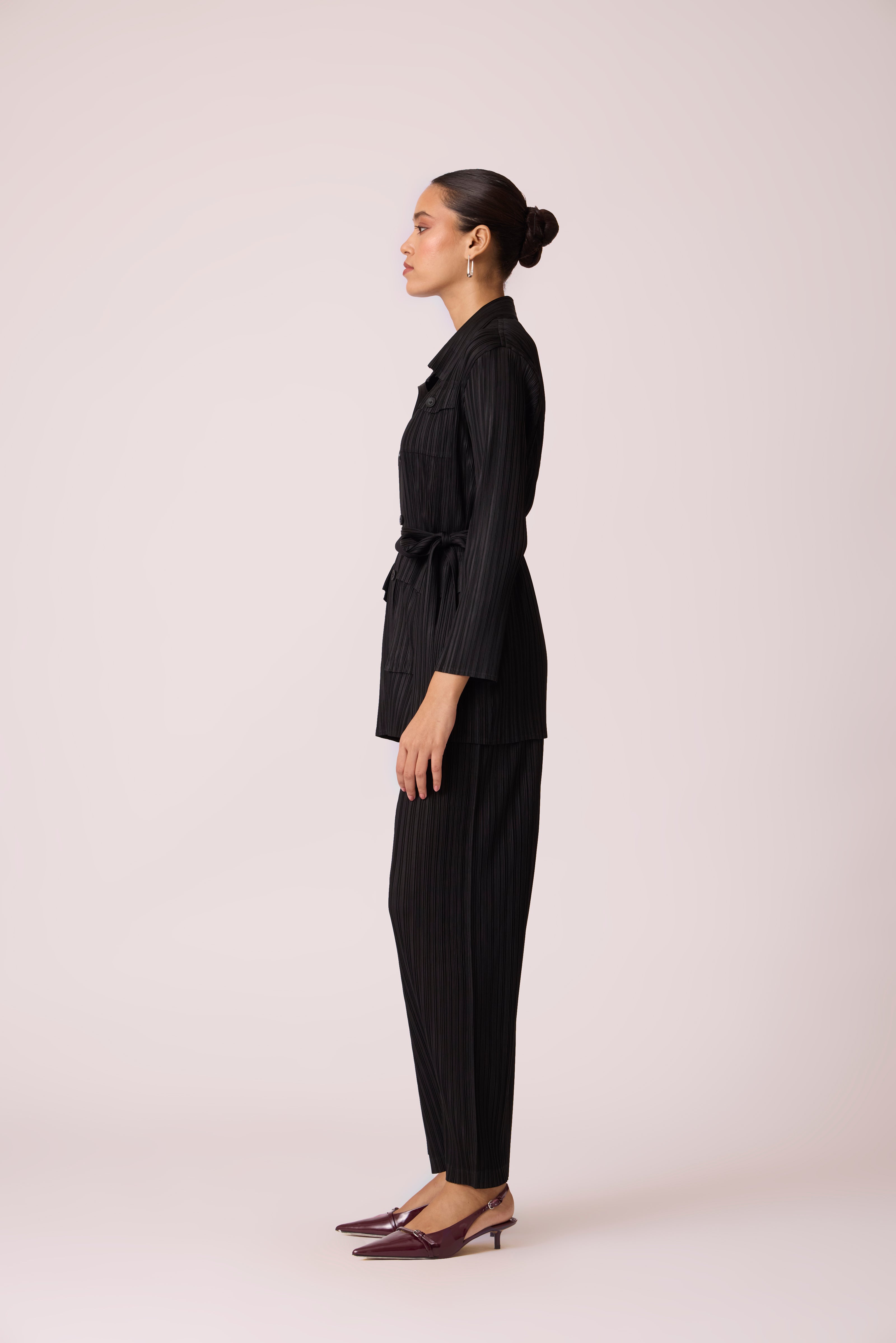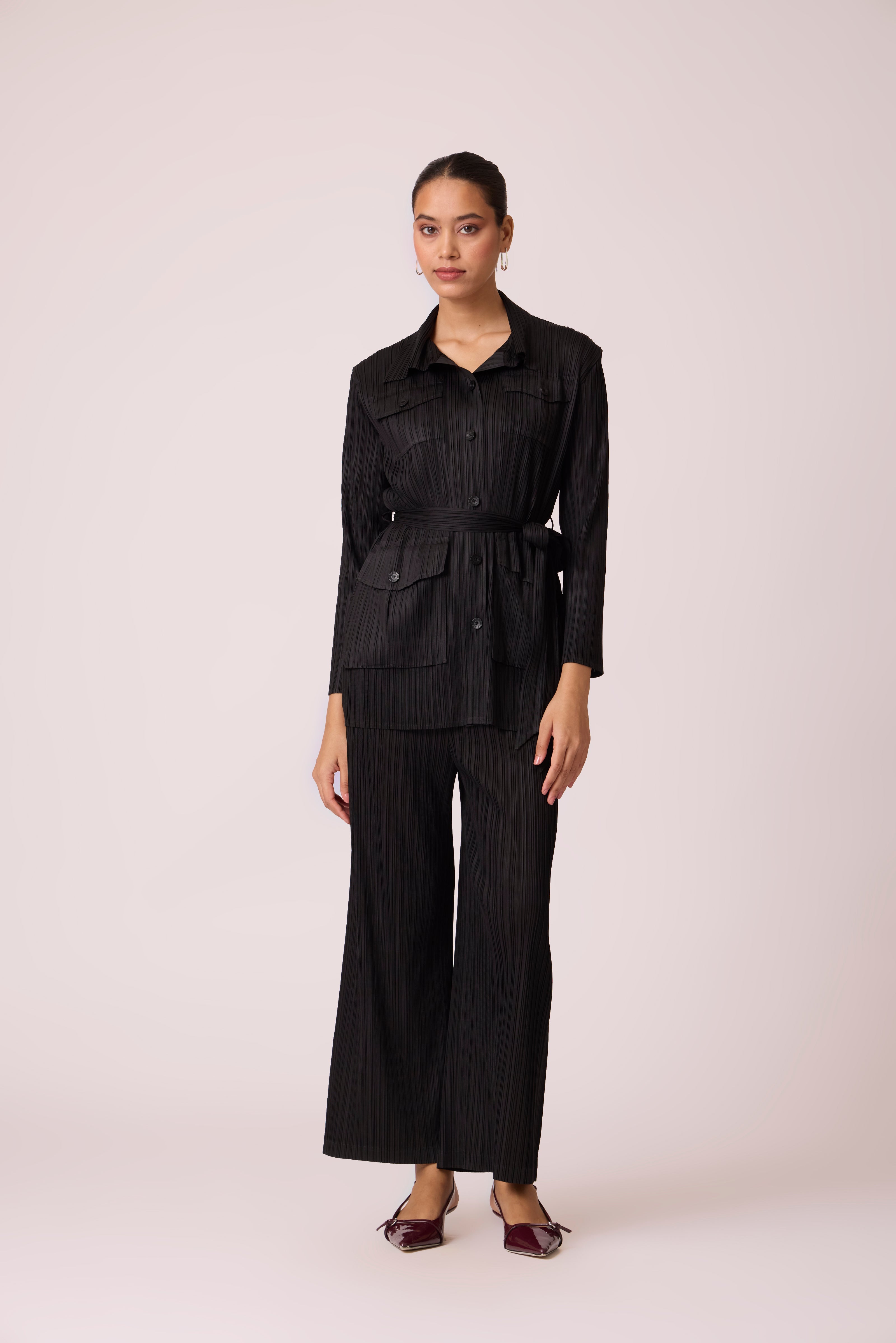 Trench like shirt top paired with straight leg pants and matching belt for a stylish co-ordinated look matching the strong fall season trends. Perfect to travel in and layer under long coats and over warm thermals.