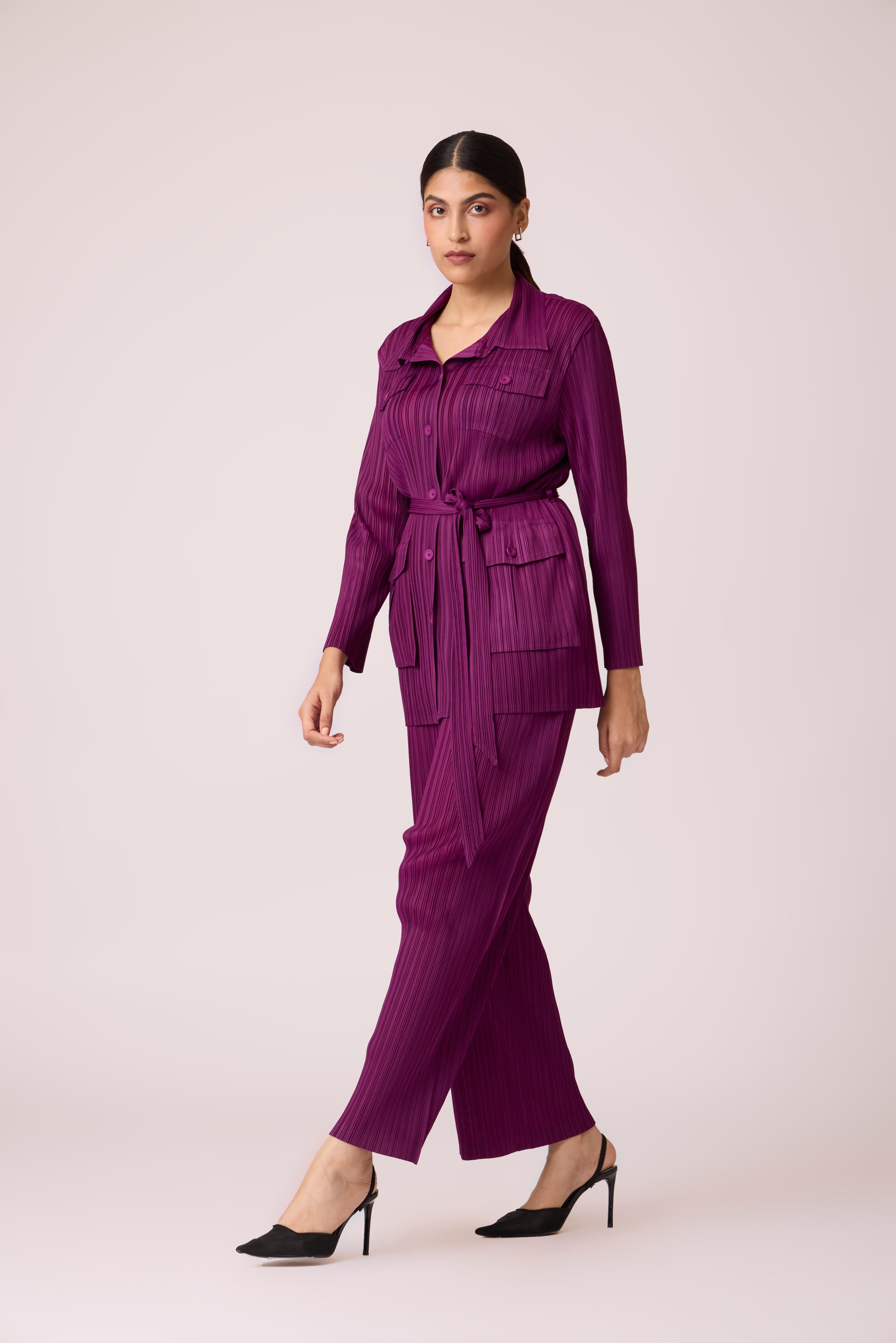 Trench like shirt top paired with straight leg pants and matching belt for a stylish co-ordinated look matching the strong fall season trends. Perfect to travel in and layer under long coats and over warm thermals.