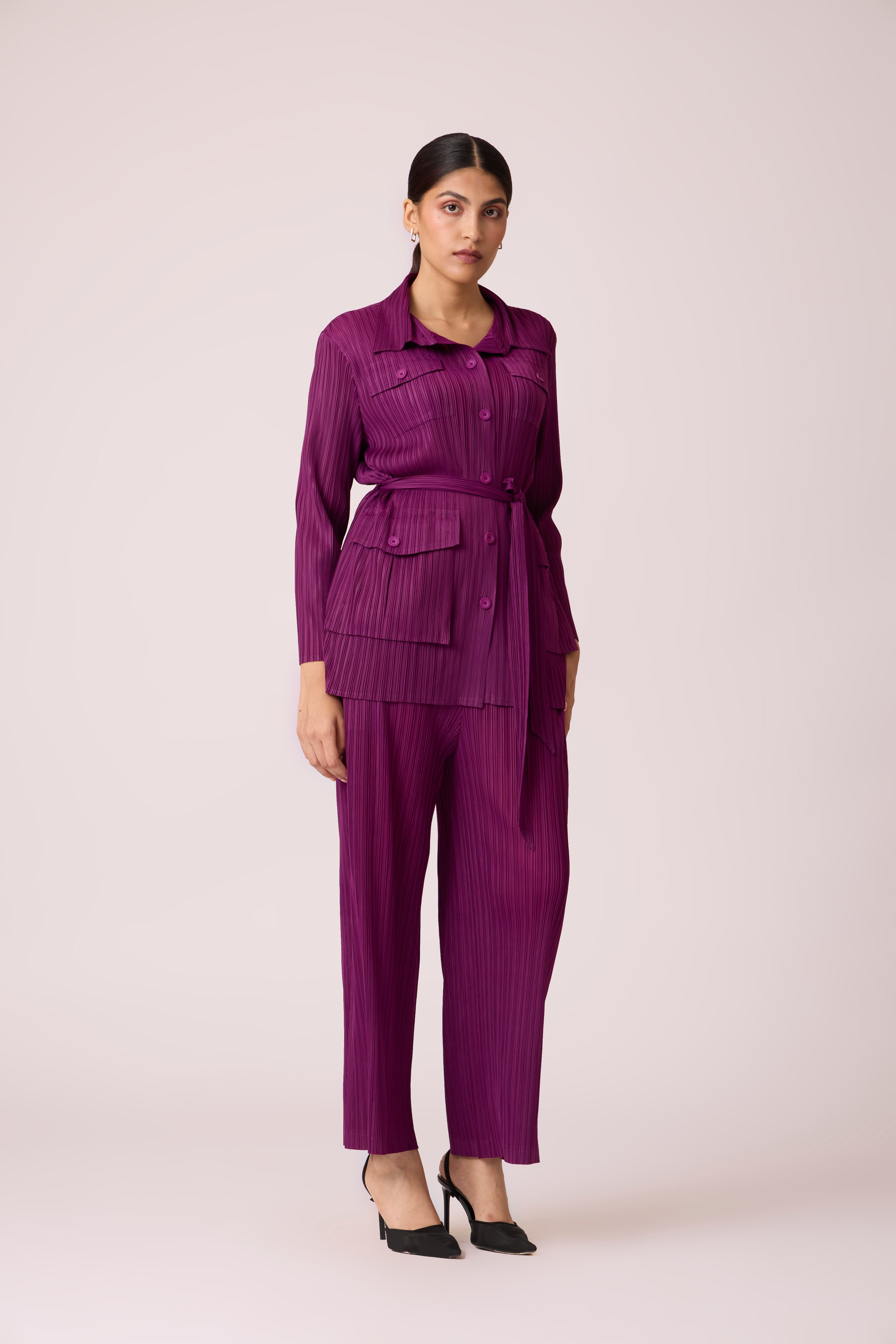 Trench like shirt top paired with straight leg pants and matching belt for a stylish co-ordinated look...