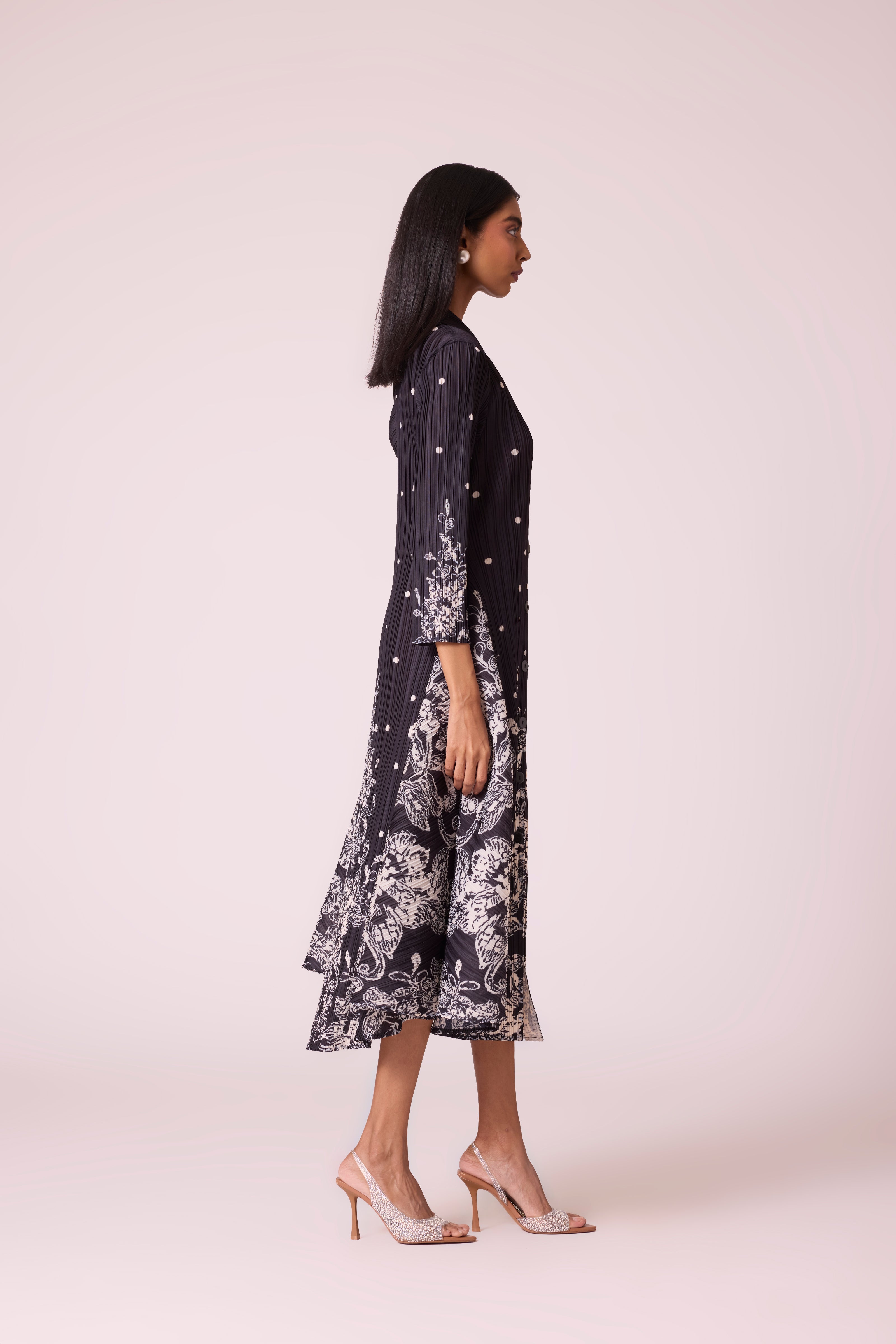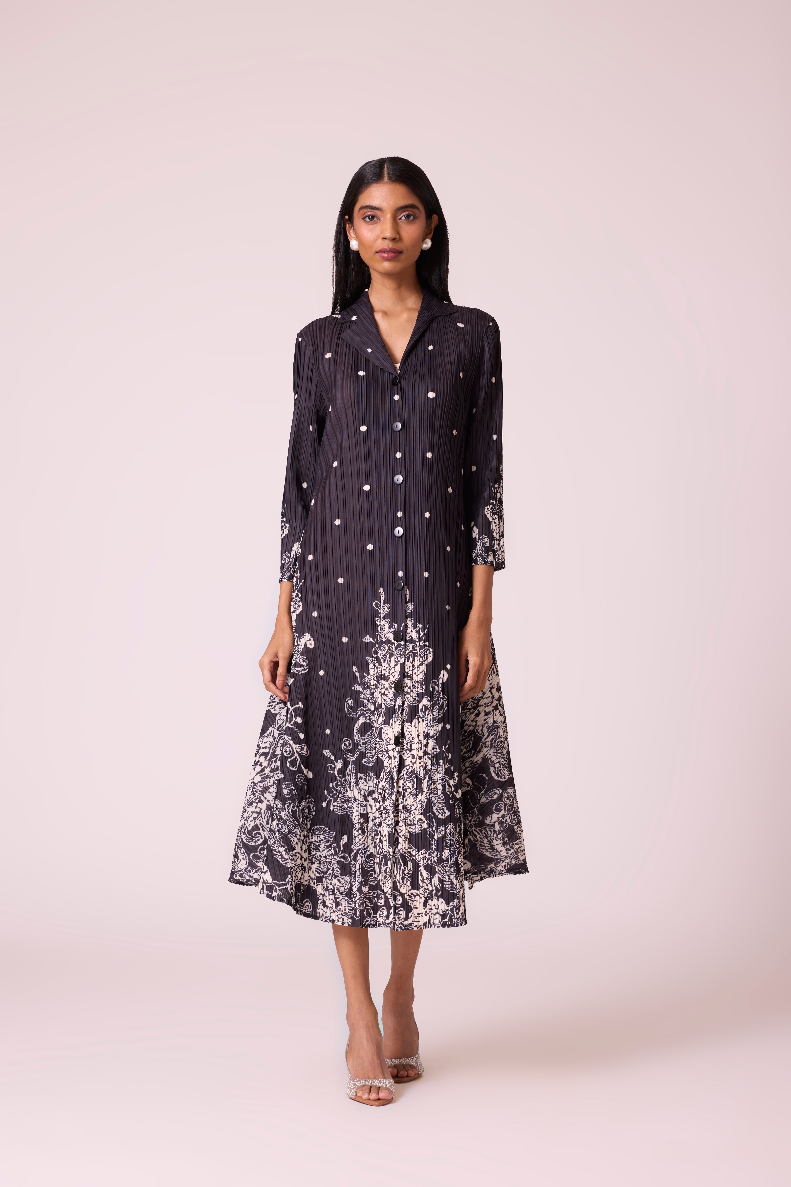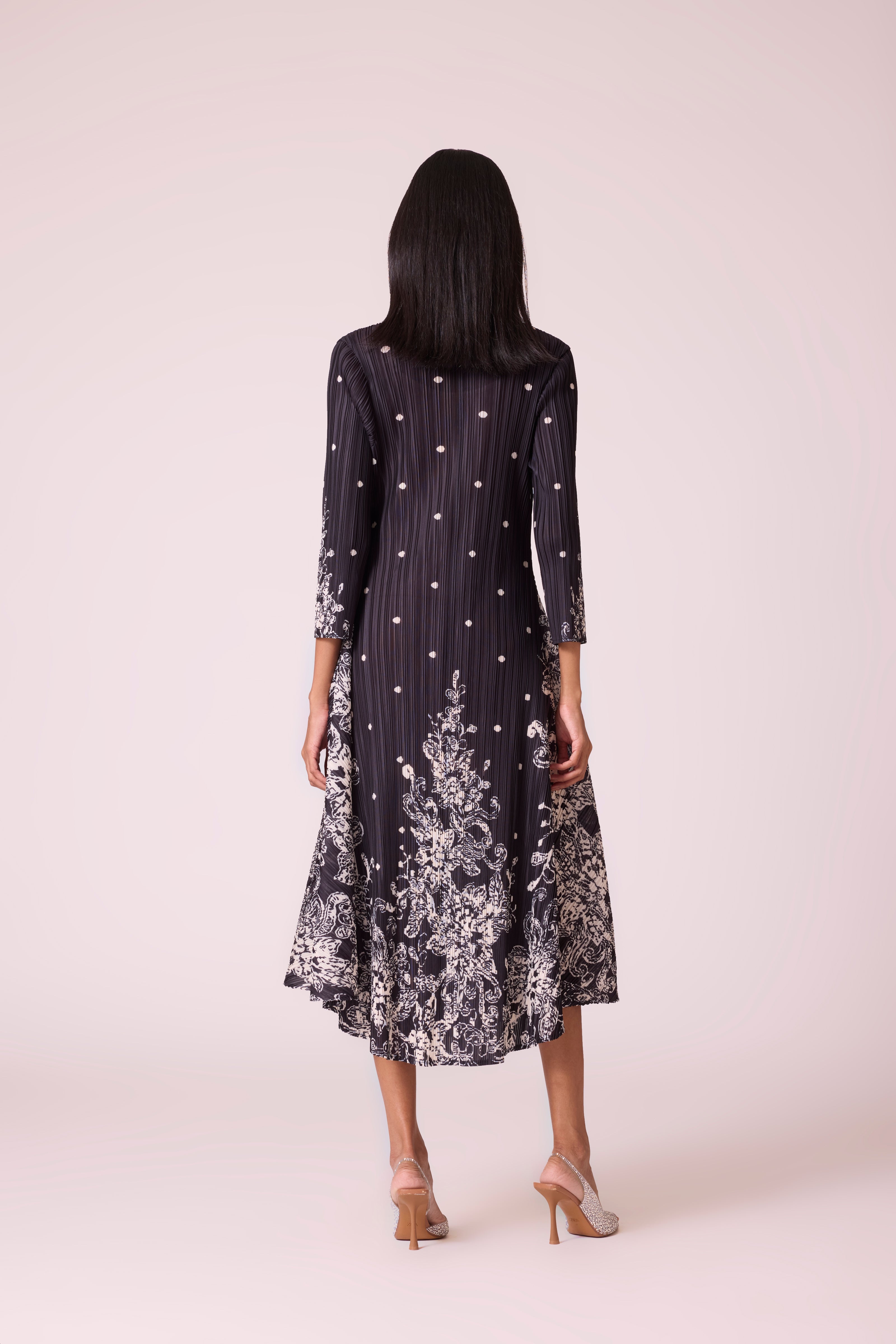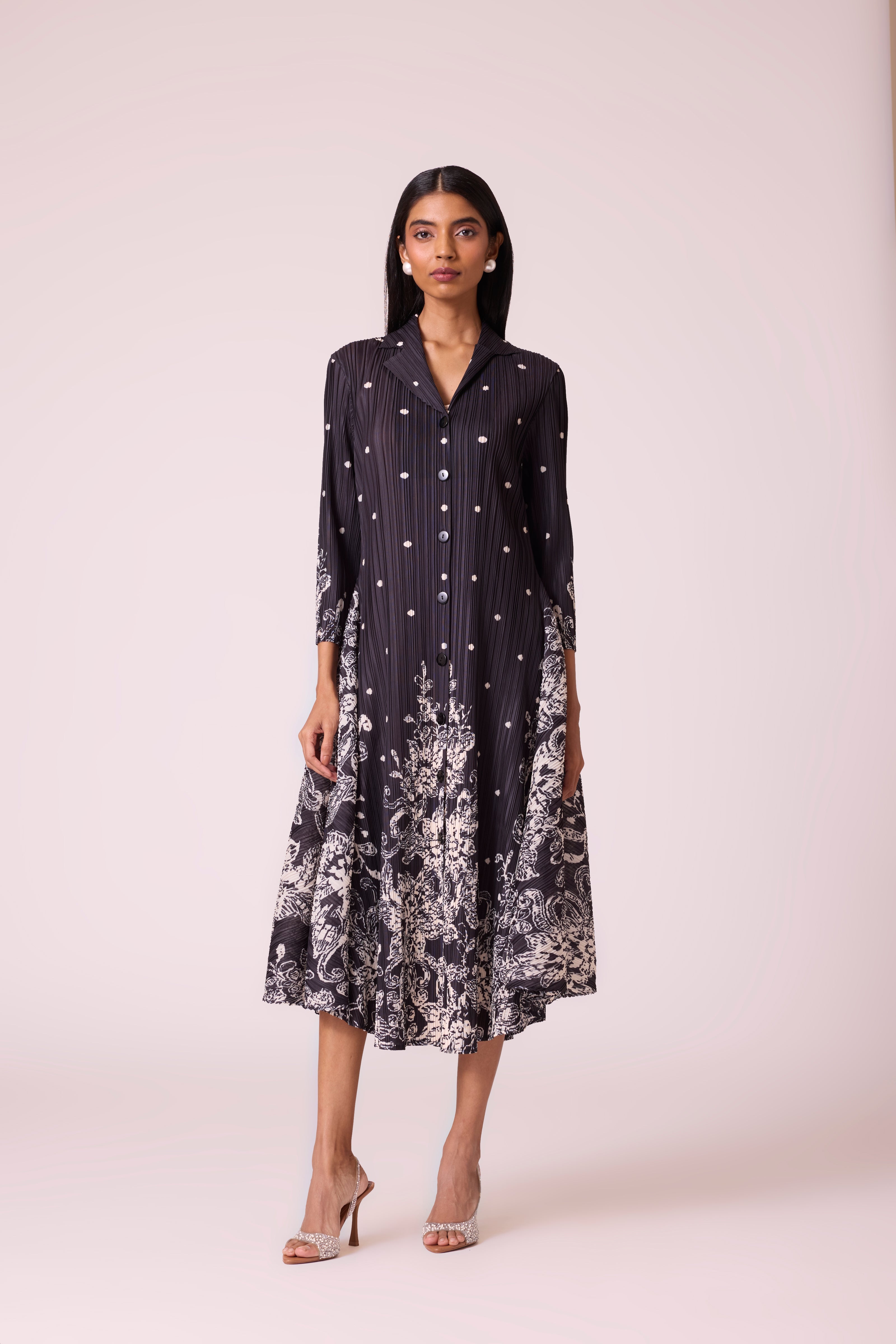 This lightweight pleated midi dress features a button-down front, playful dot print, and a contrasting ivory print at the hem. With its relaxed A-line fall and shirt-collar neckline, it brings together comfort, structure and style. Pair it with heels for a refined look or dress it down with flats for everyday elegance.