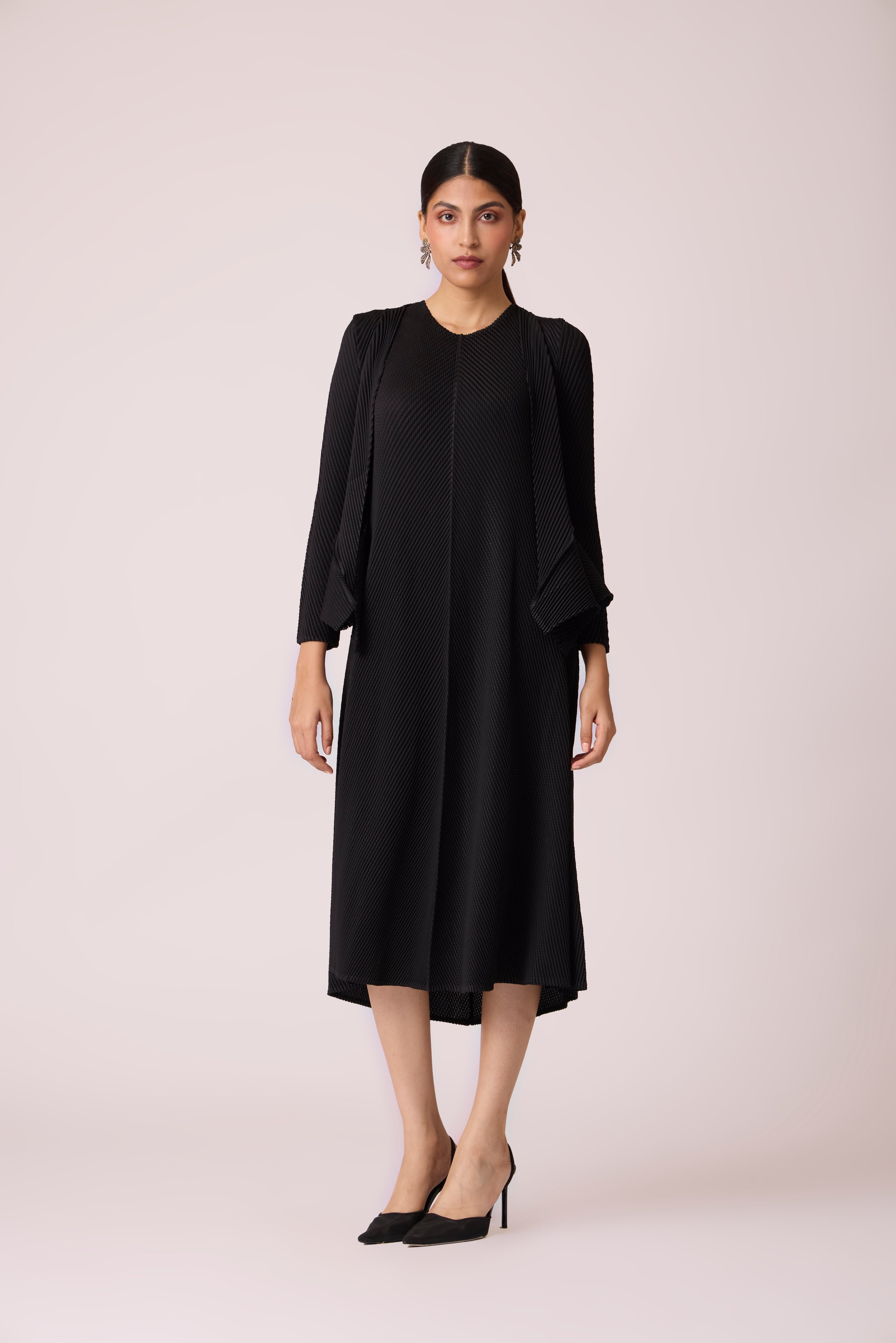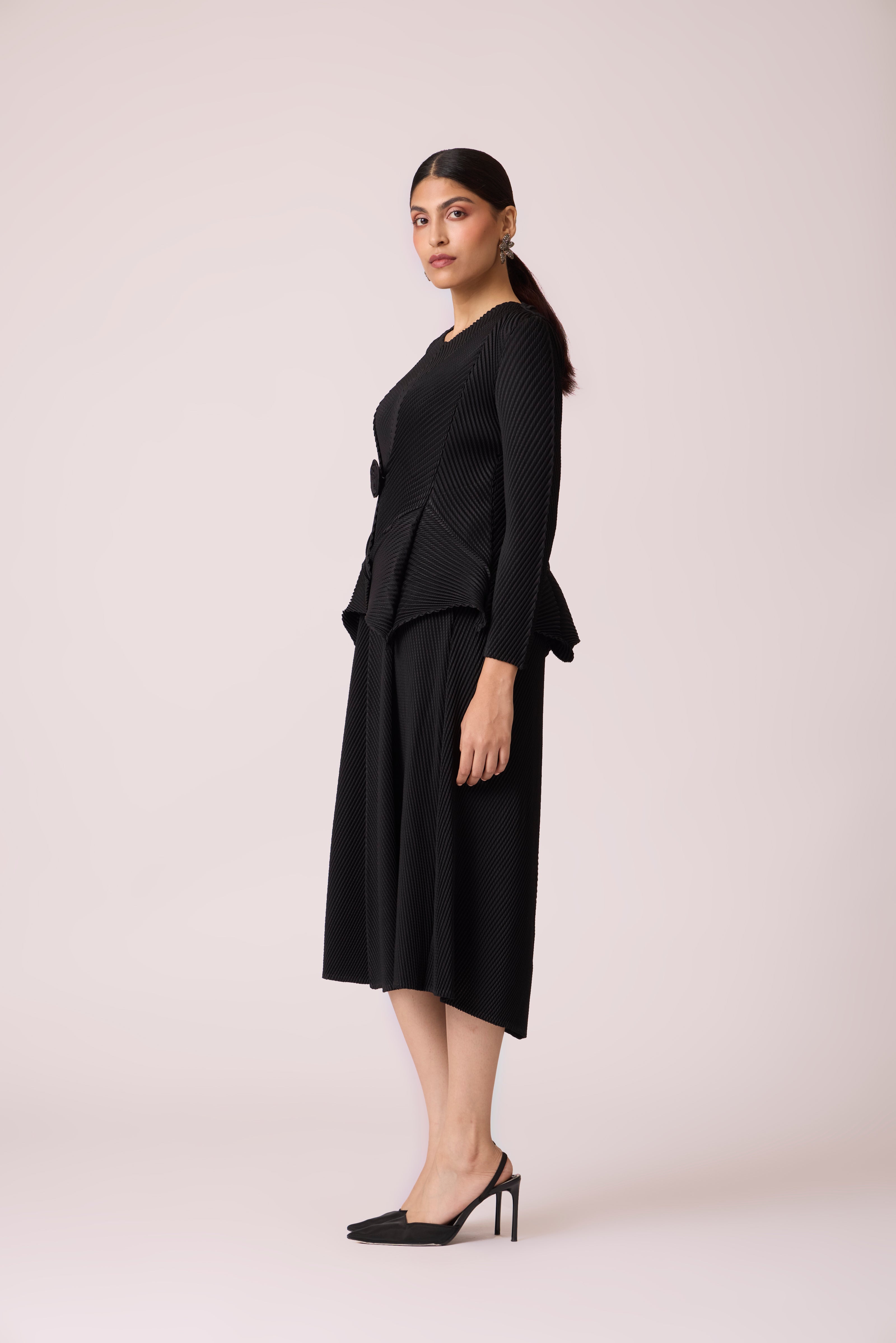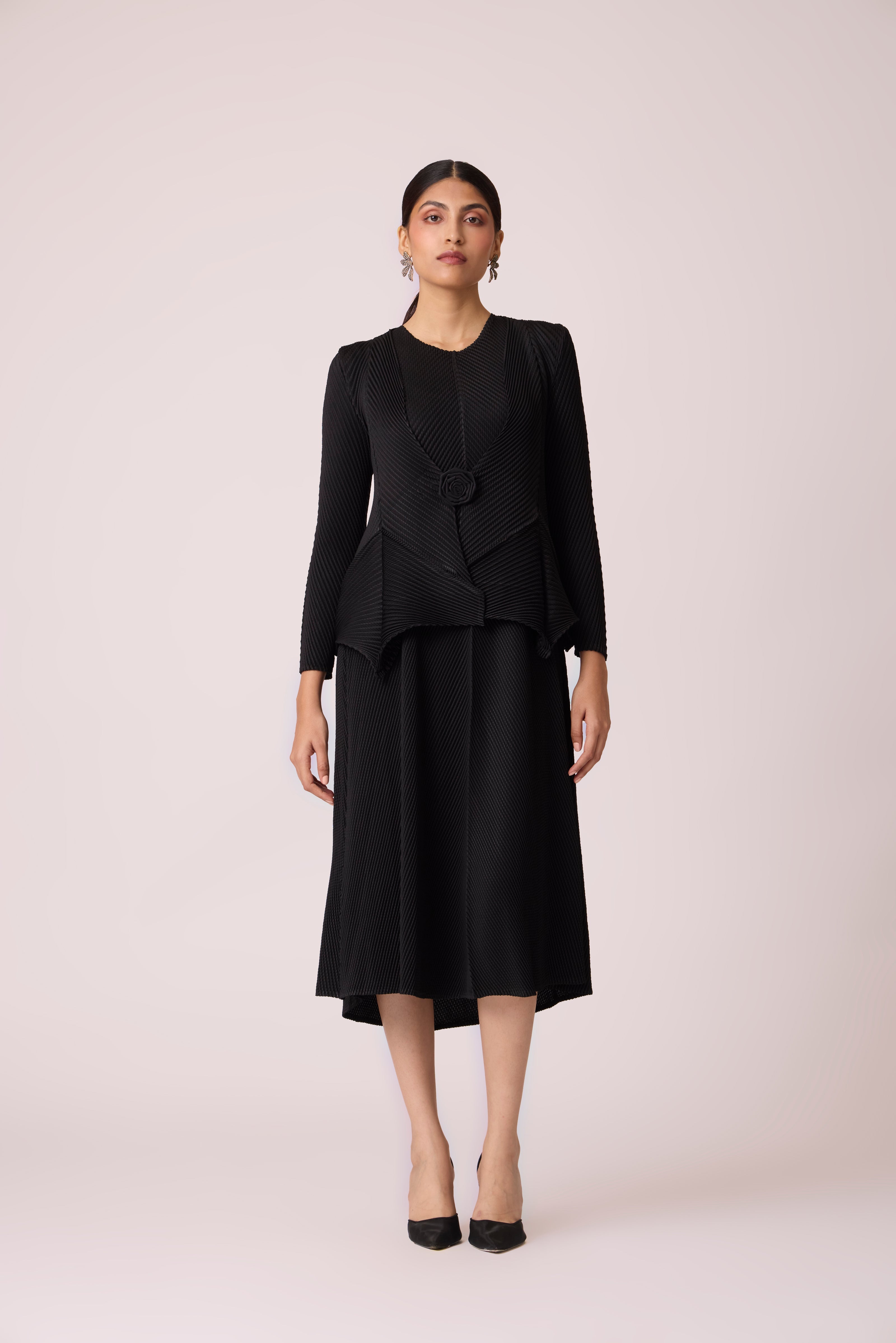 Soft pleated peplum overlay over a sleeveless A line dress. The rosette brooch can be worn as overlay closure or as an agent on the overlay.