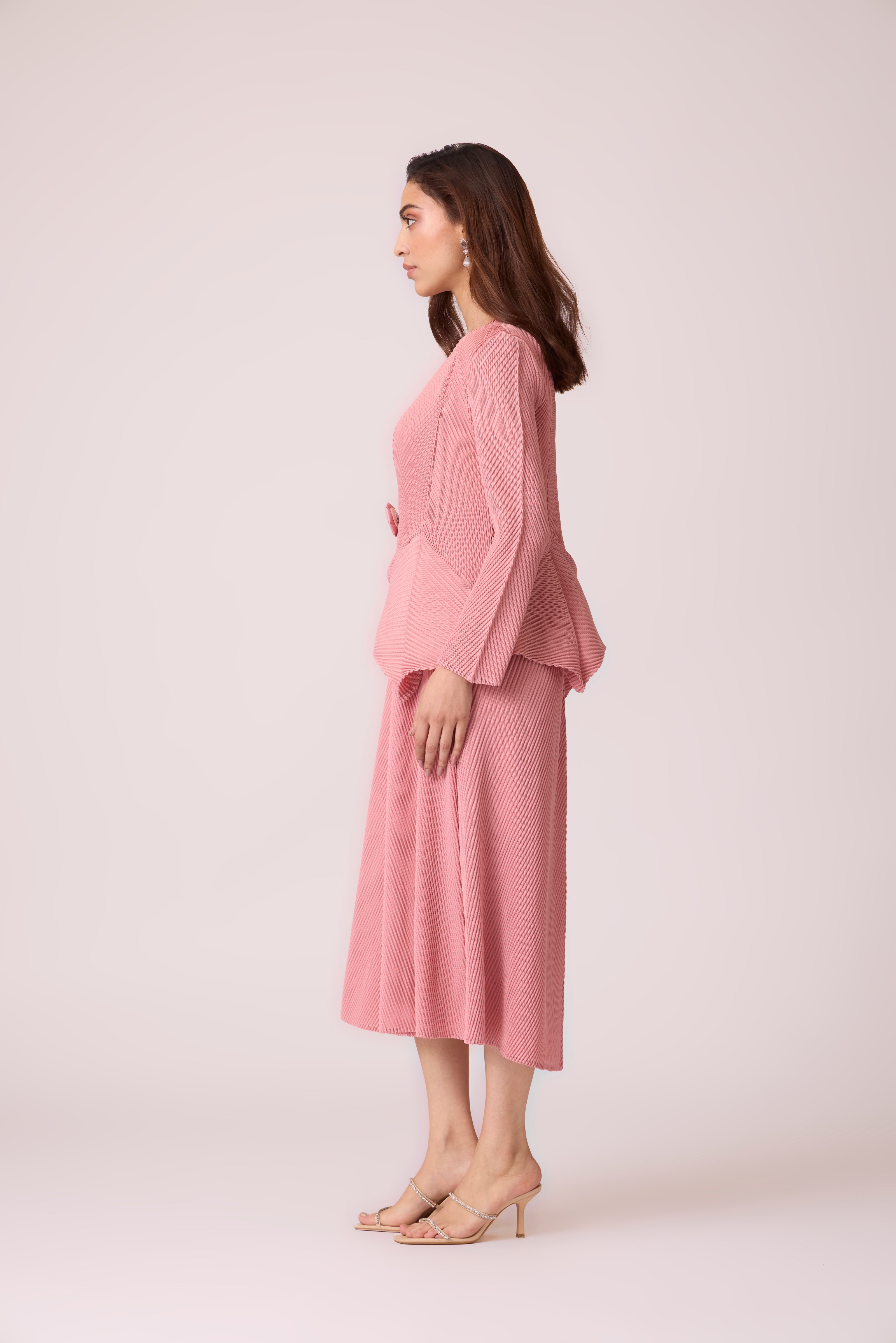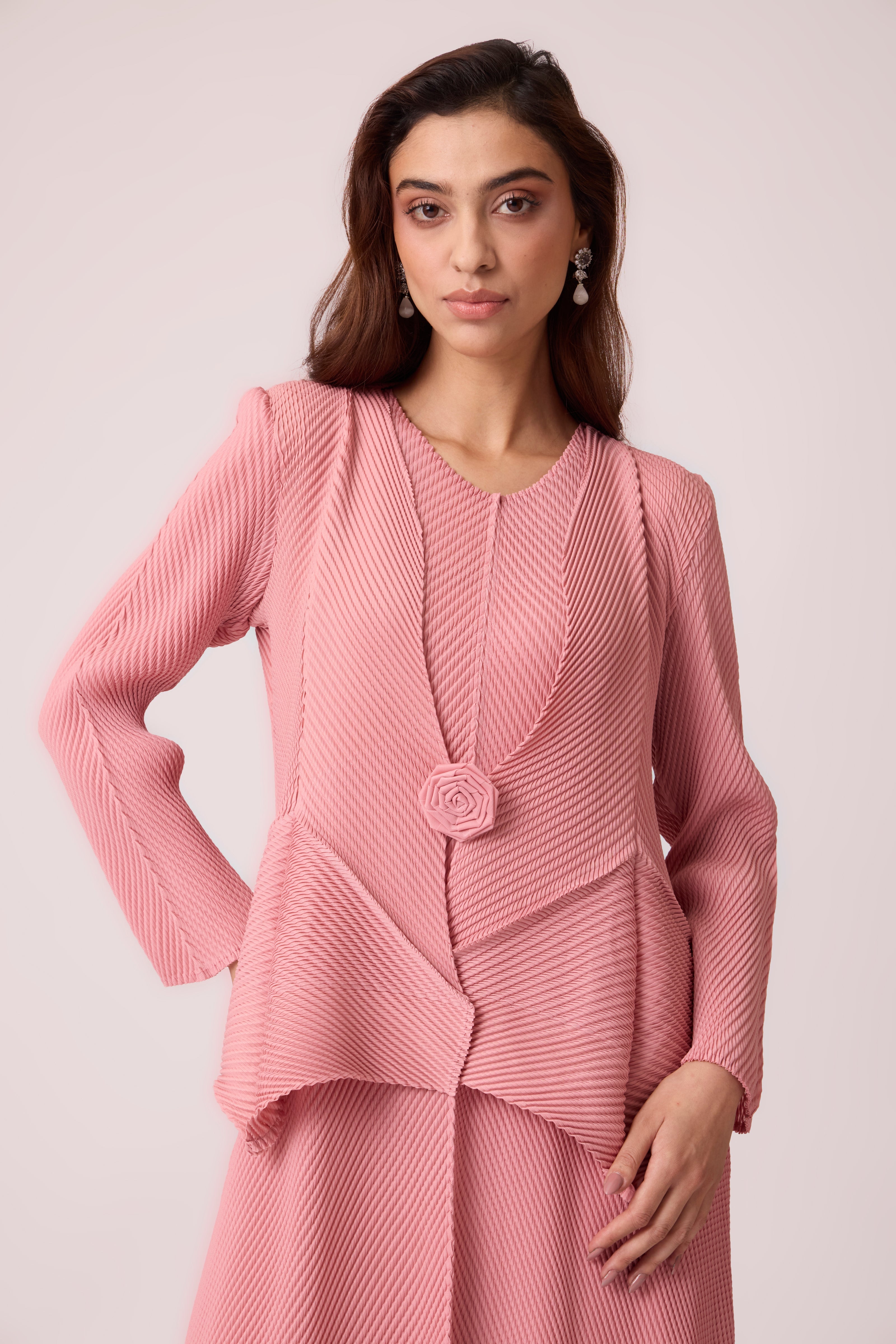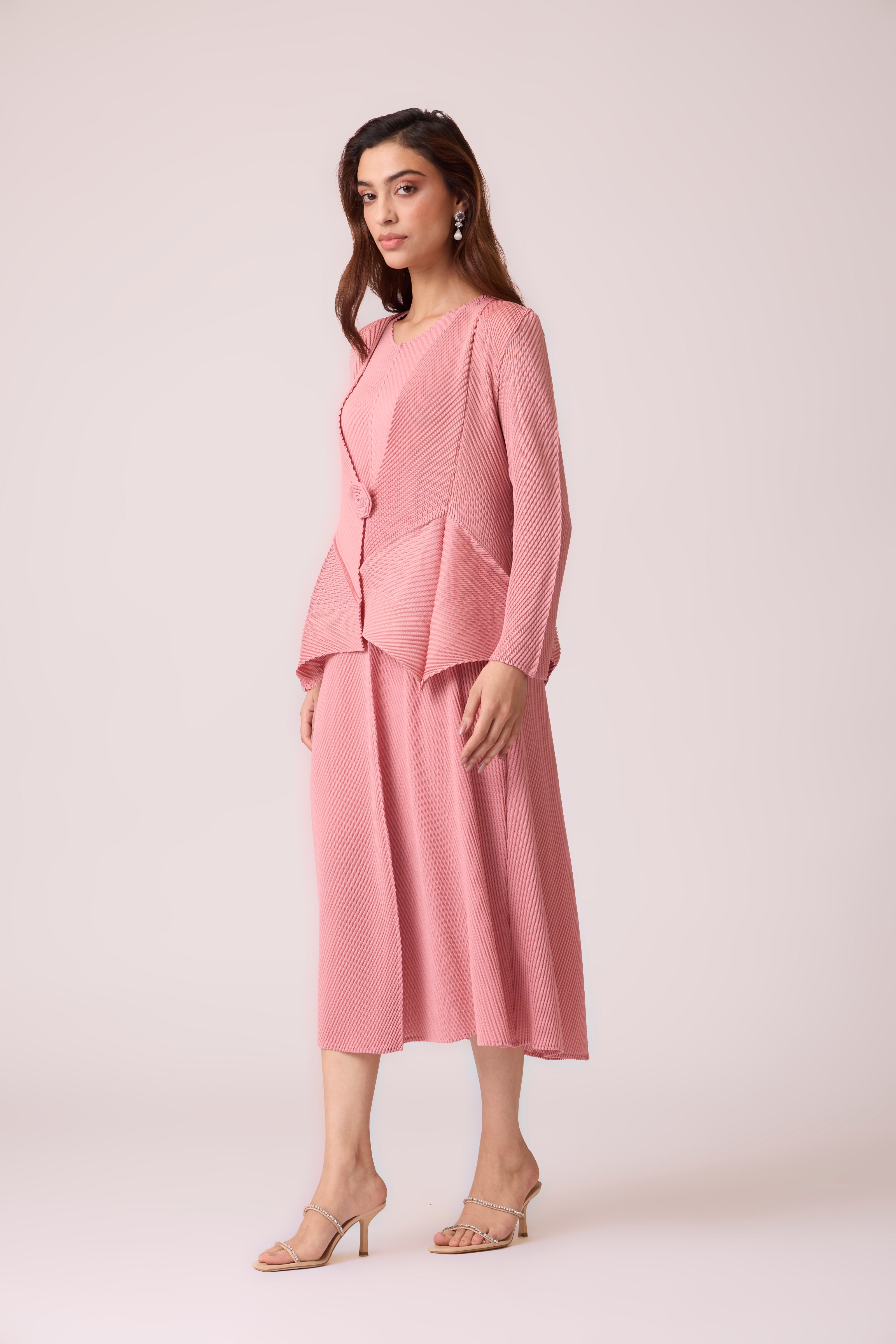 Soft pleated peplum overlay over a sleeveless A line dress. The rosette brooch can be worn as overlay closure or as an agent on the overlay.