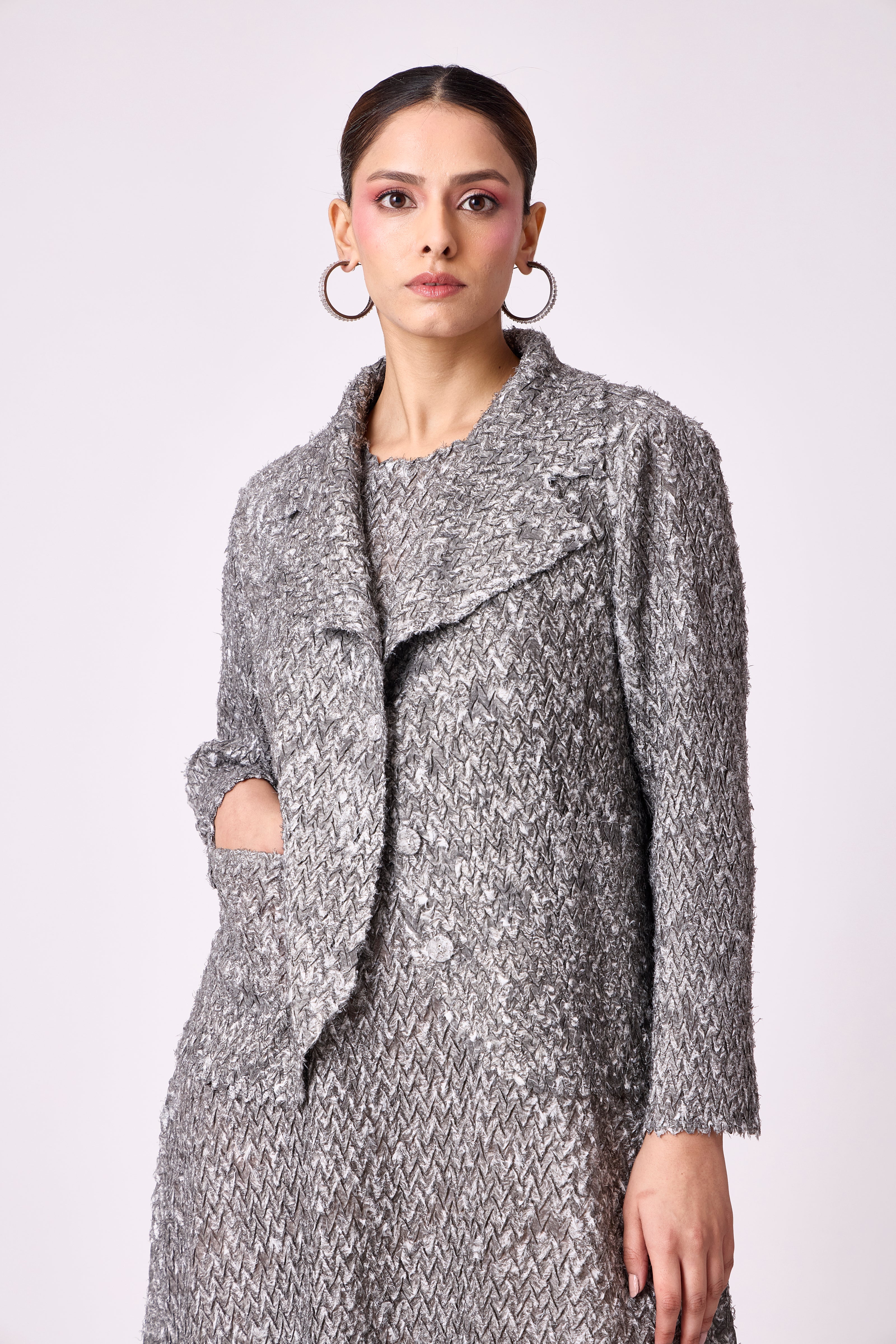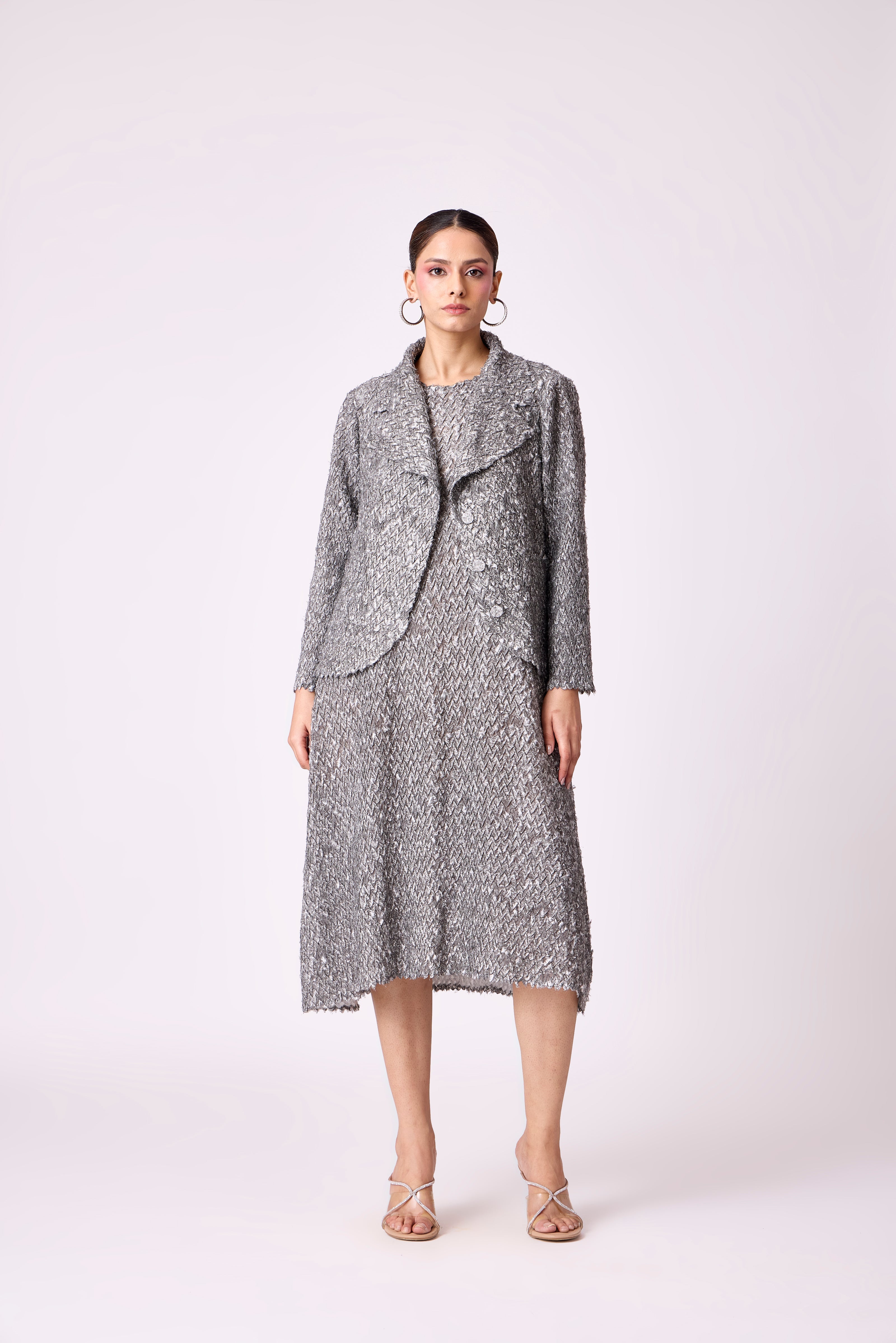 A midi dress in textured pleated fabric with a matching overlay creating a refined, structured silhouette.