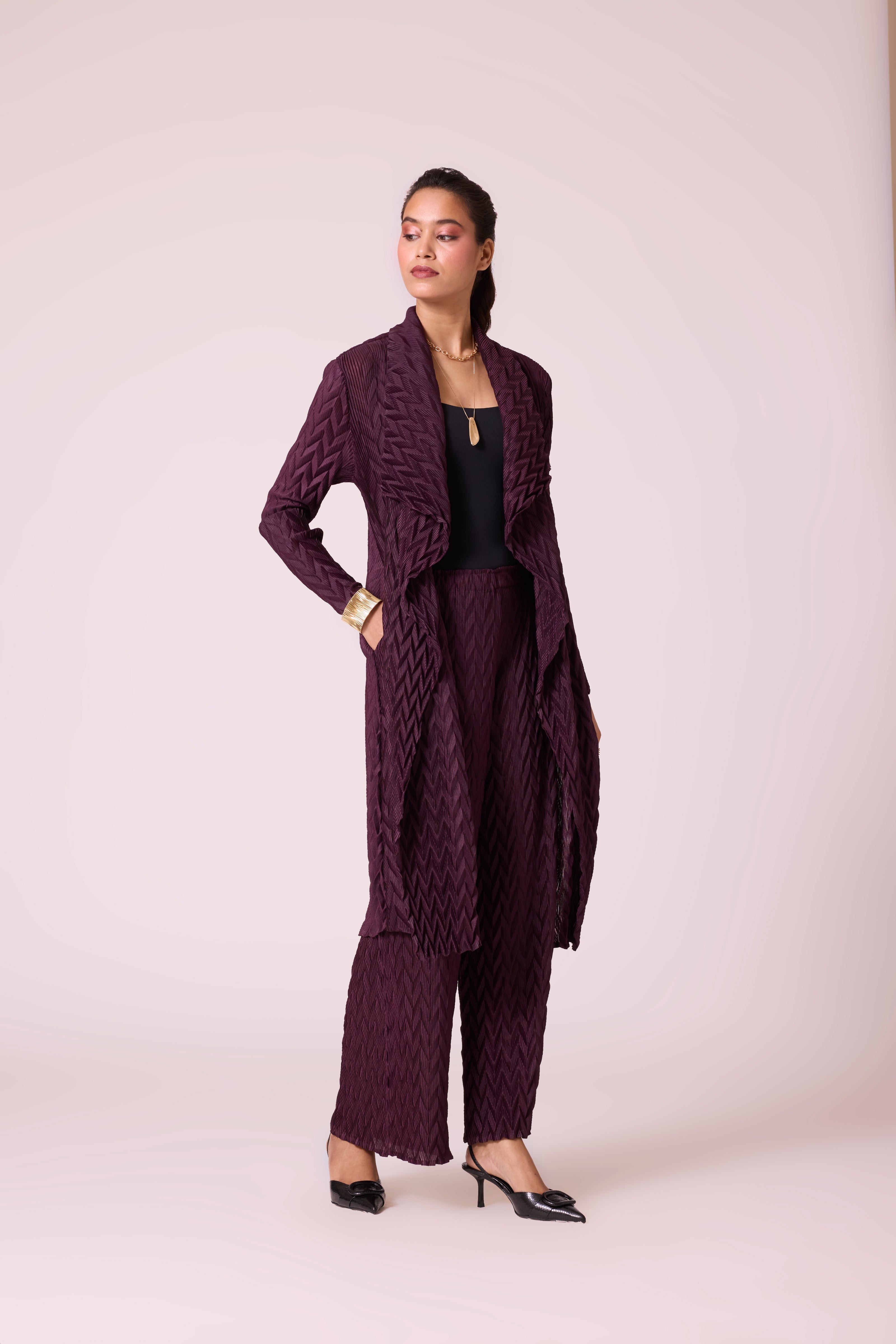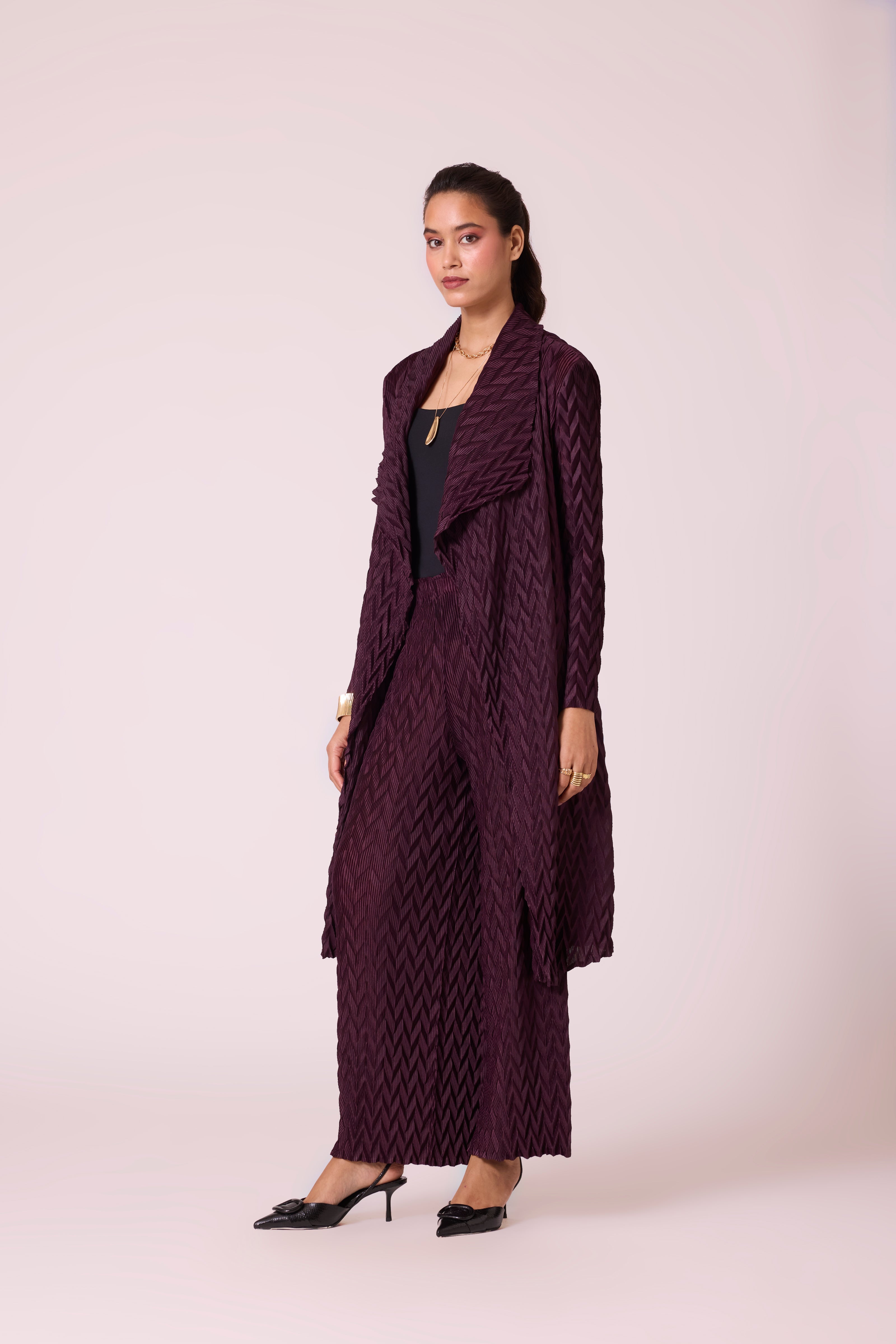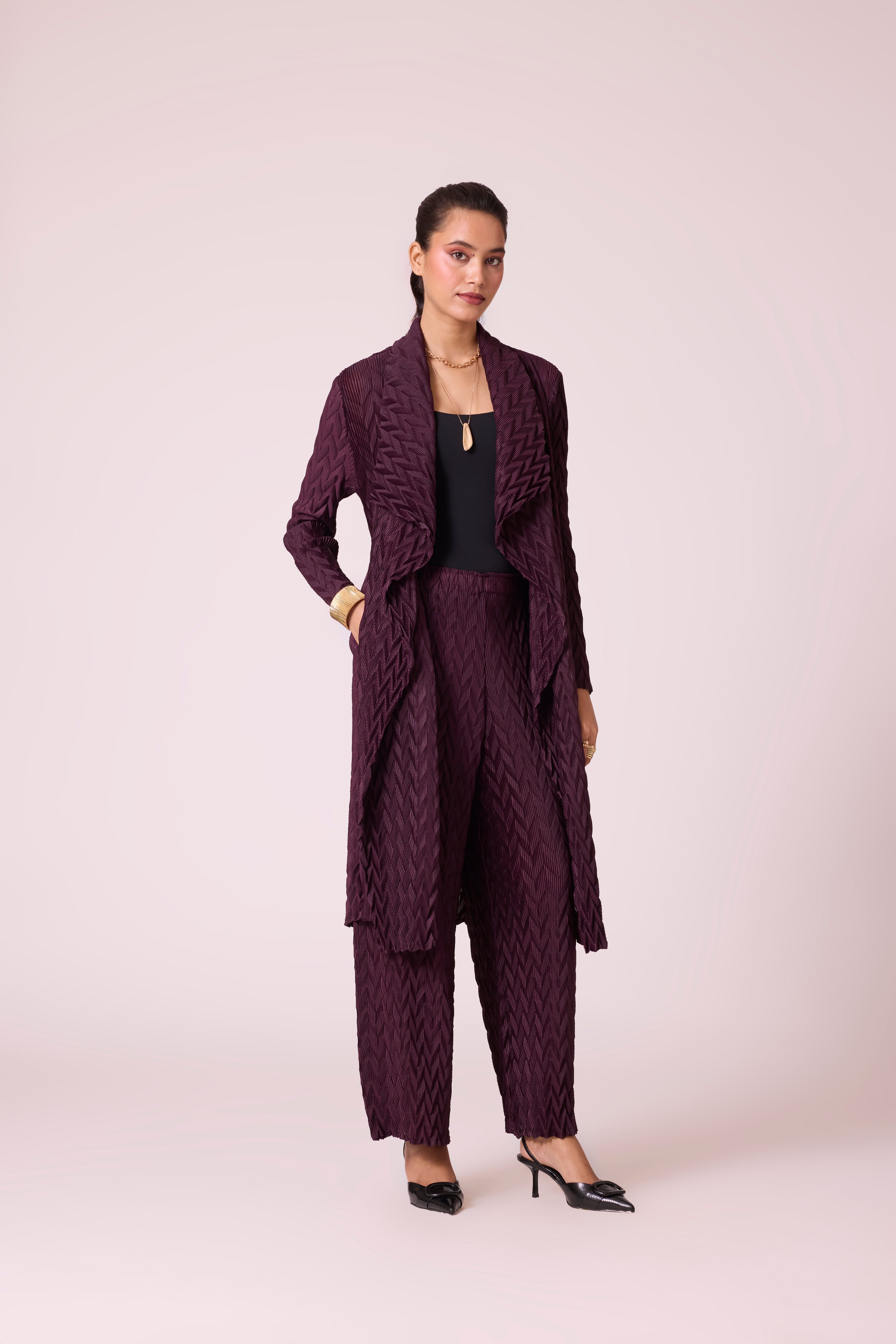 Chevron pleated overlay and pant set in deep winter colors. Pair with formal inner shirts, basic tanks or lace inners to take this look from office to evenings.