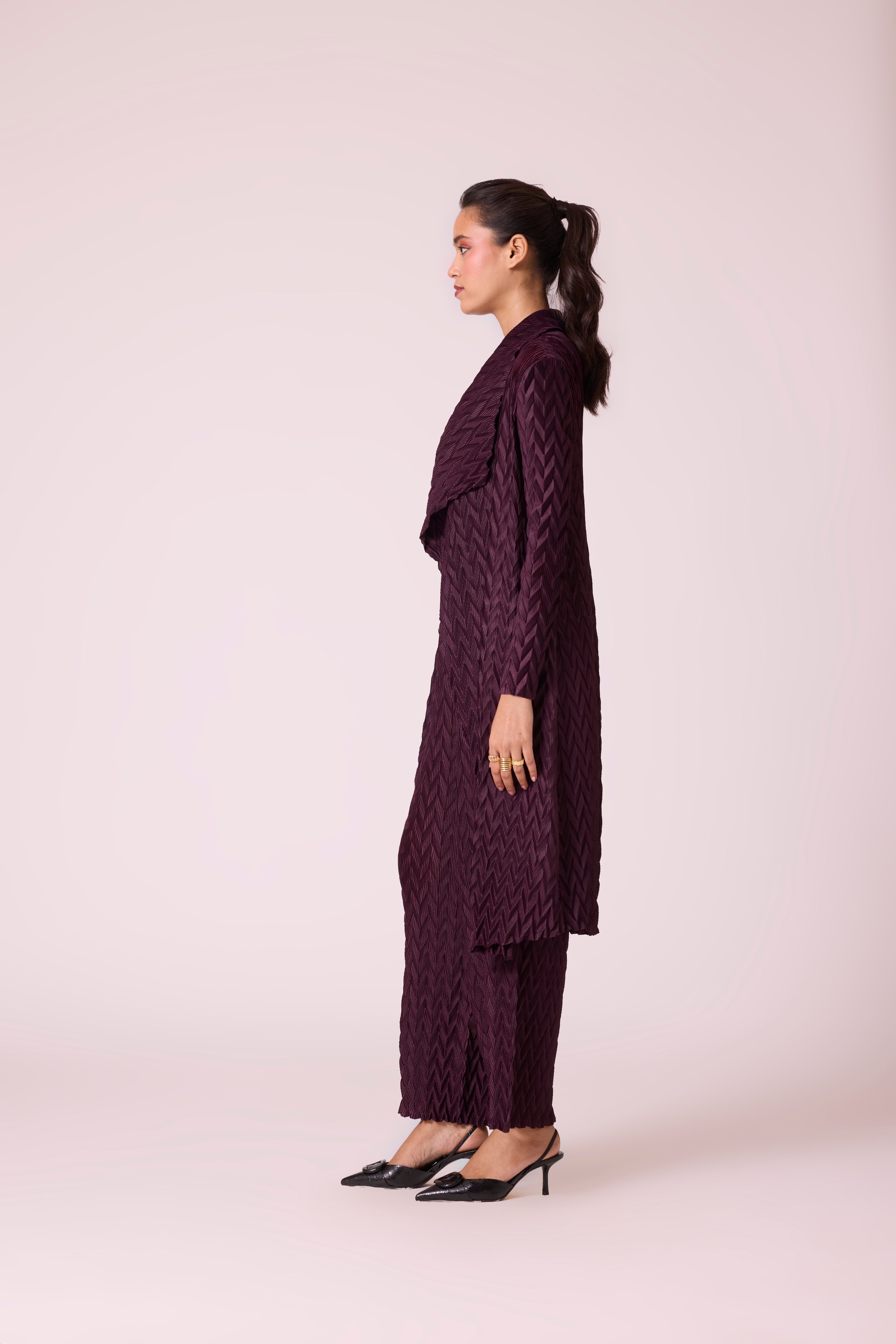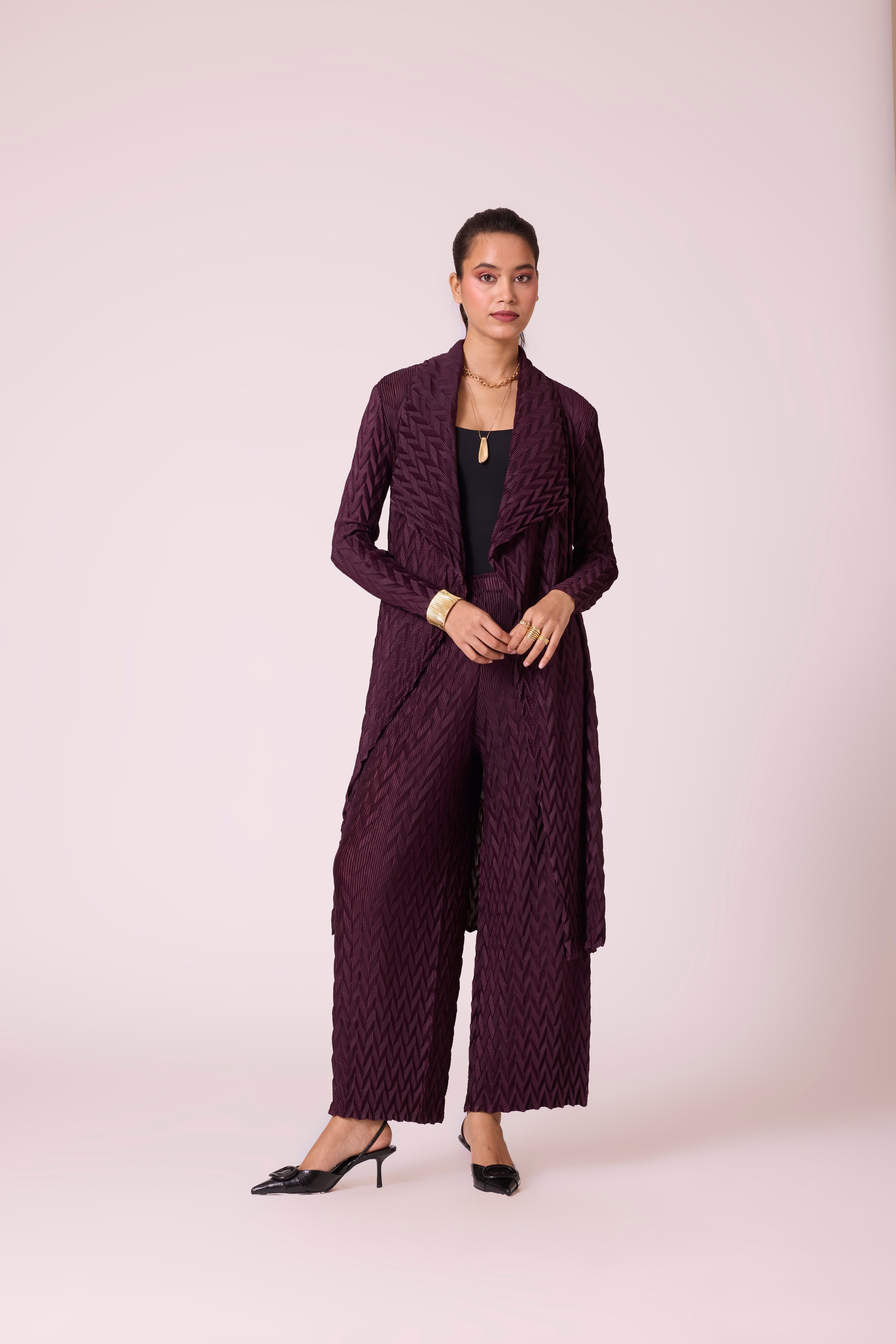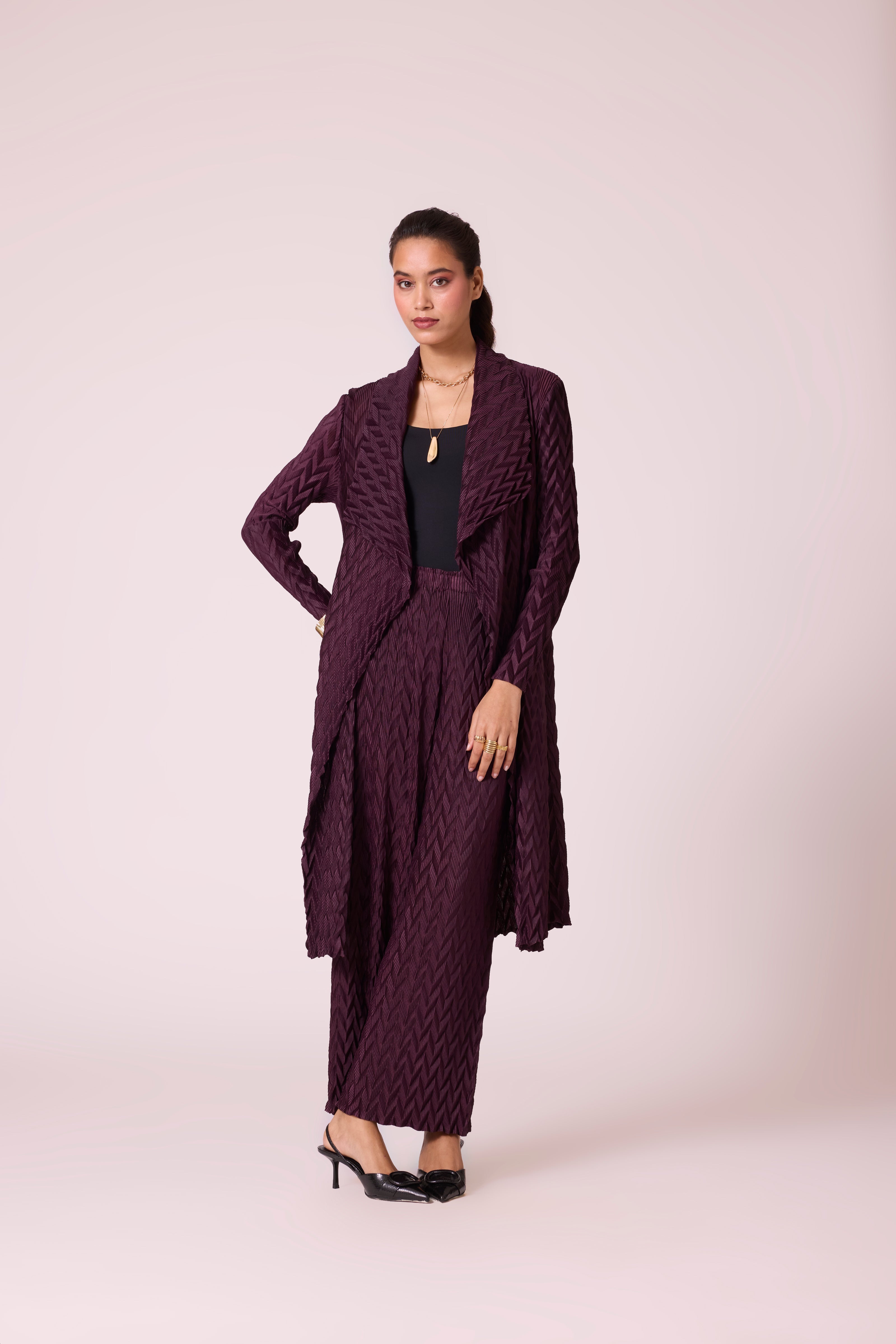 Chevron pleated overlay and pant set in deep winter colors. Pair with formal inner shirts, basic tanks or lace inners to take this look from office to evenings.