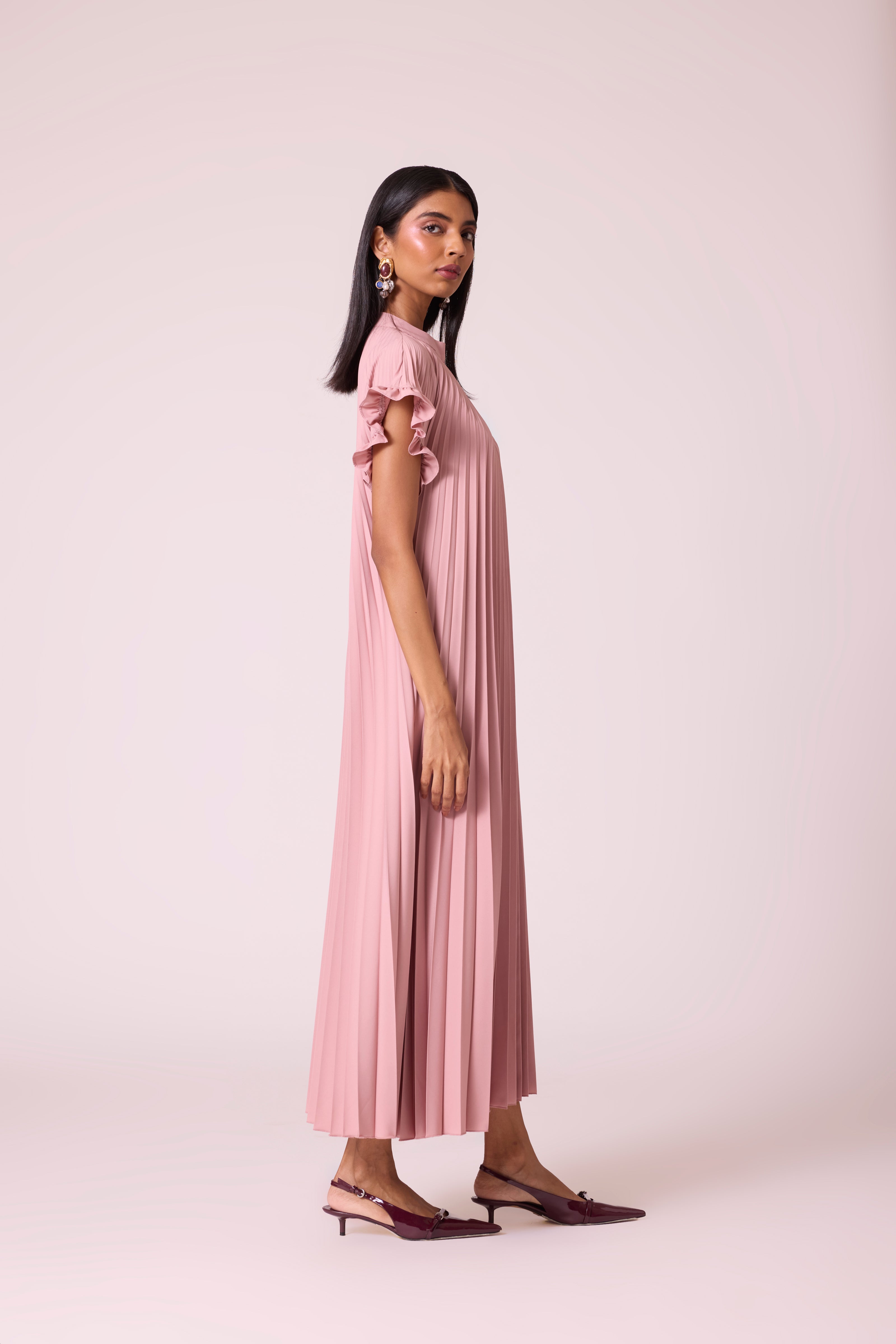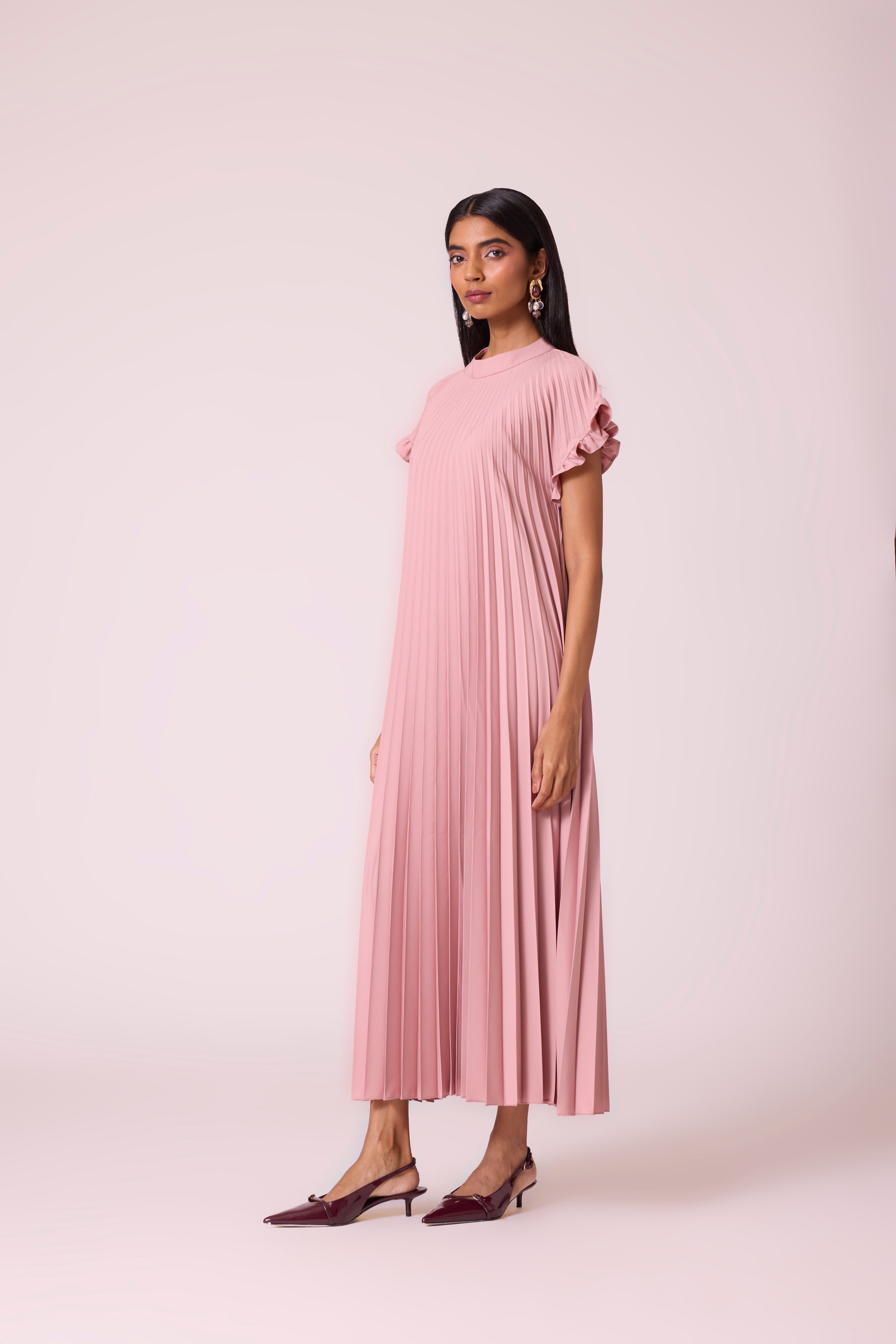 An accordion pleated dress A line dress in luxe fabric with soft ruffled short sleeve and closed neckline.