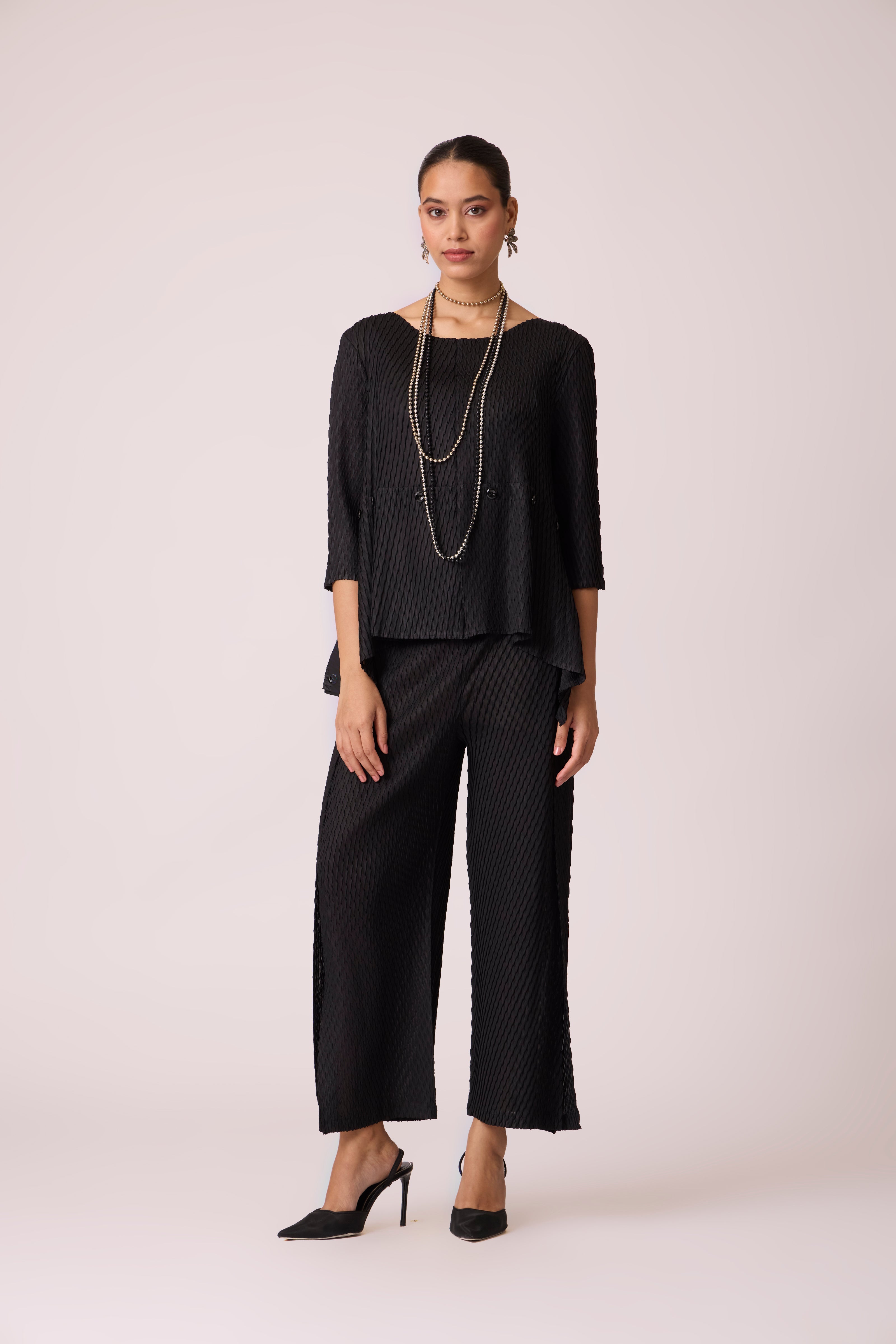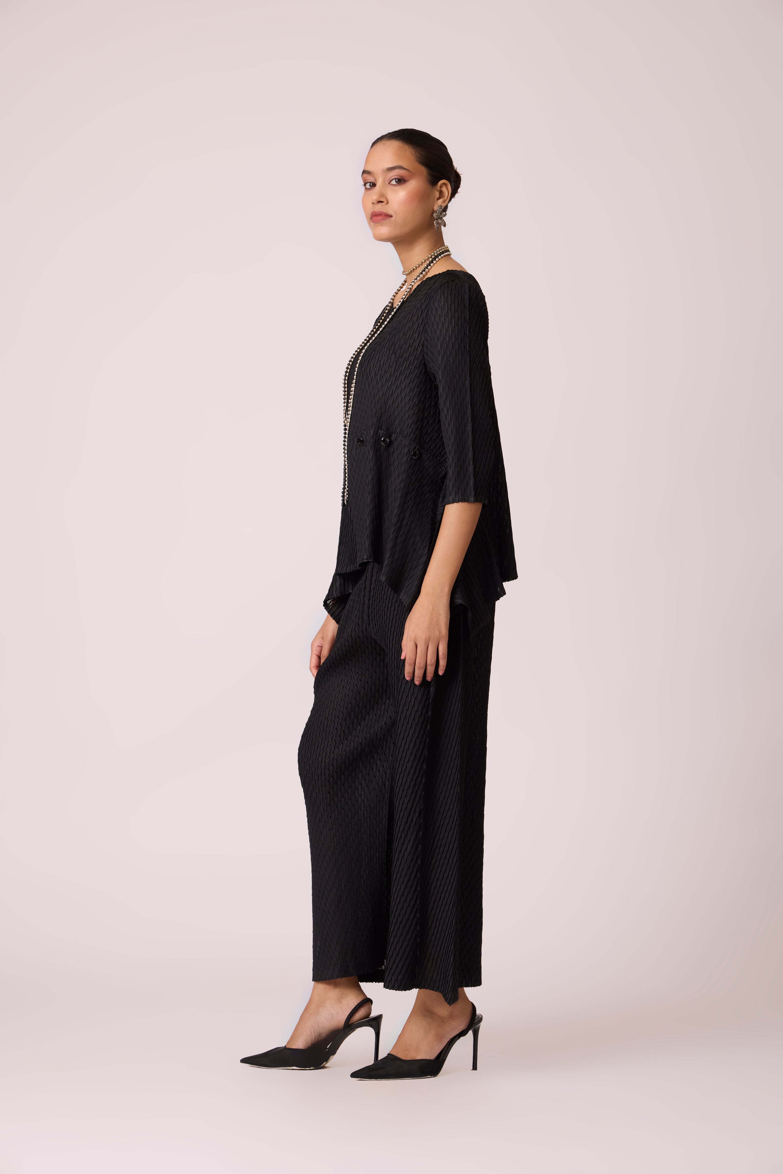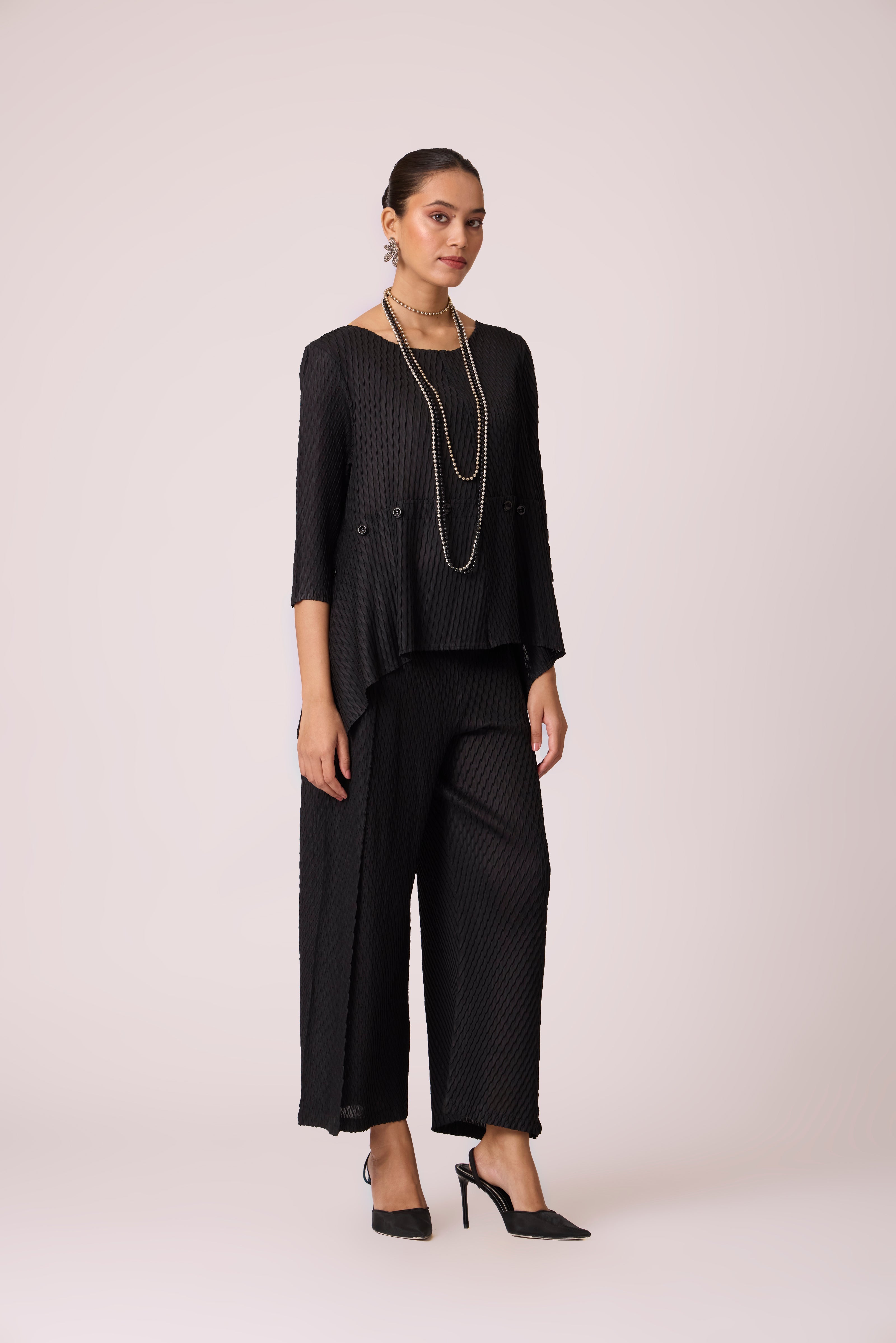 An easy fit asymmetric top paired with matching pants, rendered in a lightweight pleated fabric. The top has an asymmetric hem and button detail going down the sides. Pants have gentle flare at hem and a slit for easy movement.