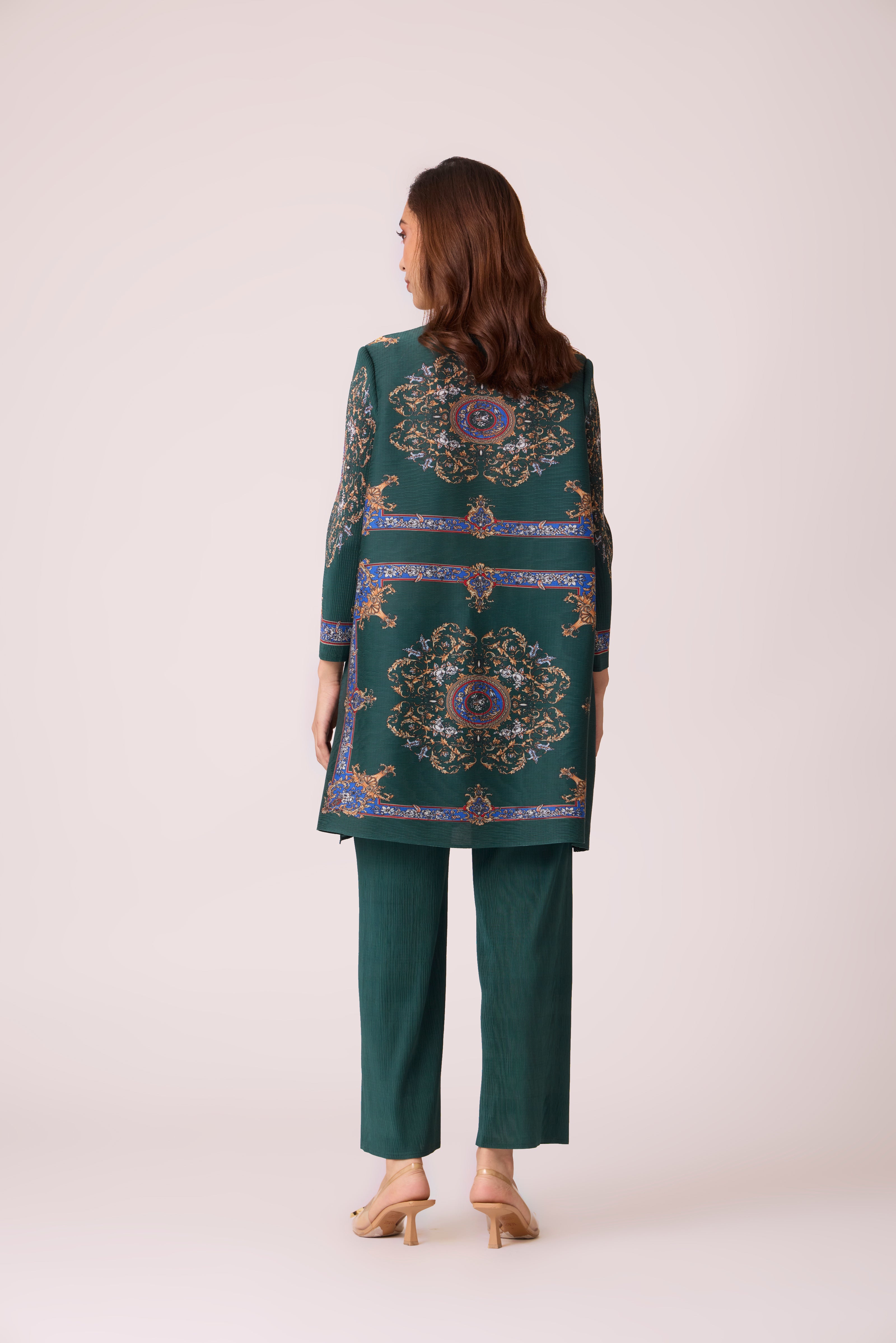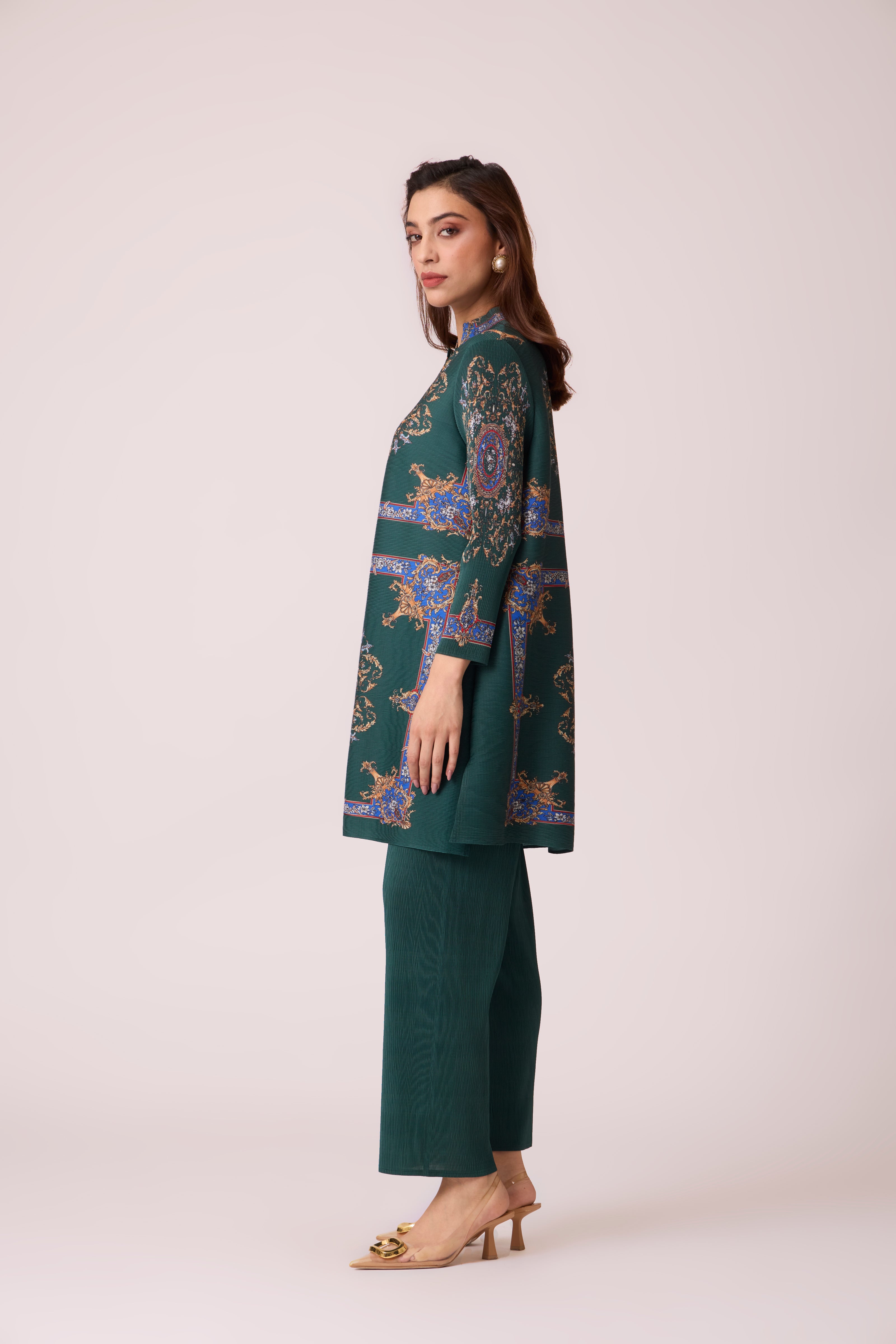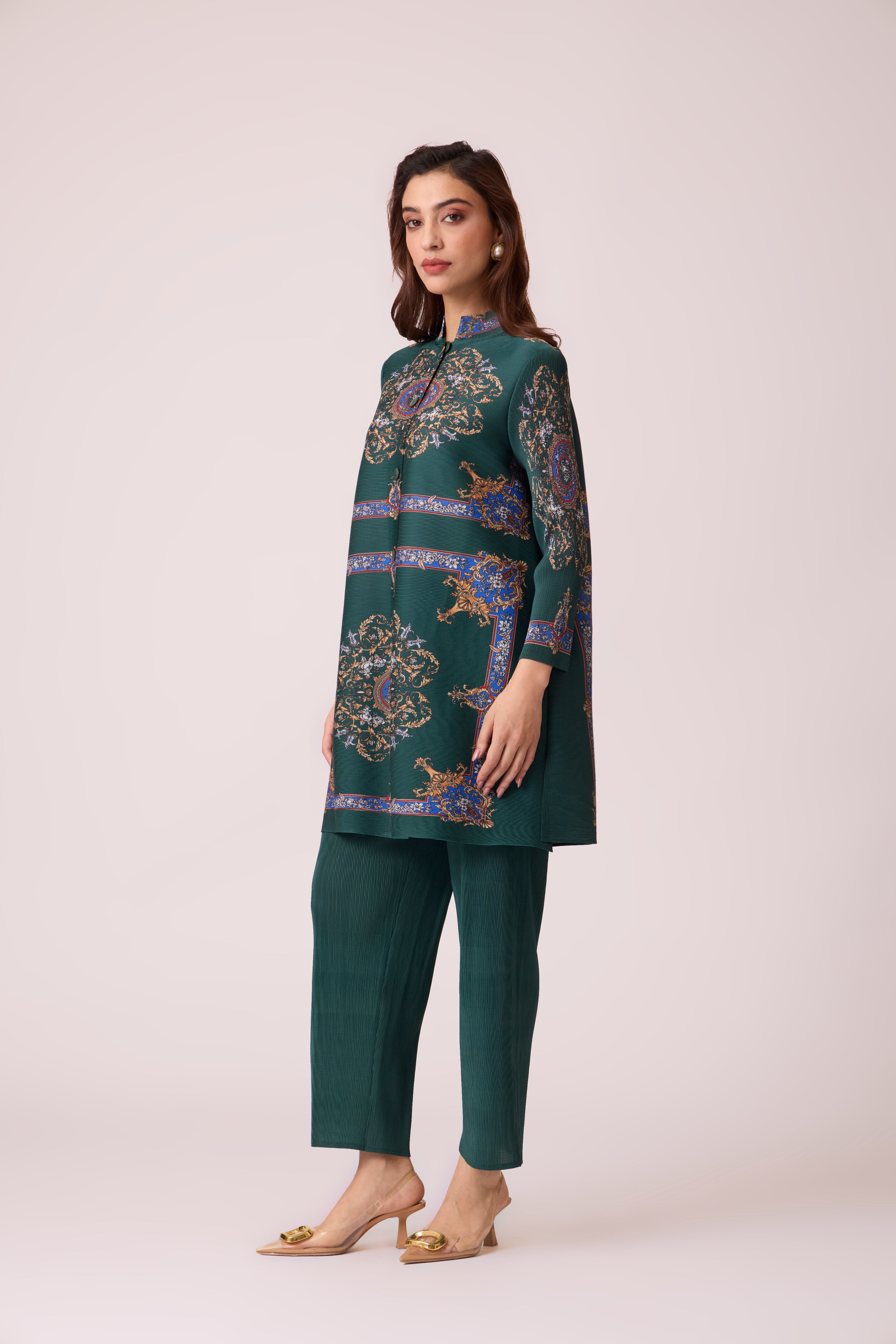 A-line, tunic-style shirt rendered in a statement art deco-inspired print, paired with straight pants.