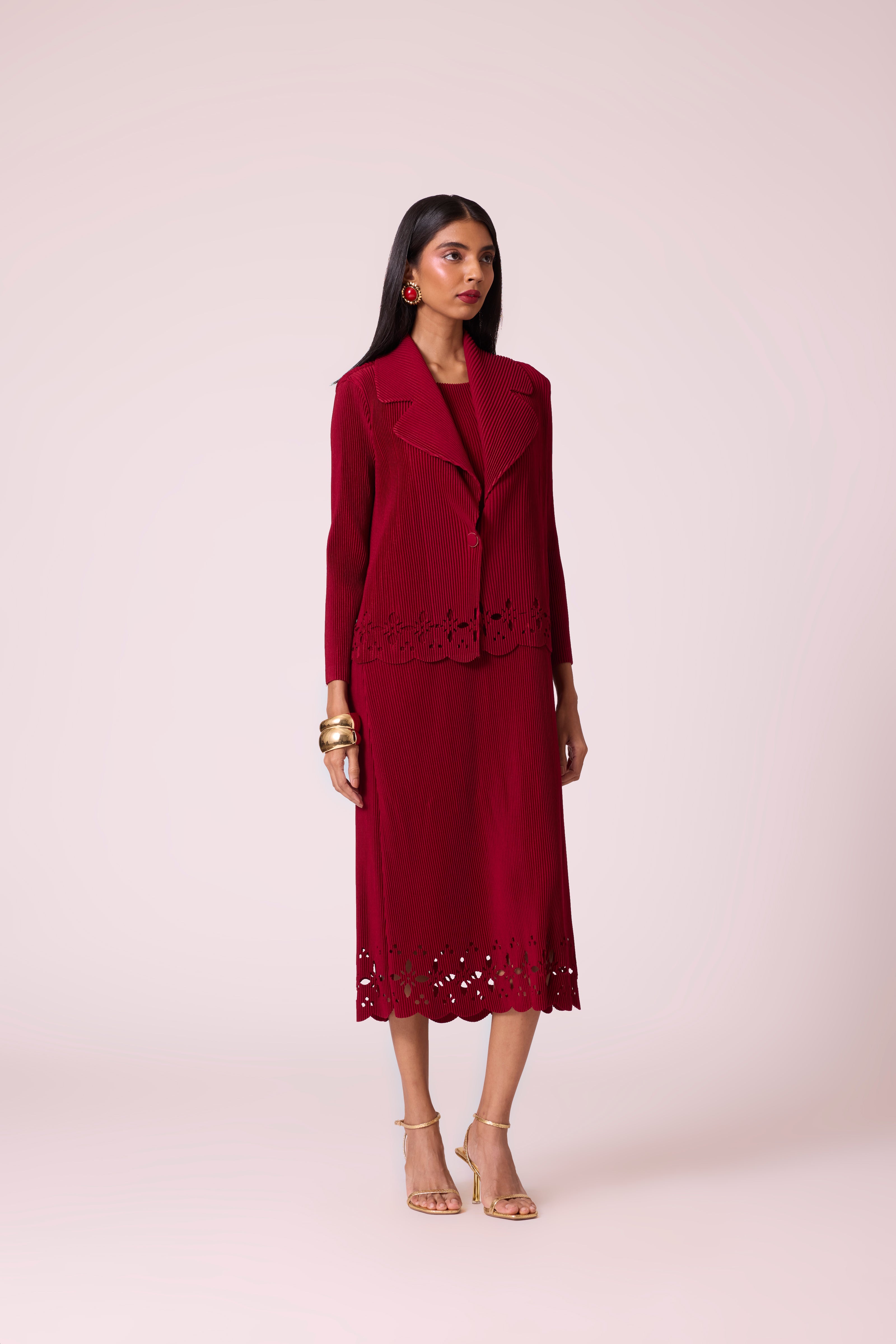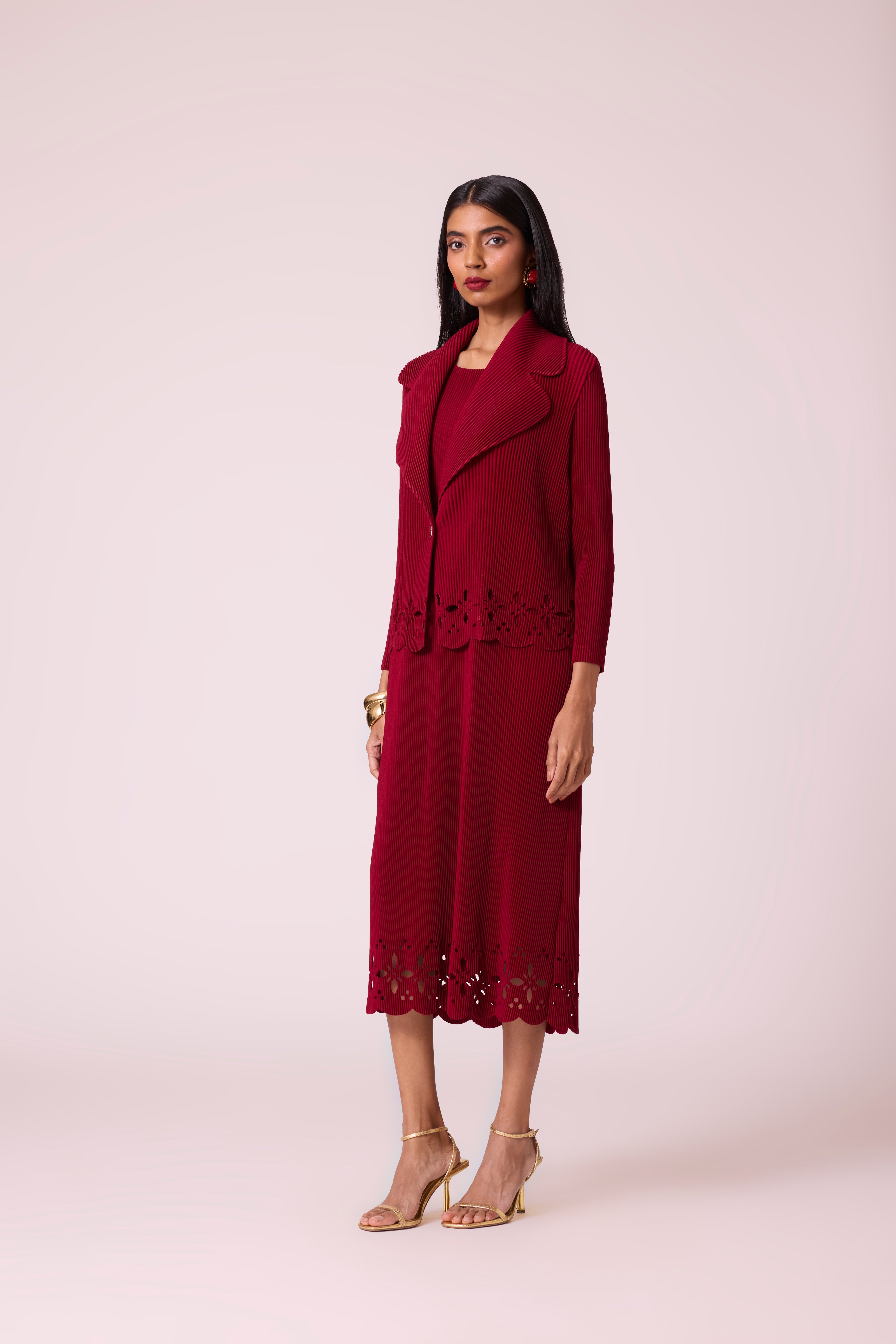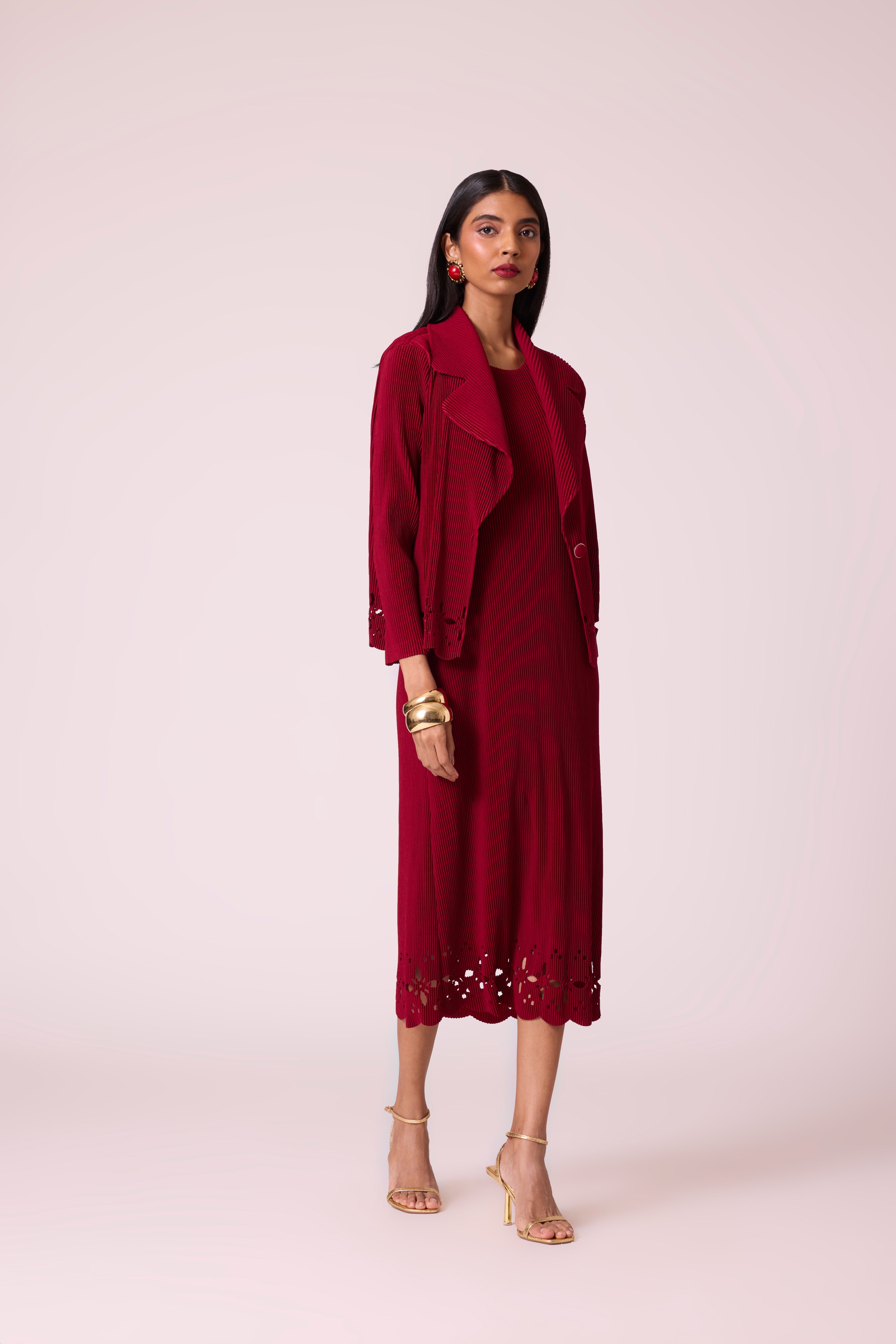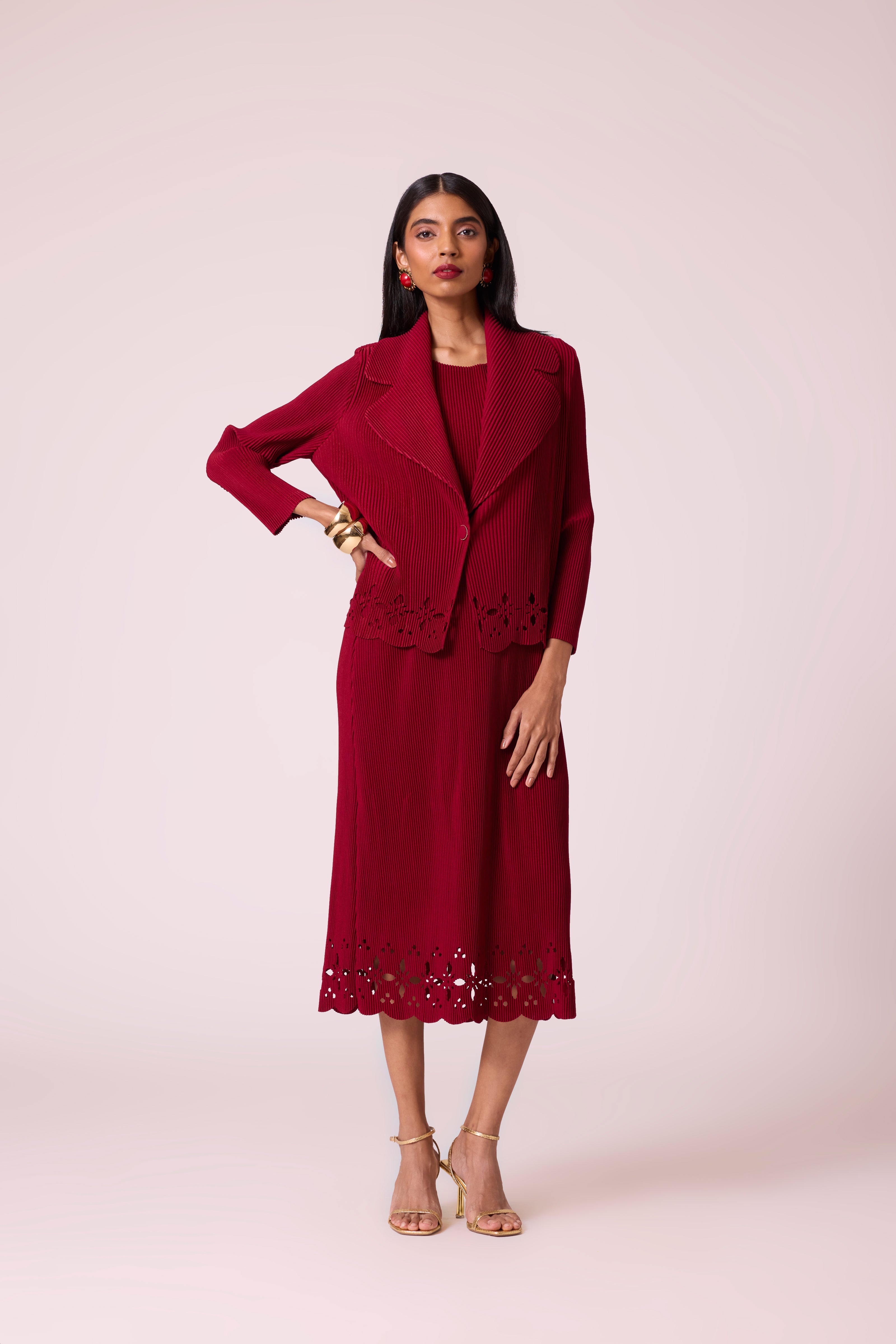 A knit pleated shift midi dress and coordinating jacket elevated with intricate laser-cut accents.