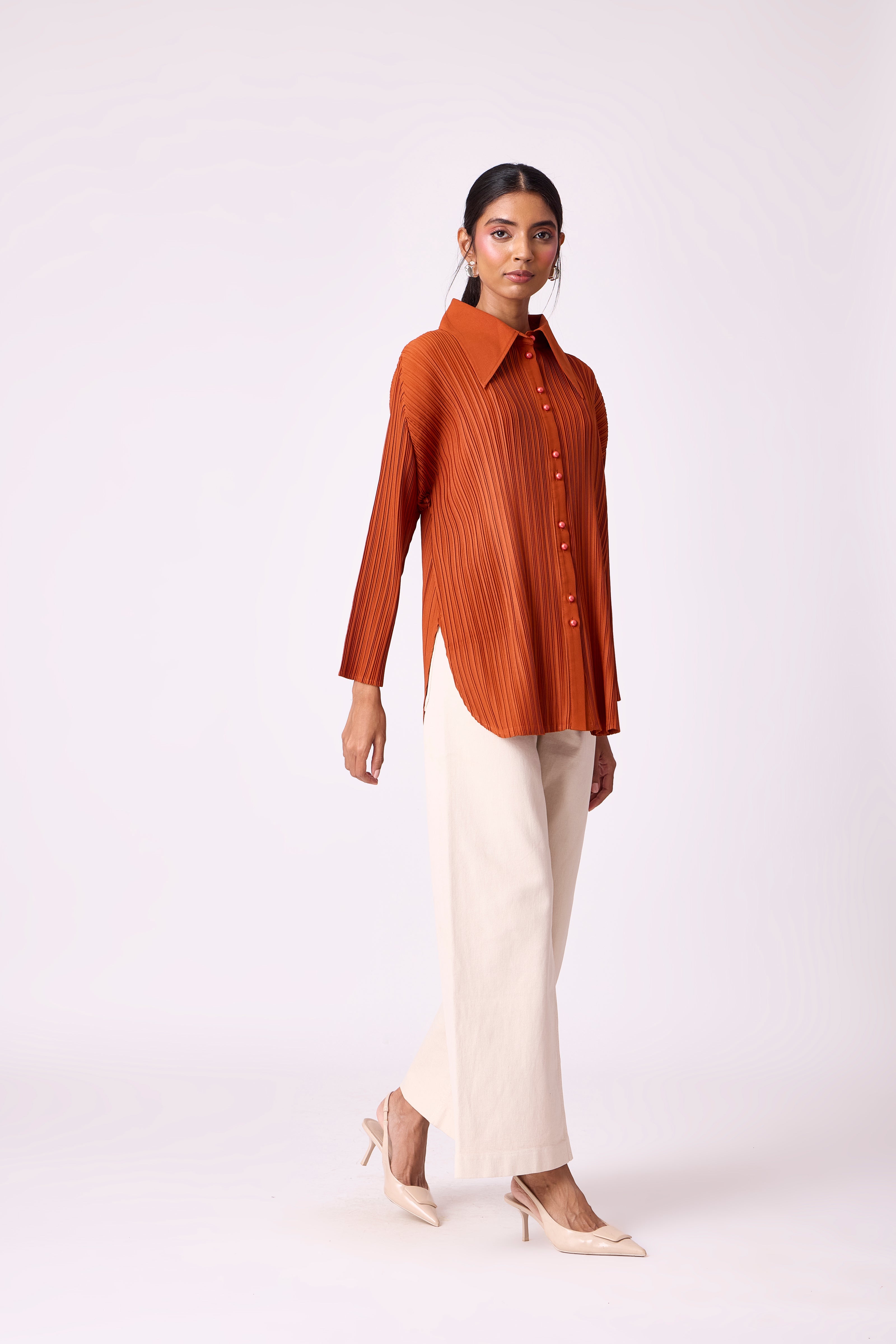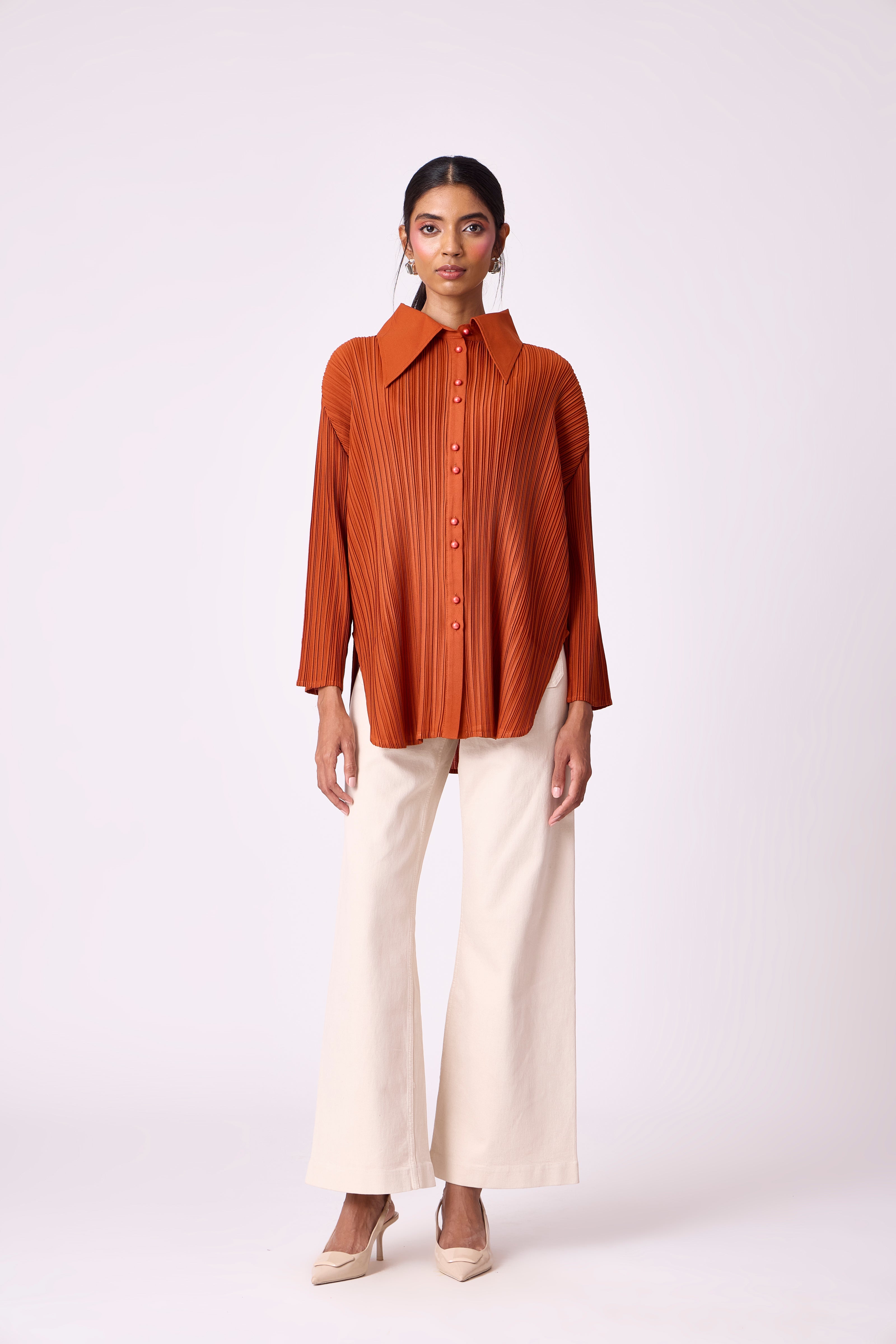 A pleated button-down shirt with a structured collar and clean silhouette, perfect for effortless everyday styling.