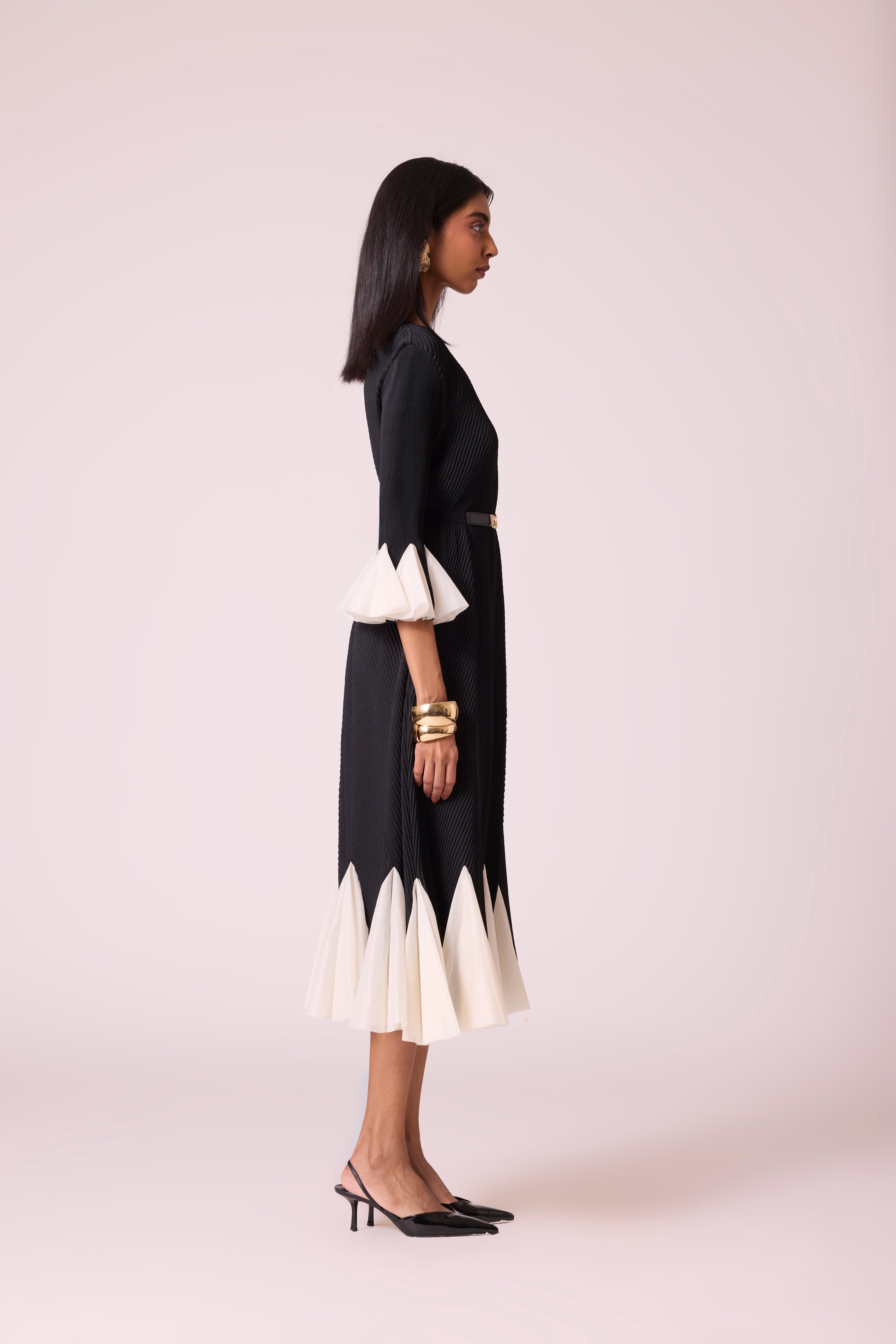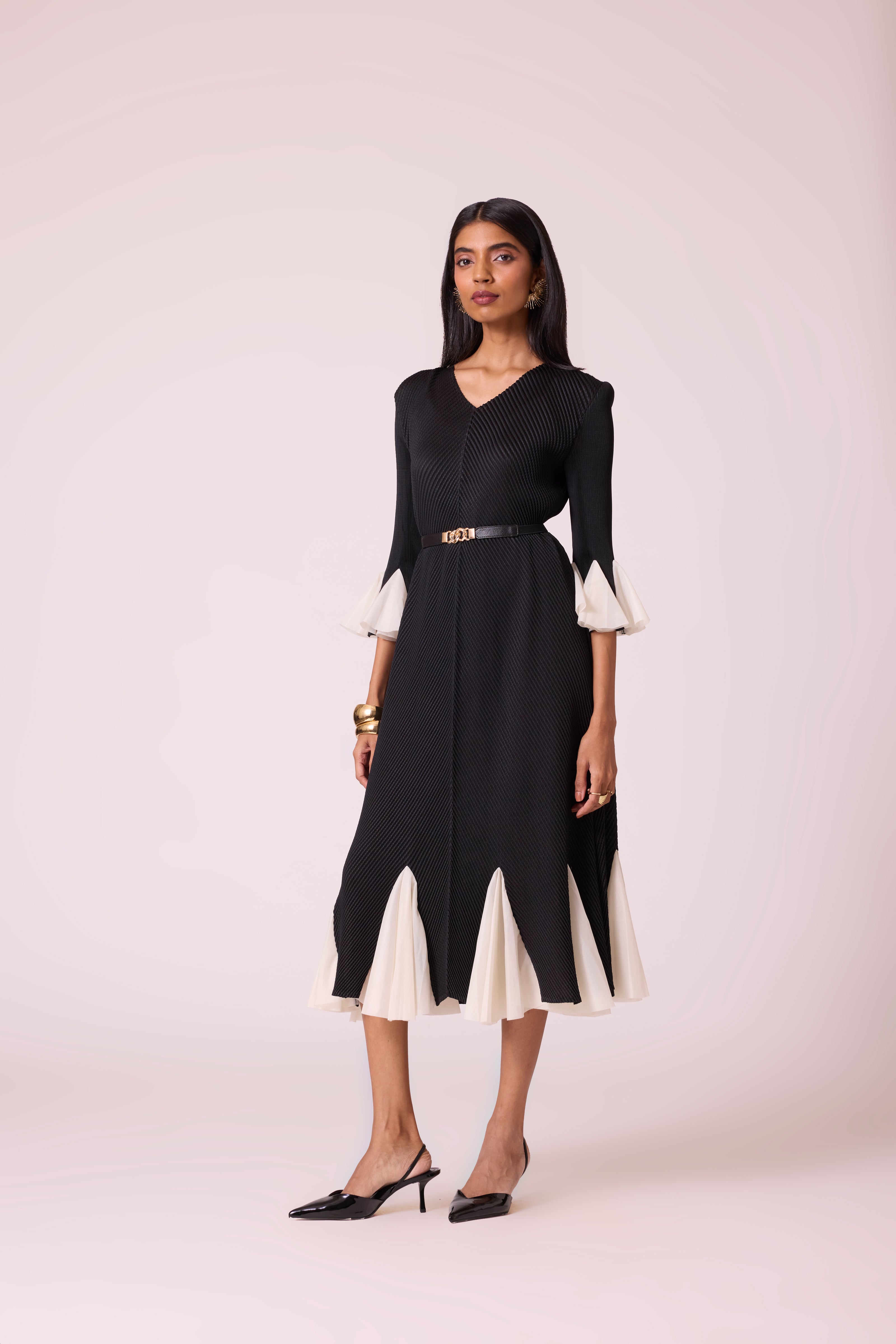 A study in refined contrast, this textured black midi dress features a relaxed A-line cut , a soft V-neckline, three-quarter sleeves, and dramatic ivory godet inserts at the cuffs and hem.