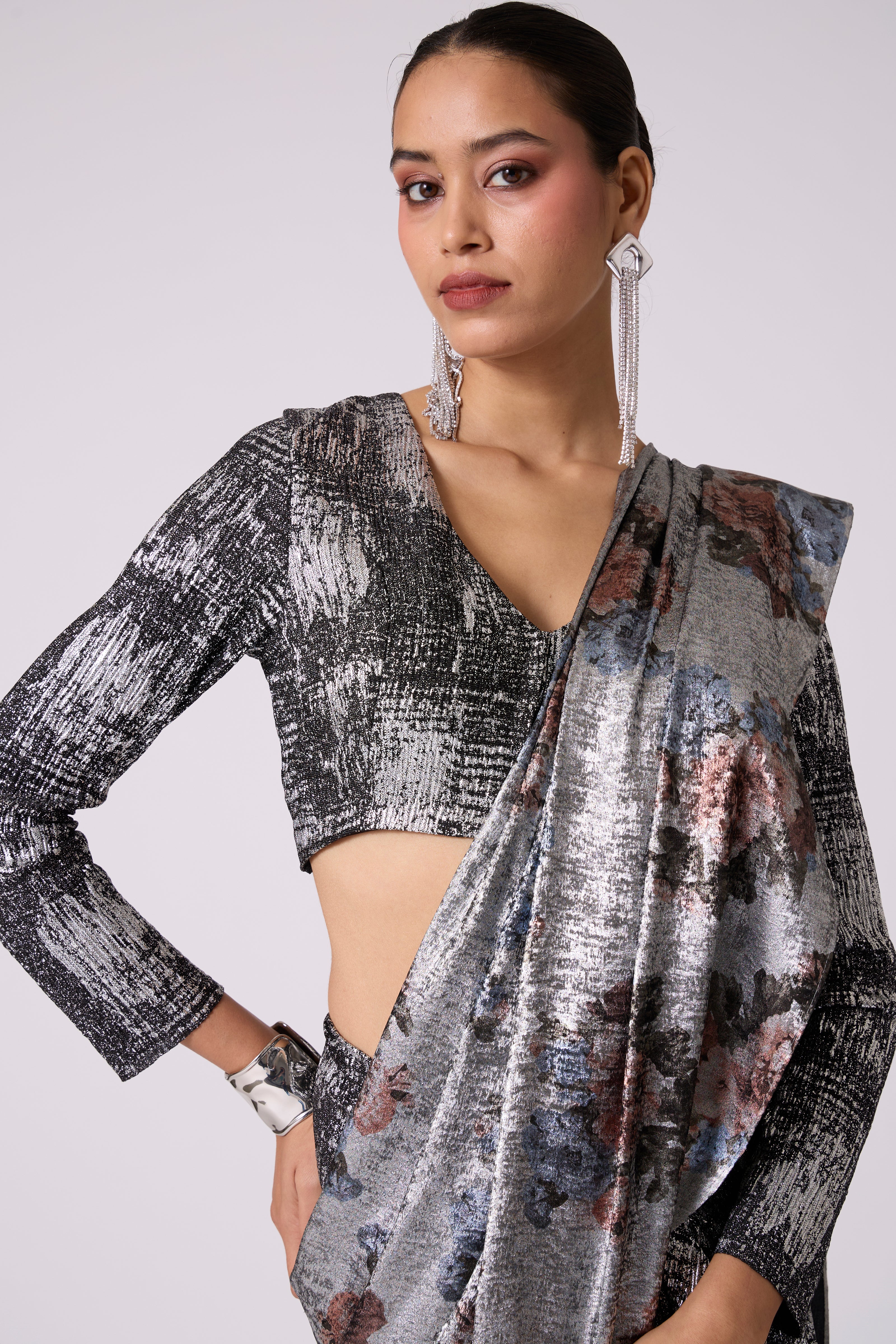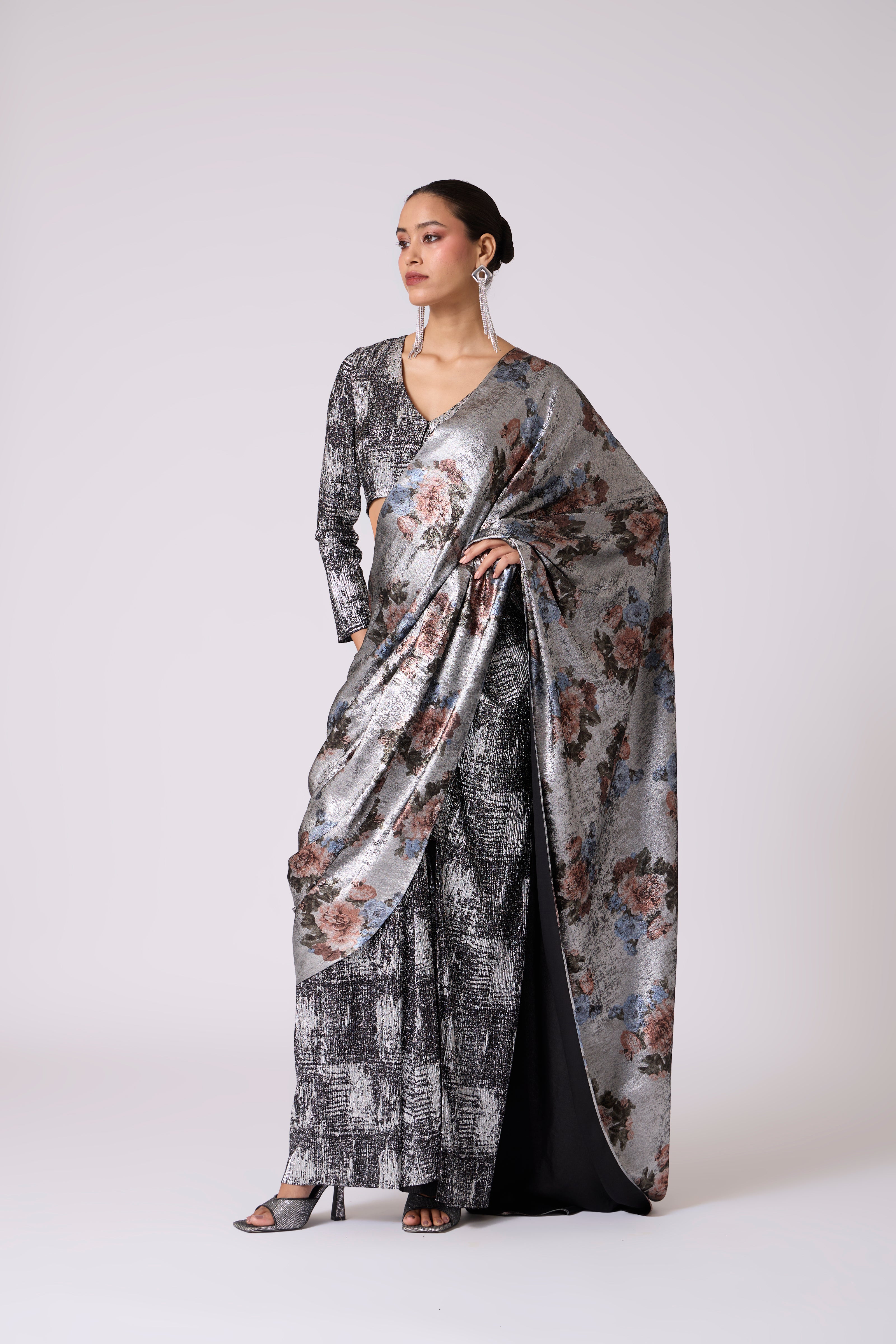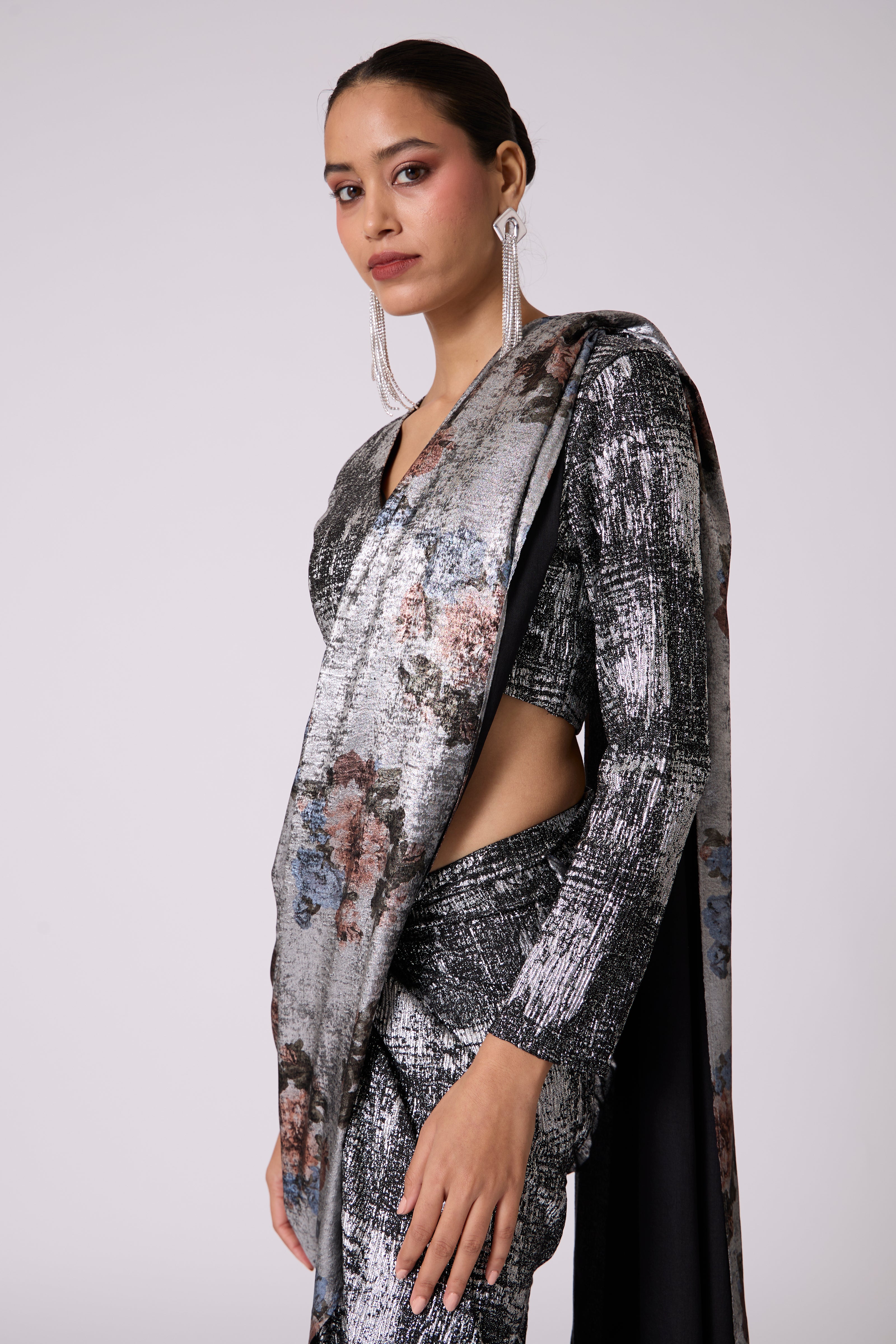 Elevate your evening with our stunning pre-draped saree, featuring a pleated skirt with a chic slit and a satin foil print pallu. Perfect for a modern cocktail look that's sure to turn heads!