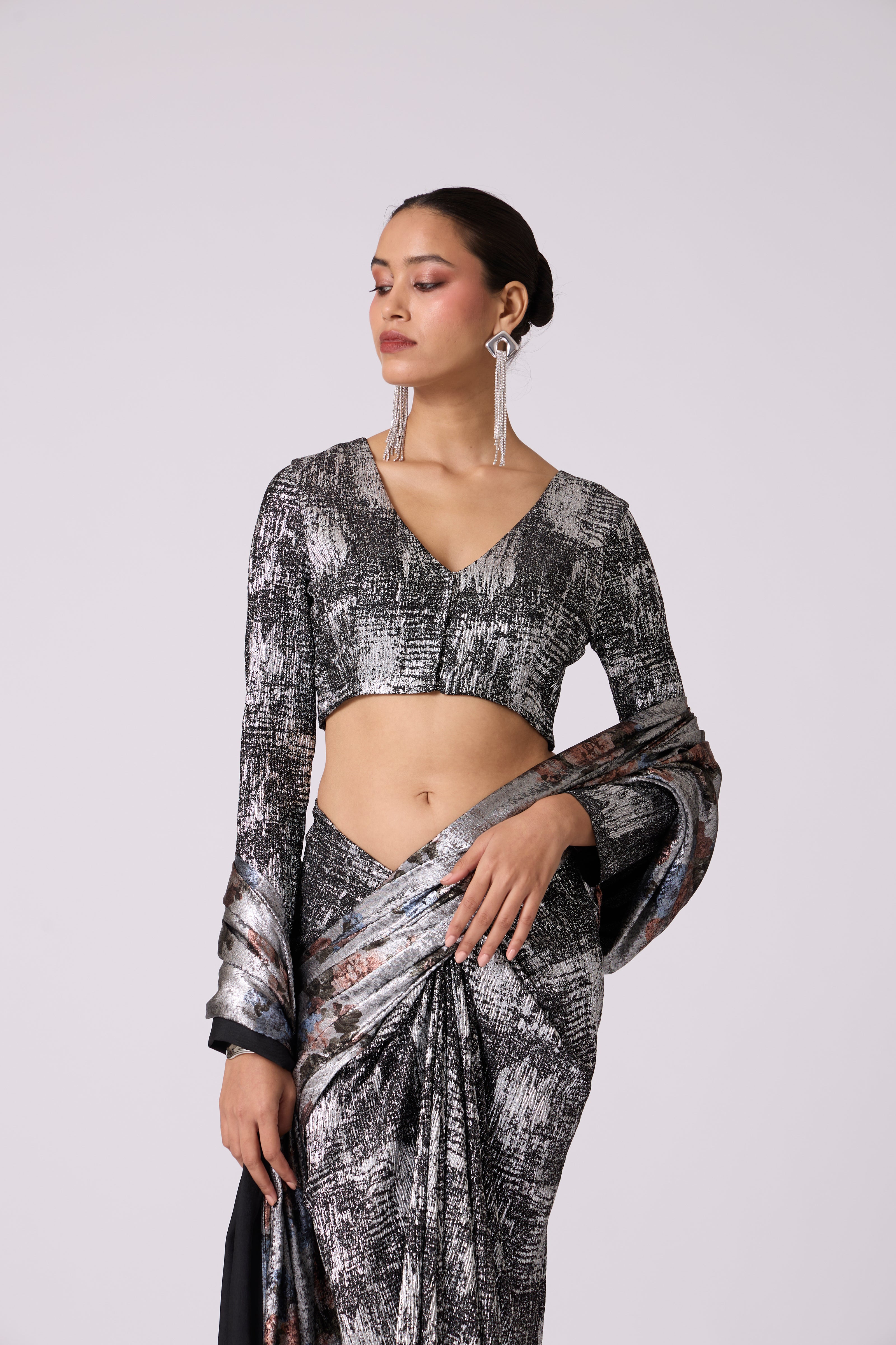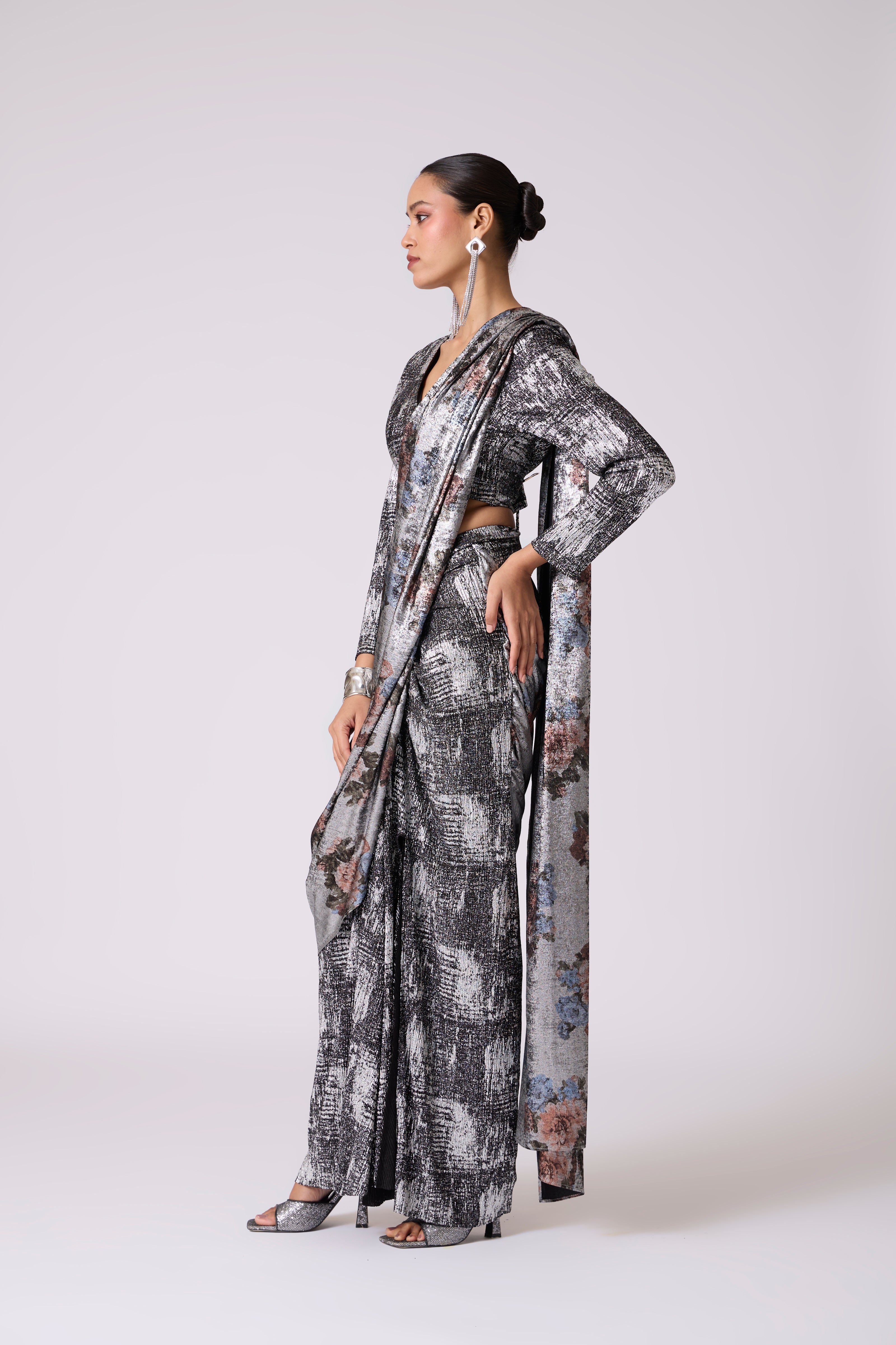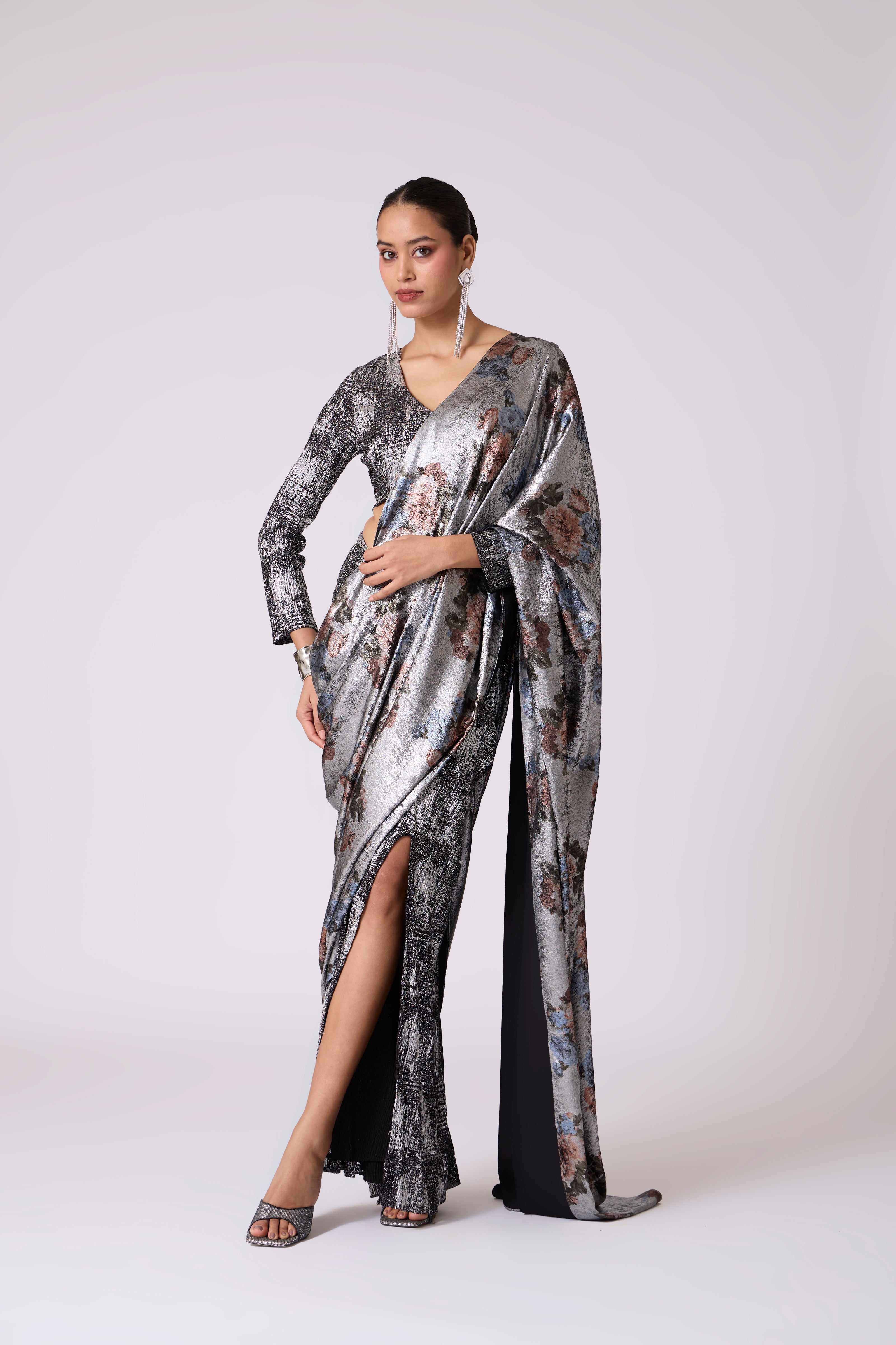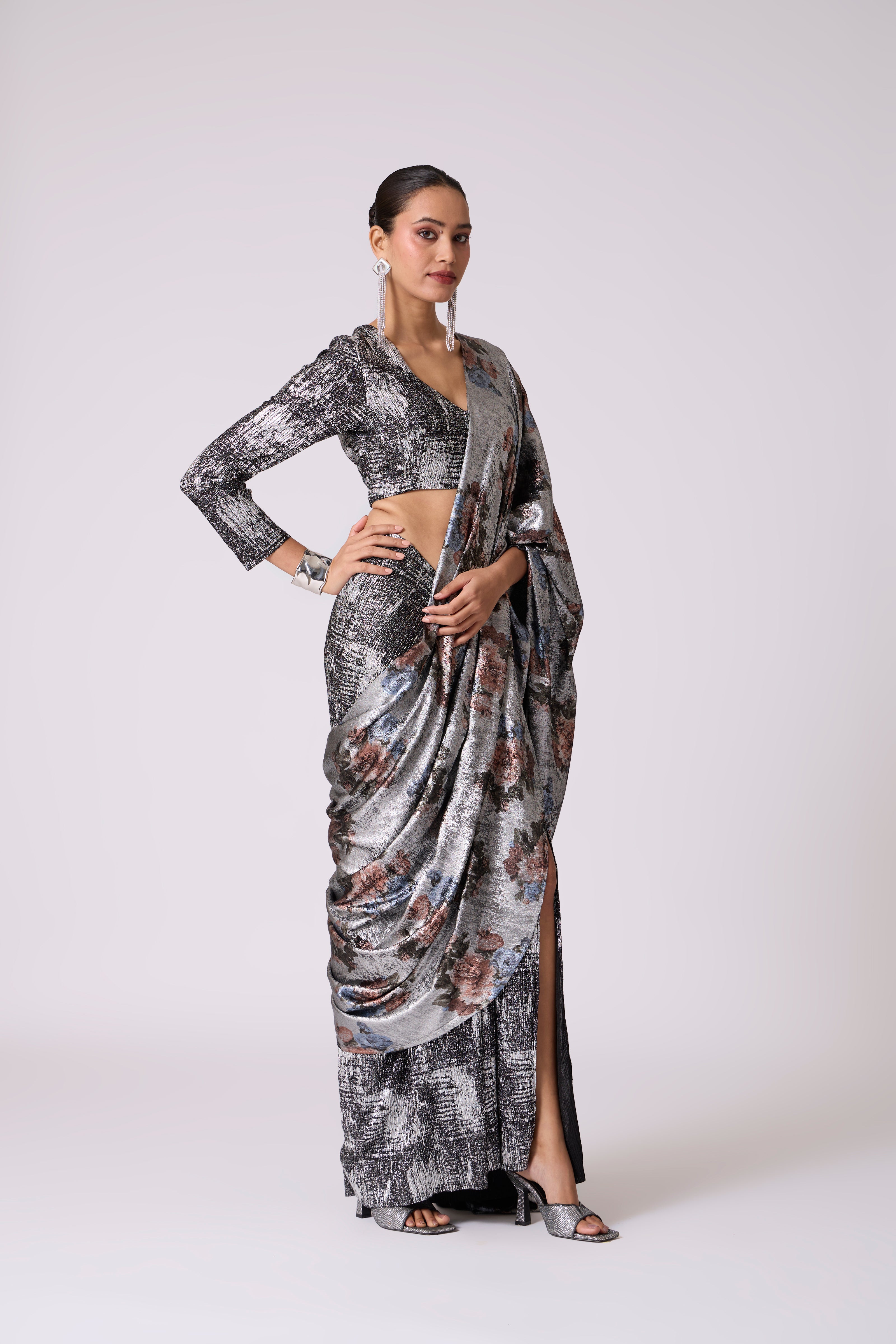 Elevate your evening with our stunning pre-draped saree, featuring a pleated skirt with a chic slit and a satin foil print pallu. Perfect for a modern cocktail look that's sure to turn heads!