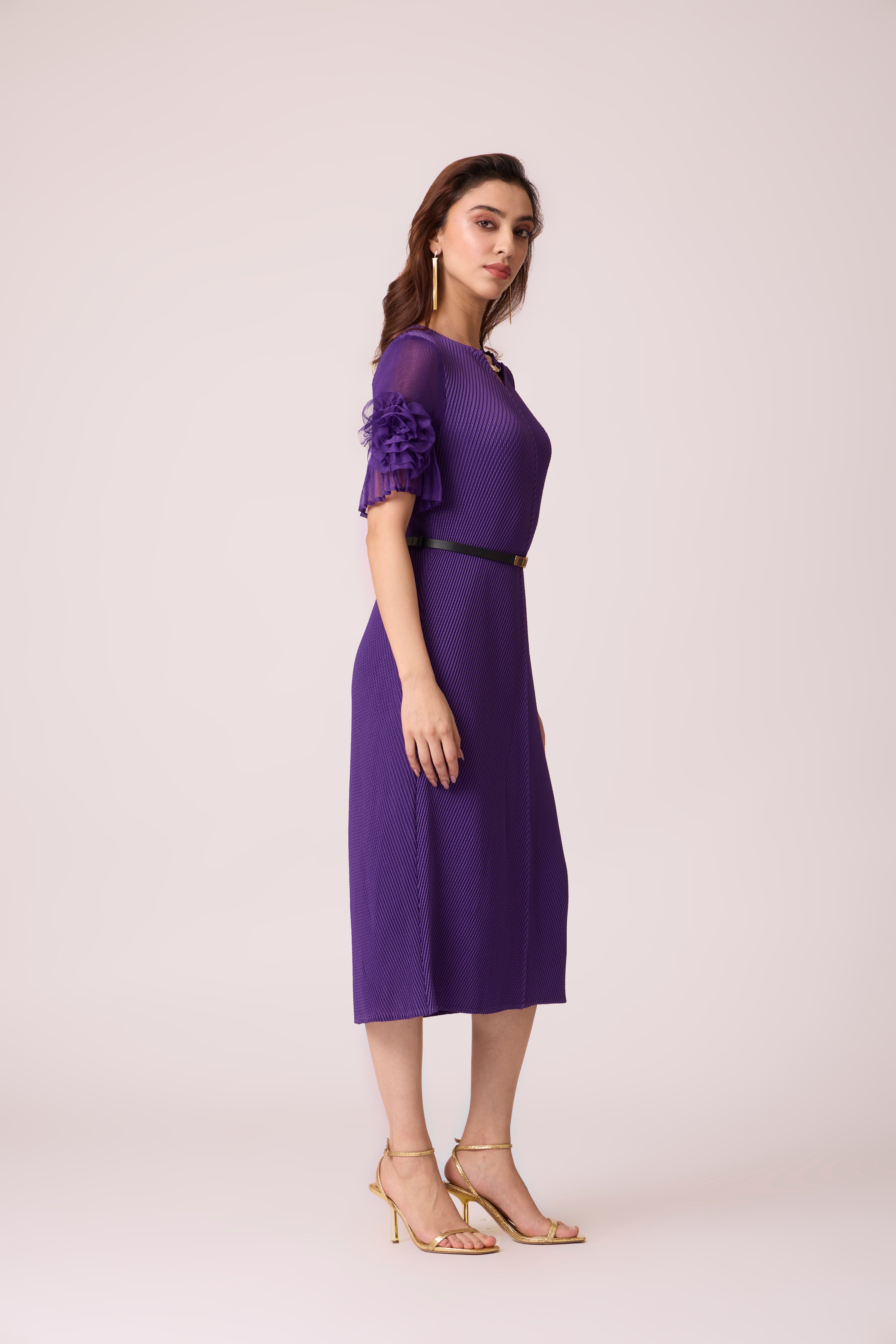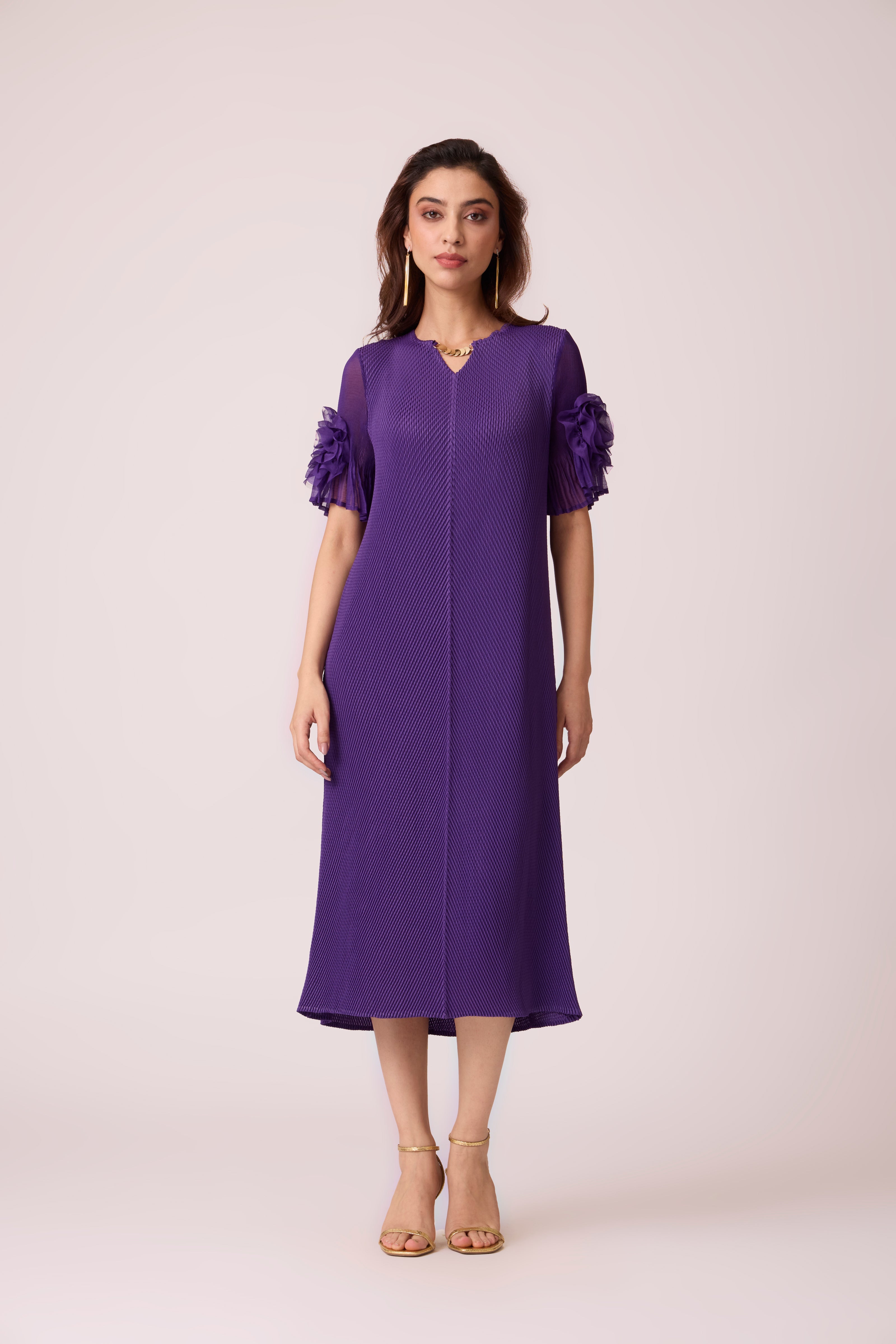 A soft scale pleated A line dress with charming sheer with fabric adorned rosettes.