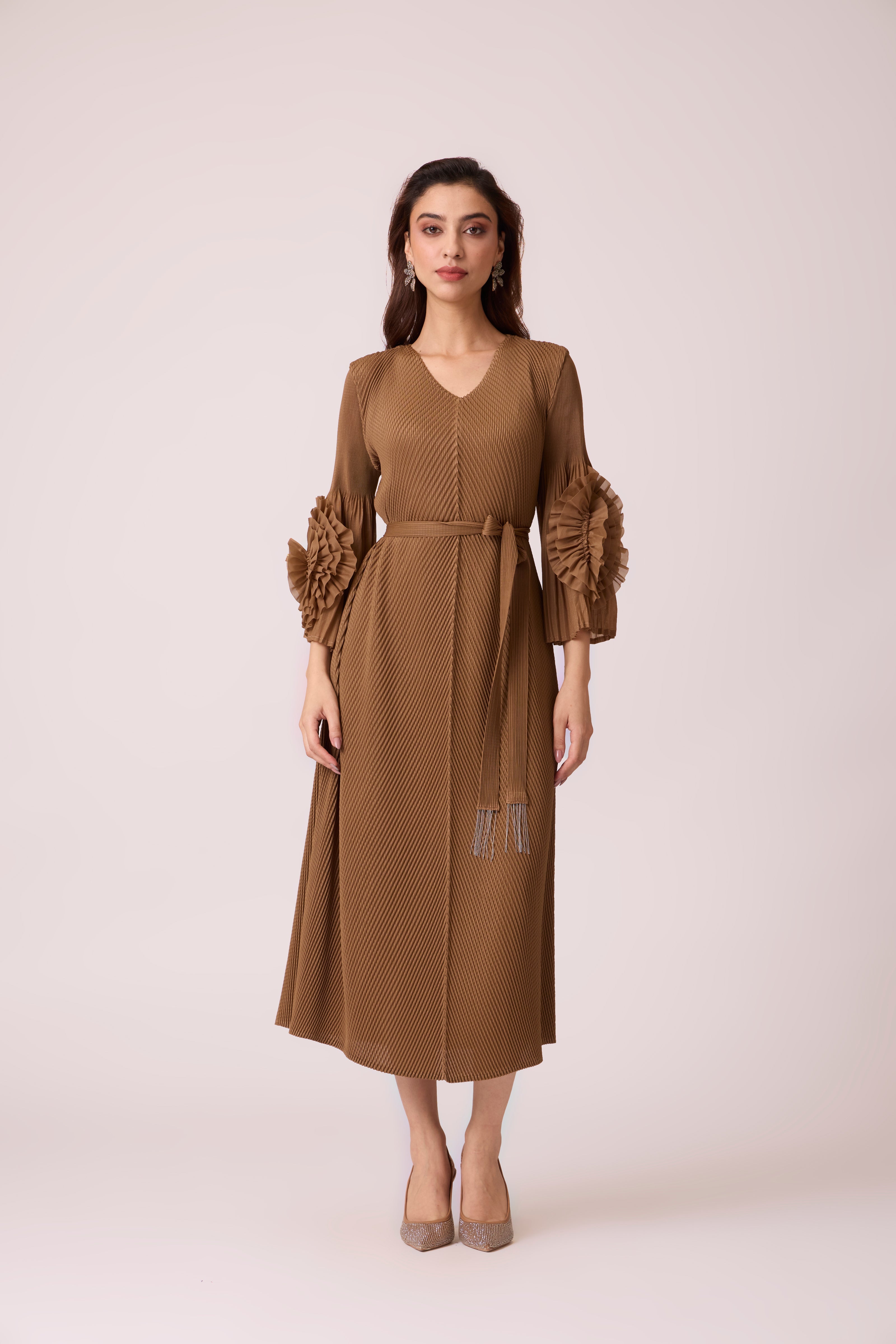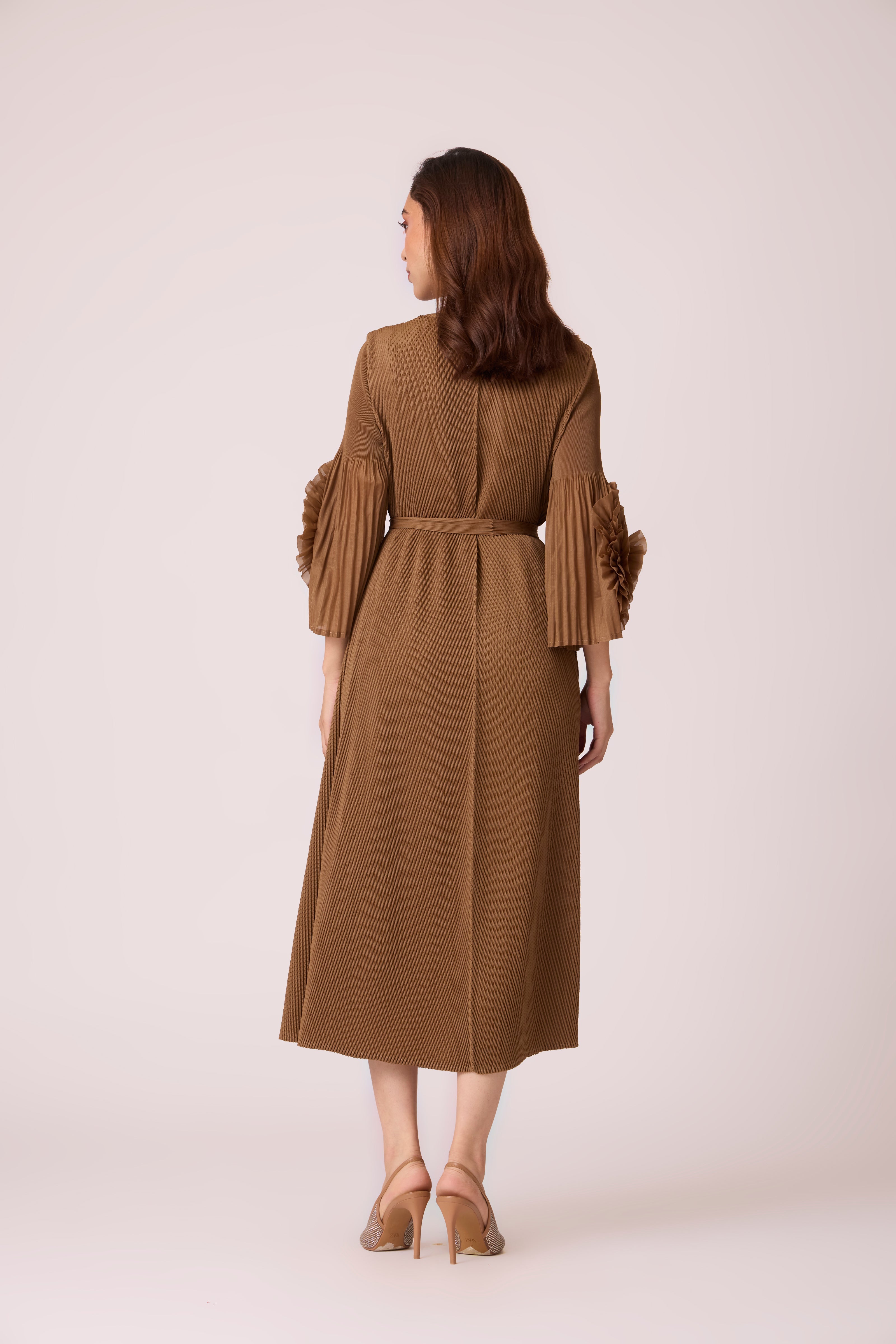 Unique textured diagonal pleating in a classic a line dress with same color fabric floral appliqué on gentle bell sleeves. Comes with same color belt for those who prefer a cinched look.