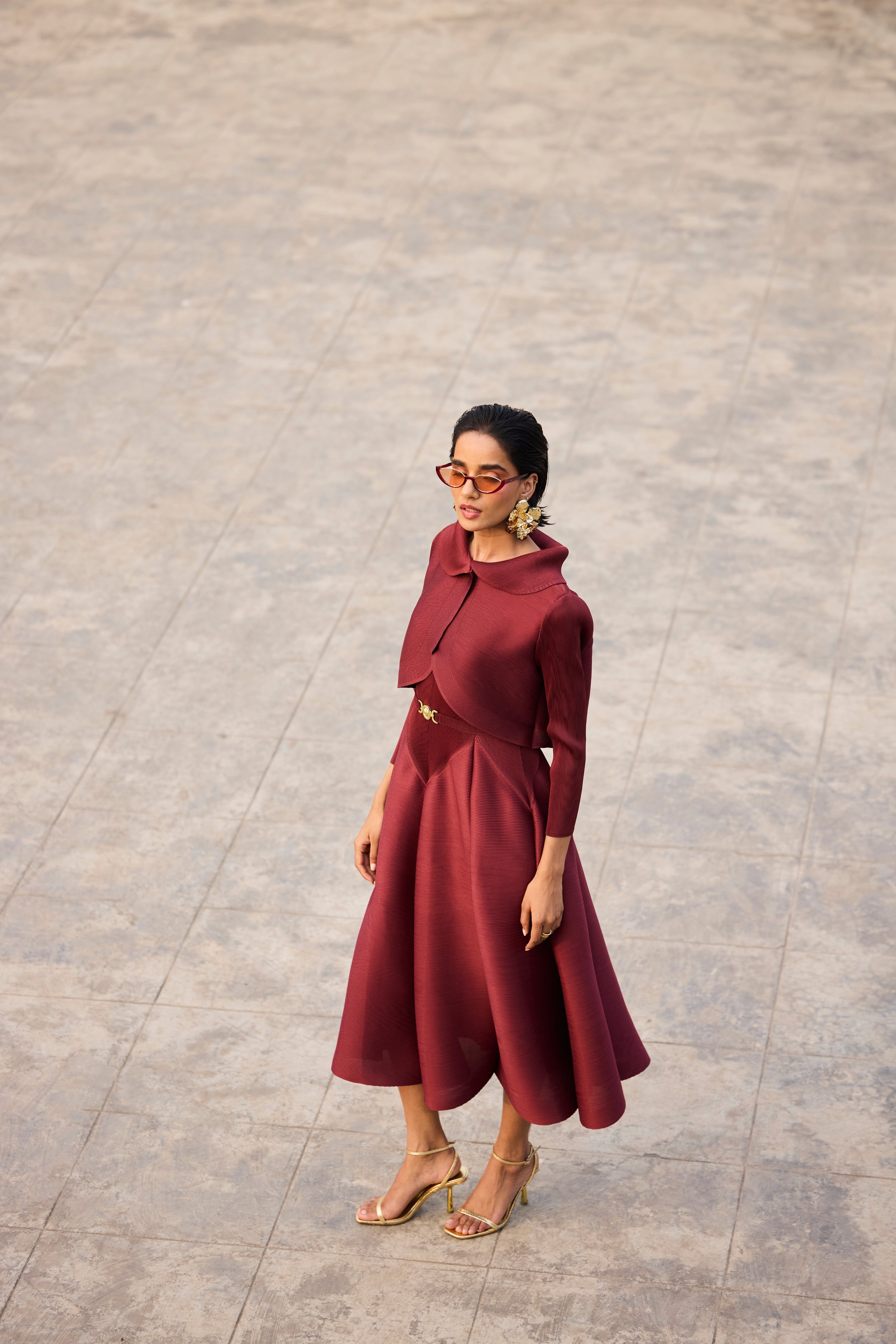 An elegant waist cinched peplum dress with a matching short bolero jacket.