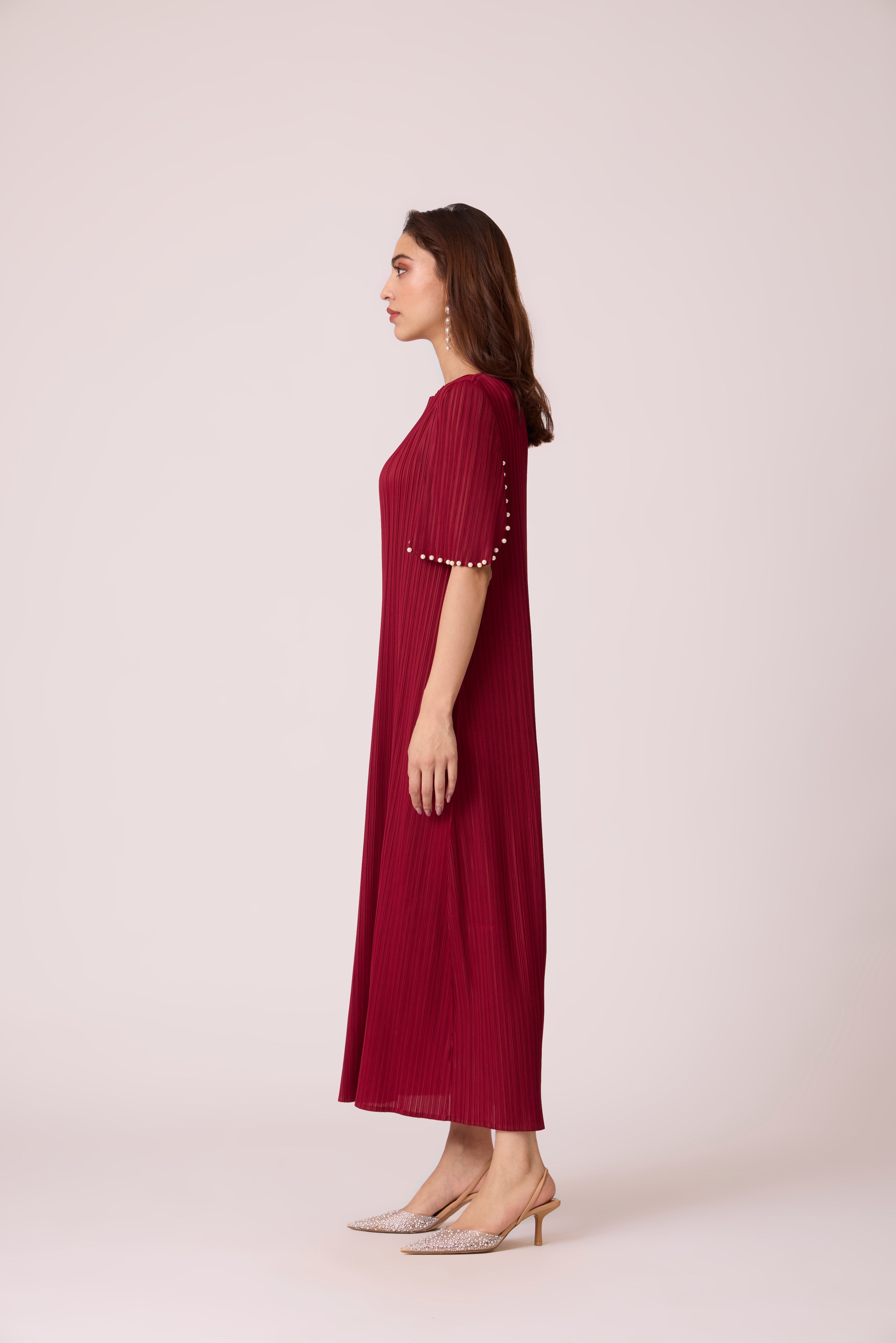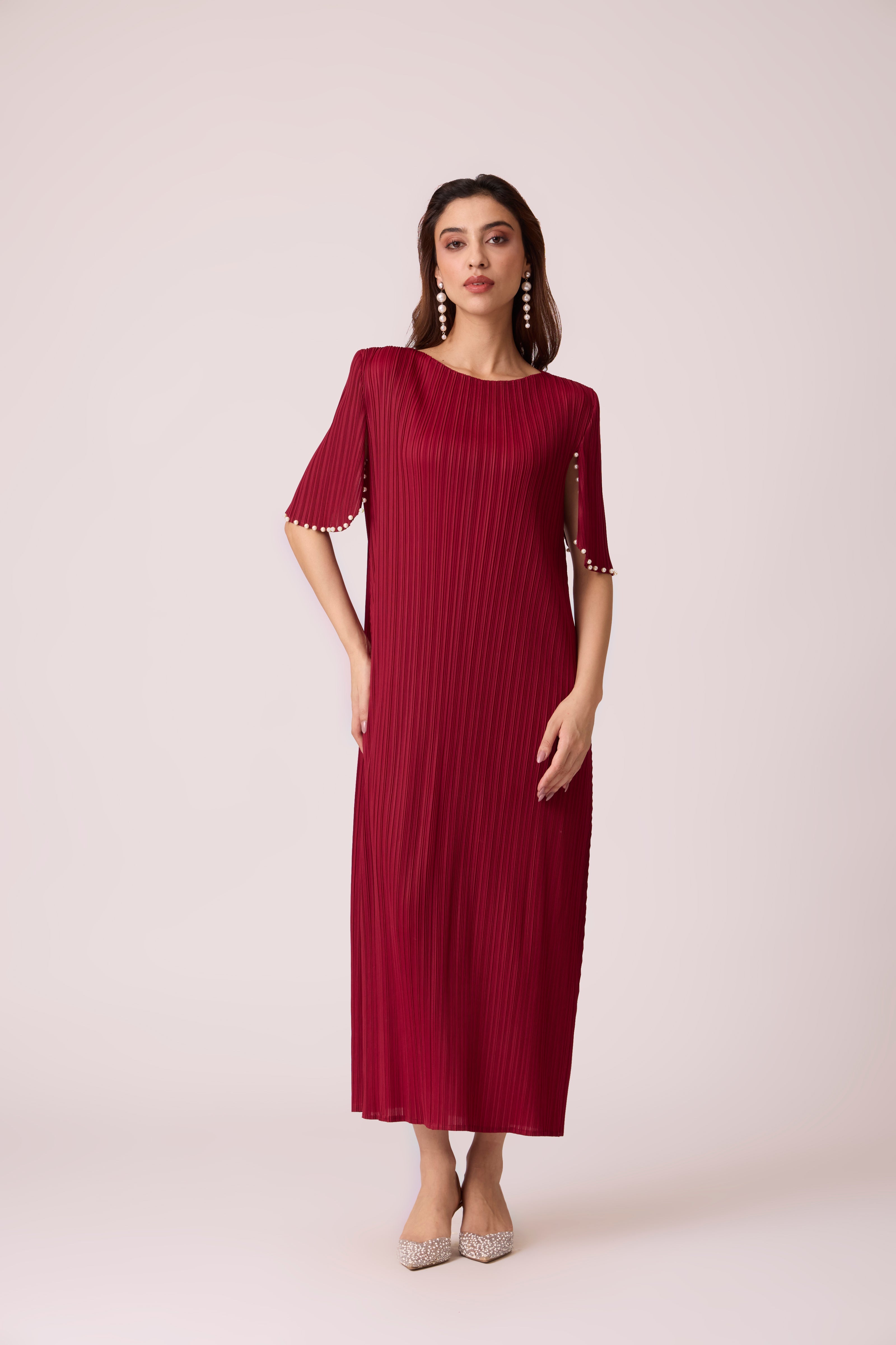 An elegant evening wear shift dress with a cut open sleeve adorned with pearls.