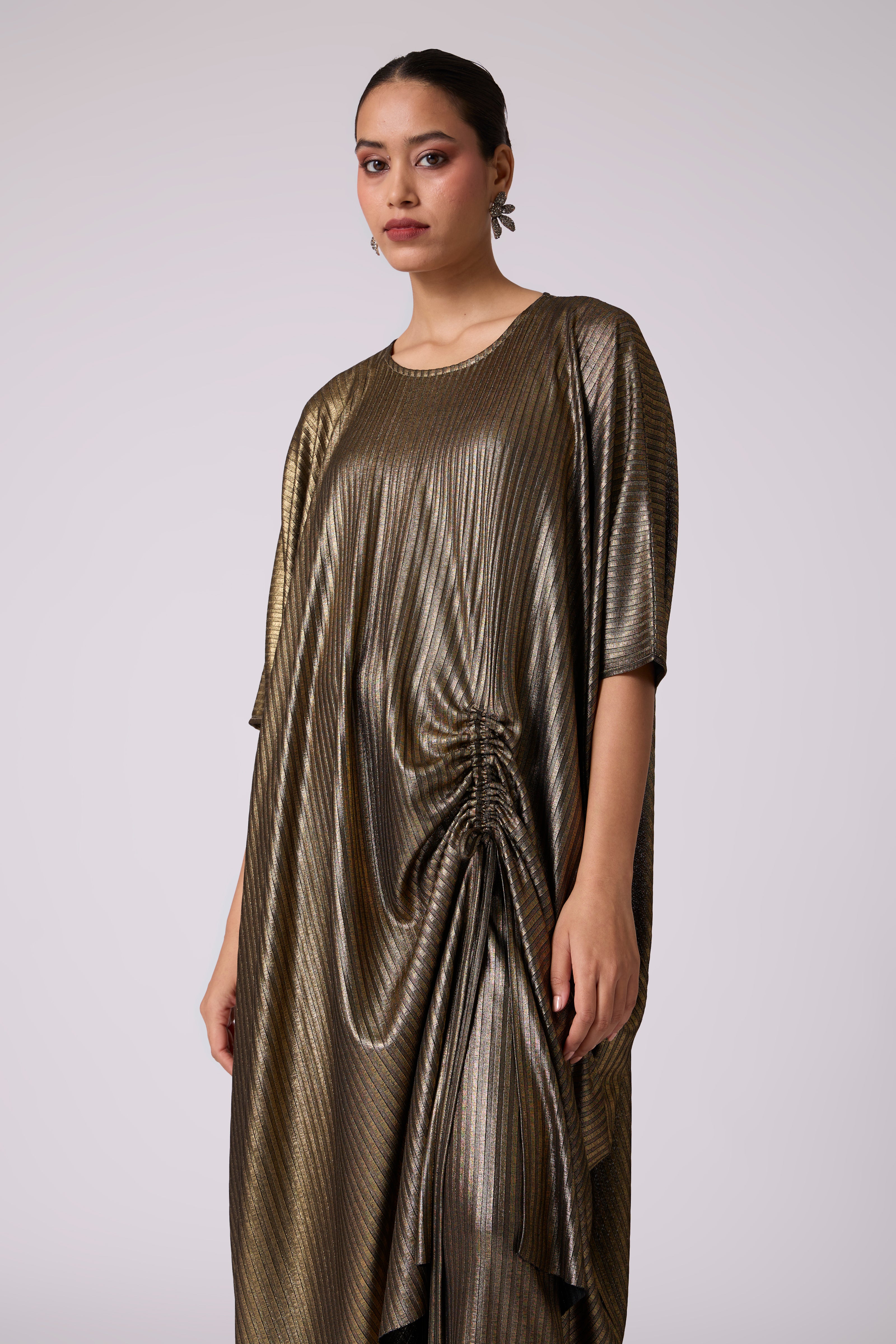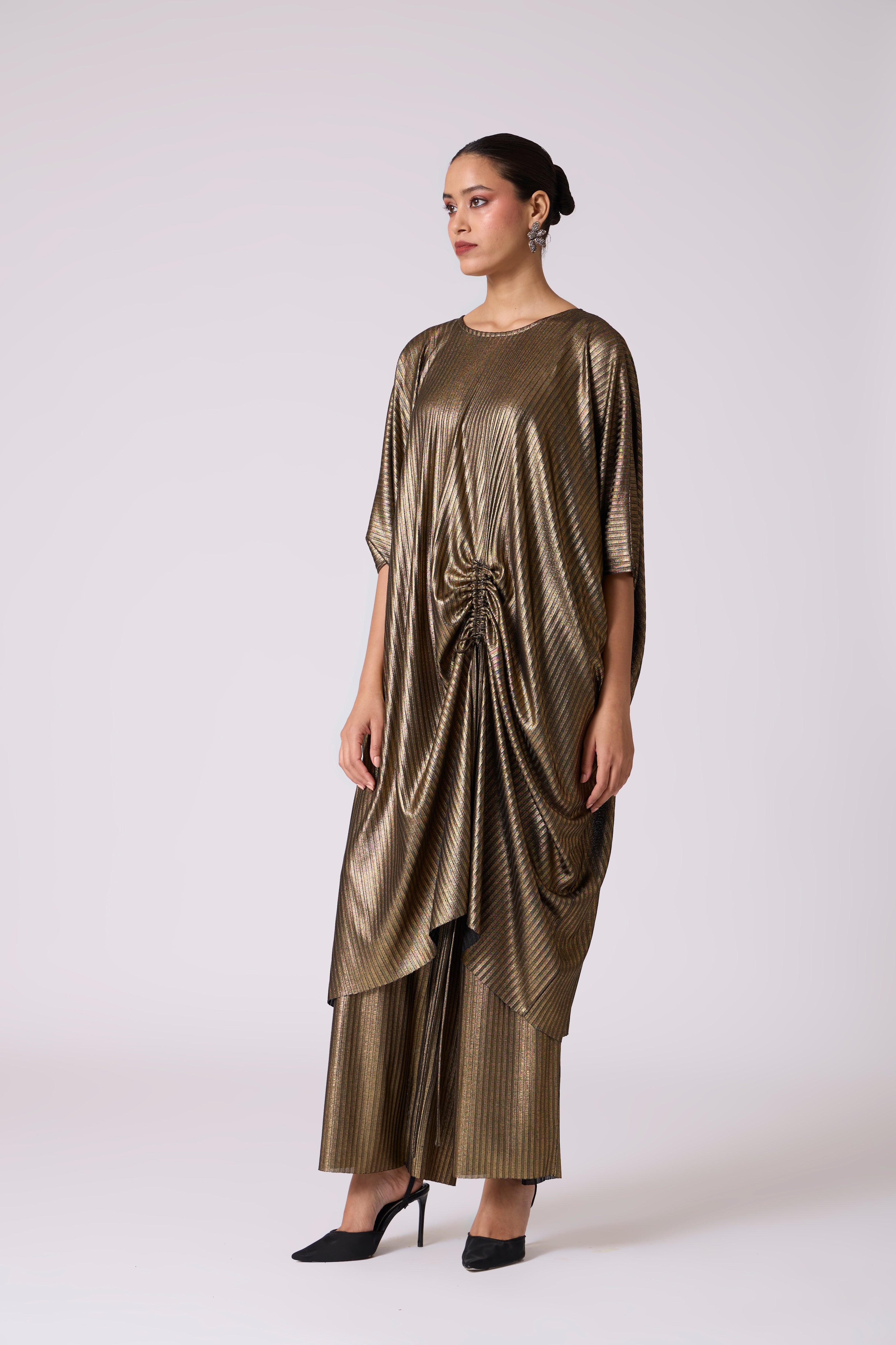 A long kaftan style tunic with front rouche & slit detail with matching pants crafted from a soft metallic knit fabric.