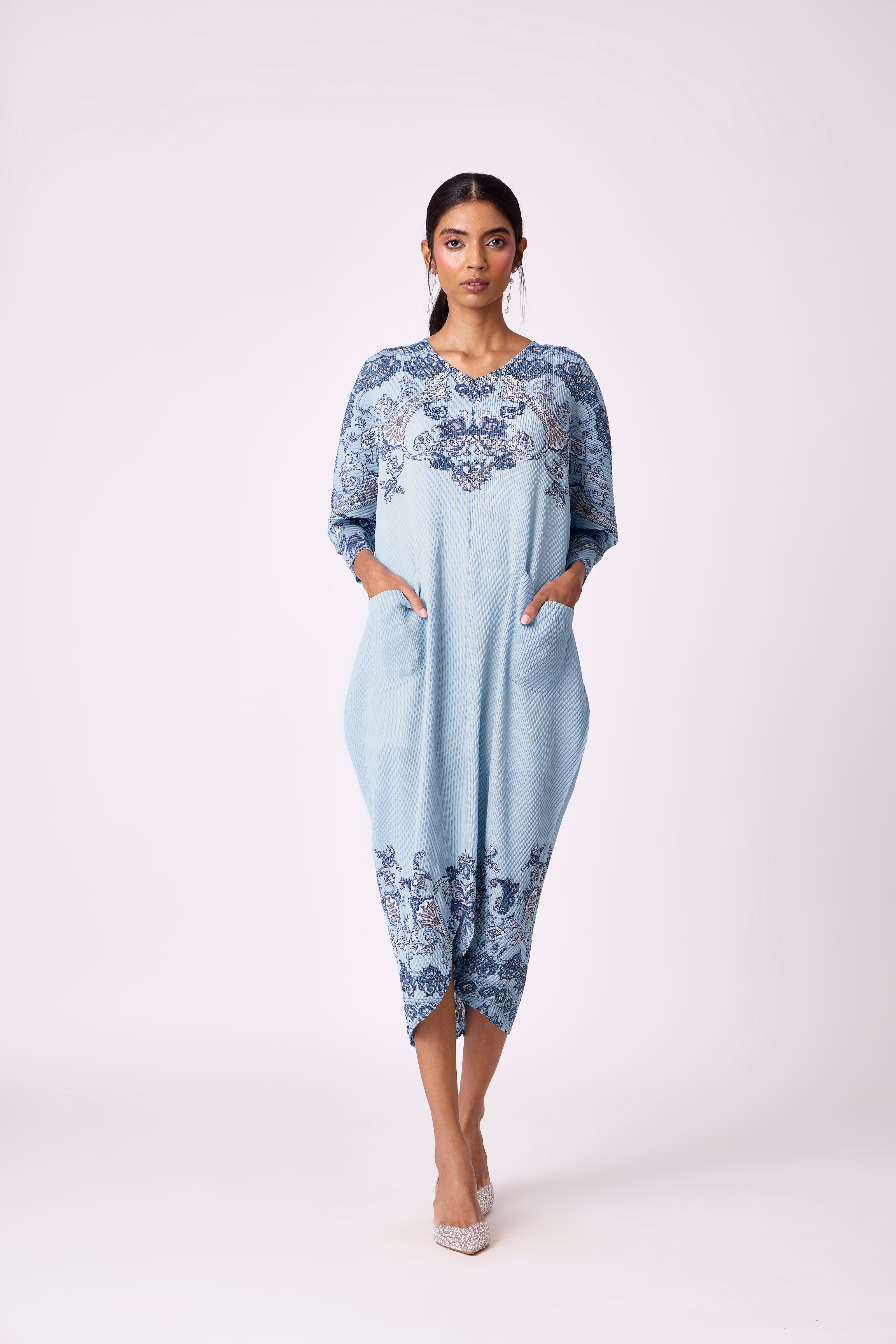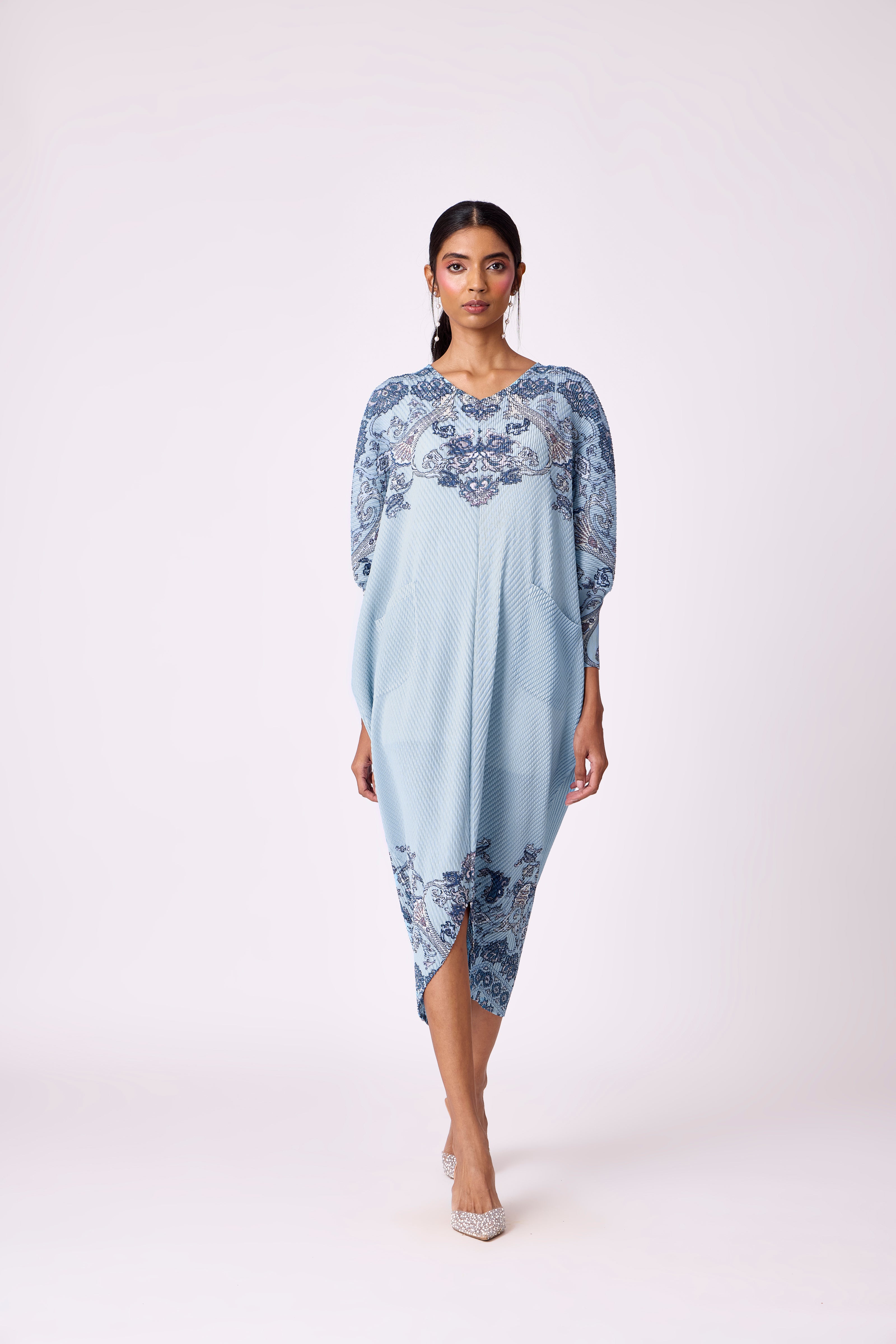 A wide V neck, finely pleated dress and batwing sleeves on an easy shift dress