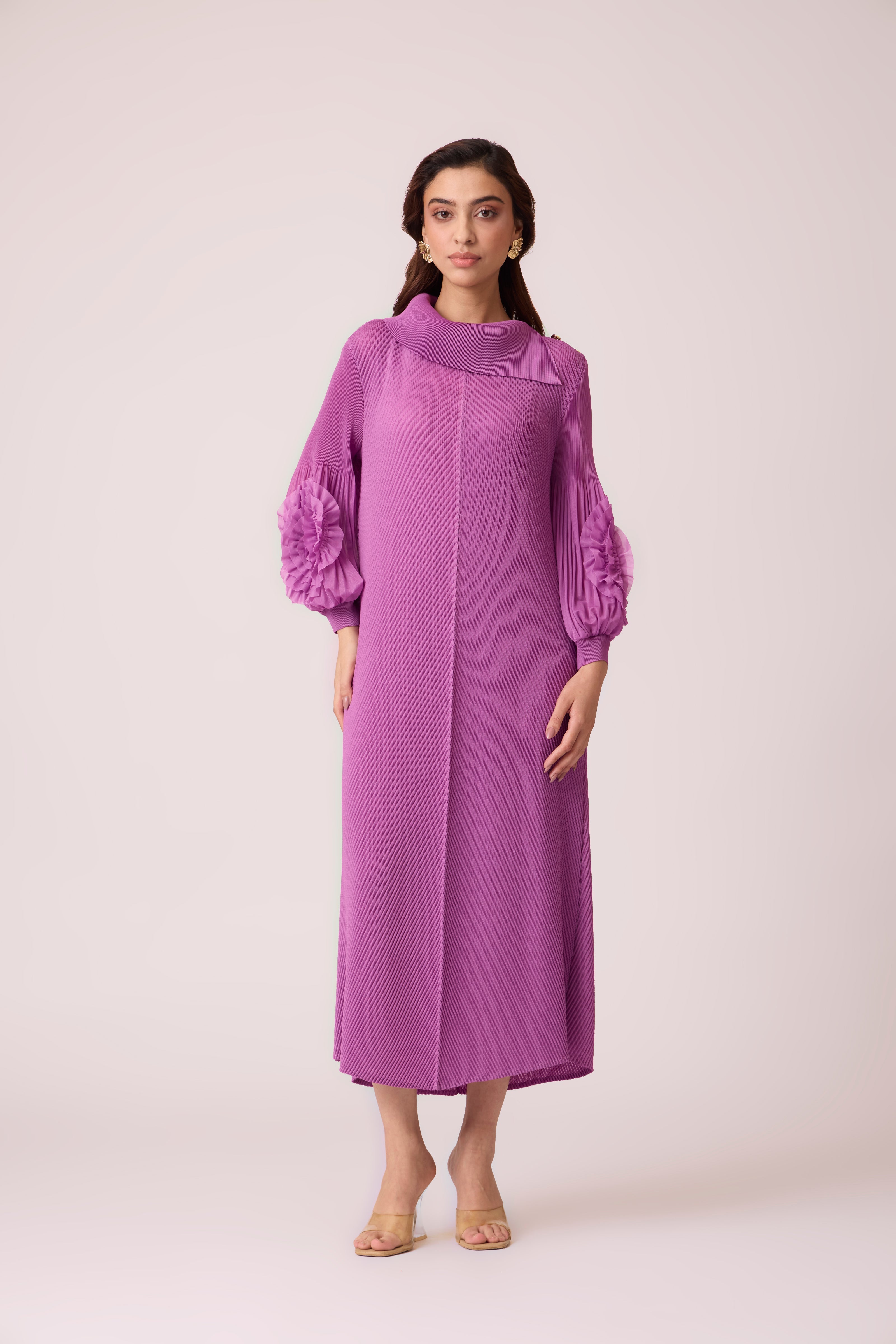 A nuanced A line dress comprising of a dramatic over collar and mildy exaggerated balloon sleeve embellished with a fabric flower.