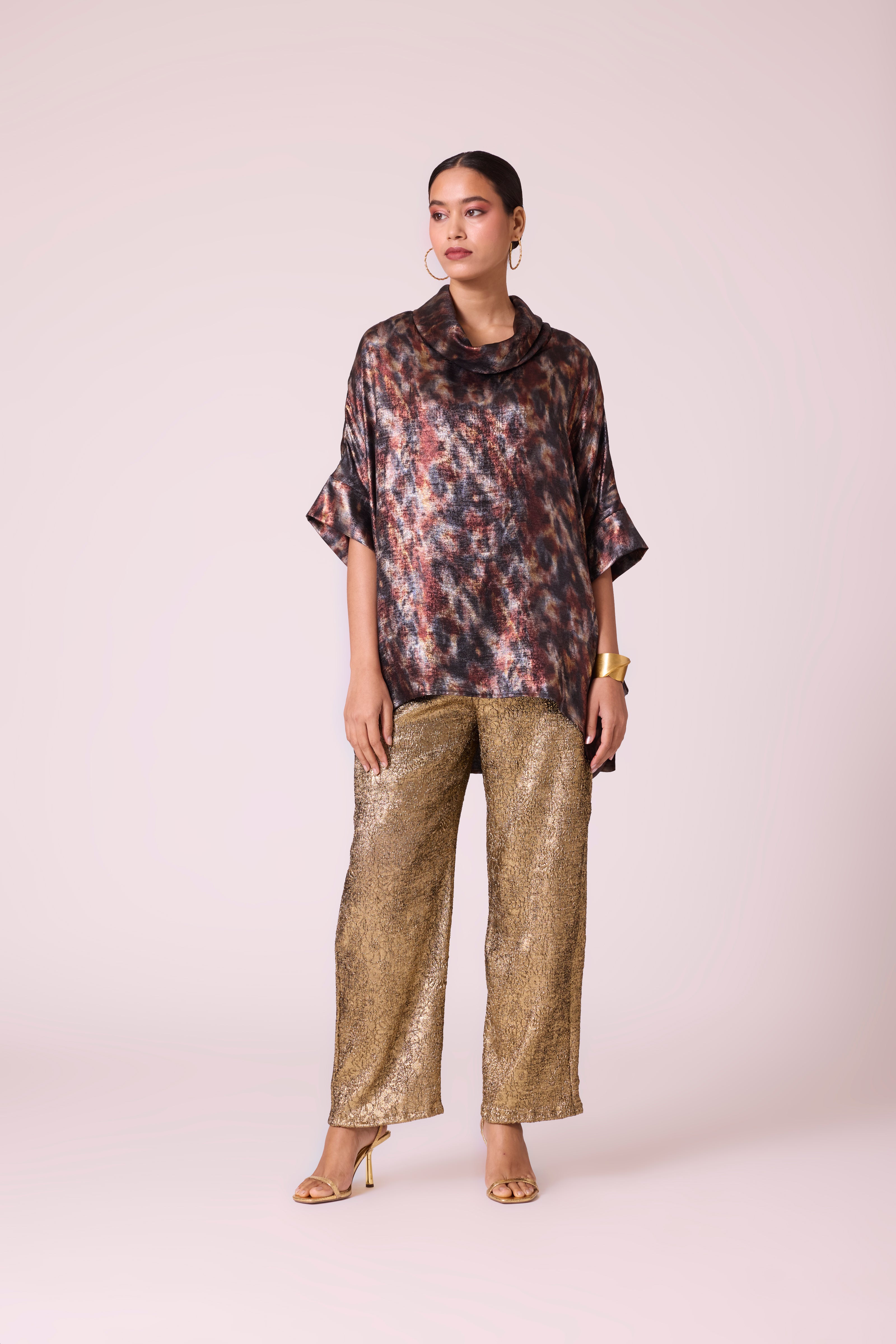 A charming preset cowl collar, dolman sleeves and tie details on sleeve makes for a charming day to evening, work to dinner top. Paired with our straight leg dull metallic jacquard pants for a complete look.