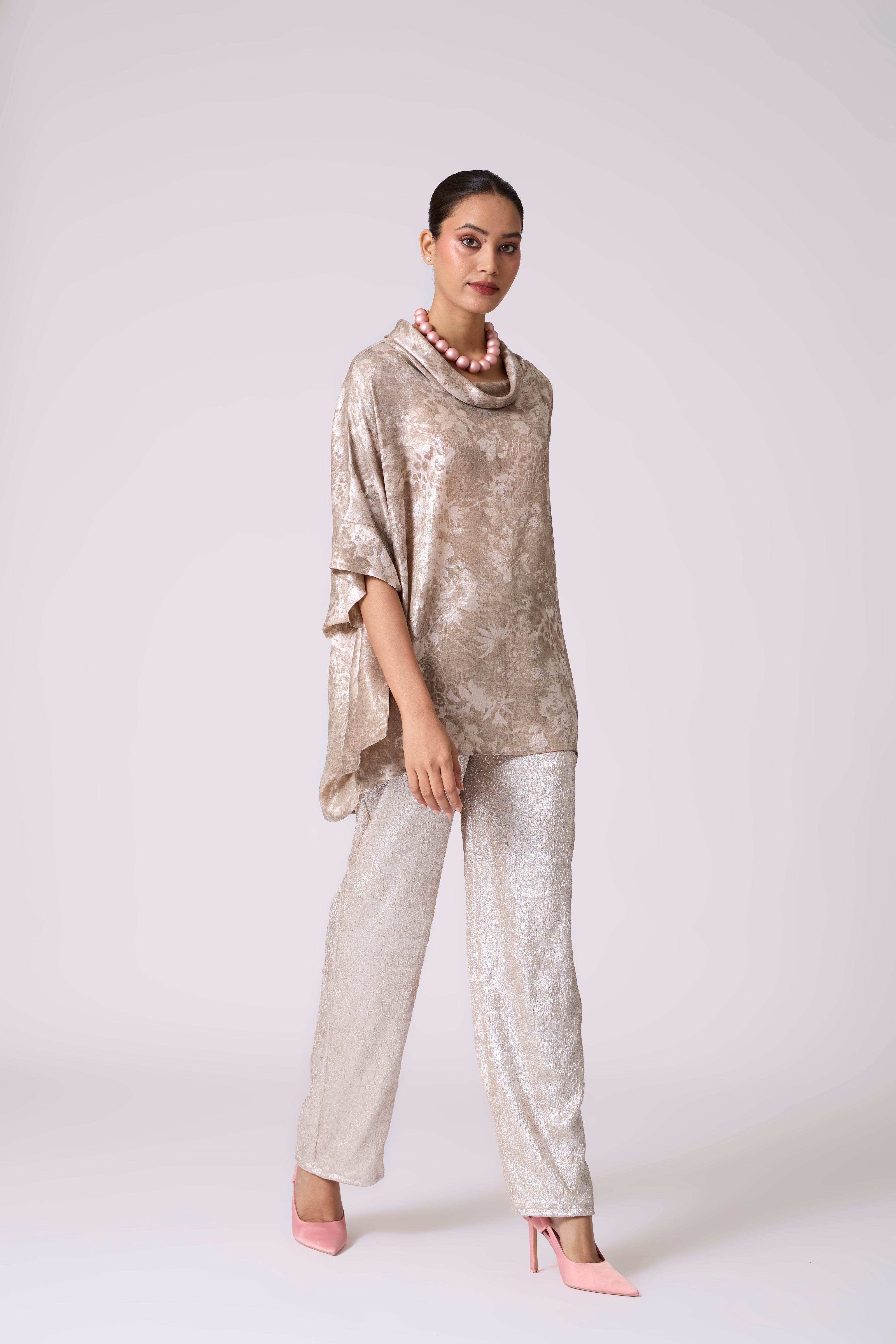 A charming preset cowl collar, dolman sleeves and tie details on sleeve makes for a charming day to evening, work to dinner top. Paired with our straight leg dull metallic jacquard pants for a complete look.