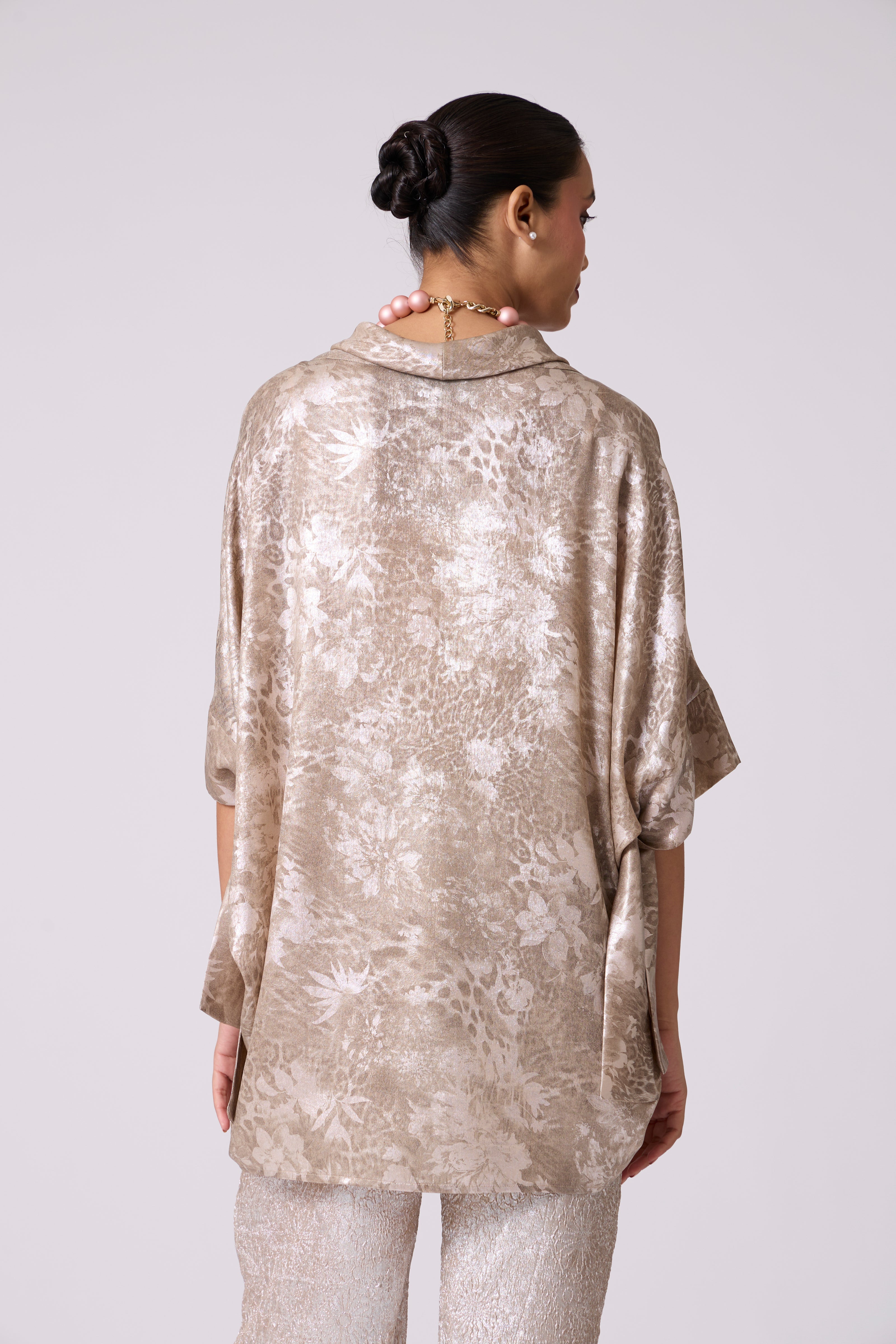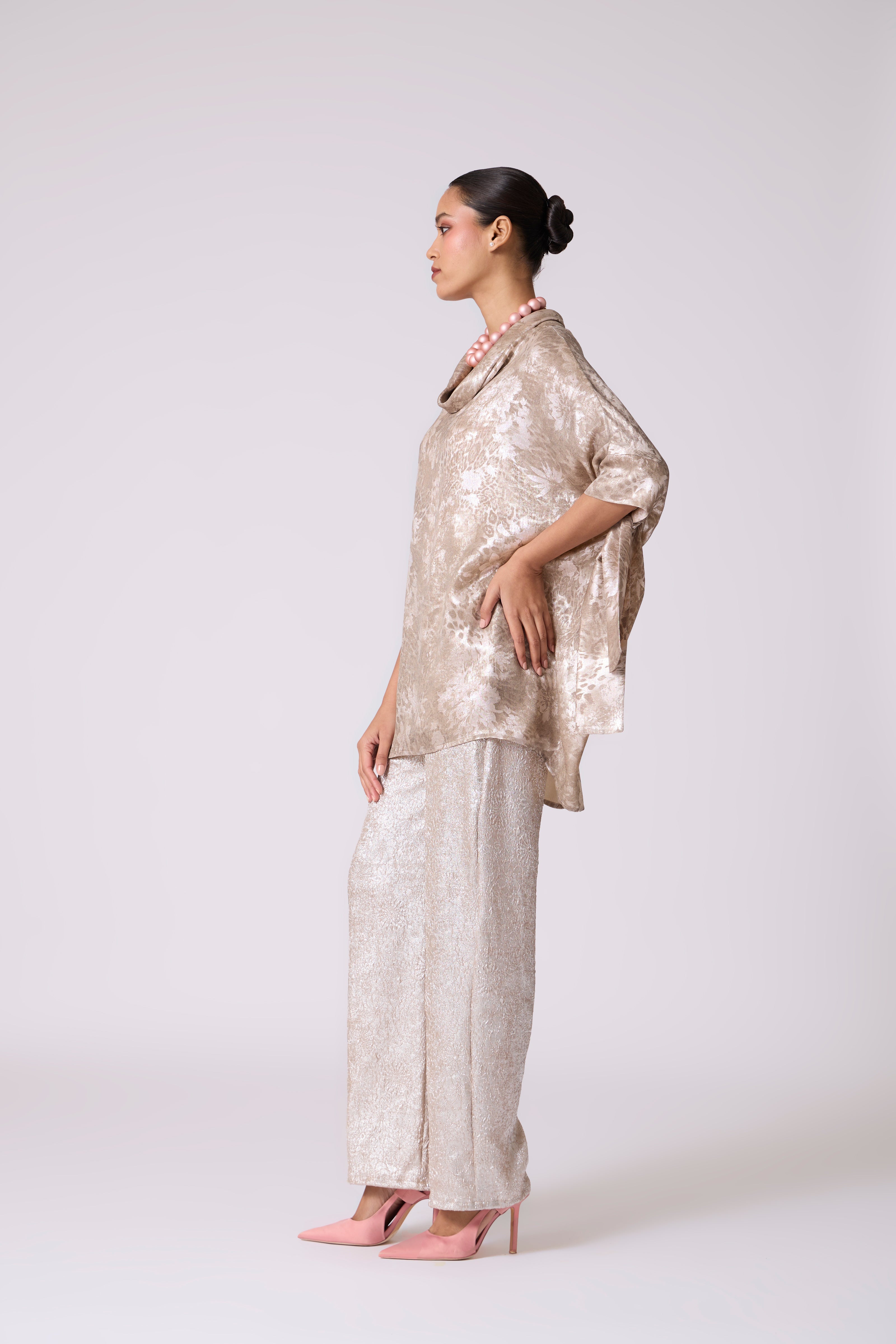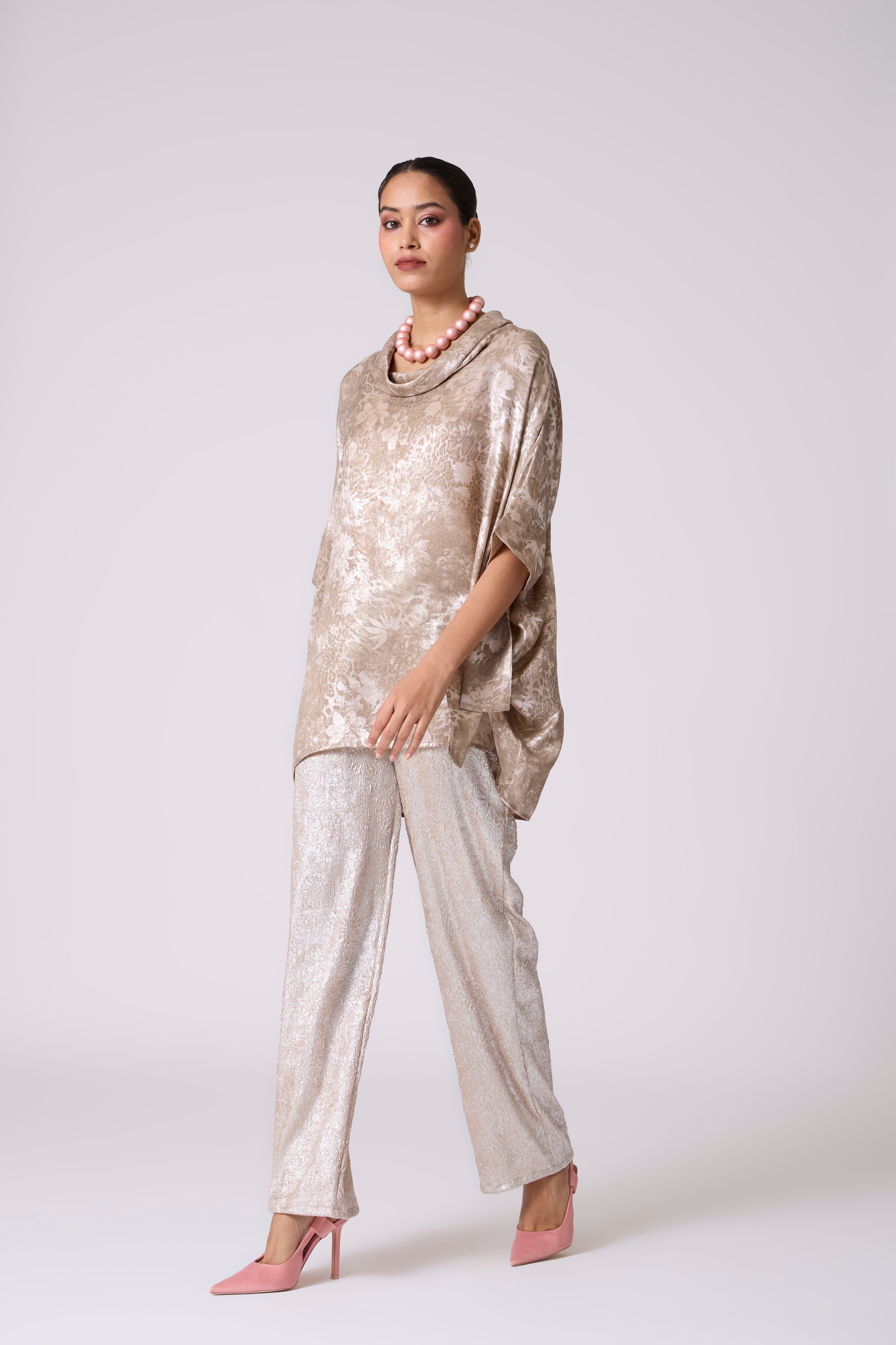 A charming preset cowl collar, dolman sleeves and tie details on sleeve makes for a charming day to evening, work to dinner top. Elevate the look by pairing it with our dull metallic jacquard pants for a complete look.