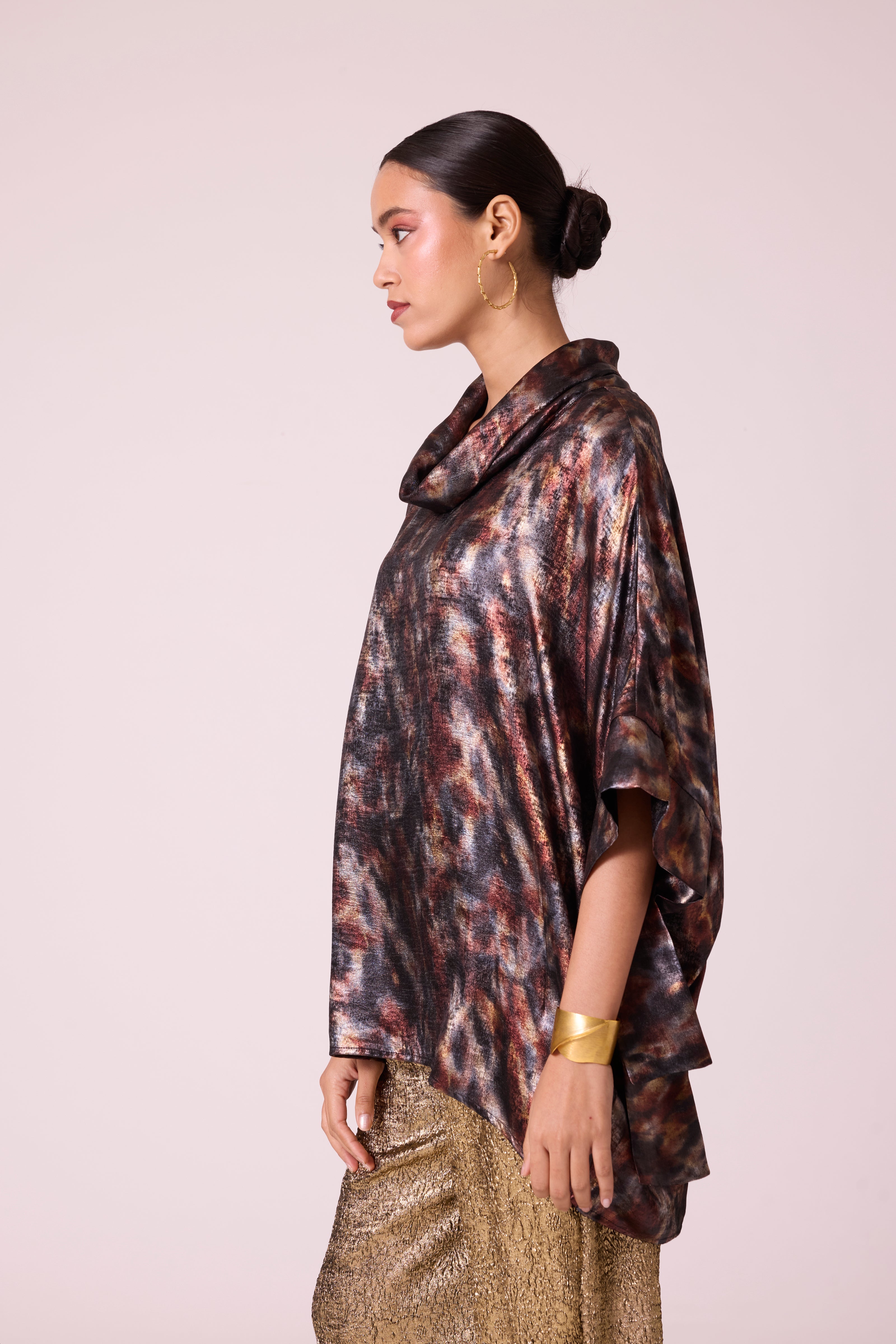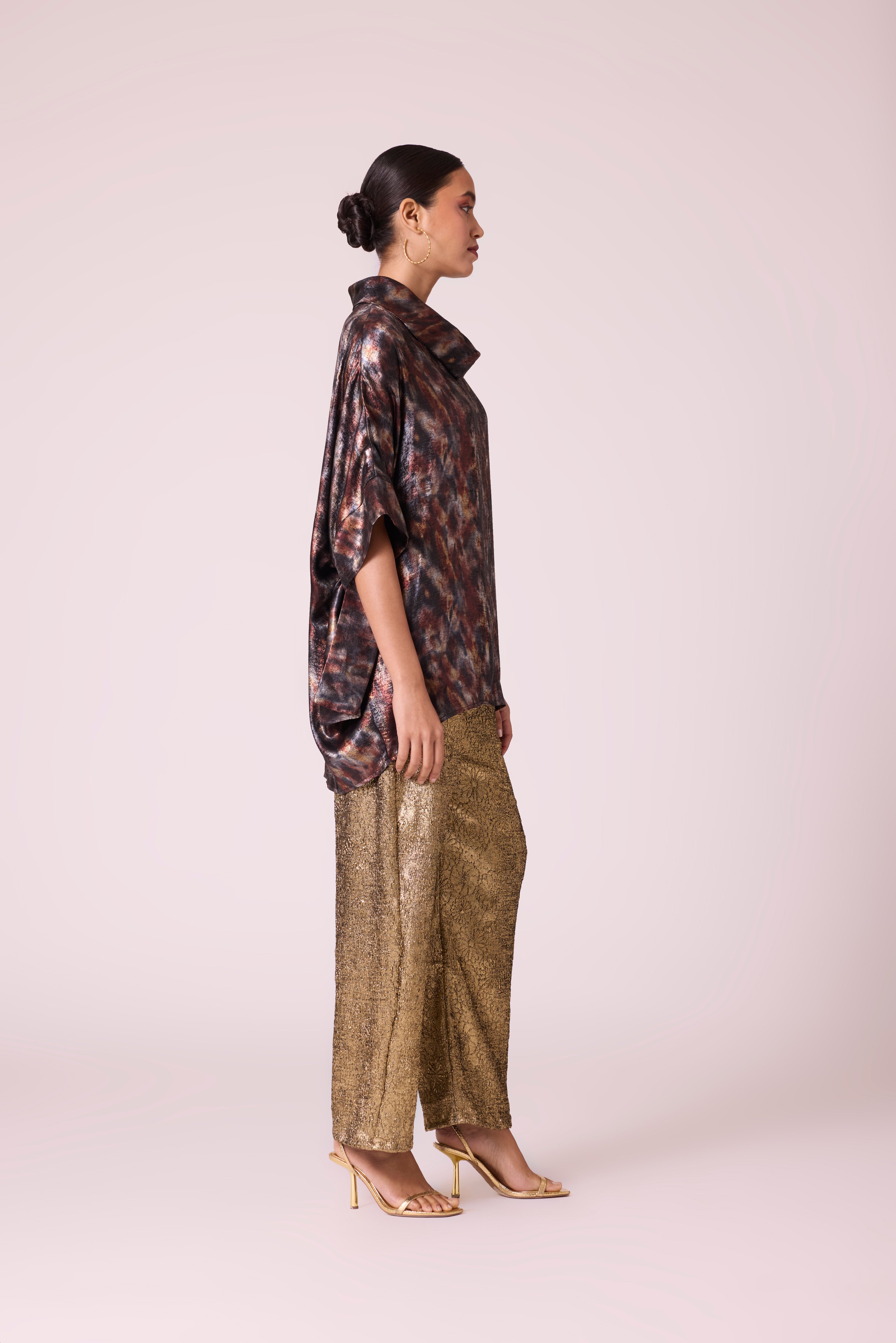 A charming preset cowl collar, dolman sleeves and tie details on sleeve makes for a charming day to evening, work to dinner top. Elevate the look by pairing it with our dull metallic jacquard pants for a complete look.