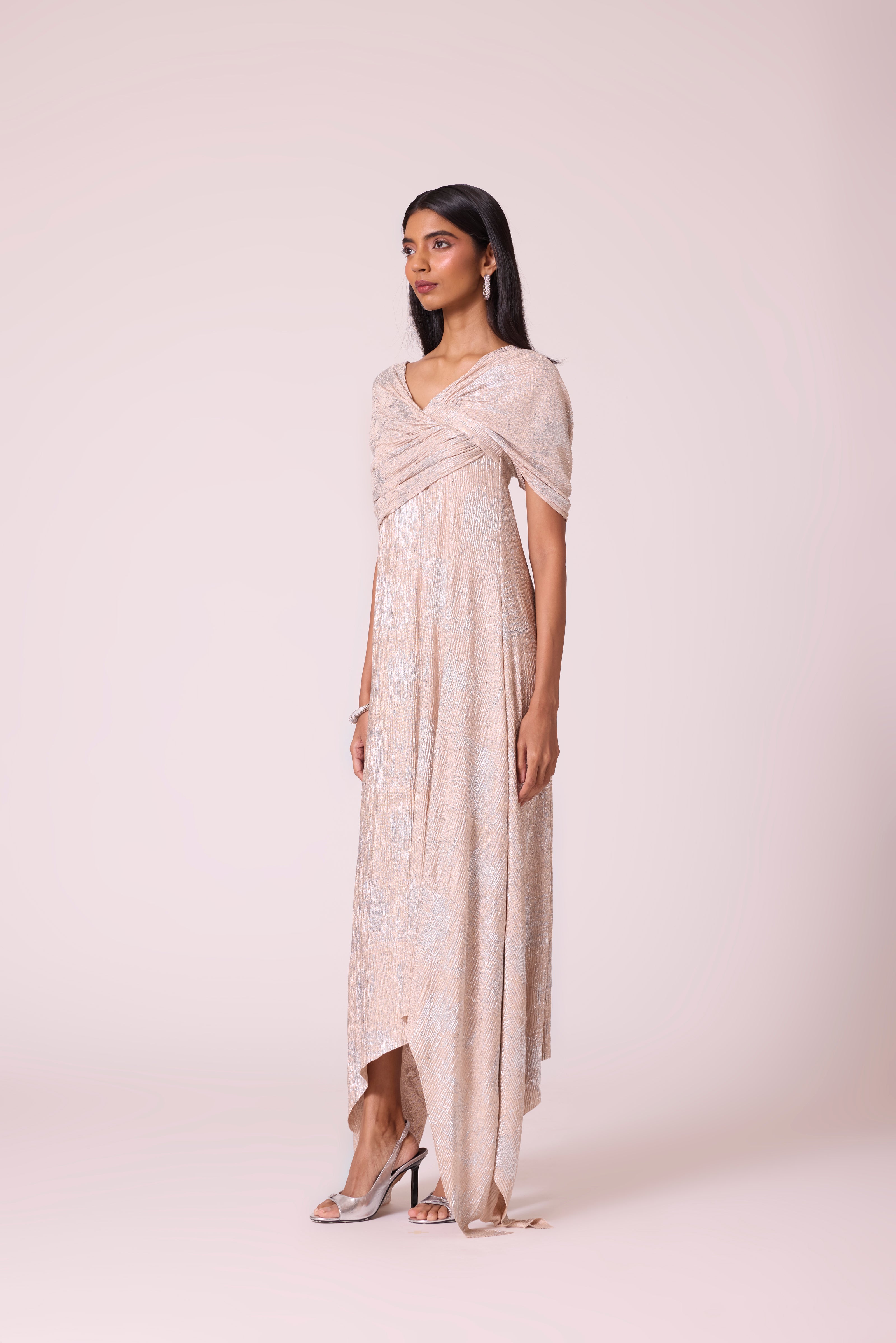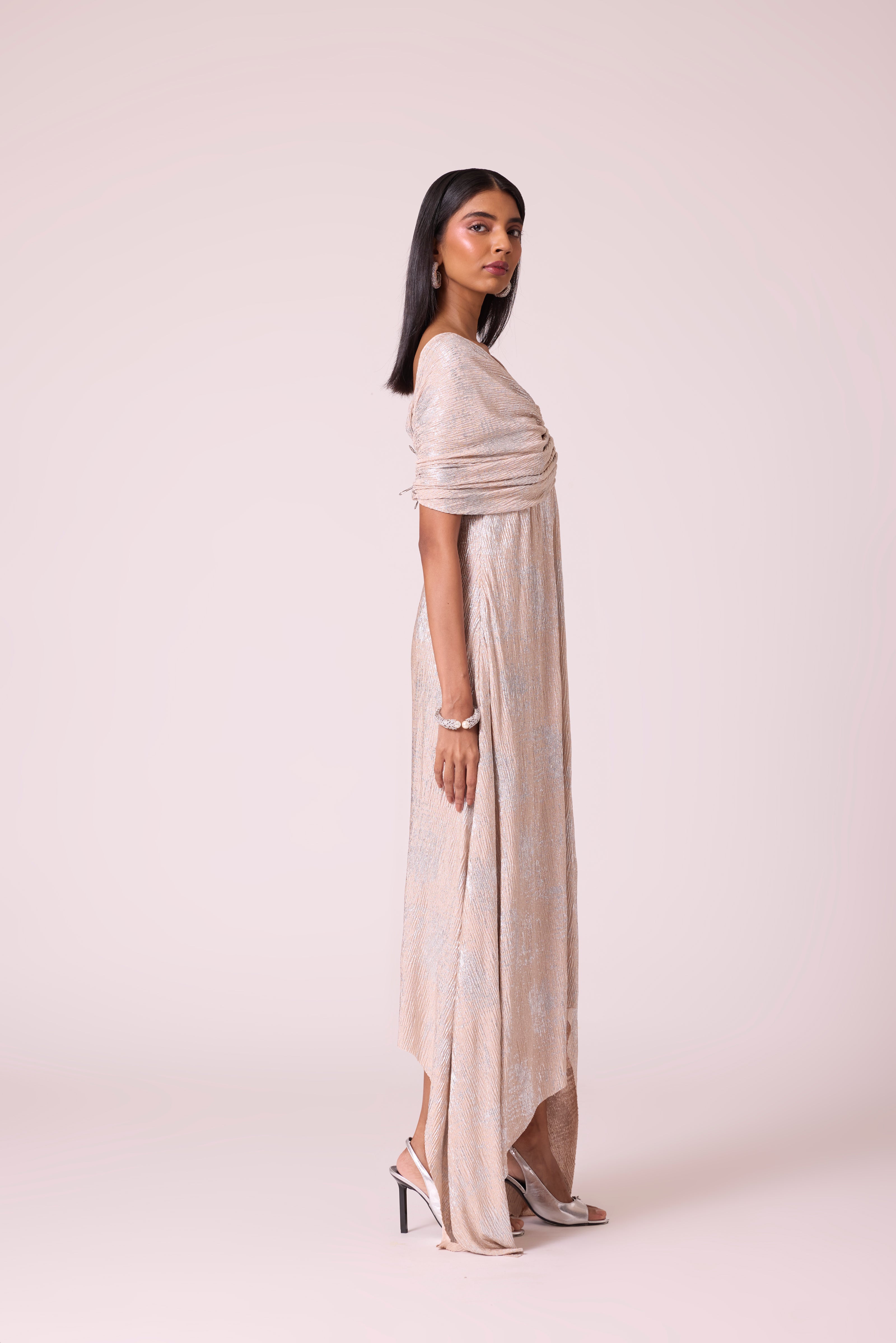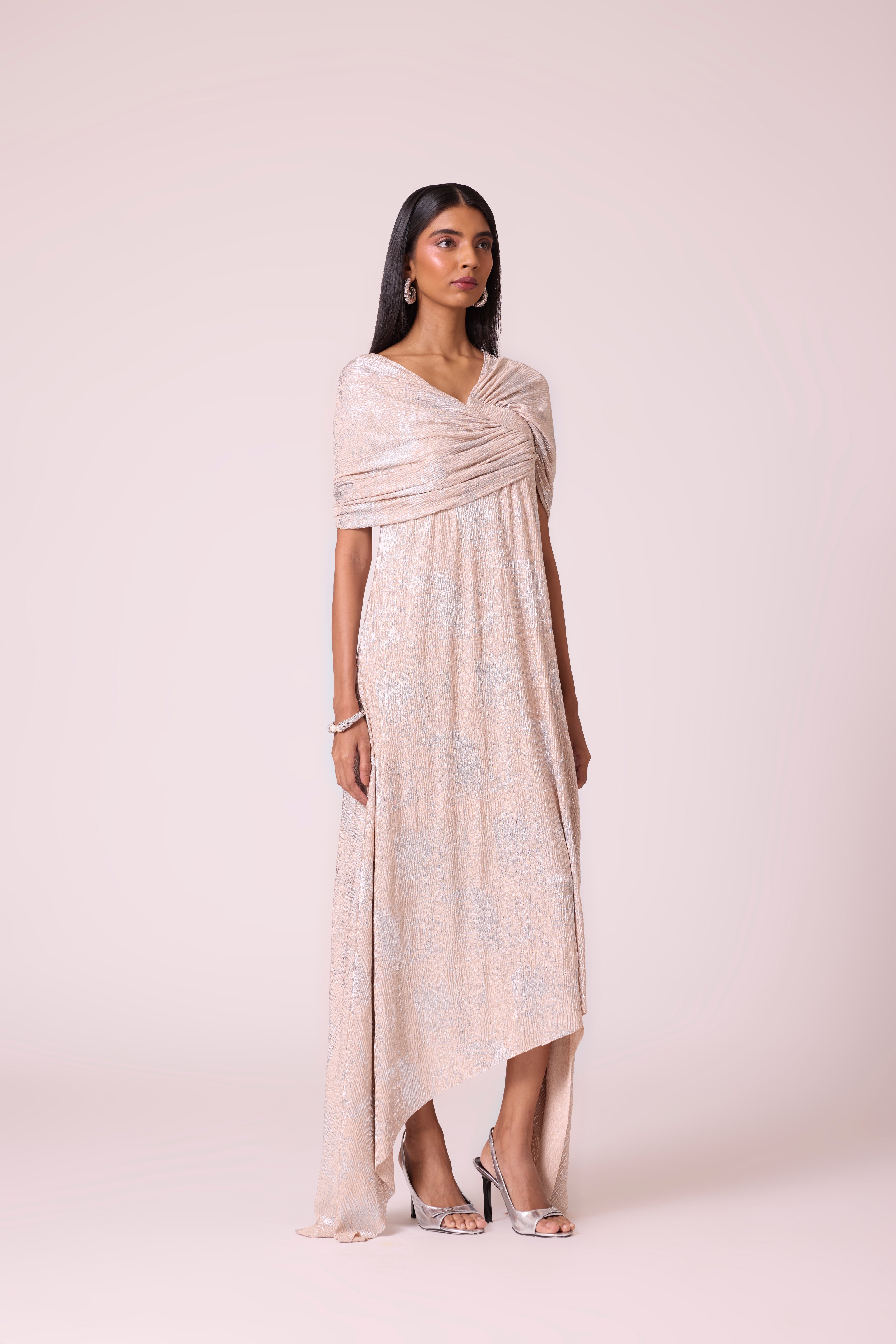 A draped yoke created over an off shoulder dress crafted in metallic chevron pleated fabric. Wear it on the shoulder, off the shoulder or partially on and off or any combination to suit your comfort. A line in silhouette with an asymmetric hem completes this ethereal cocktail dress.