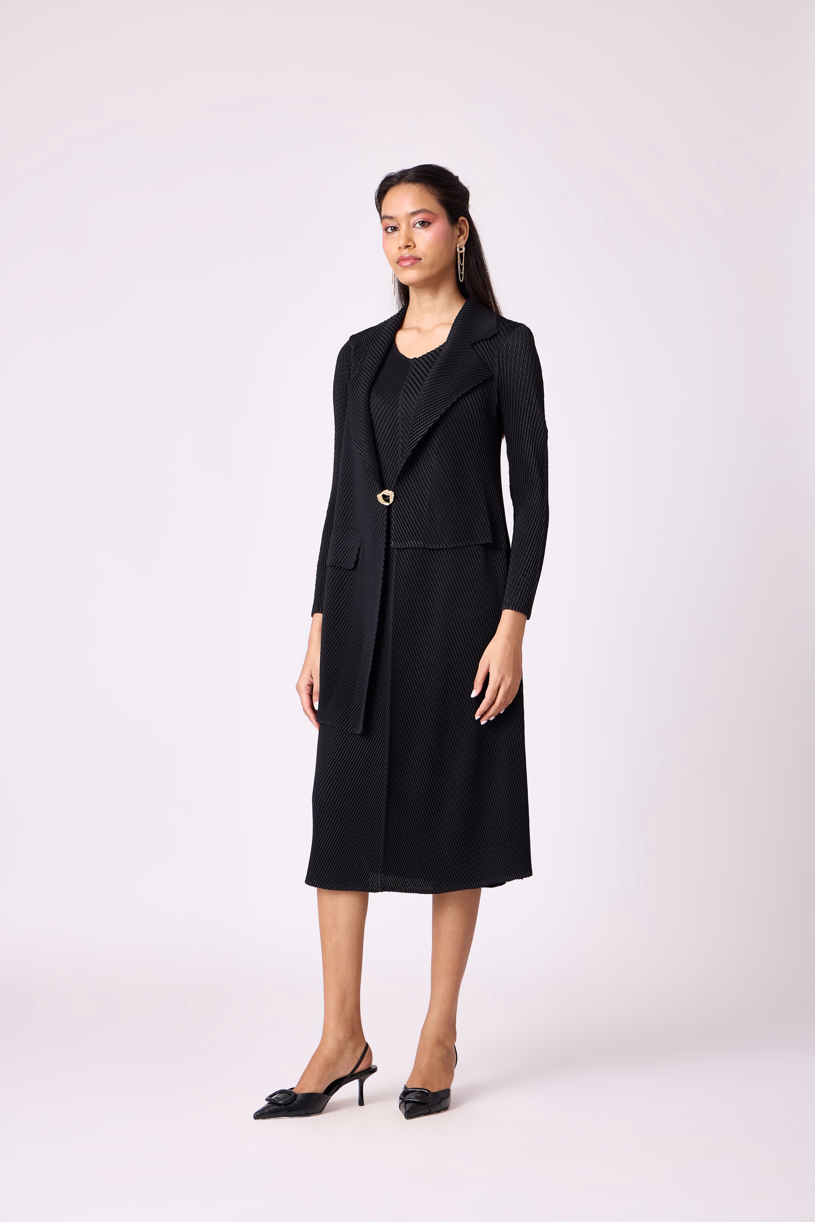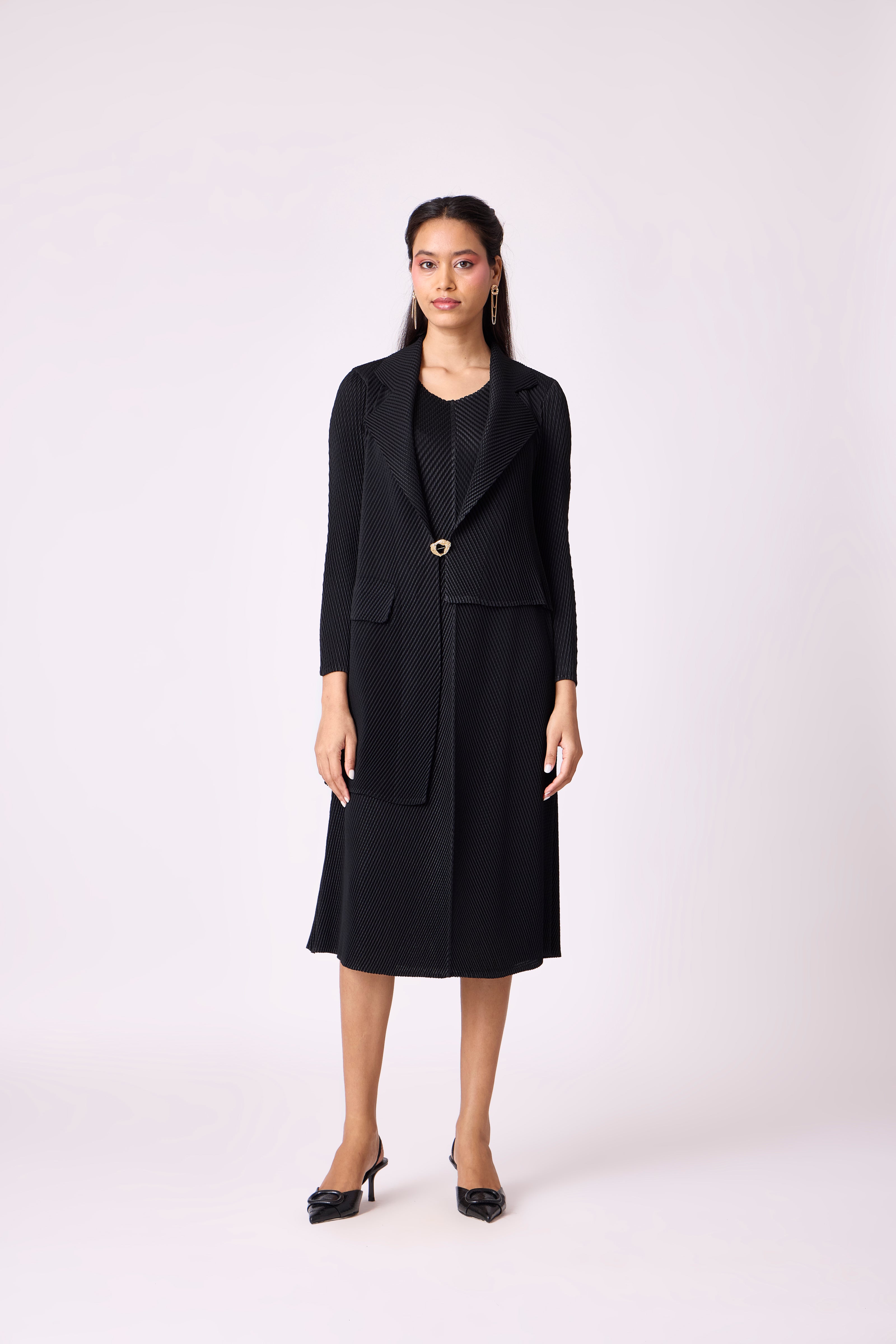 A fresh take on the blazer dress - a classic A line dress with a faux blazer layer with a broch closure. A dress that can take you from power meetings to official dinners.