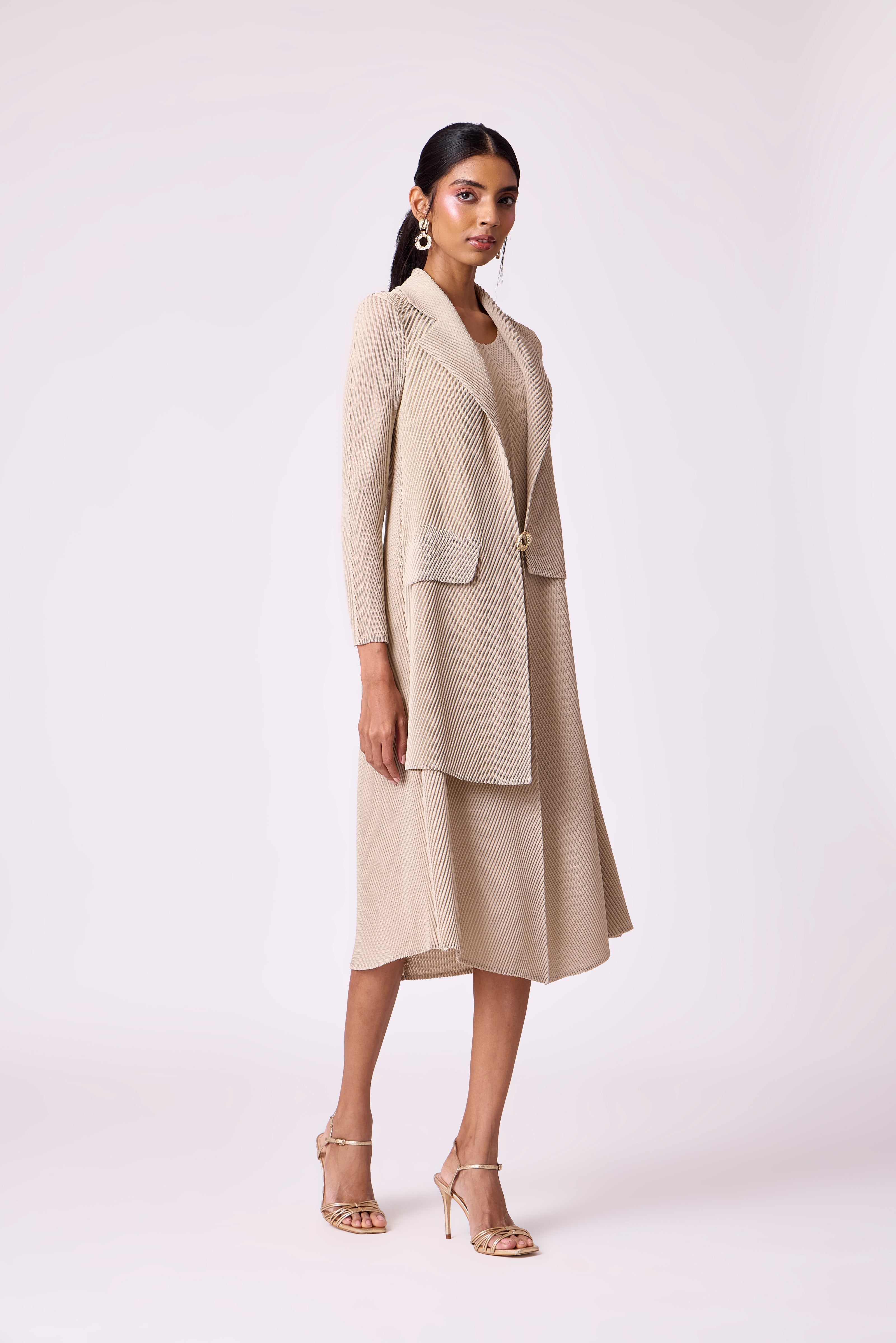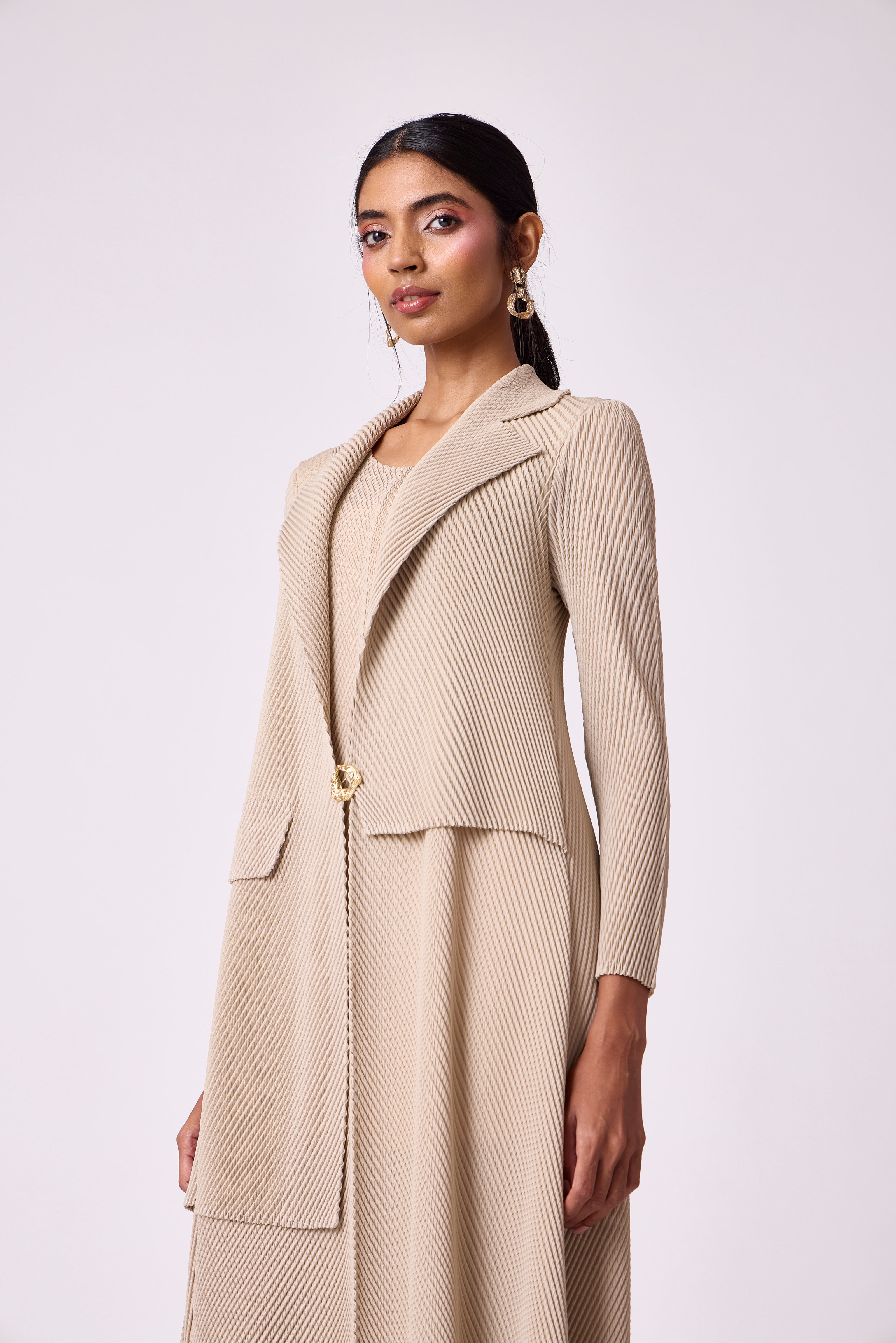 A fresh take on the blazer dress - a classic A line dress with a faux blazer layer with a broch closure. A dress that can take you from power meetings to official dinners.