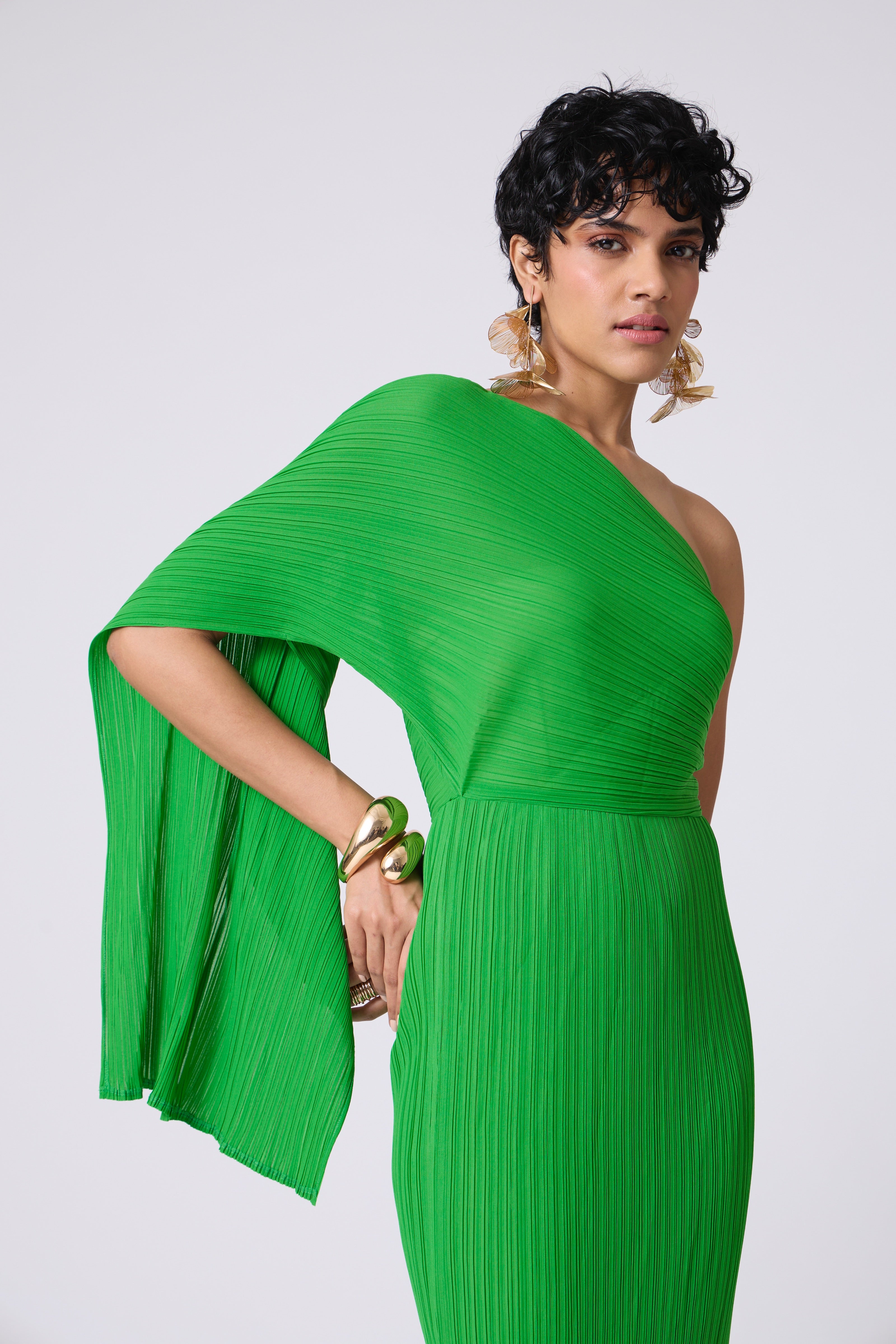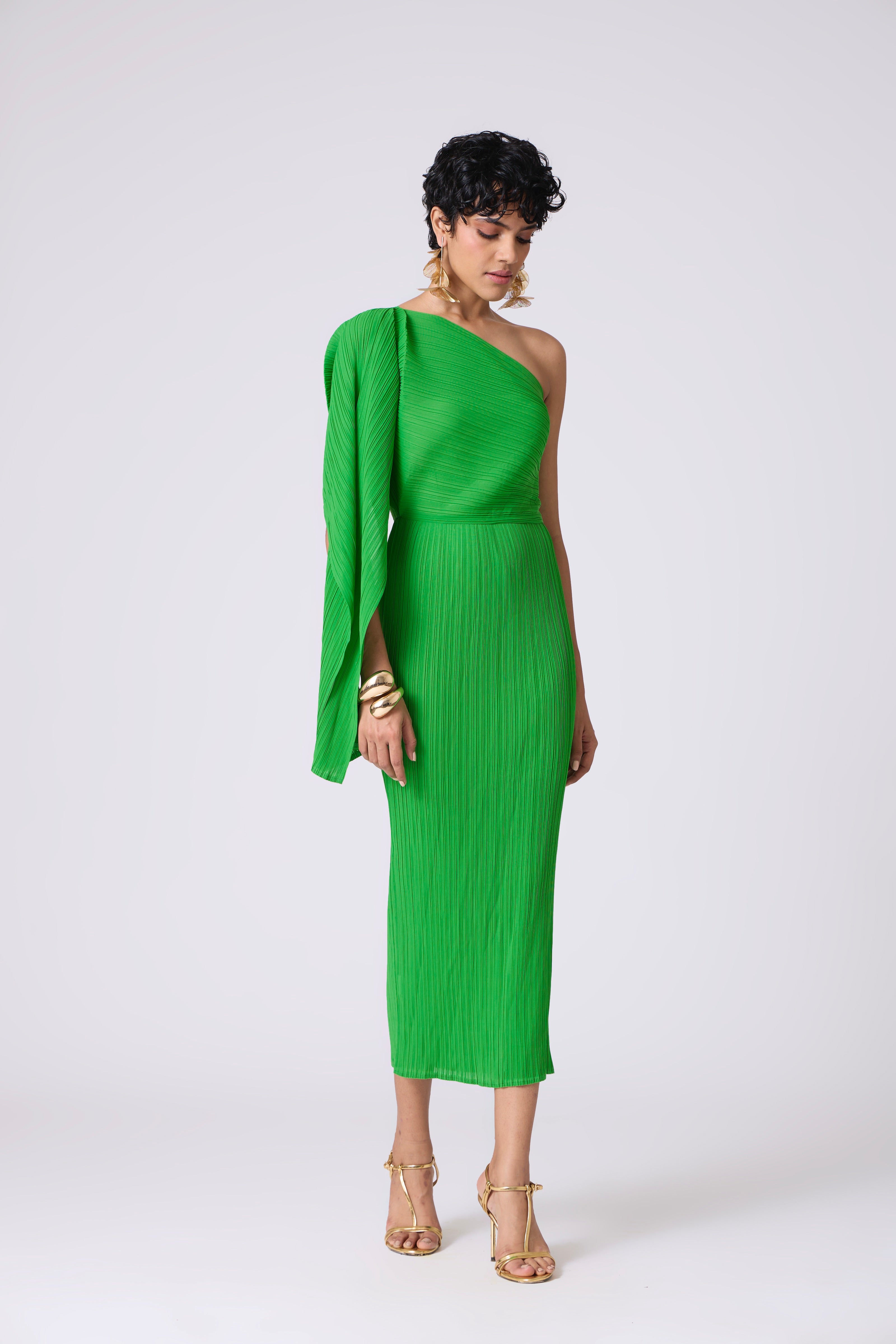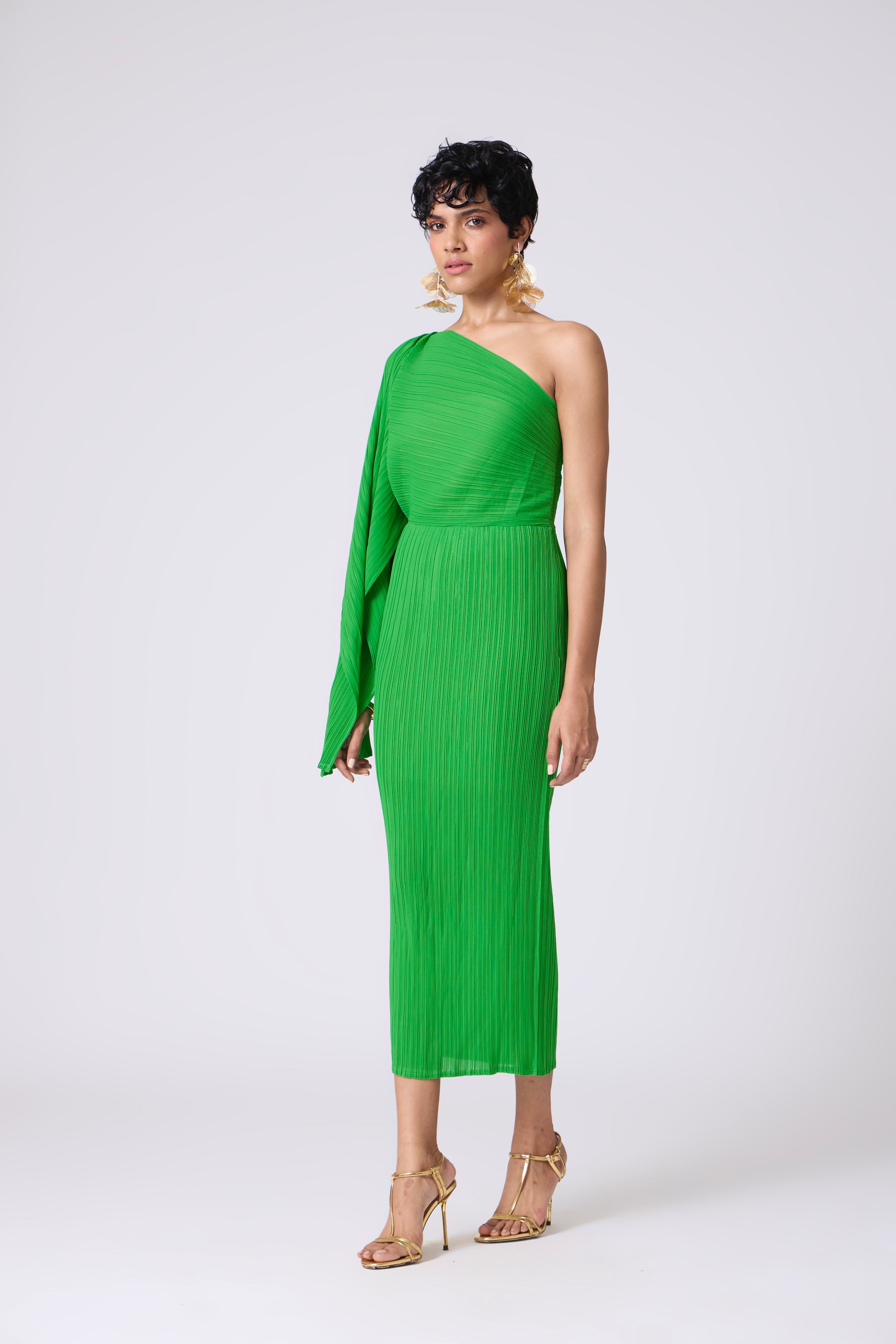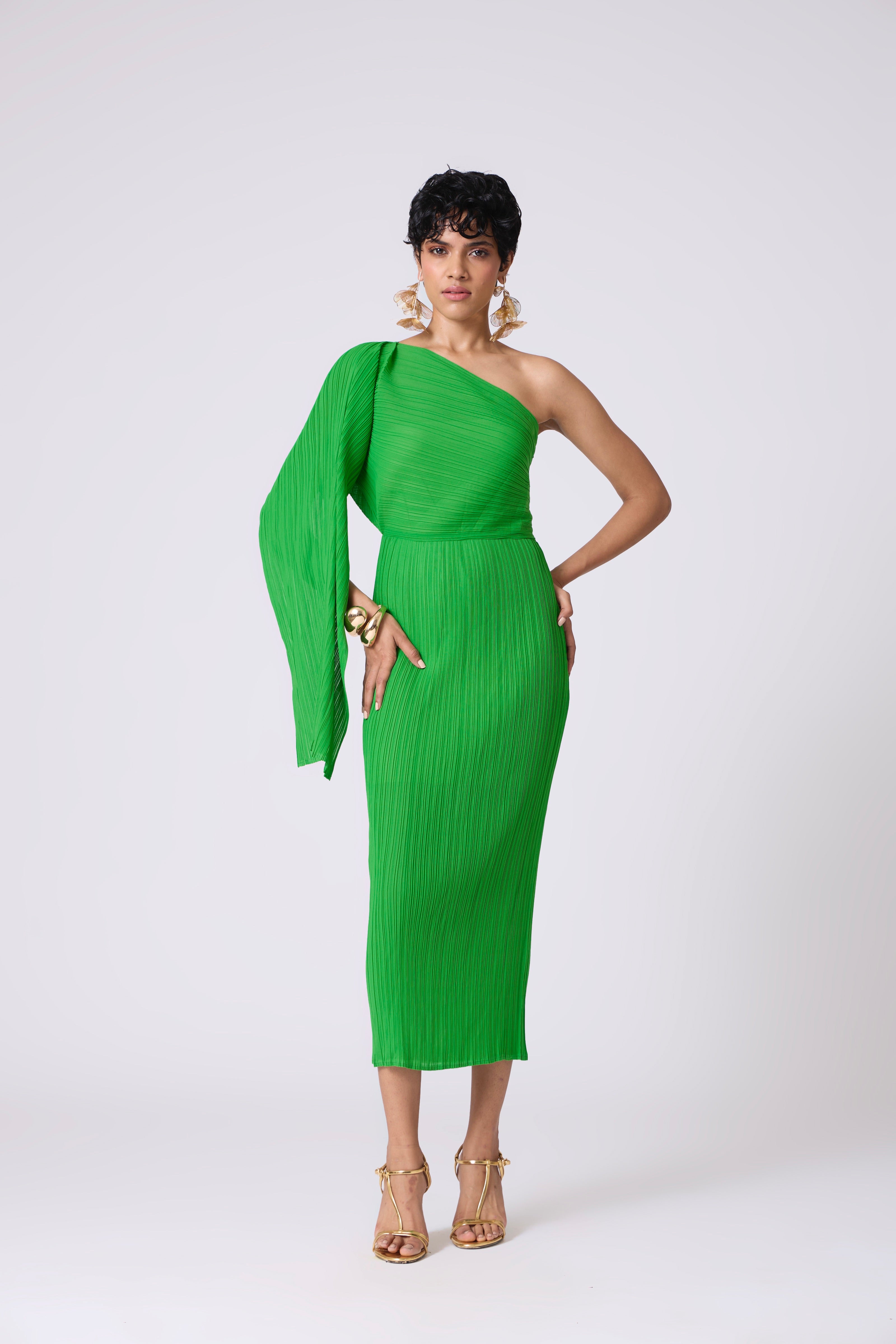 A fitted midi dress with a statement, one-shoulder, drape bodice, rendered in a stunning hue.