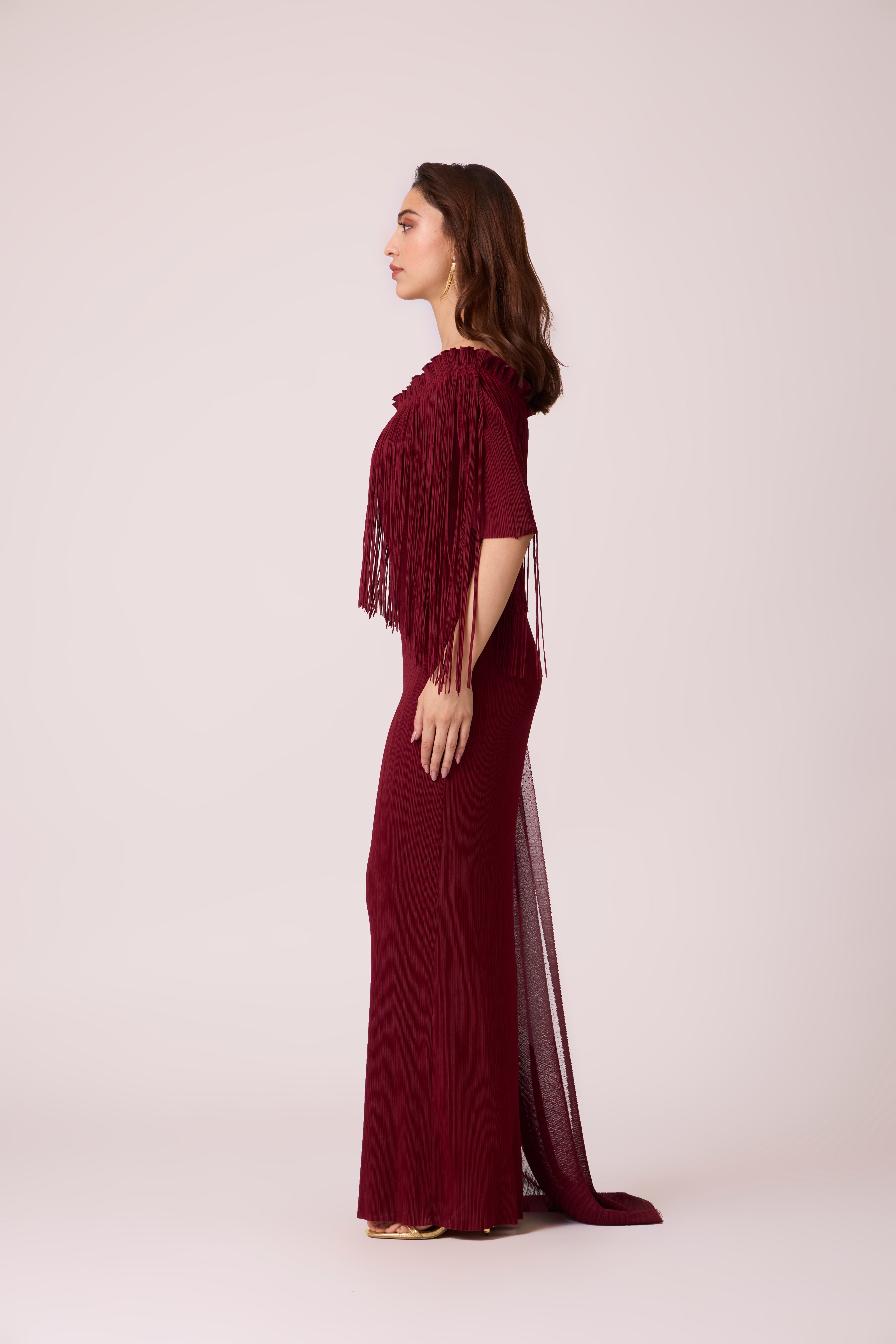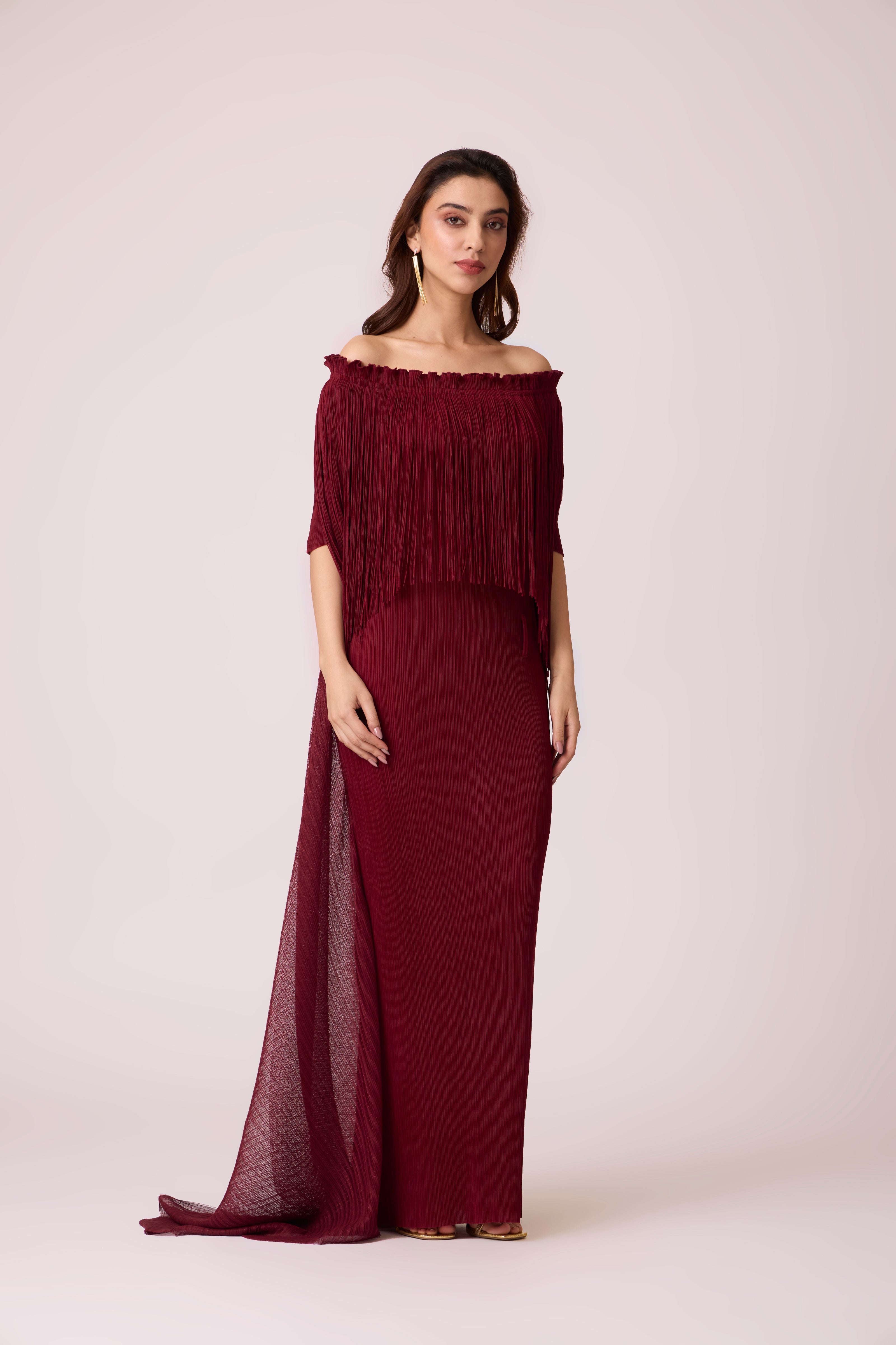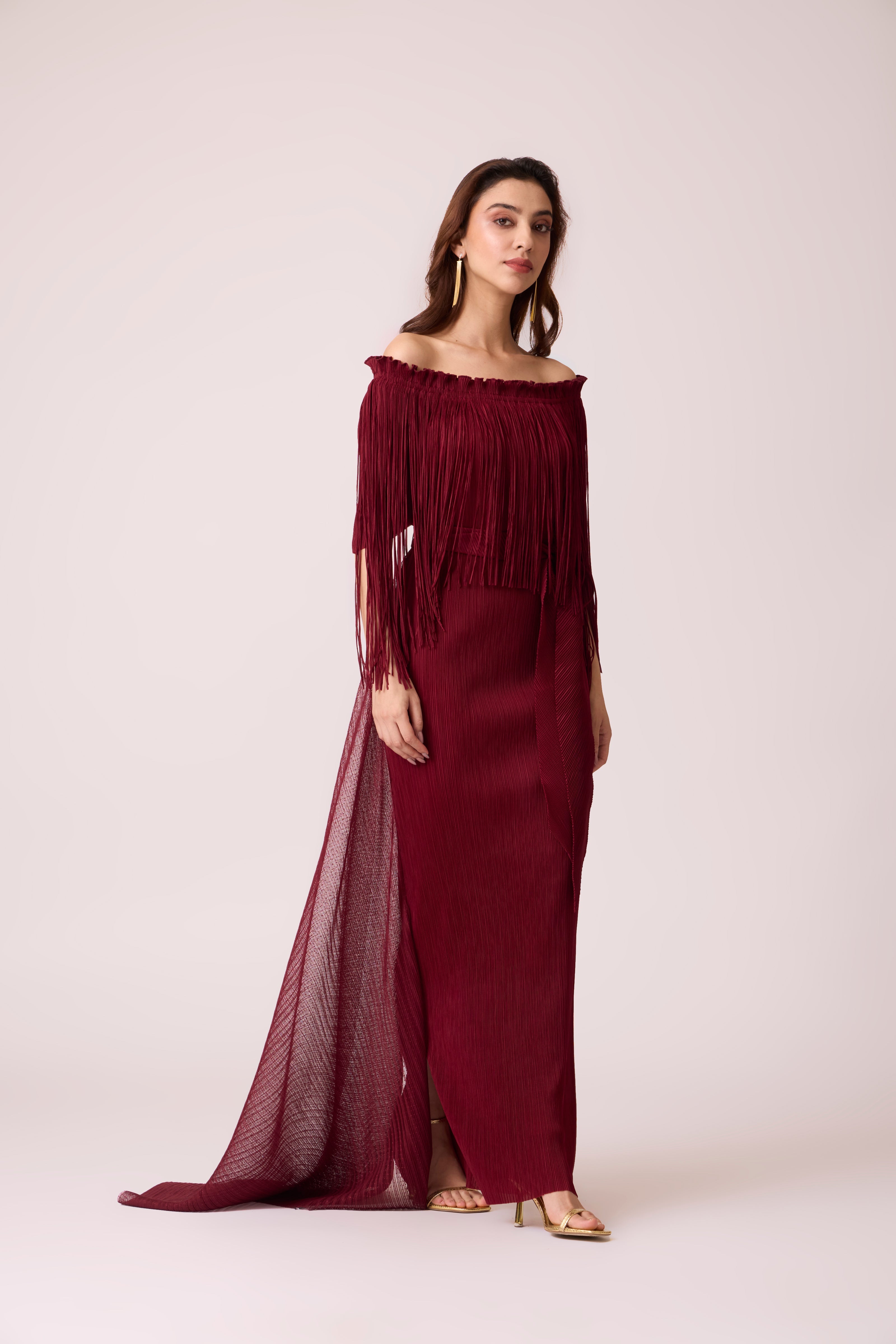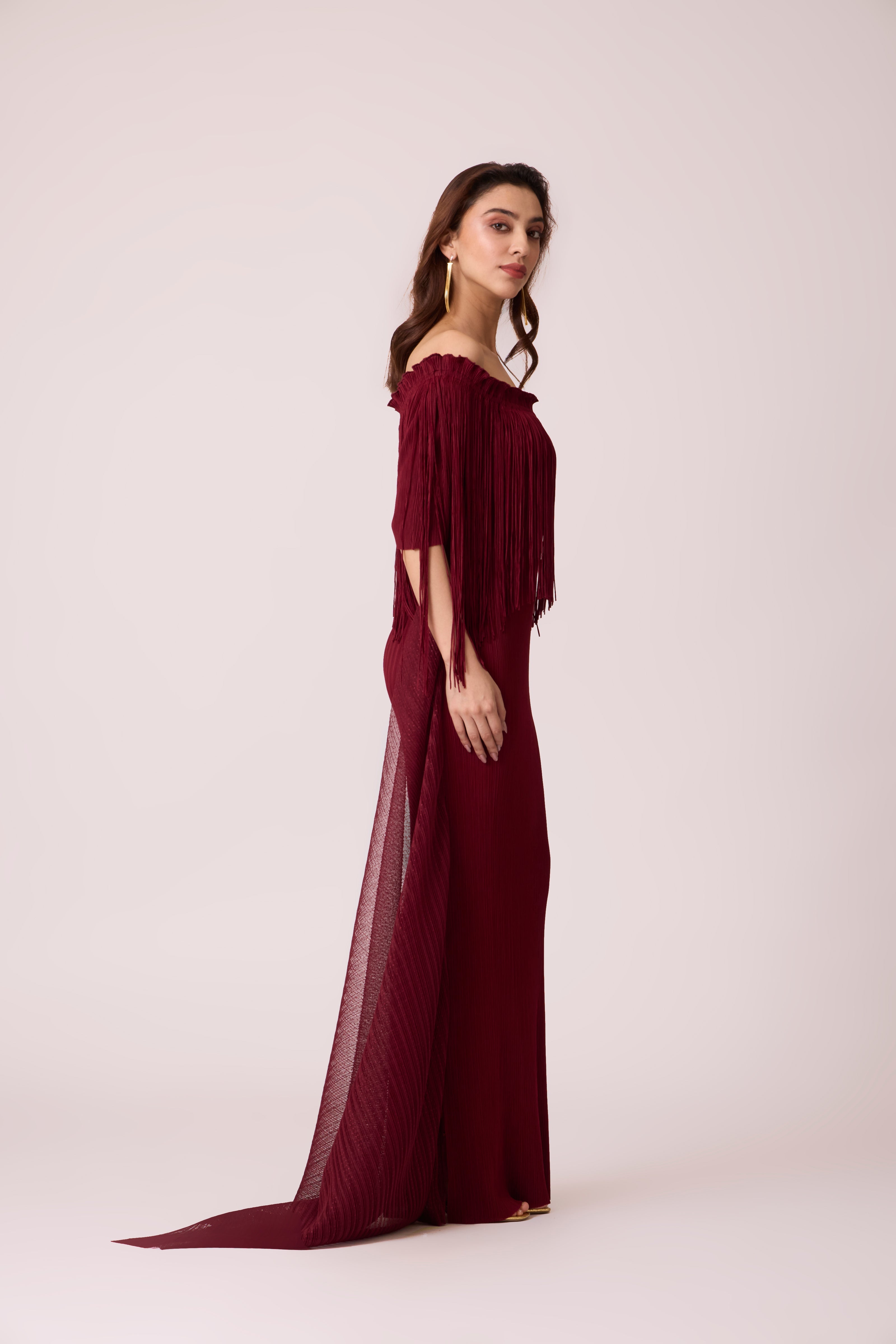 A statement maxi with a soft net train and fringed yoke off shoulder silhouette. Comes with same color belt if your prefer a cinched waist.