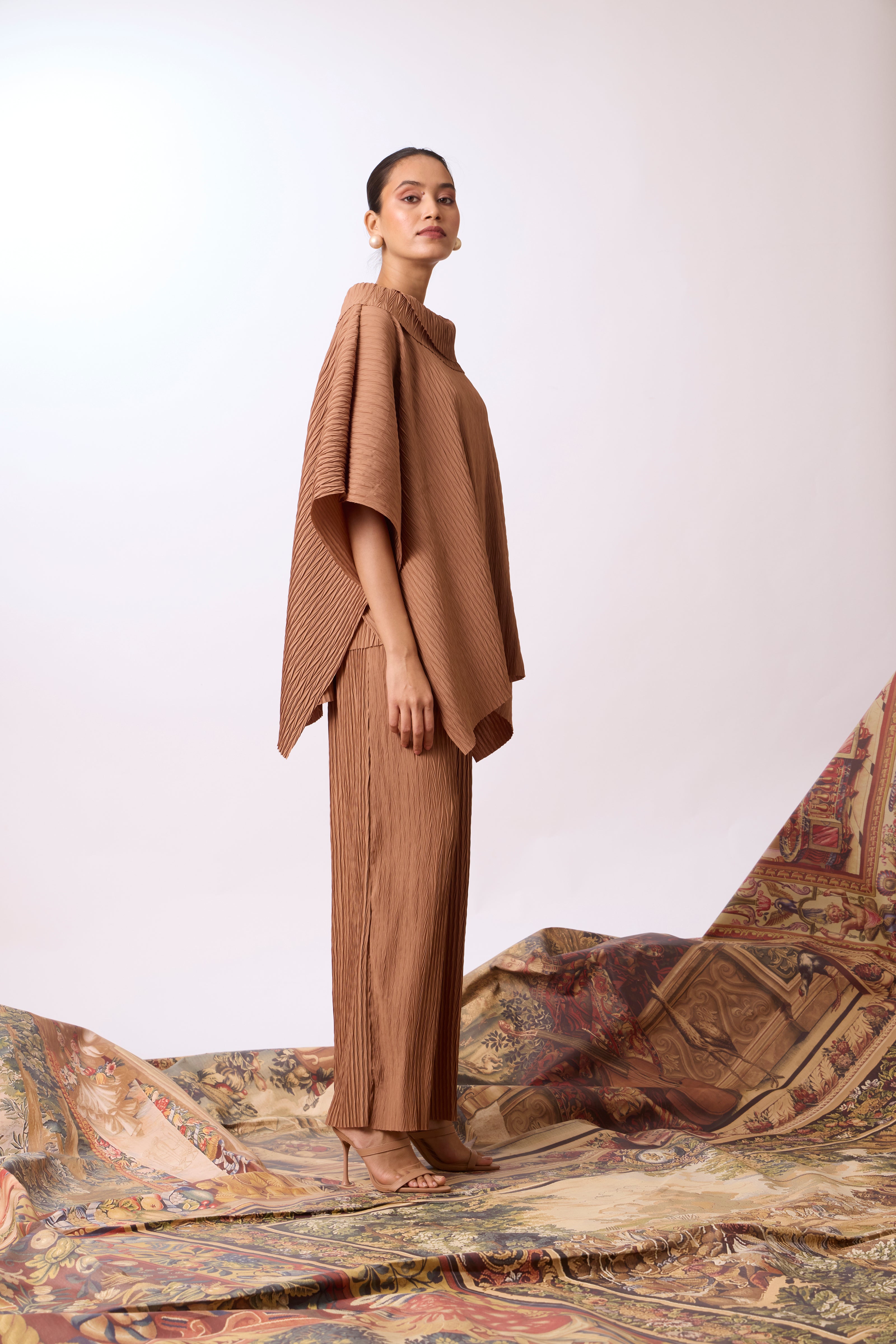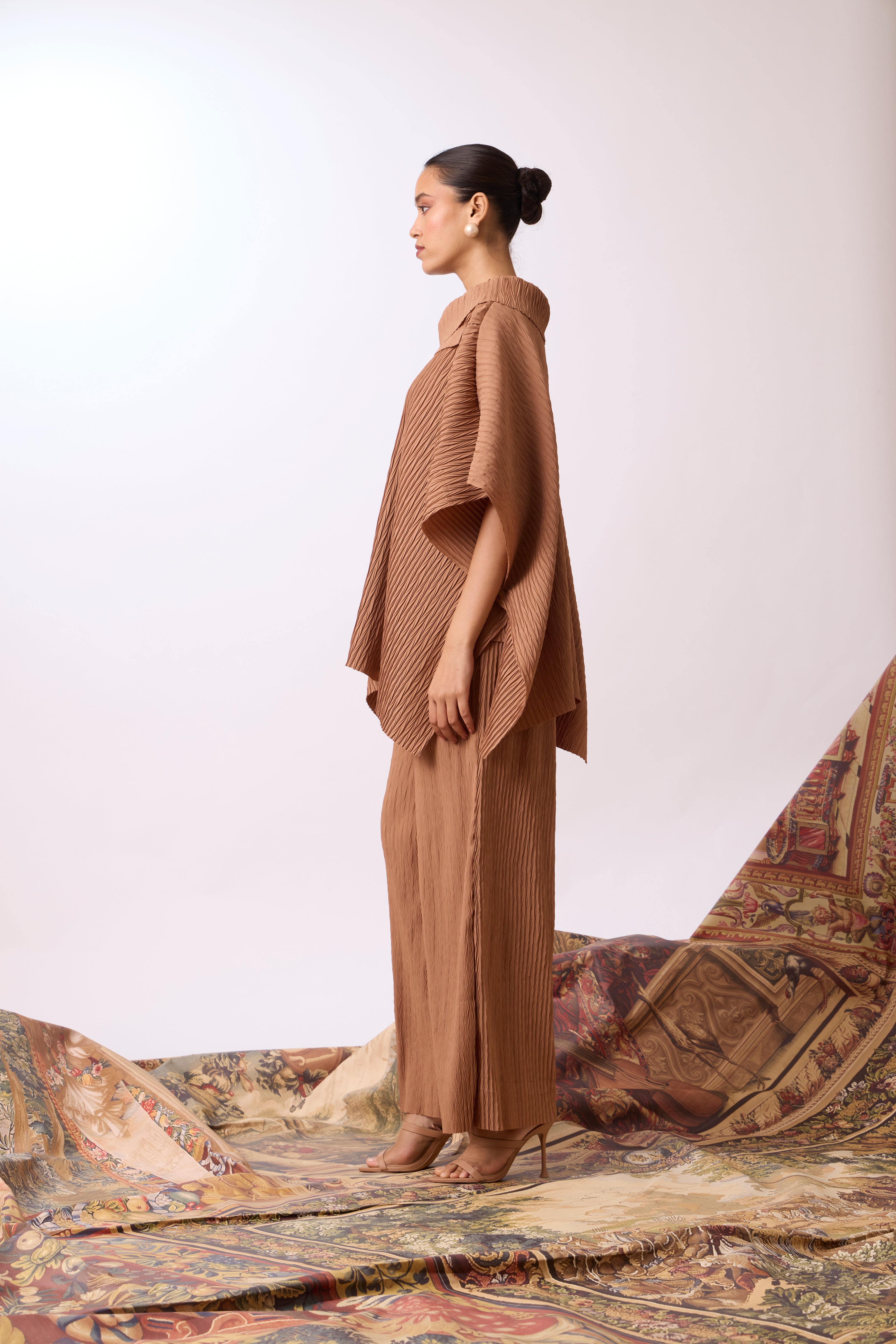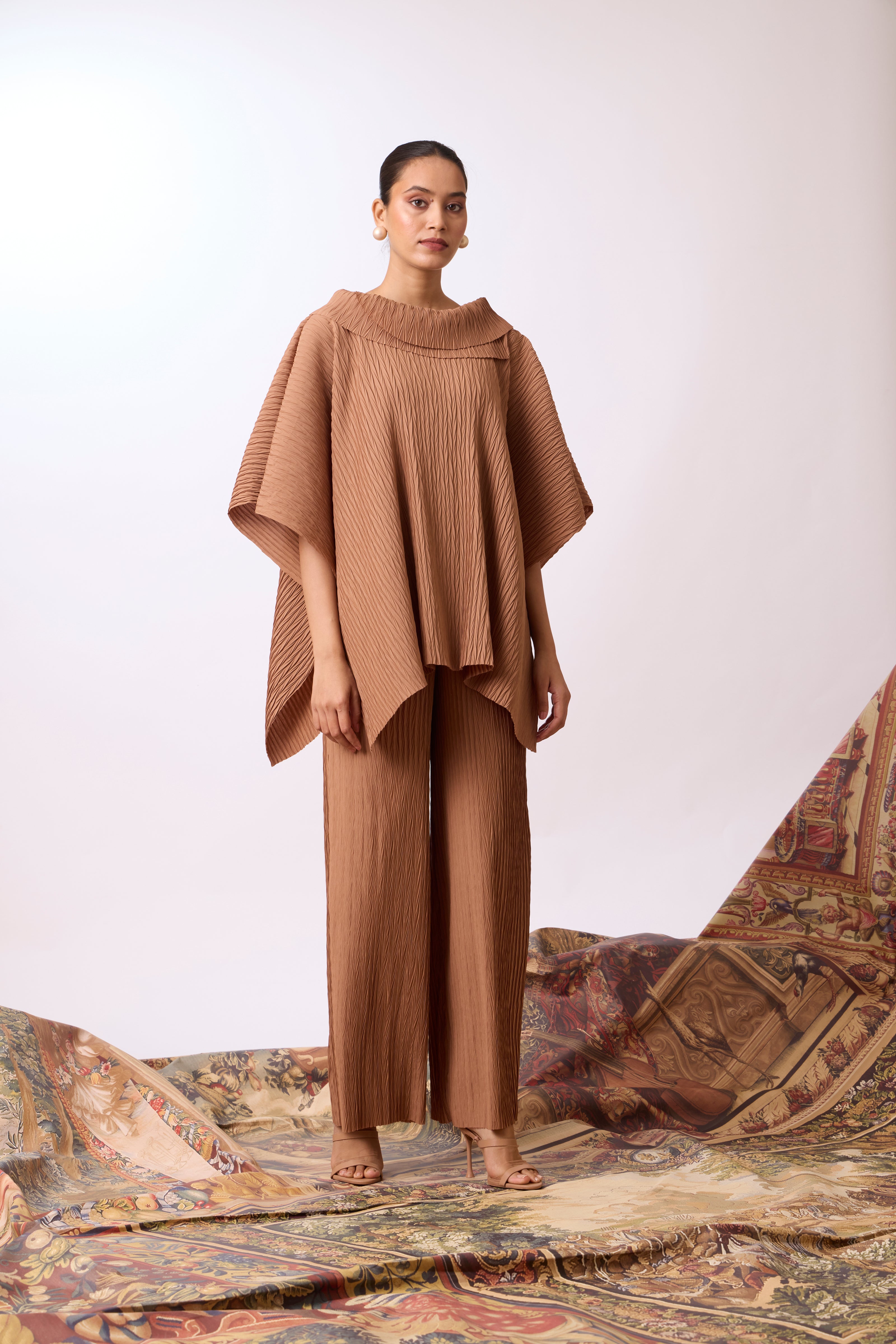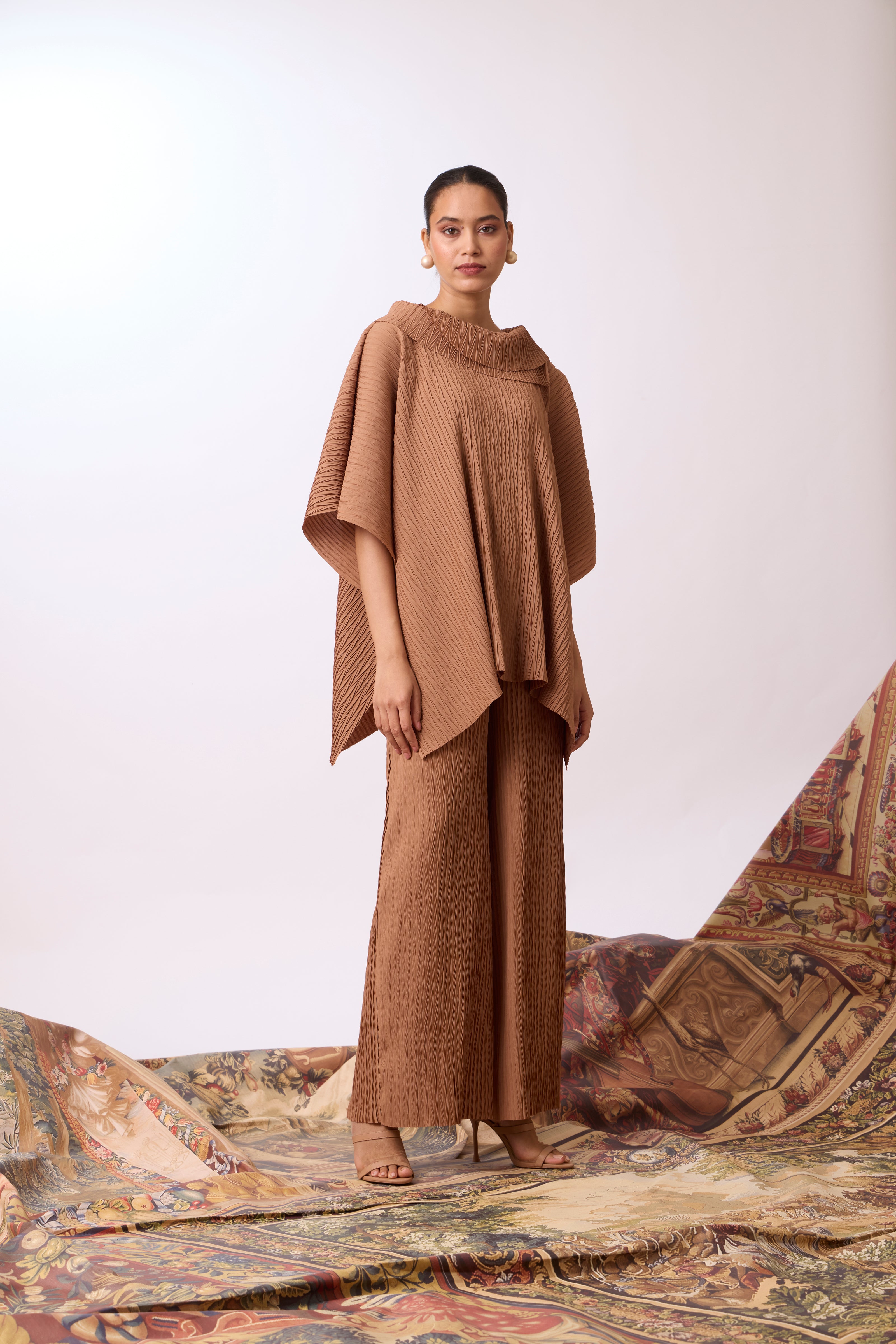An elegant co-ord set with an overlap turtleneck collar and matching wide leg pants crafted in a soft chevron pleated fabric. Comes with same color slip.