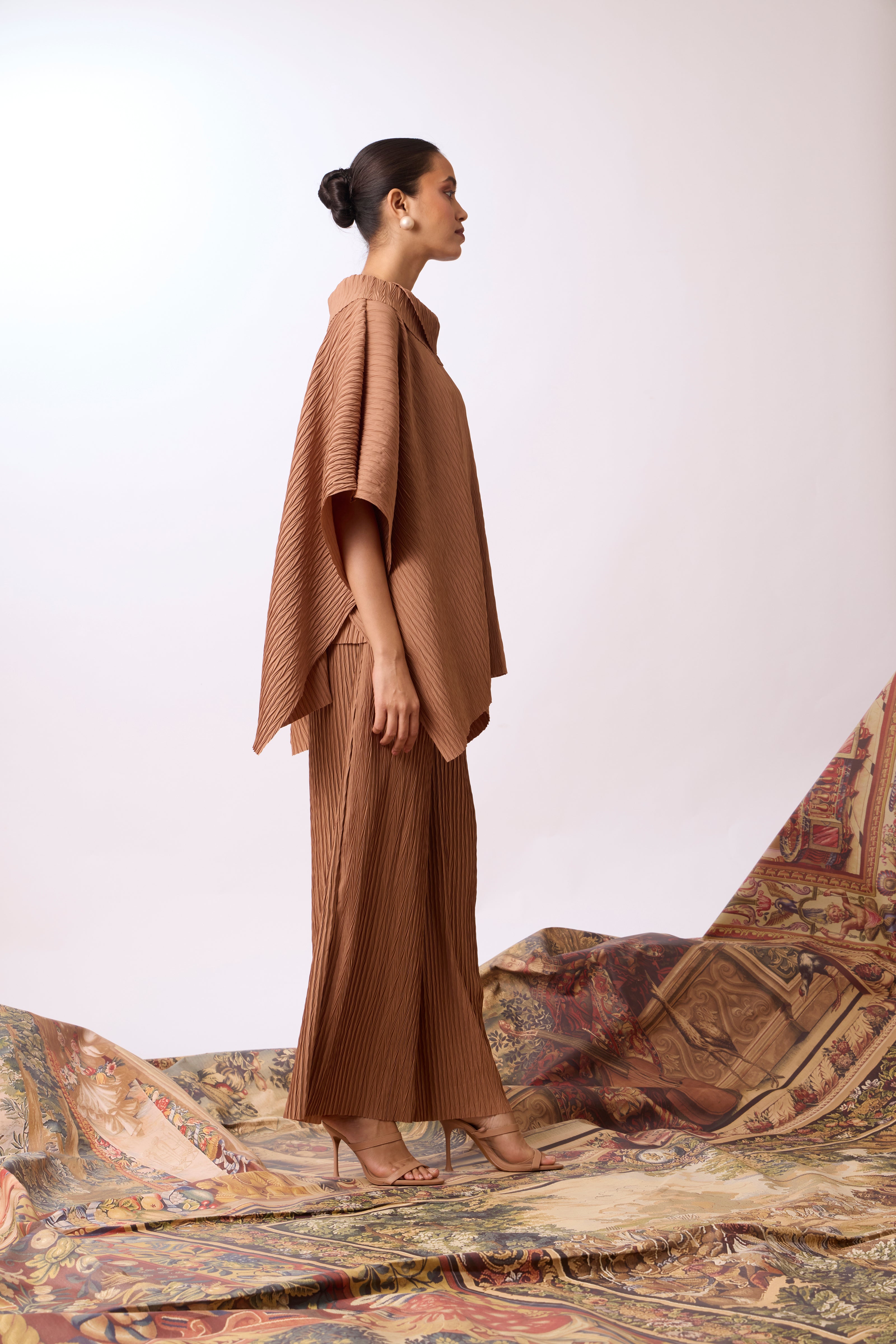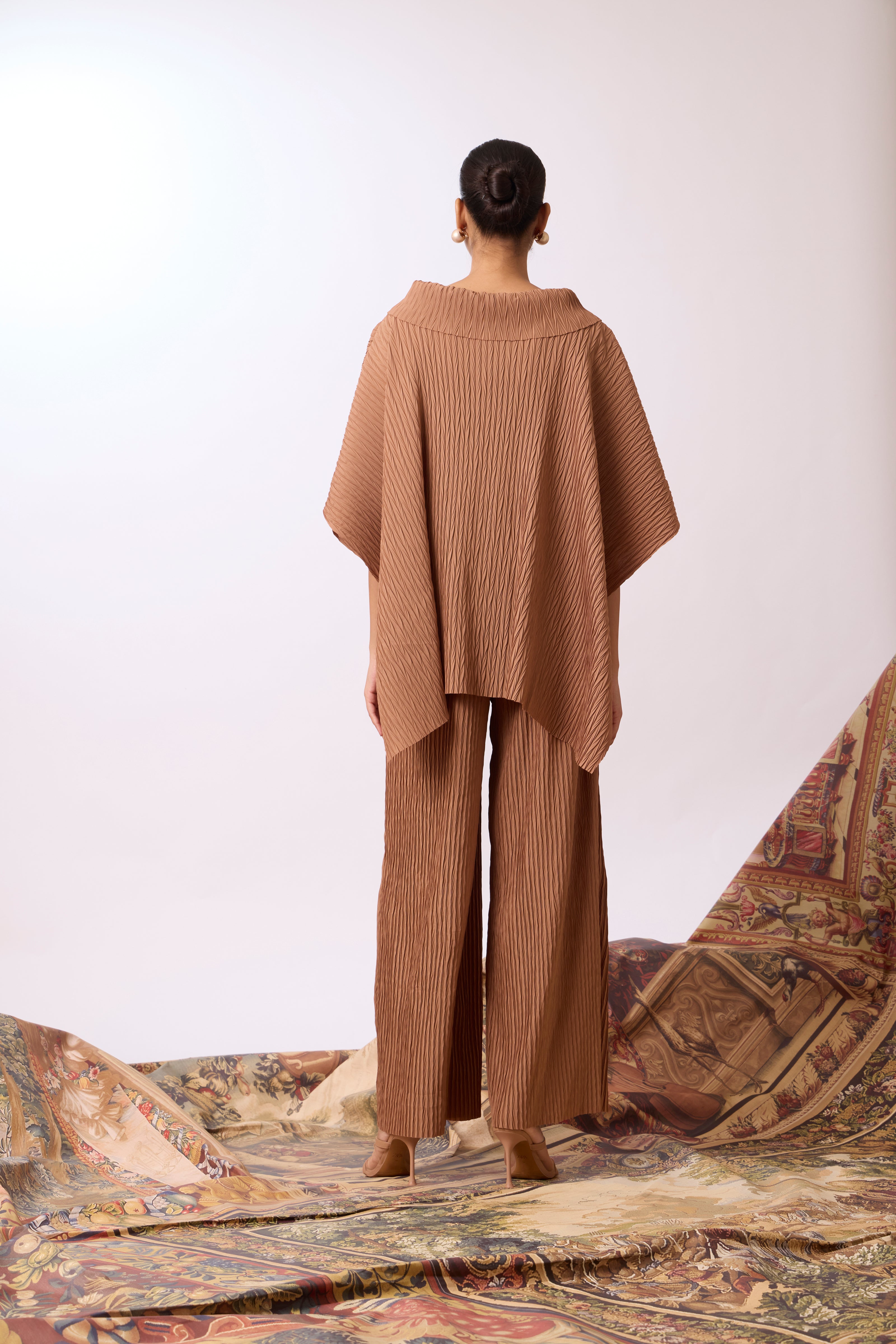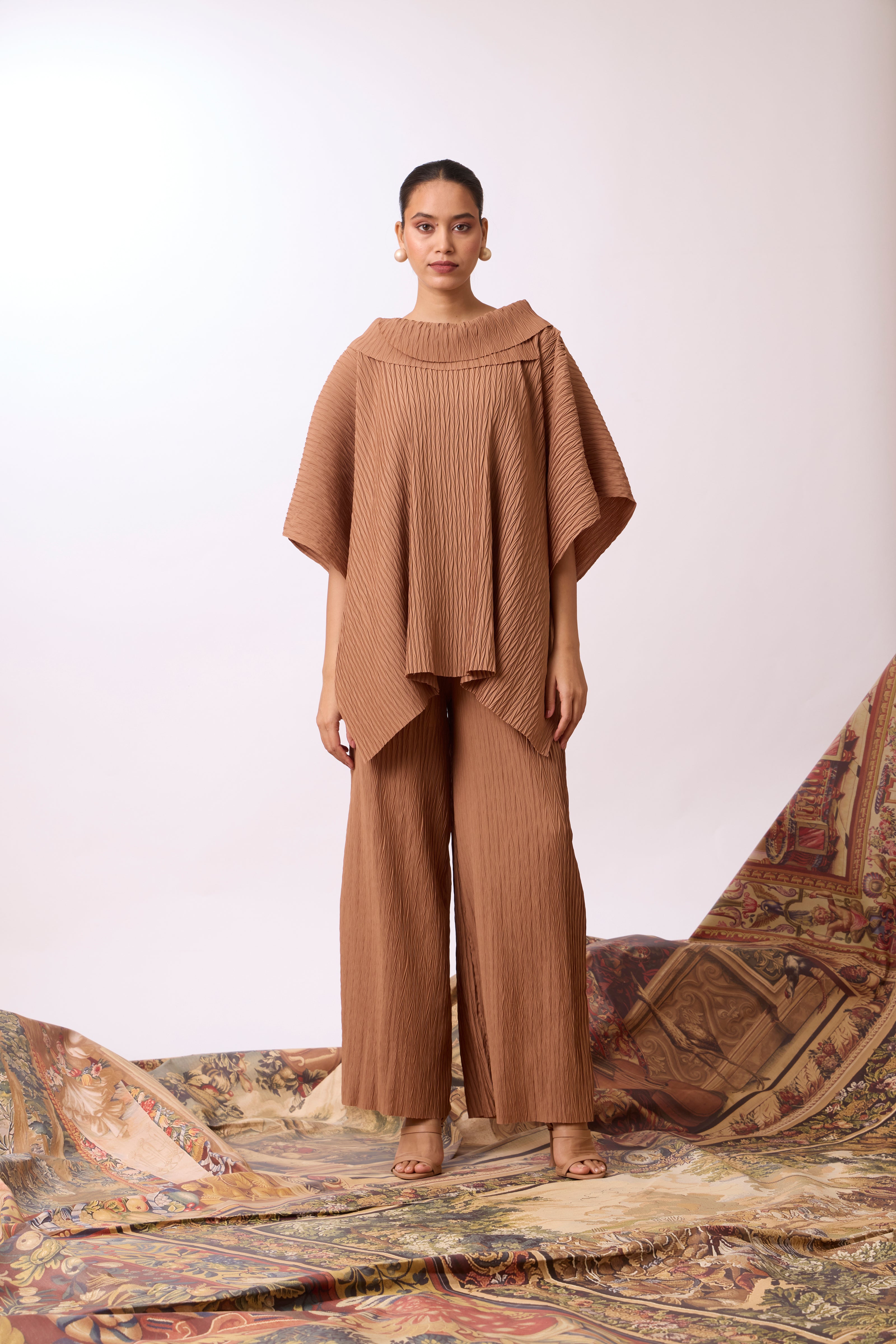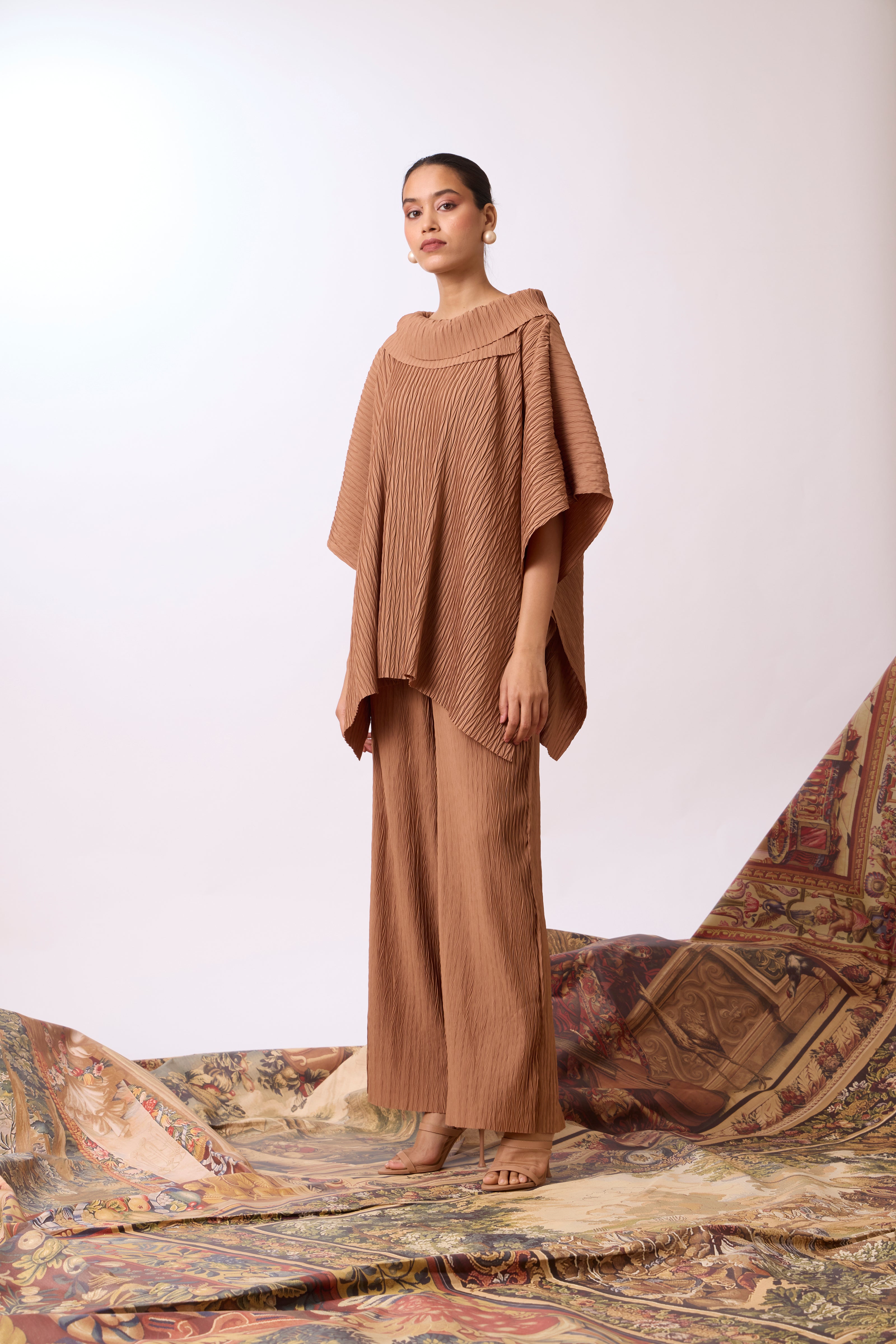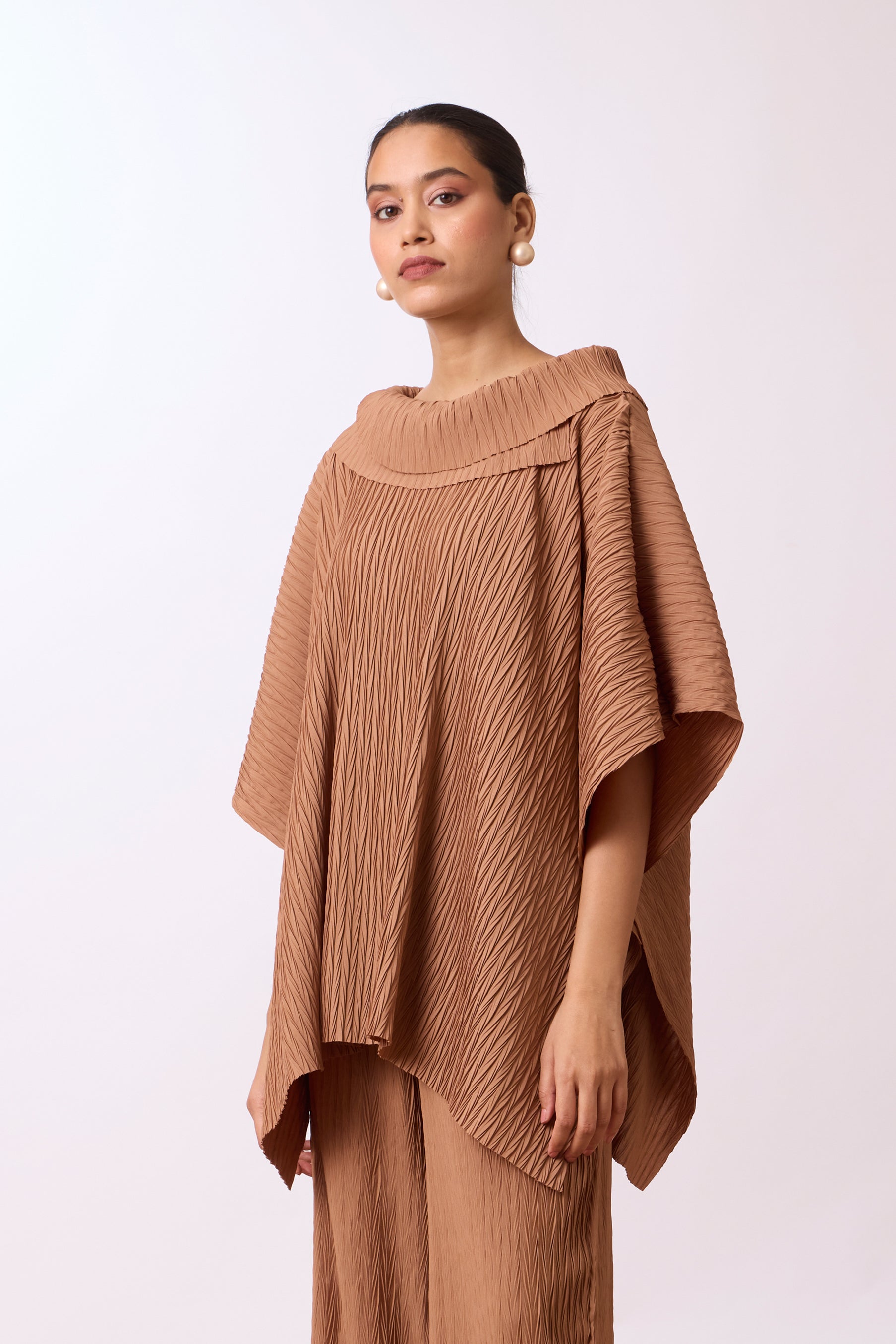 An elegant poncho top with an overlap turtleneck collar and crafted in a soft chevron pleated fabric. Comes with same colour slip.